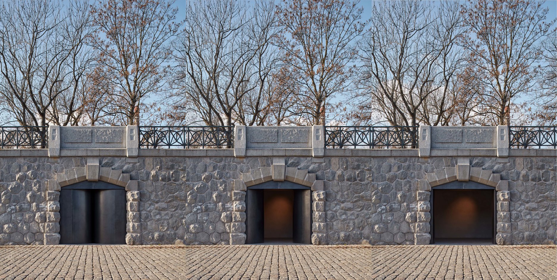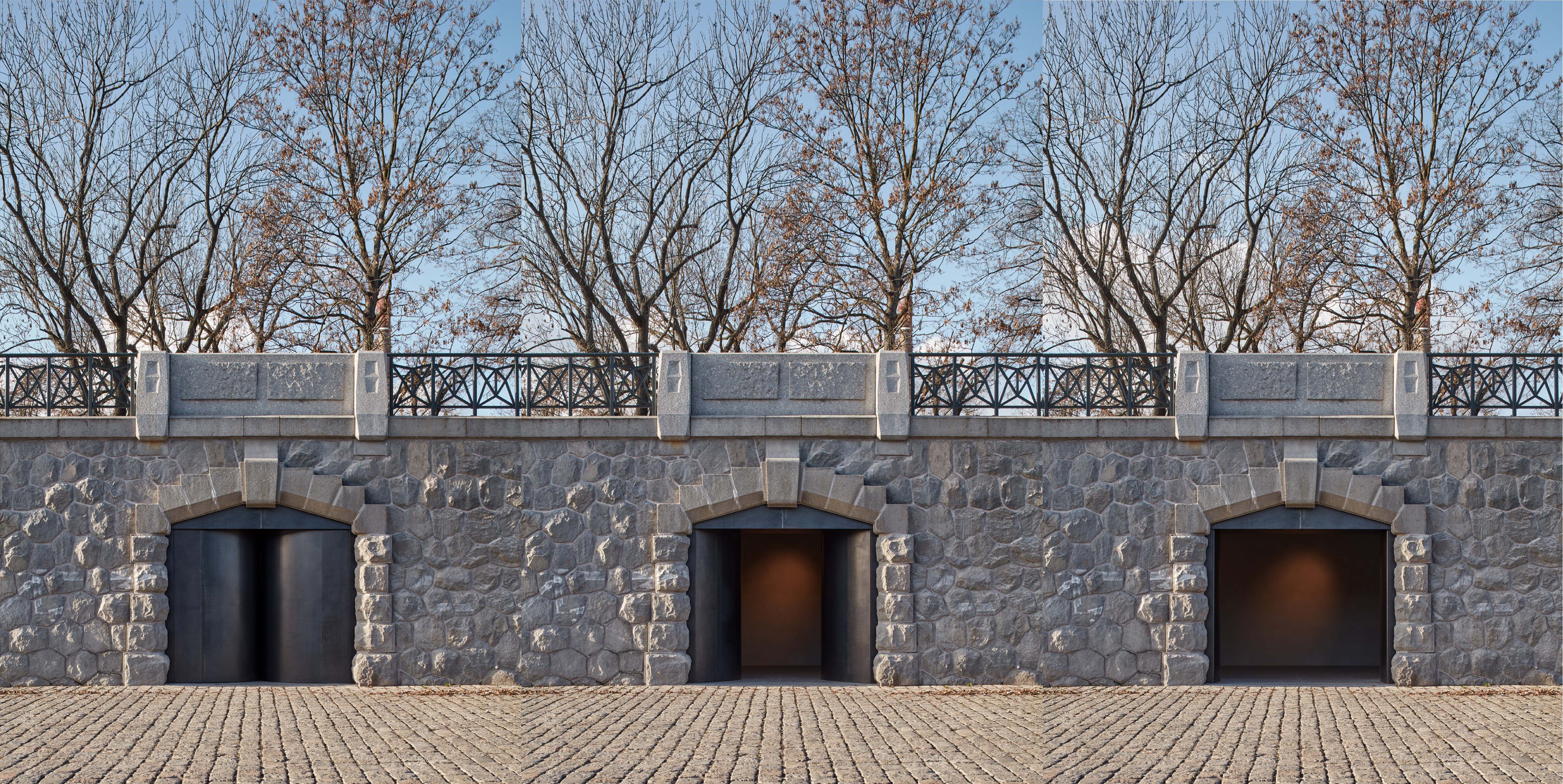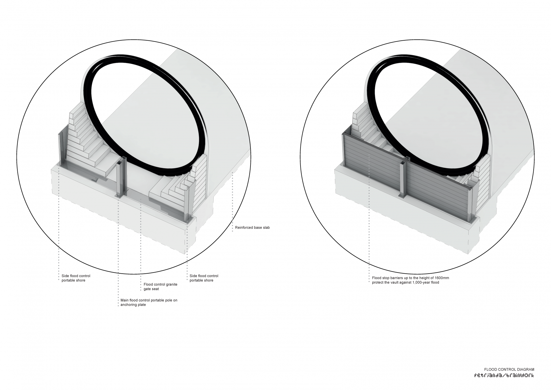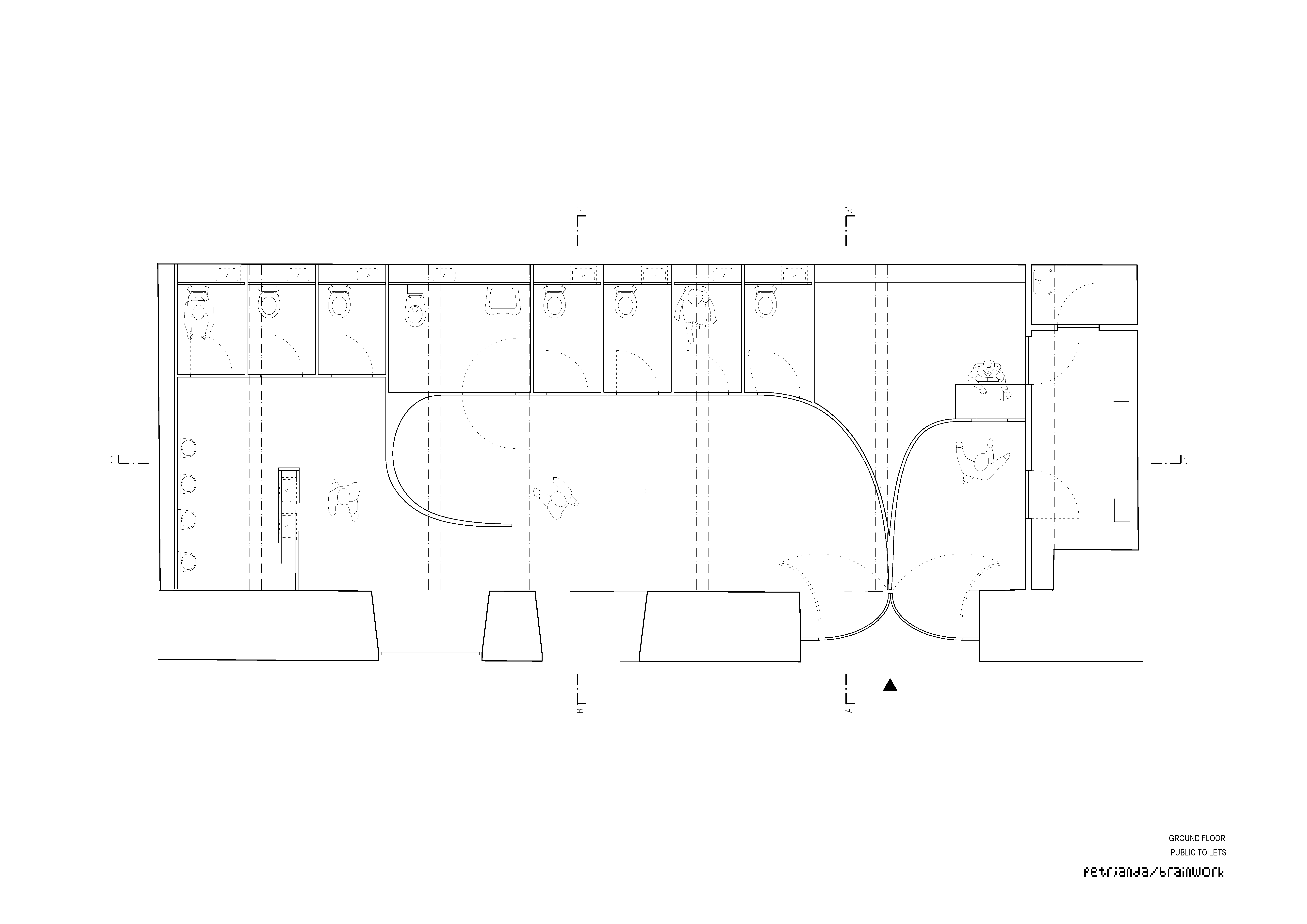 Architektúra šestice kobiek na Rašínovom nábreží je postavená na doplnení (takmer) kruhových ostení. Lapidárny zásah, ktorý viac odoberá než pridáva, zvýrazňuje kruhový portál v nábrežnom múre. Vybúrané steny z ťahokovu a kamenné "zátky", vstavané do pôvodných mostných oblúkov, nahradili veľkoformátové kruhové okná s atypickým mechanizmom otvárania. Vstupné portály sú riešené ako oceľové rámy, s dilatačne osadenými sklami s hmotnosťou 1-1,5 t. Súčasťou kompozície je doplnenie ostenia stupňovitou vostavbou, ktorá integruje prístup do inštalačnej šachty pod portálom, vývody vzduchotechniky a montážne prvky protipovodňového systému. Eliptické pivotové okná majú priemer 5,5 m, hrúbku organického skla 7 cm a hmotnosť približne 2,5 tony. “Každé má unikátní tvar a vzhledem ke své velikosti přesahující možnosti standardního zasklení, jde pravděpodobně o největší pivotová okna na světě,” dopĺňajú autori. Pohyb je riešený motoricky. V prevádzkovej pozícii sú okná zafixovaná v uhle 60°. Ďalšou z možností je automatické senzorické otváranie ovládané pohybovými čidlami, alebo otváranie obsluhou baru. Vstupy do štrnástich kobiek na Hořejšího nábreží definujú oceľové skulpturálne dvere, prehnuté do ostenia tak, aby pri otvorení prepojili kobku a náplavku v celom priereze. V kobkách, s verejnými toaletami, prechádzajú vstupné krídla plynulým oblúkom do interiérovej “membrány”, ktorá oddeľuje kabíny od verejného predpriestoru.