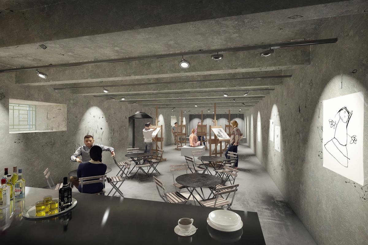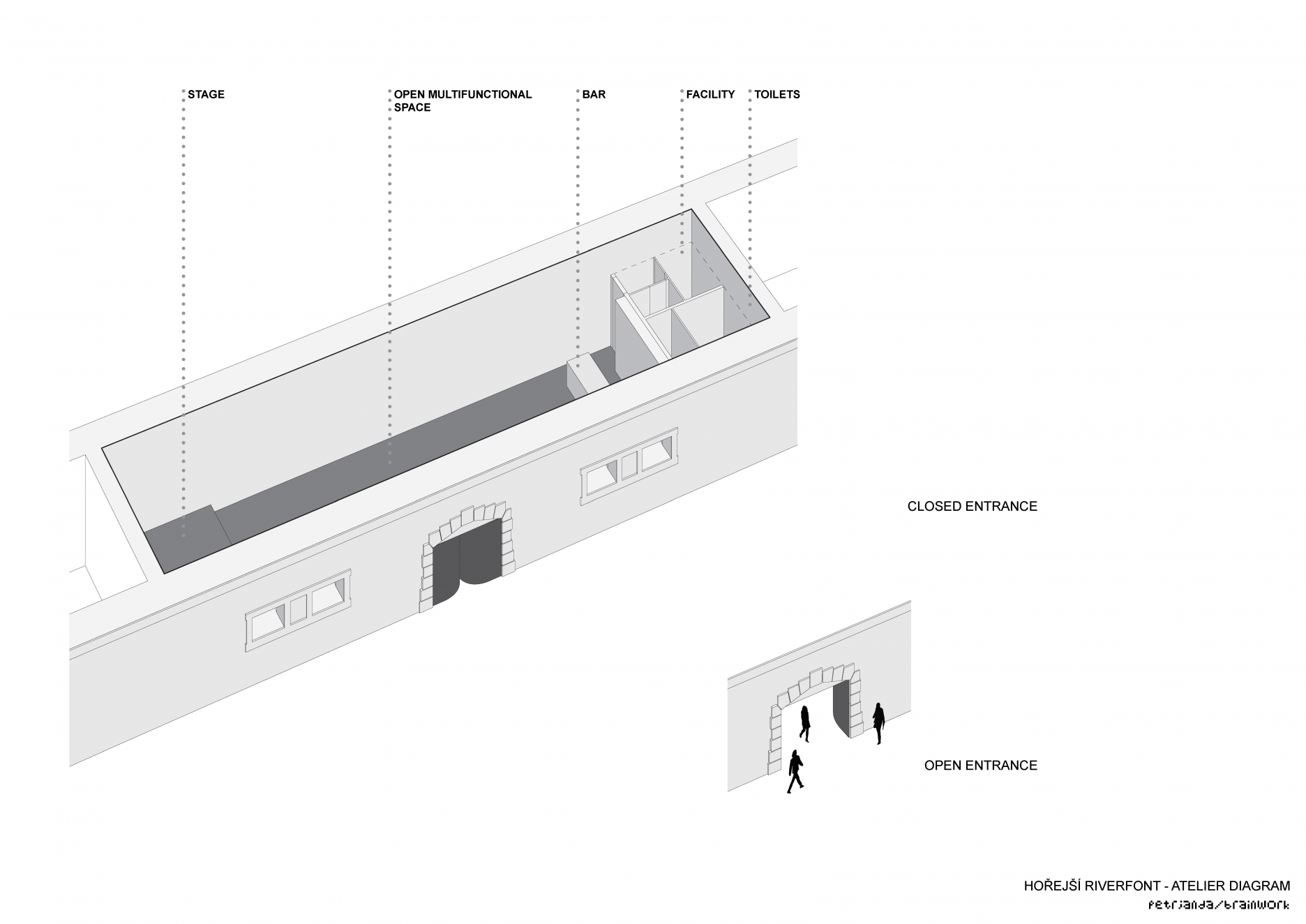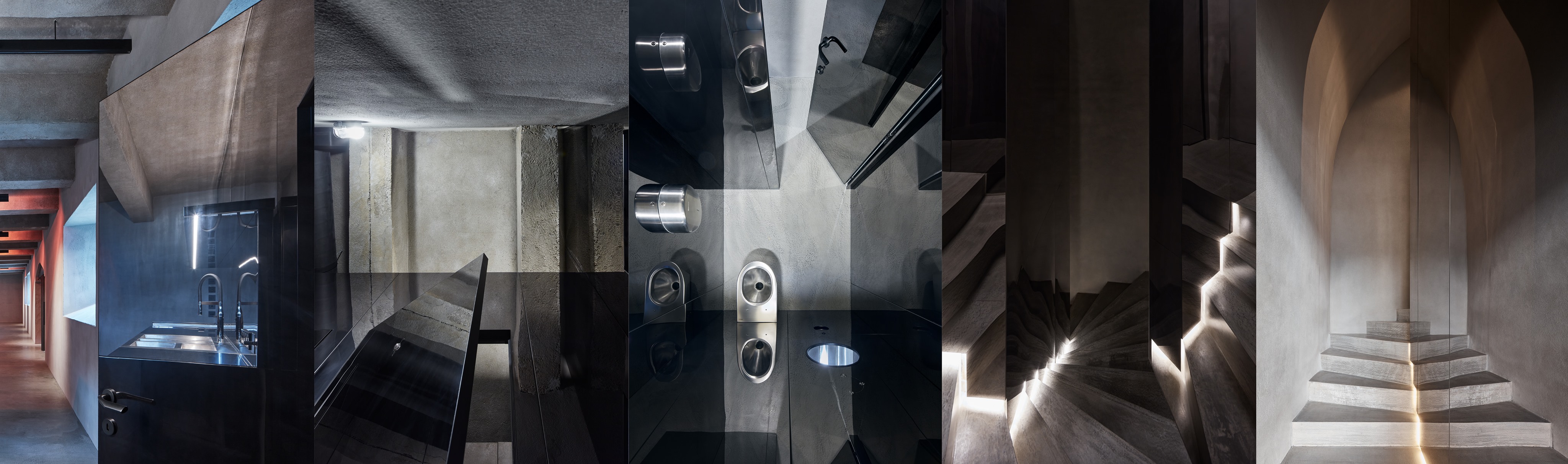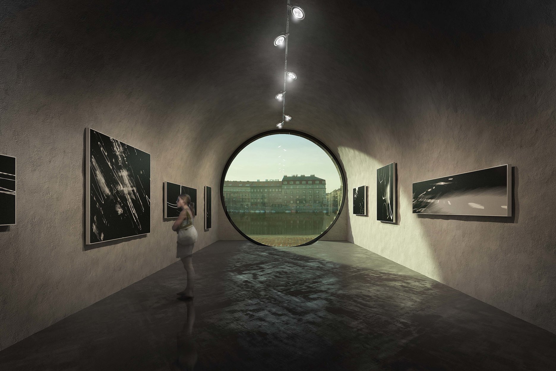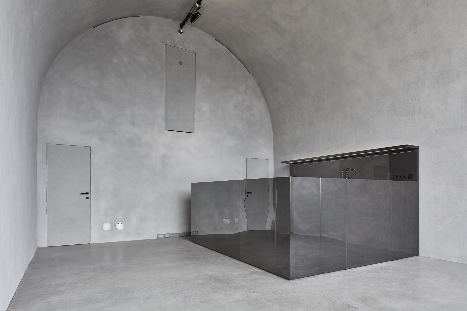 V rámci rekonštrukcie boli vybúrané všetky vstavané prvky, vrátane podláh. Nový interiér je zhotovený metódou kompletnej vostavby do pôvodných priestorov. Protipovodňová základová doska integruje prečerpávacie nádrže. Zaizolované povrchy stien v zaklenutých kobkách, s následnou vrstvou striekaného betónu na nosnú výstuž, sceľujú geometriu valených klenieb. Vstavané monolitické priečky disponujú integrovanými inštalačnými kanálmi. Výrazové riešenie kobiek je zjednotené pre všetky typy priestorov a premieta sa aj do materiálového spracovania. Jemná štruktúra betónových povrchov stien a stropov vznikla pieskovaním. Liata betónová podlaha plynule prechádza do monolitického schodiska. Prvky dverí, poklopov a šácht sú omietnuté a korešpondujú s nadväzujúcim povrchom stien a podláh (pieskovaný a stierkovaný betón, čierna oceľ). Besfalcové dvere disponujú skrytými samozatváračmi. V klenutých kobkách sú do povrchov osadené inserty, slúžiace ako závesný systém pri konaní výstav. Vložené prvky barov a priečok v zázemí sú opláštené čiernym zrkadlovým plechom, vizuálne doplňujúcim geometriu kobiek a prenášajúcim odraz rieky do interiéru. Nepriame osvetlenie toaliet takisto vsádza na odraz svetla od stropu.