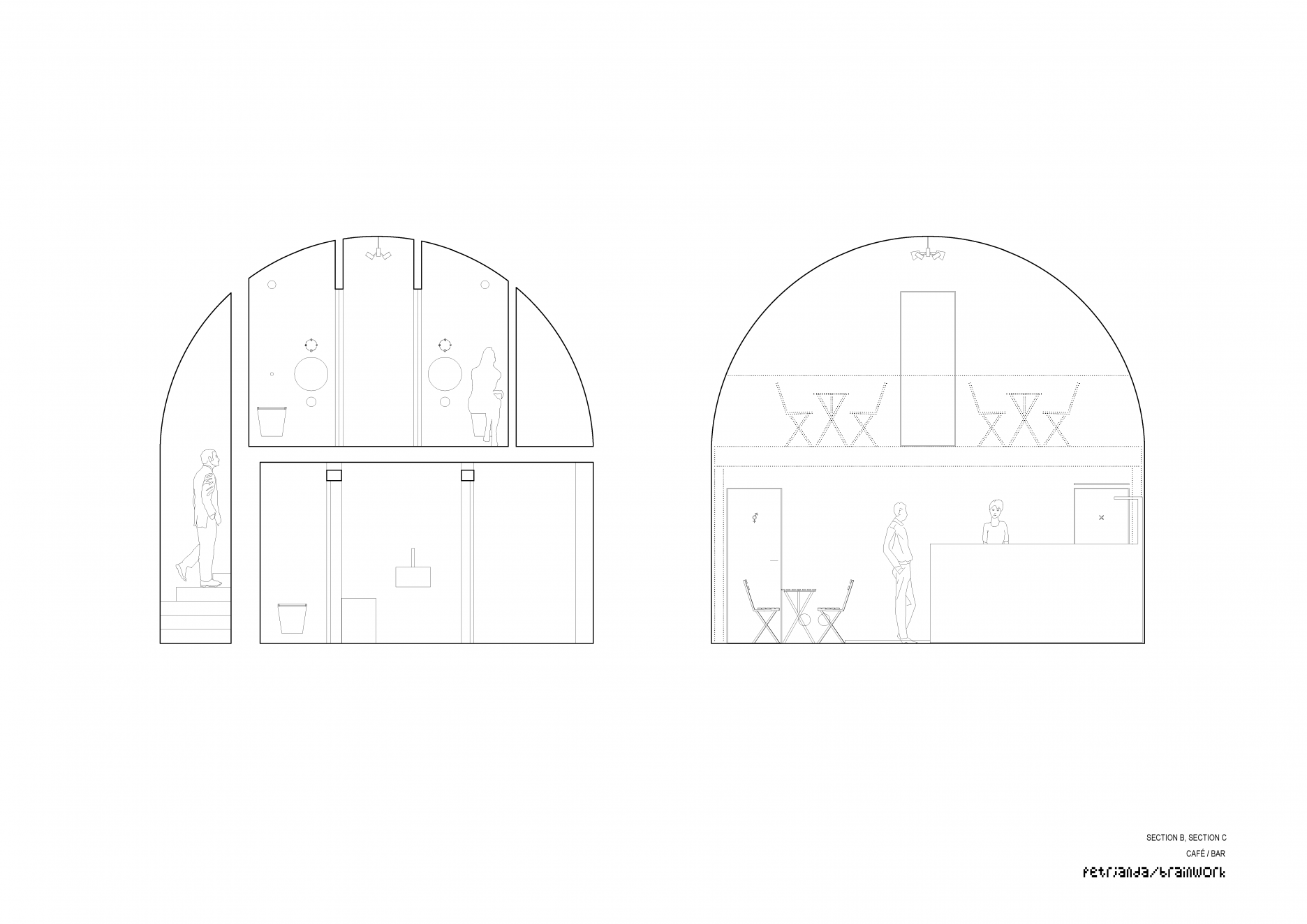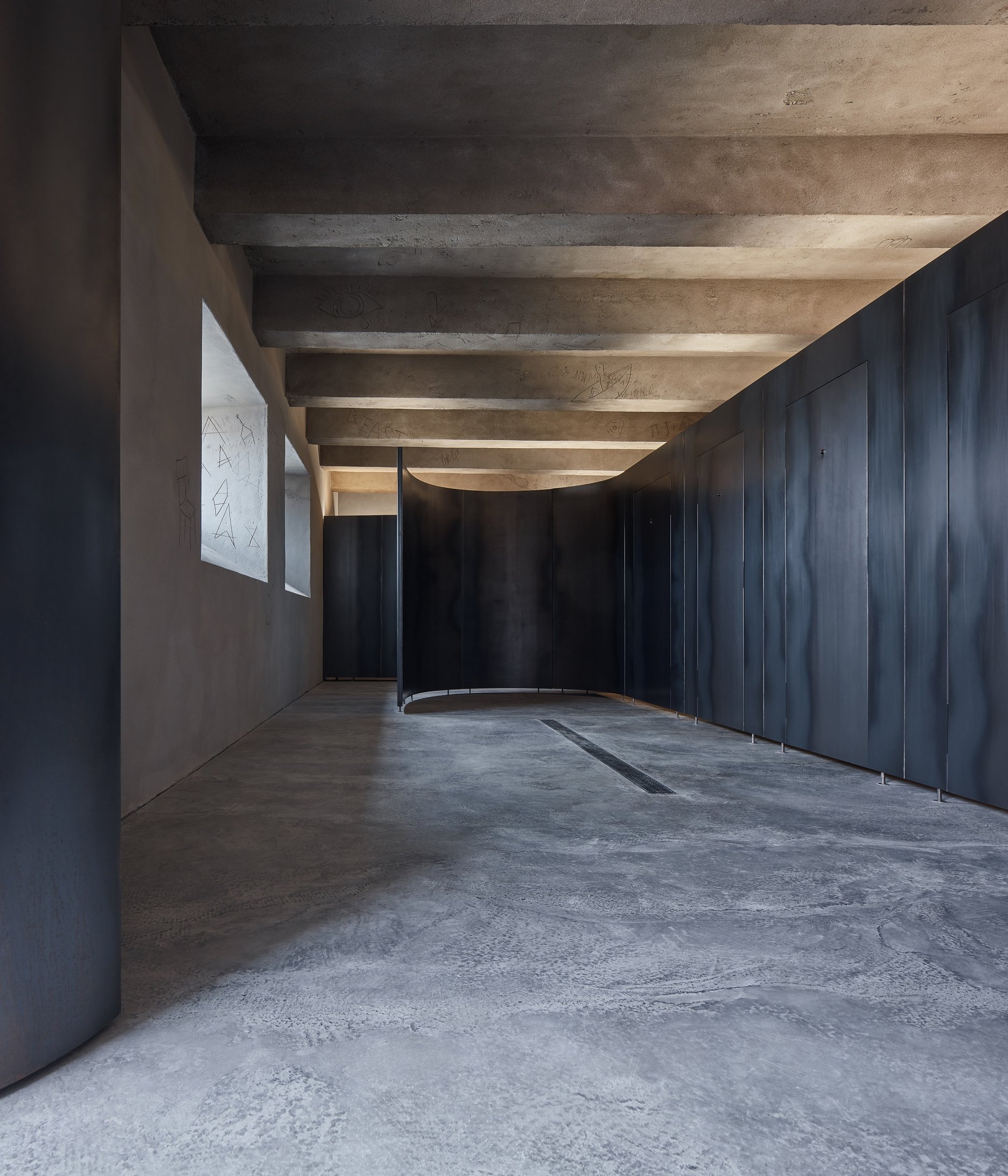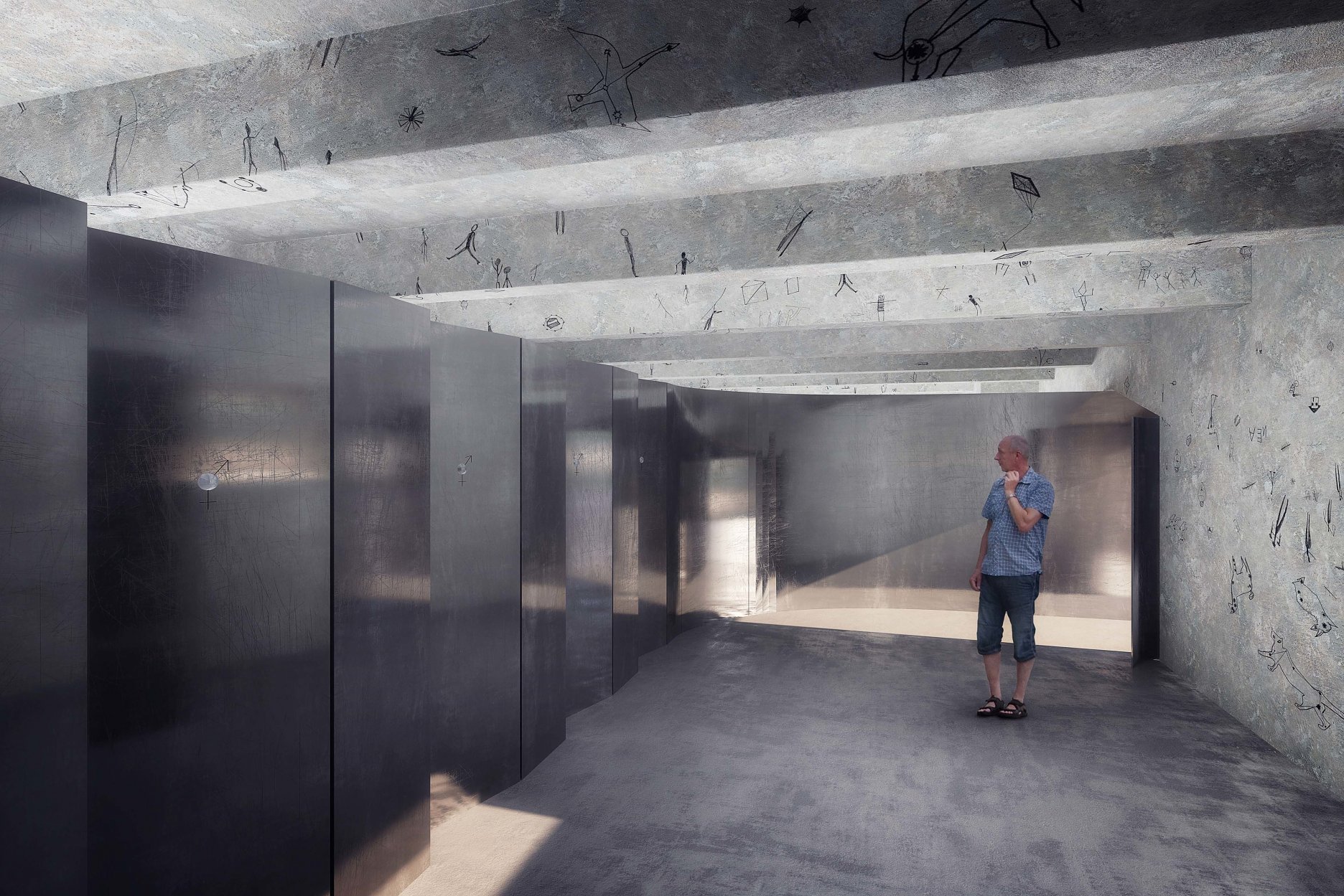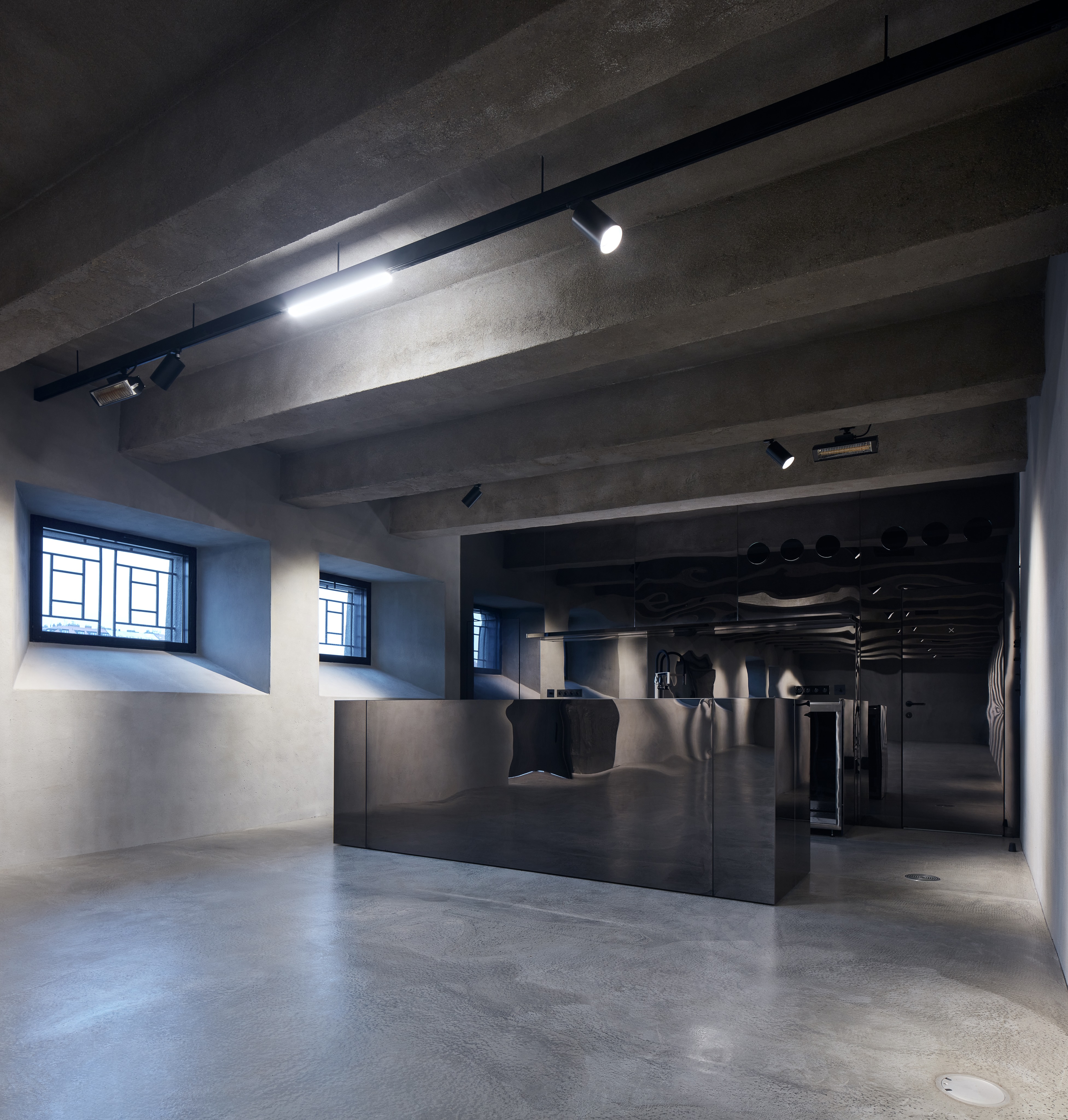 V rámci rekonštrukcie boli vybúrané všetky vstavané prvky, vrátane podláh. Nový interiér je zhotovený metódou kompletnej vostavby do pôvodných priestorov. Protipovodňová základová doska integruje prečerpávacie nádrže. Zaizolované povrchy stien v zaklenutých kobkách, s následnou vrstvou striekaného betónu na nosnú výstuž, sceľujú geometriu valených klenieb. Vstavané monolitické priečky disponujú integrovanými inštalačnými kanálmi. Výrazové riešenie kobiek je zjednotené pre všetky typy priestorov a premieta sa aj do materiálového spracovania. Jemná štruktúra betónových povrchov stien a stropov vznikla pieskovaním. Liata betónová podlaha plynule prechádza do monolitického schodiska. Prvky dverí, poklopov a šácht sú omietnuté a korešpondujú s nadväzujúcim povrchom stien a podláh (pieskovaný a stierkovaný betón, čierna oceľ). Besfalcové dvere disponujú skrytými samozatváračmi. V klenutých kobkách sú do povrchov osadené inserty, slúžiace ako závesný systém pri konaní výstav. Vložené prvky barov a priečok v zázemí sú opláštené čiernym zrkadlovým plechom, vizuálne doplňujúcim geometriu kobiek a prenášajúcim odraz rieky do interiéru. Nepriame osvetlenie toaliet takisto vsádza na odraz svetla od stropu.
