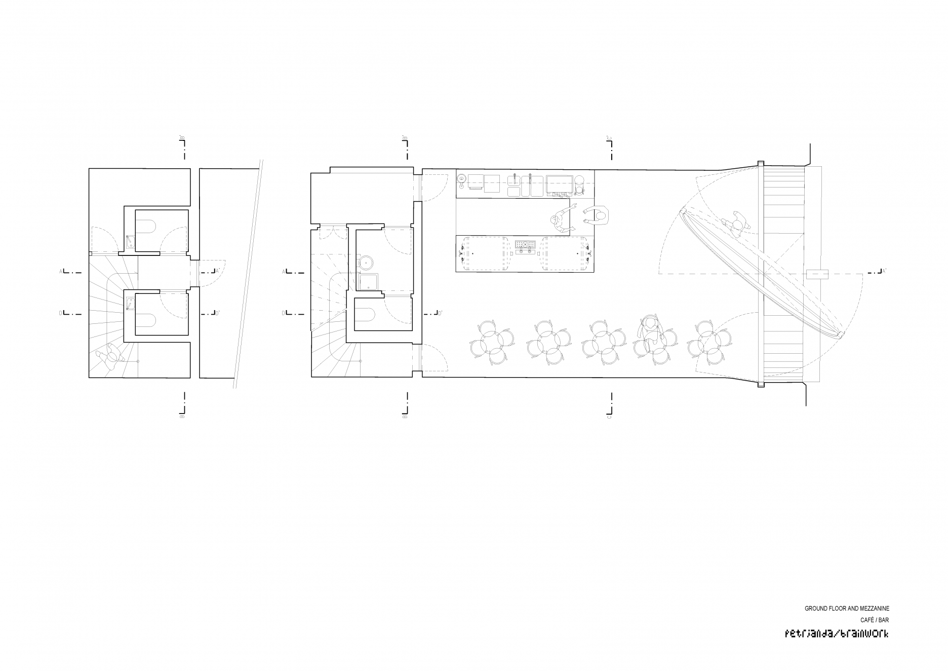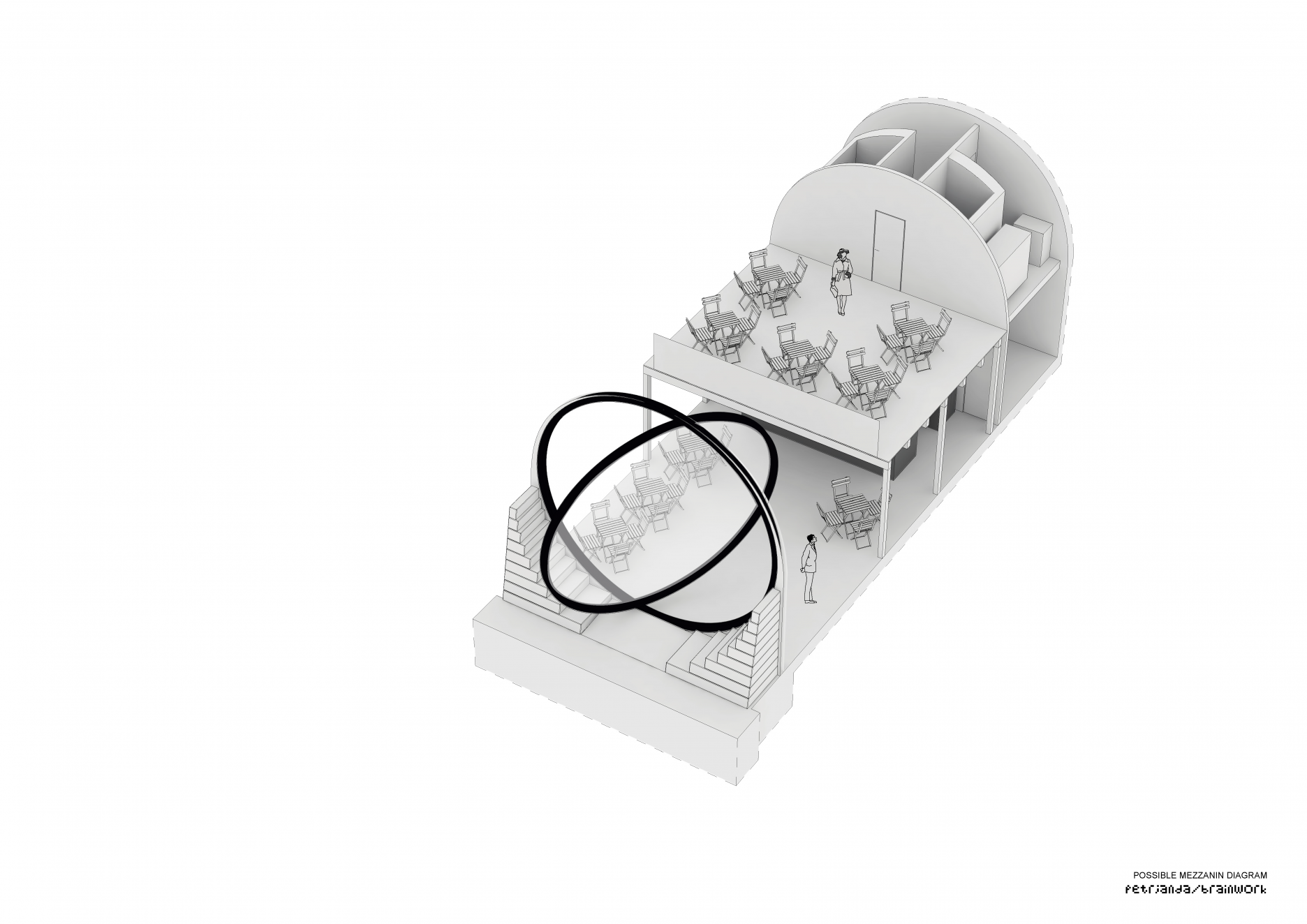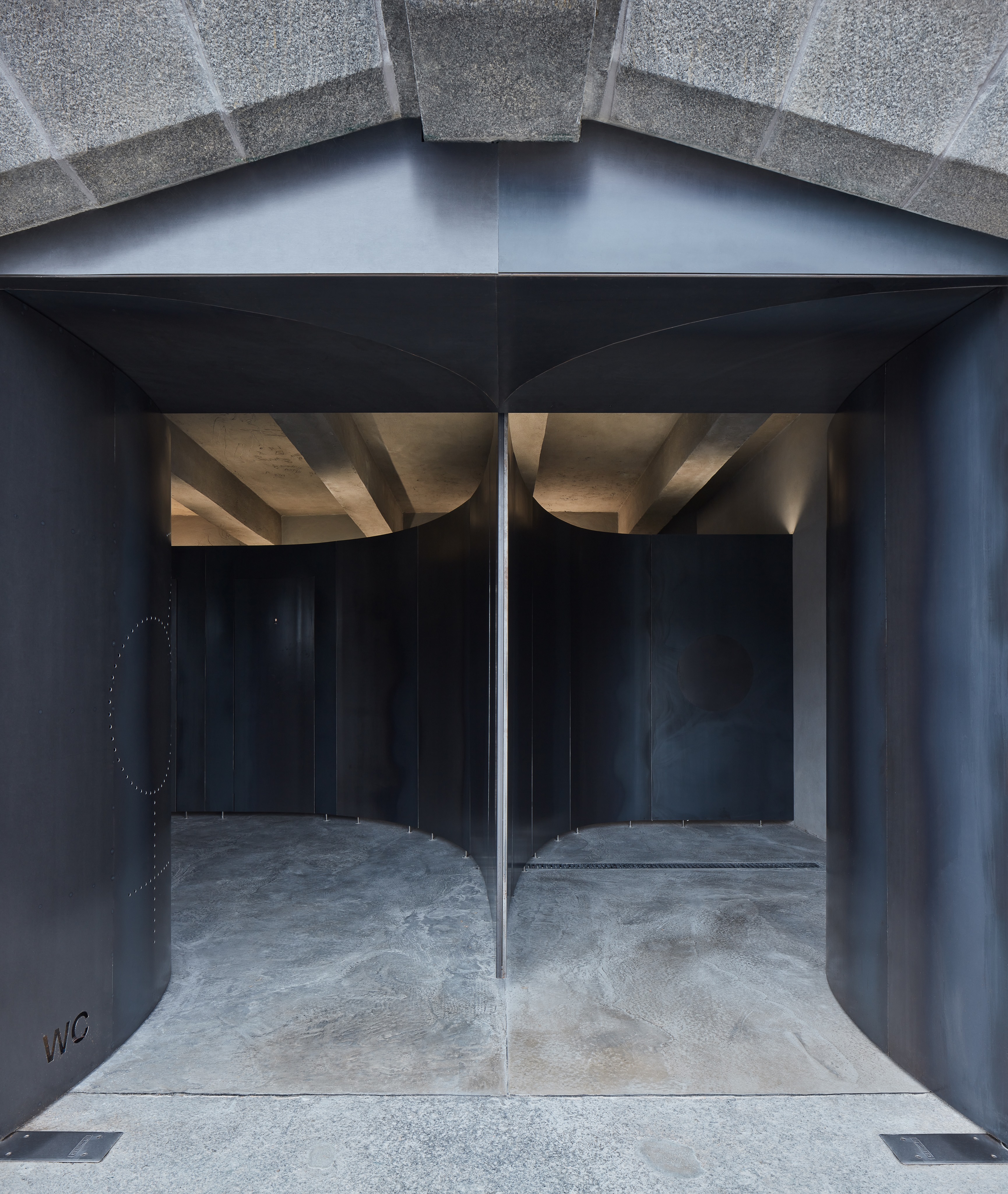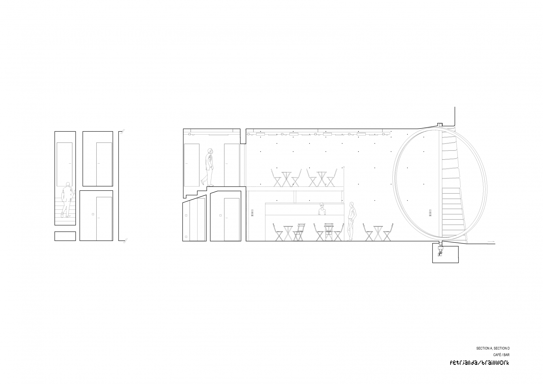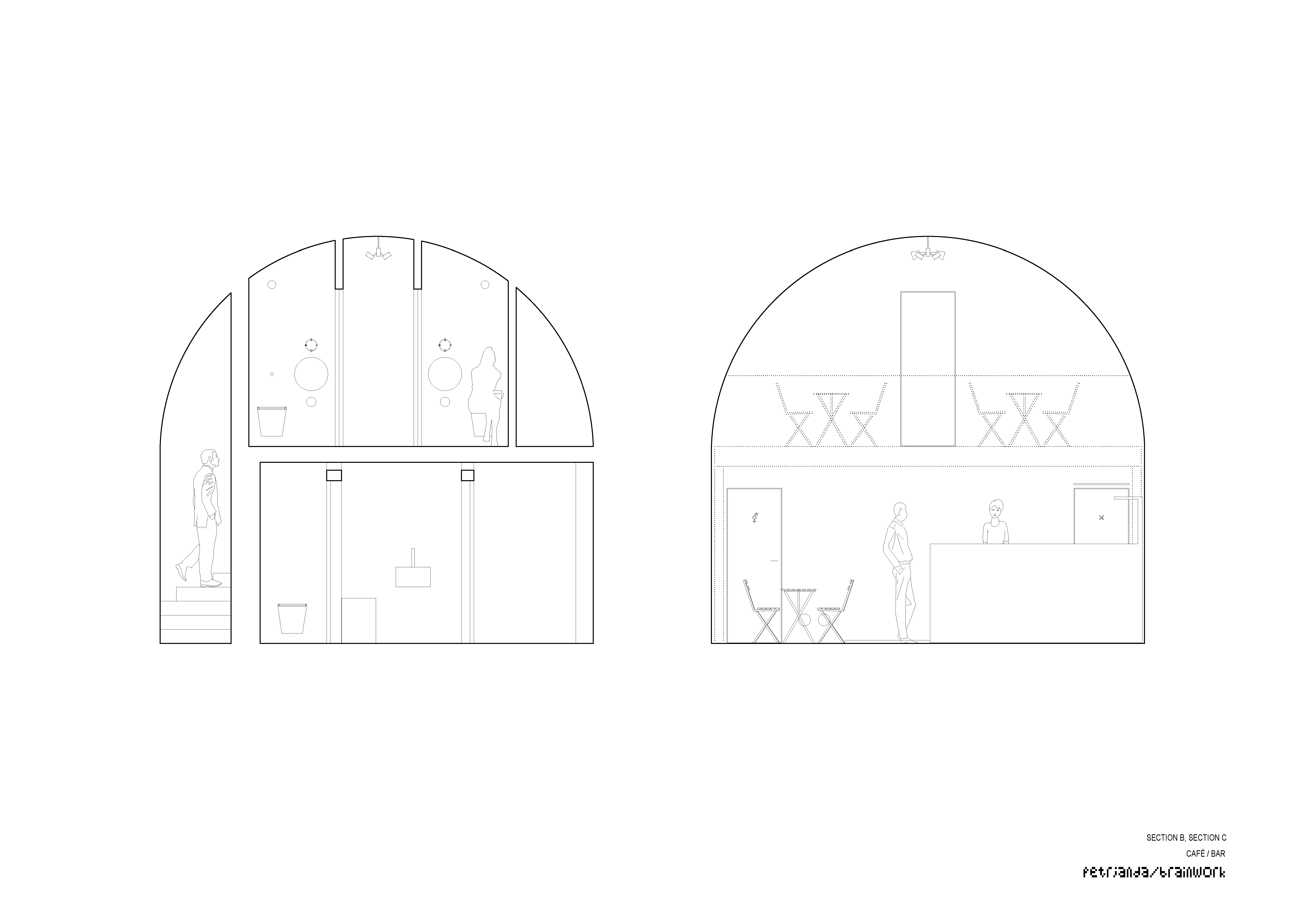 V rámci rekonštrukcie boli vybúrané všetky vstavané prvky, vrátane podláh. Nový interiér je zhotovený metódou kompletnej vostavby do pôvodných priestorov. Protipovodňová základová doska integruje prečerpávacie nádrže. Zaizolované povrchy stien v zaklenutých kobkách, s následnou vrstvou striekaného betónu na nosnú výstuž, sceľujú geometriu valených klenieb. Vstavané monolitické priečky disponujú integrovanými inštalačnými kanálmi. Výrazové riešenie kobiek je zjednotené pre všetky typy priestorov a premieta sa aj do materiálového spracovania. Jemná štruktúra betónových povrchov stien a stropov vznikla pieskovaním. Liata betónová podlaha plynule prechádza do monolitického schodiska. Prvky dverí, poklopov a šácht sú omietnuté a korešpondujú s nadväzujúcim povrchom stien a podláh (pieskovaný a stierkovaný betón, čierna oceľ). Besfalcové dvere disponujú skrytými samozatváračmi. V klenutých kobkách sú do povrchov osadené inserty, slúžiace ako závesný systém pri konaní výstav. Vložené prvky barov a priečok v zázemí sú opláštené čiernym zrkadlovým plechom, vizuálne doplňujúcim geometriu kobiek a prenášajúcim odraz rieky do interiéru. Nepriame osvetlenie toaliet takisto vsádza na odraz svetla od stropu.