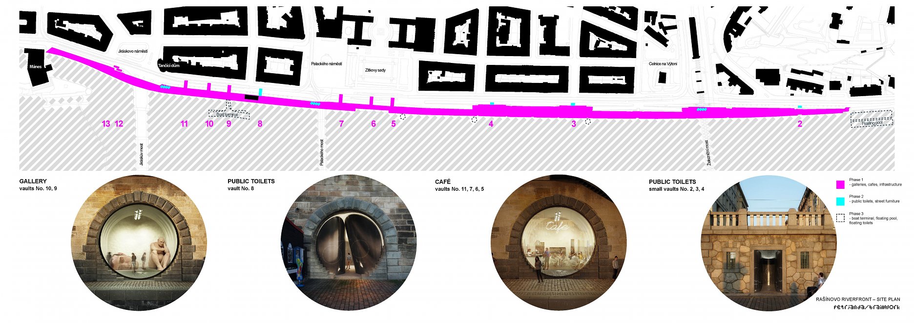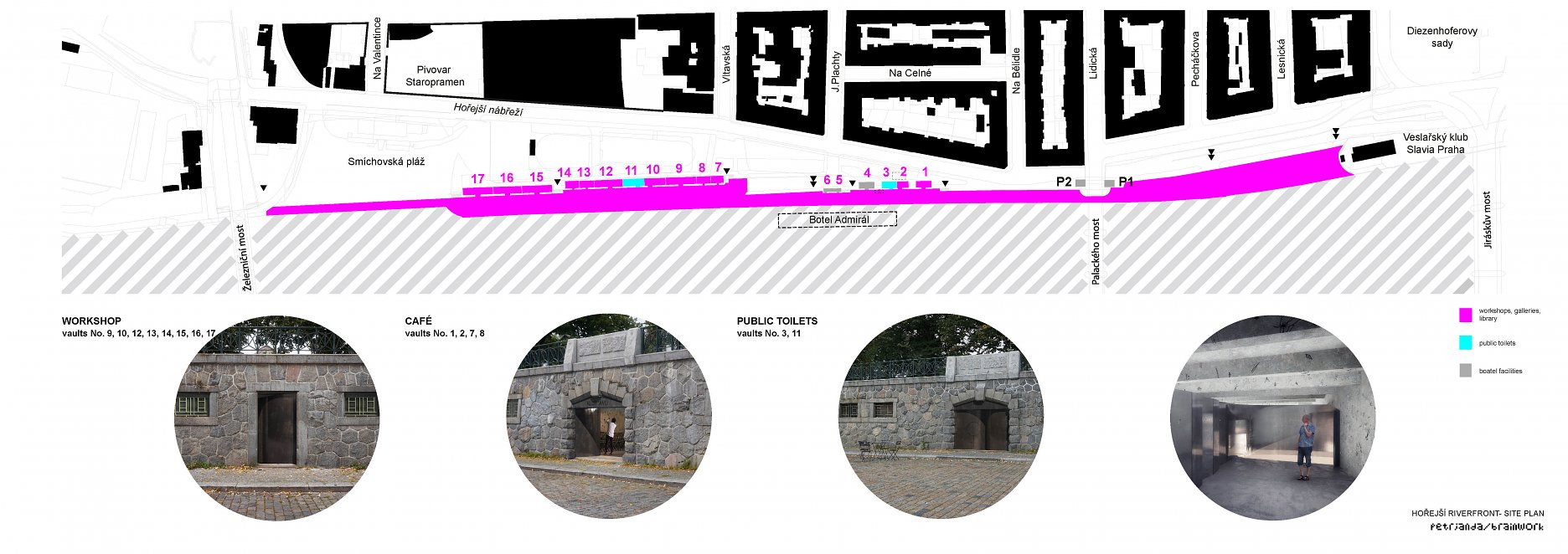 Revitalizácia pražských náplaviek je jedna z najväčších investícií českej Metropoly do verejného priestoru za posledné desiatky rokov. Od prvotných impulzov tento proces trvá viac ako desať rokov. Novootvorené a využité kobky v nábrežnom múre vytvárajú tak potrebné zázemie a predlžujú “náplavkovú sezónu” na celý rok. Za projektom od počiatku stojí architekt Petr Janda a jeho ateliér brainwork.