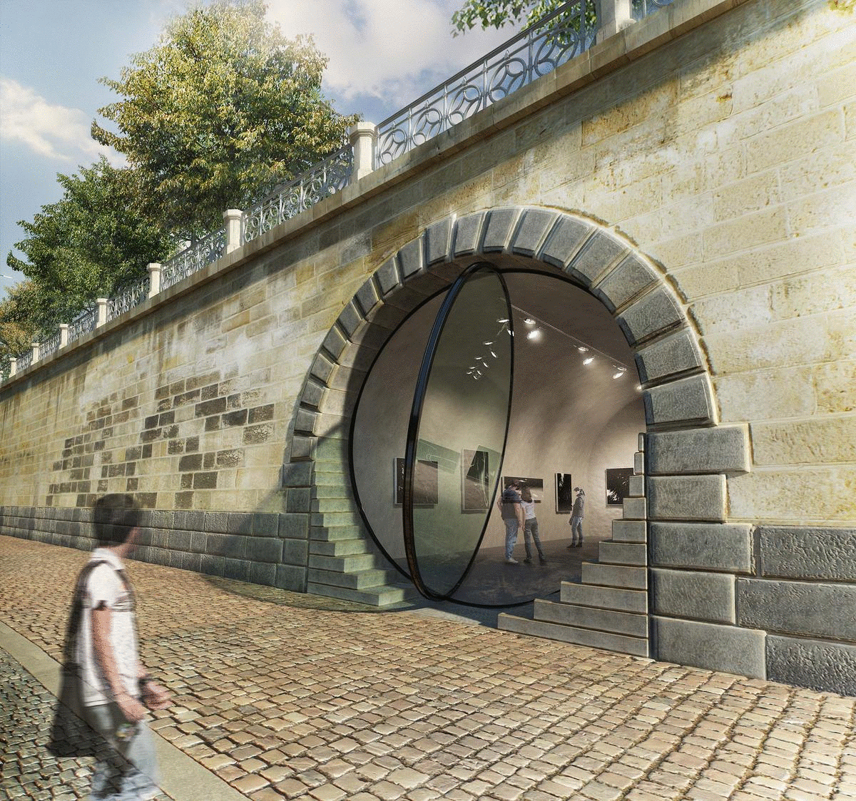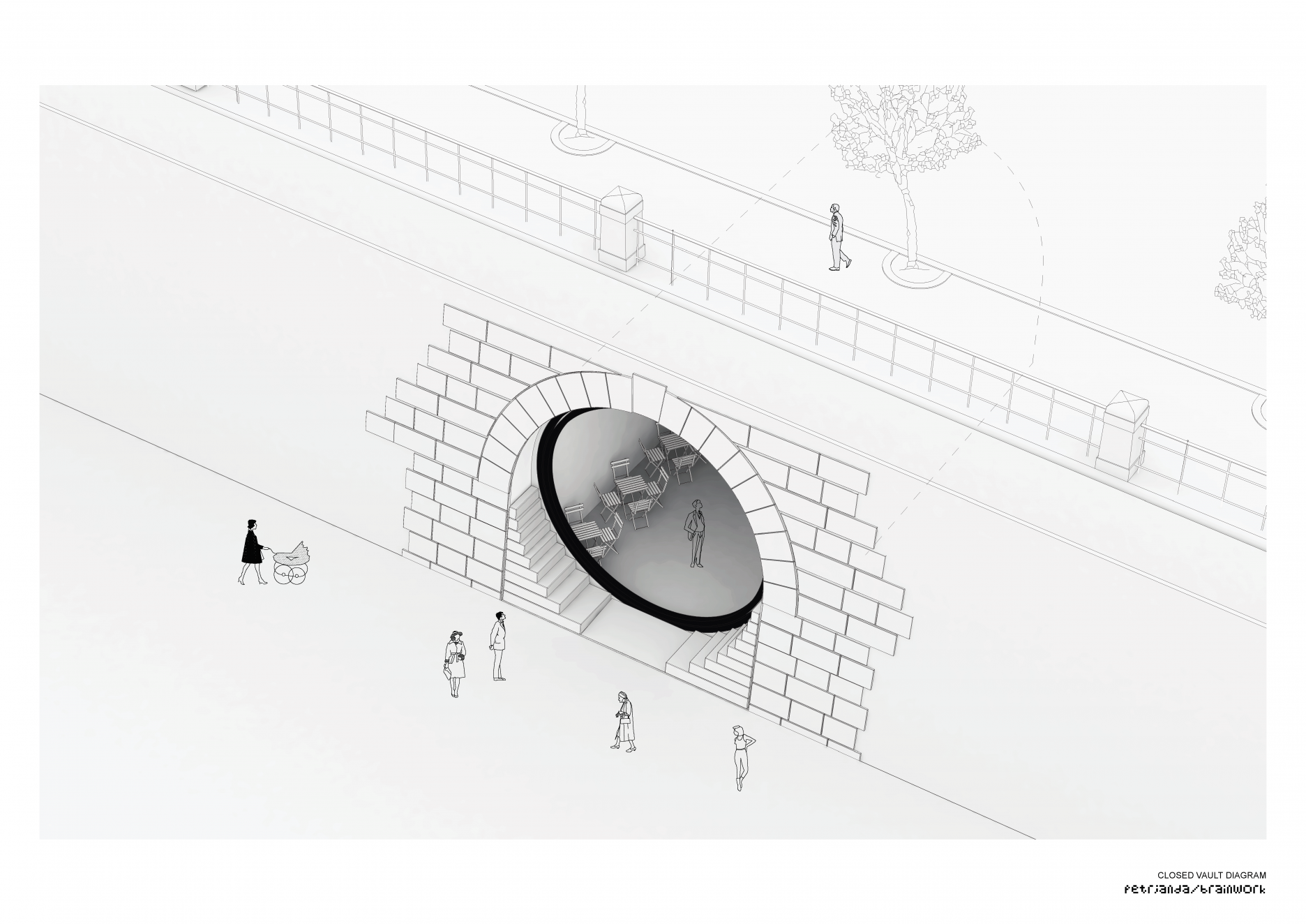 Autori sa snažia o symbiotické splynutie s pôvodnou architektúrou nábrežného múru, do ktorého kobky prirodzene “vrastajú”. Drobná akupunktúra formuje rozsiahly celok. Podstatou realizácie bolo, prostredníctvom otvorenia prierezu existujúcich otvorov v ostení, čo možno najpriamejšie prepojenie kobiek s priestorom náplaviek,. Architektonické riešenie reaguje na kontext miesta a pracuje s minimálnymi výtvarnými prostriedkami. V prospech očistenia existujúcich tvarov a hľadania nových priehľadových väzieb a možnosťí, vyplývajúcich z prostredia náplaviek.