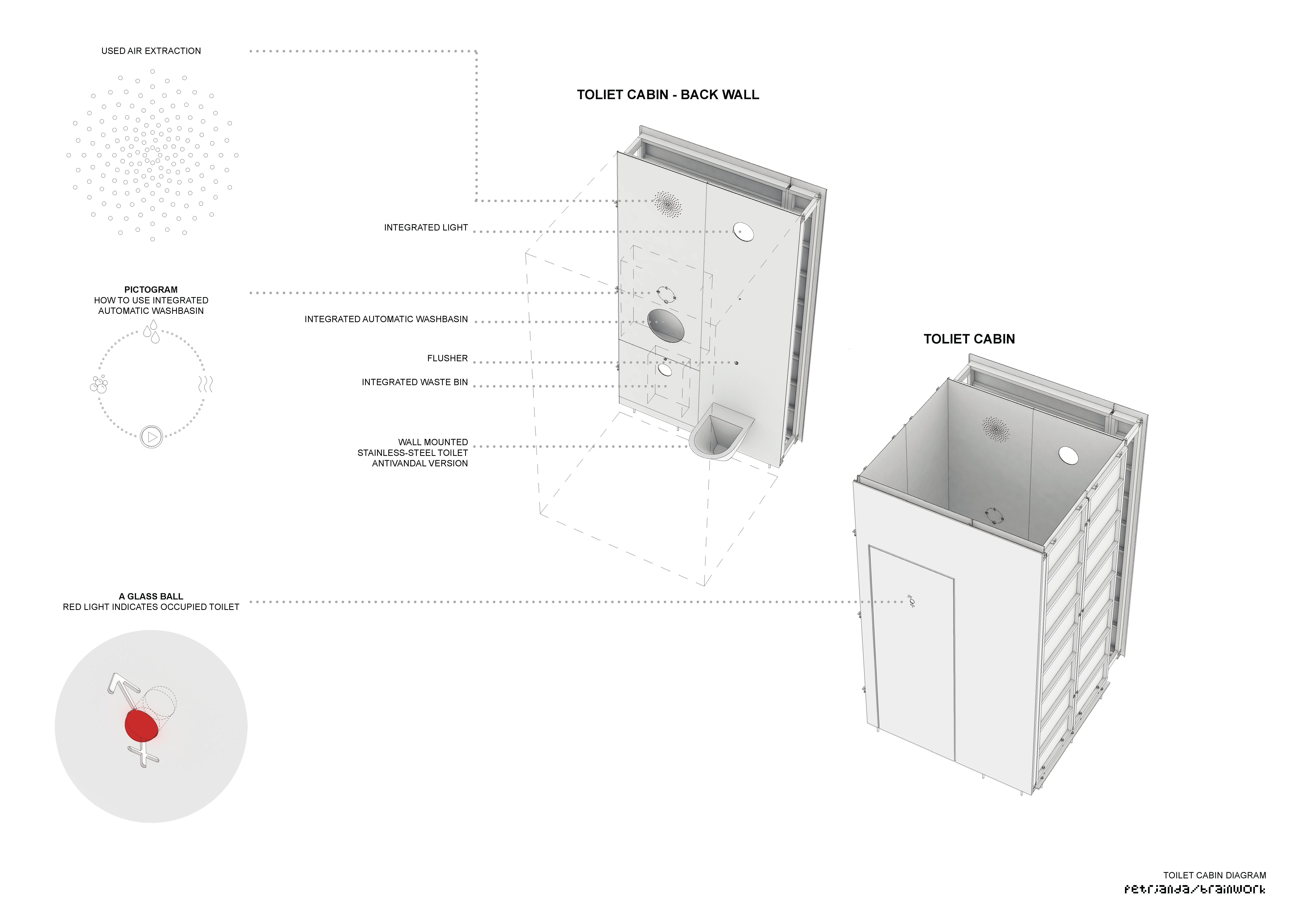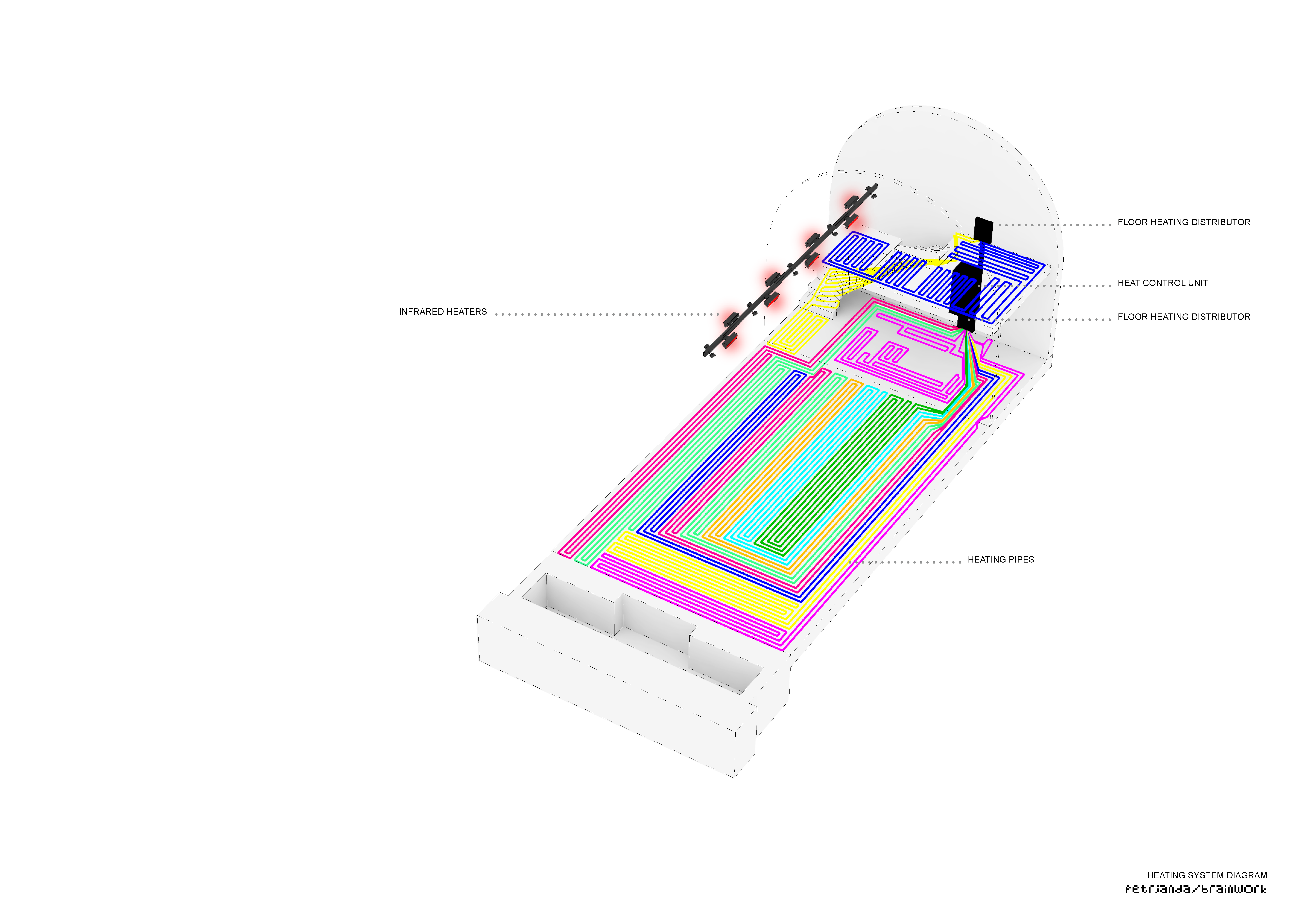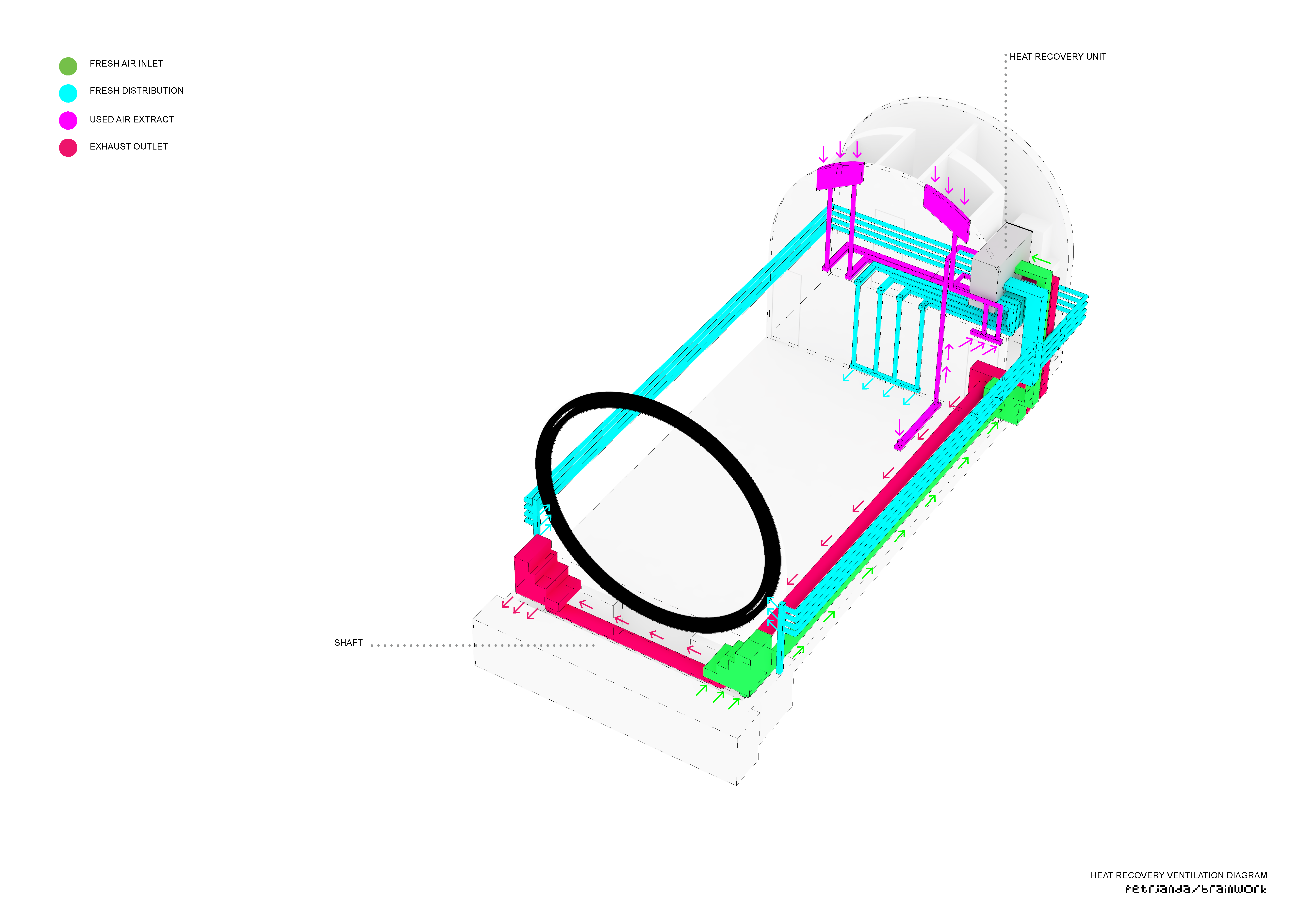 Vzduchotechnika s rekuperáciou a vykurovaním podláh umožňuje spolu s infražiaričmi celoročnú prevádzku. Preferovaným módom je celoročné otvorenie priestoru a prepojenie s náplavkou. Všetky rozvody sú integrované do konštrukcií kobiek tak, aby nezasahovali do ich vizuálnej artikulácie a architektonického riešenia. Vzduchotechnika ústi v atypických výduchoch, vložených na Rašínovom nábreží do špár “schodiskového portálu” a vnútorných štrbín. Na Hořejšícho nábreží do ostení okien a výustok v podlahe a stenách. Vyústenie elektroinštalácií, vody a kanalizácie je integrované do “podlahových krabíc”. Kobky sú bezbariérové, zato však chránené mobilnými protipovodňovými lamelami. Definíciu kobky ako exteriérového zálivu náplavky, umožnilo riešenia toaliet ako modulárnych, plne vybavených WC kabín, ktoré sú opakom štandardného riešenia s predsieňou a neadekvátnymi priestorovými nárokmi. Plne vybavené kabíny obsahujú nerezové WC, osadené na chrbtovej stene kabíny spolu s na mieru vyrobeným automatickým umývadlom, sušičom rúk, osvetlením, košom a ventilátorom. Systém kanalizácie je riešený ako tlaková prečerpávacia sústava.