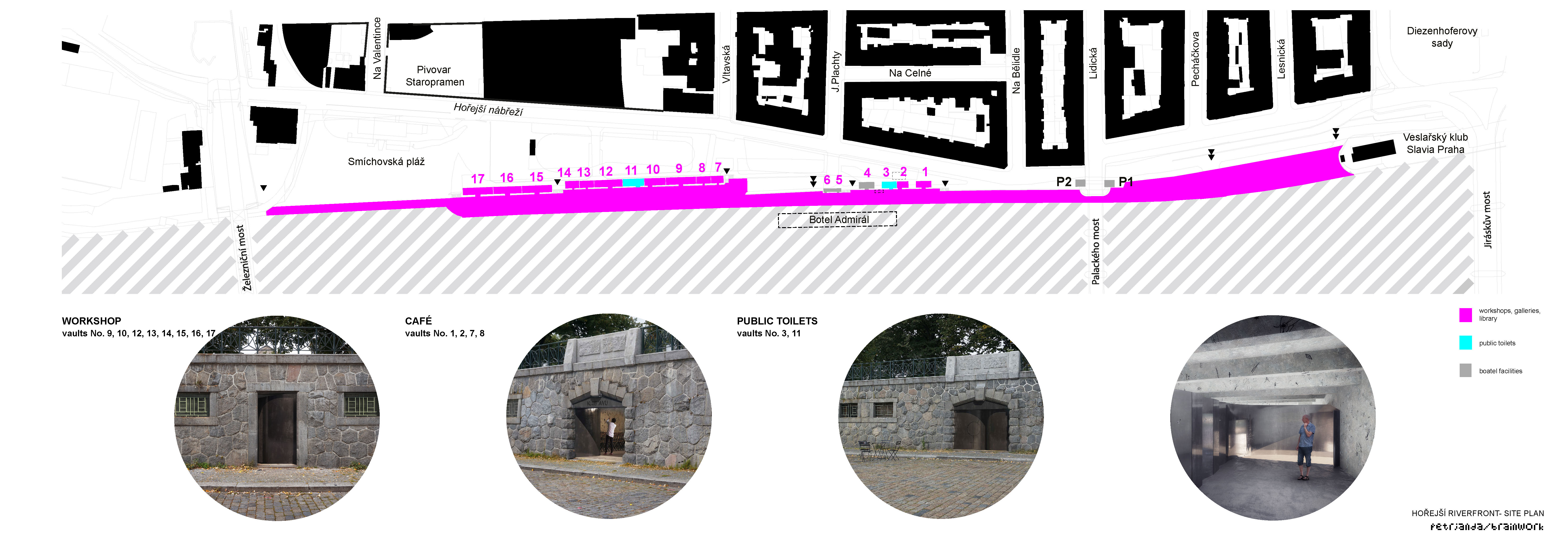 Po dokončení rozsiahleho projektu budú kobky využité ako kaviarne, kluby, ateliéry, dielne, galéria, pobočka knižnice, alebo verejné WC. Architektonické riešenie pracuje s modulárnou diverzitou. Priestory sú dotiahnuté do detailne prepracovaného základu, vrátane prevádzkovo-technického zázemia a barových korpusov, premiestniteľných do niekoľkých pozícií. Vopred vypracovaný manuál zahŕňa pravidlá pre označenie prevádzok a dopĺňanie vstavaných prvkov (vložené podlažia do veľkých kobiek, exteriérový bar...). Pritom je kladený dôraz na možné doplnenie každej z kobiek o sedací nábytok a ďalšie interiérové prvky. Architekti supervízujú jednotlivé riešenia s cieľom zachovania základnej vízie priestoru. Zároveň však vytvárajú priestor pre autenticitu každého z podnikov. “Snažíme se být provozovatelům oporou a architektonicky zůstat spíše v pozadí, nechat vyznít diverzitu názorů. I když to v realitě často znamená jinou architektonickou citlivost, máme za to, že to kobky s naším základním řešením unesou,” dopĺňajú autori. Do zrekonštruovaných priestorov sa vracia väčšina prevádzkovateľov, ktorí spoluvytvárali fenomén náplavky. “Pôvodné” prevádzky dopĺňajú noví nájomcovia, ktorí boli v otvorenej súťaži vybraní zo širokého spektra zámerov. “V rámci práce na architektonickém řešení jsme iniciovali vznik programové metodiky provozu náplavek, na základě které vznikla pozice kurátora doplňující funkční trojúhelník správce - architekt - kurátor o autoritu usilující o udržení kulturně společenské podstaty tohoto velmi cenného veřejného prostoru,” popisujú architekti ojedinelý koncept.
