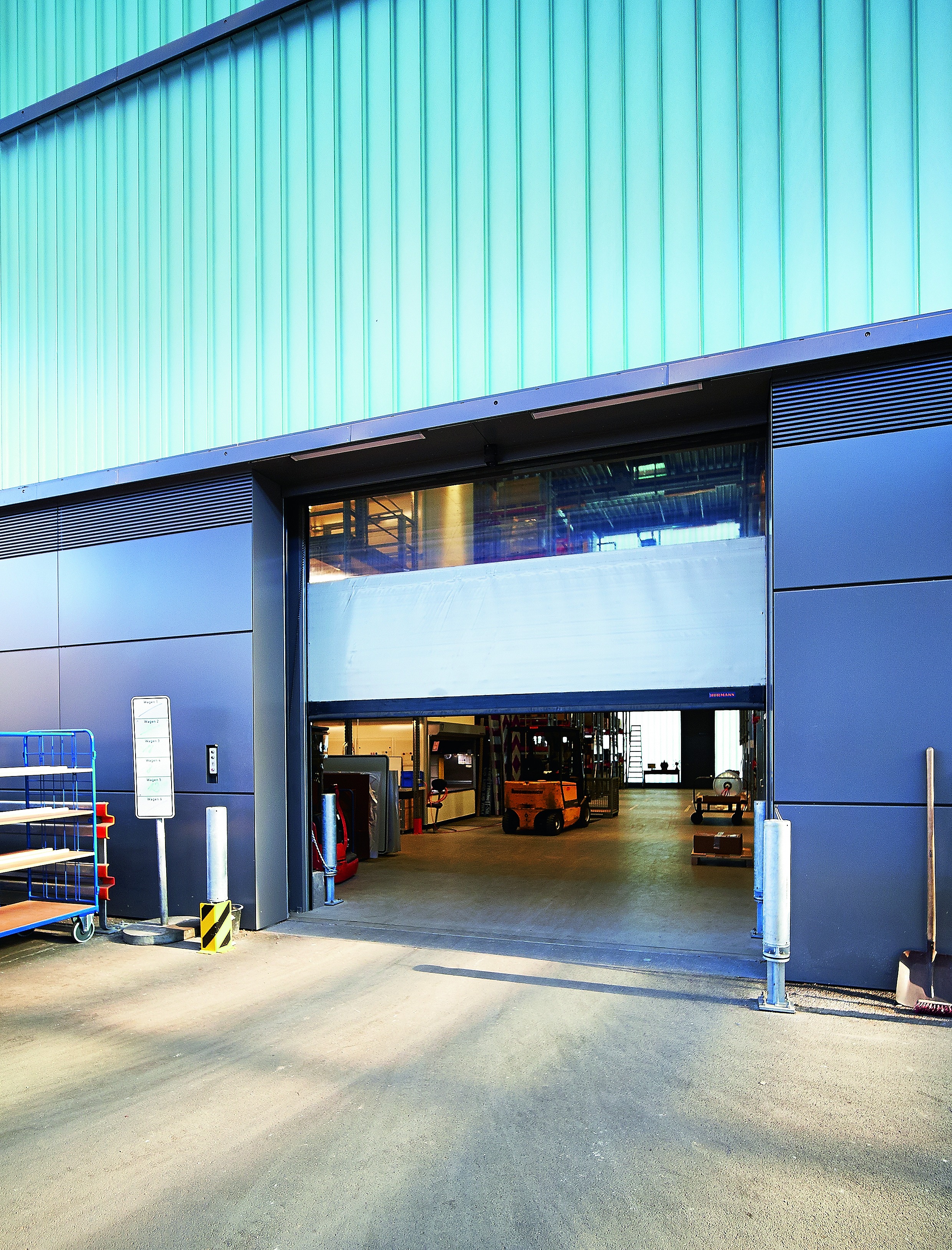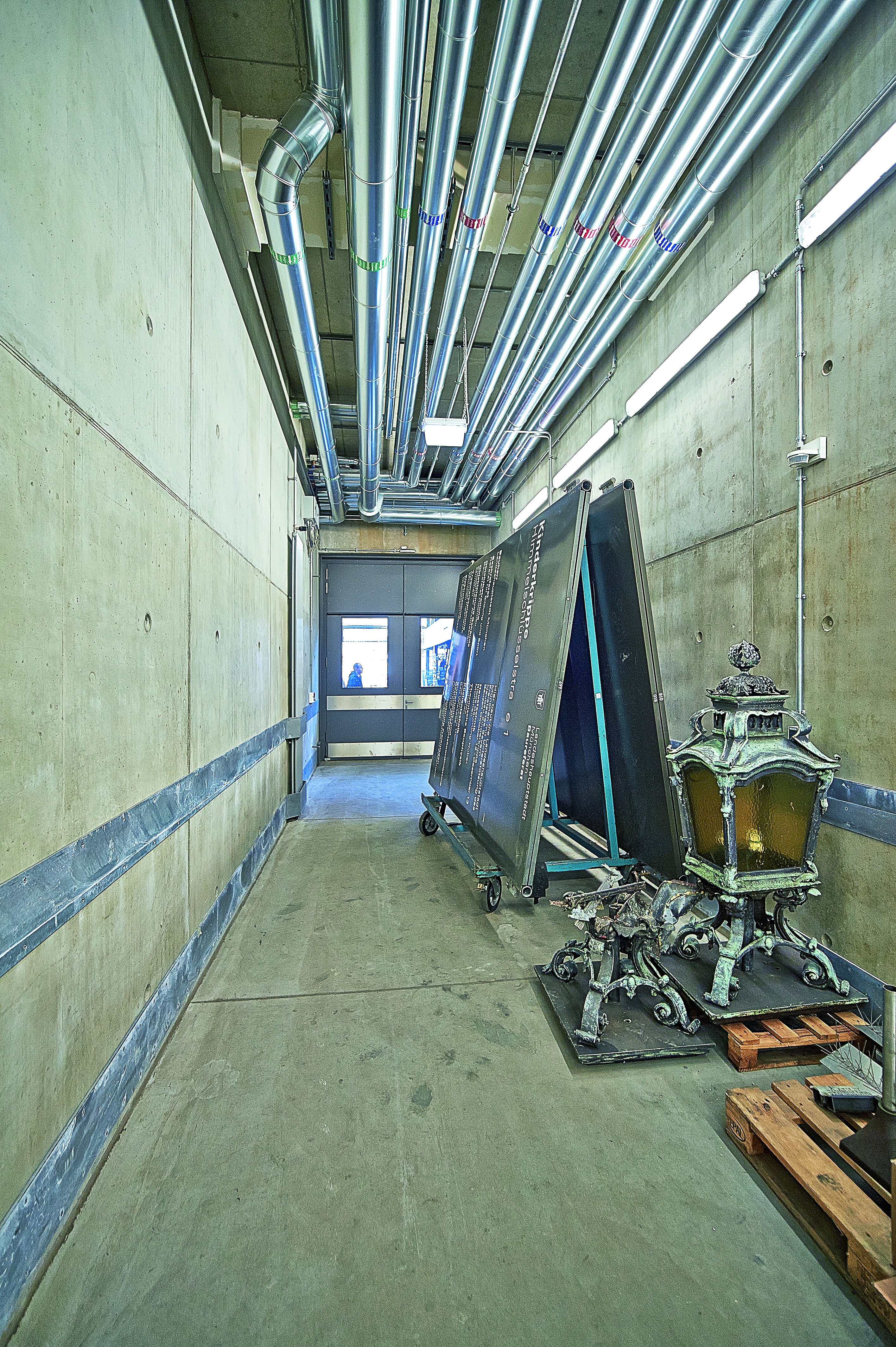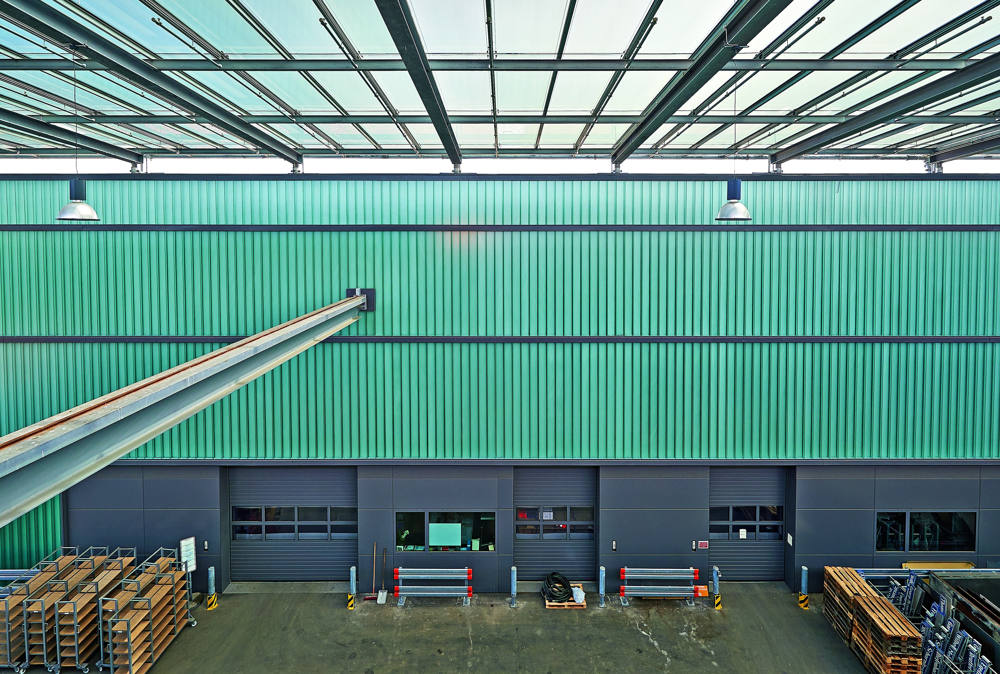 Keď sa k budove priblížime, začneme vnímať rozdielny charakter konštrukcie jednotlivých traktov, ktoré sa ukrývajú pod plášťom. Napriek tomu že na prvý pohľad vyzerajú rovnako, obe časti majú zásadný rozdiel v charaktere používania. Oceľová konštrukcia haly je nevykurovaná. Nachádzajú sa tu skladovacie priestory pre všetky druhy materiálov, ako sú káble, dopravné značky, semafory a pouličné osvetlenie, rovnako ako garáž pre vozidlá údržby. Na najvyššom poschodí a na streche sú ďaĺšie parkovacie plochy a priestor pre servis a vozidlá zamestnancov. Vo vykurovanom trakte sa nachádza centrum riadenia dopravy. Dielne a jedáleň sú situované na prízemí a kancelárie vedenia na poschodí. Priemyselné brány Hörmann s vynikajúcou tepelnou izoláciou zaisťujú, že teplo cez veľké otvory v konštrukcii neuniká.