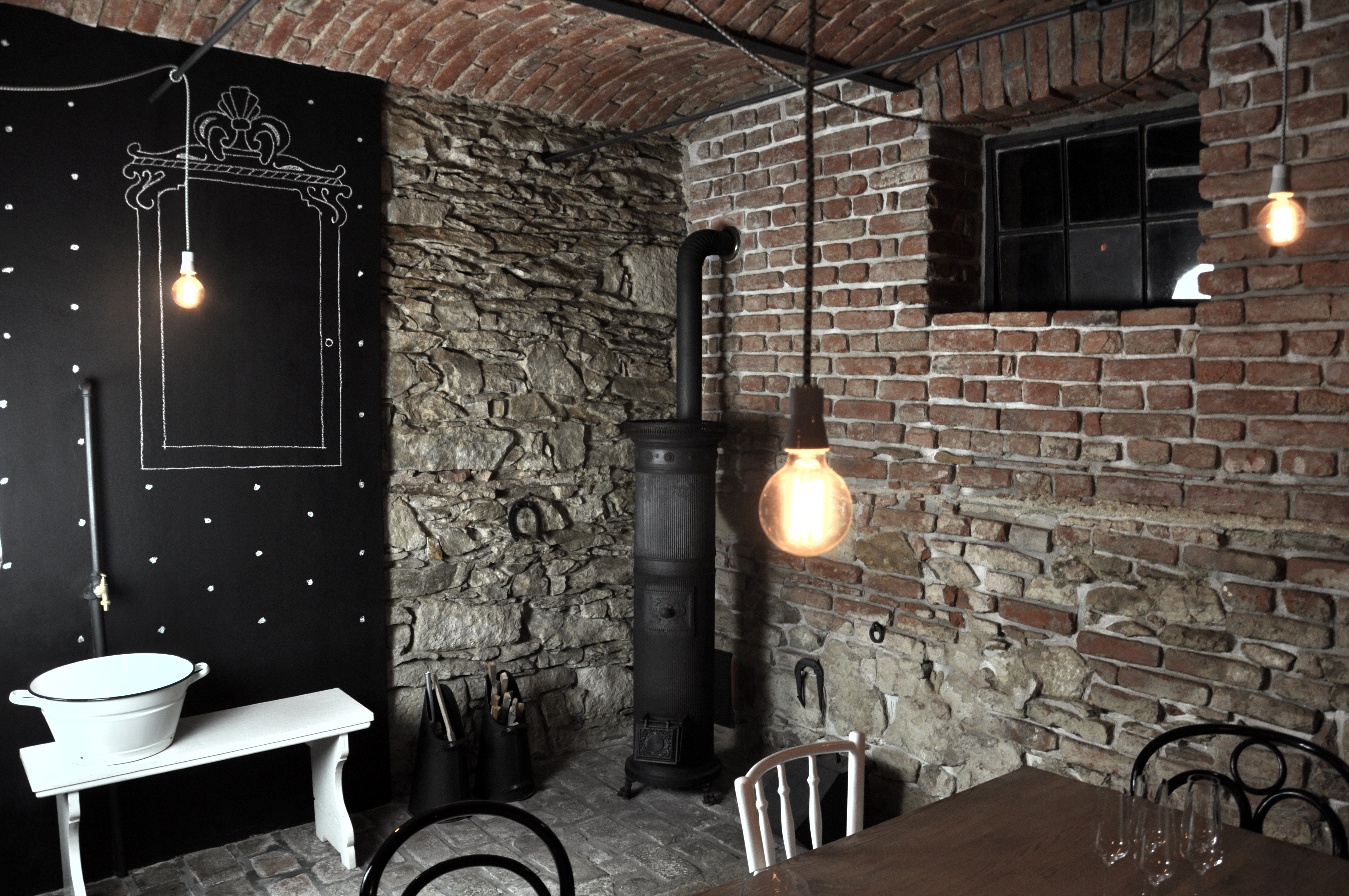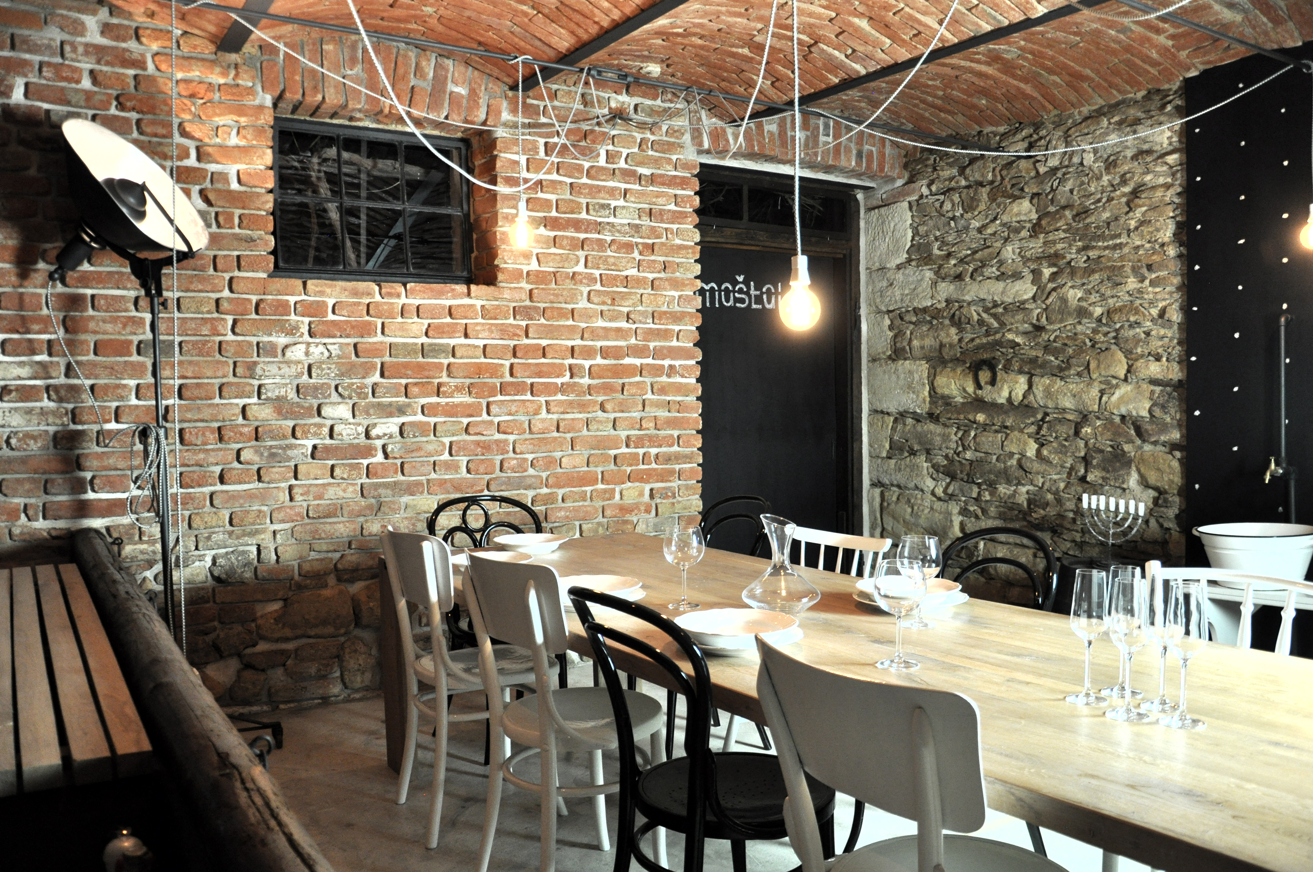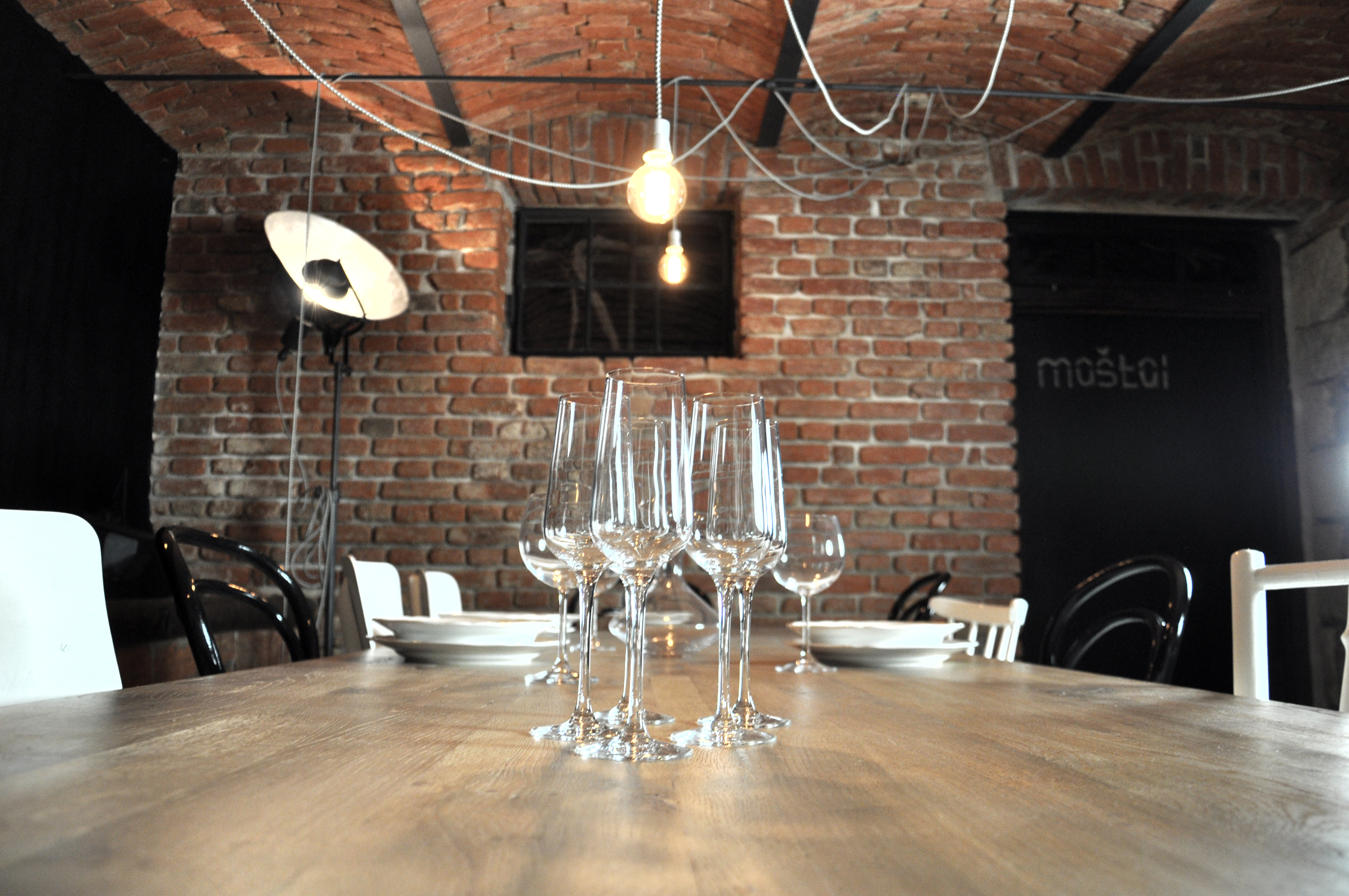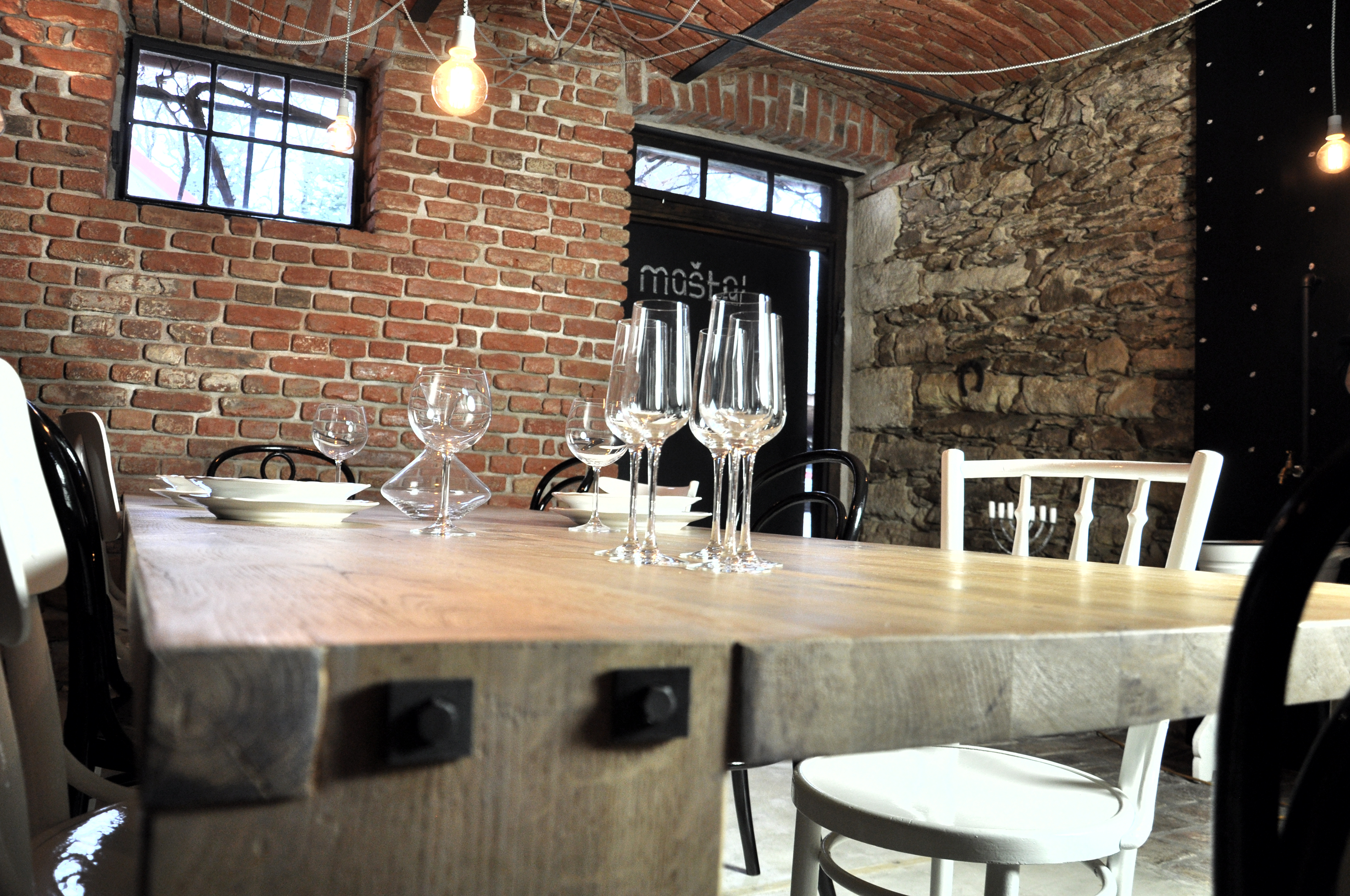 Dubový stôl, vyhotovený podľa návrhu architektov, je umiestnený v strede miestnosti. Ku stolu boli postupne vyberané staré stoličky z ohýbaného dreva. Zaujímavosťou stolu, ktorý meria na dĺžku viac ako tri metre, je jeho netradičná konštrukcia bez výstuže. Tuhosť zabezpečuje štvorica drevených nôh obdĺžnikového pôdorysu, ktoré sú pomocou závitových tyčí kotvené k vrchnej doske. Obdĺžnikové nohy stolu sú rôzne smerovo prestriedané tak, aby zaistili stabilitu. Osvetlenie priestoru zabezpečujú retro žiarovky voľne zavesené na nových oceľových tiahlach. Prívody k jednotlivým zdrojom osvetlenia sú riešené priznanými textilnými káblami s čiernobielym „žehličkovým“ vzorom. Atmosféru v interiéri dotvára zrekonštruovaná liatinová pec s viac ako storočnou históriou a starý fotografický reflektor, ktorý osvetľuje stropné klenby. Vzniká tak miesto kde si možno vychutnať víno vyrobené a dopestované na okolitom statku.