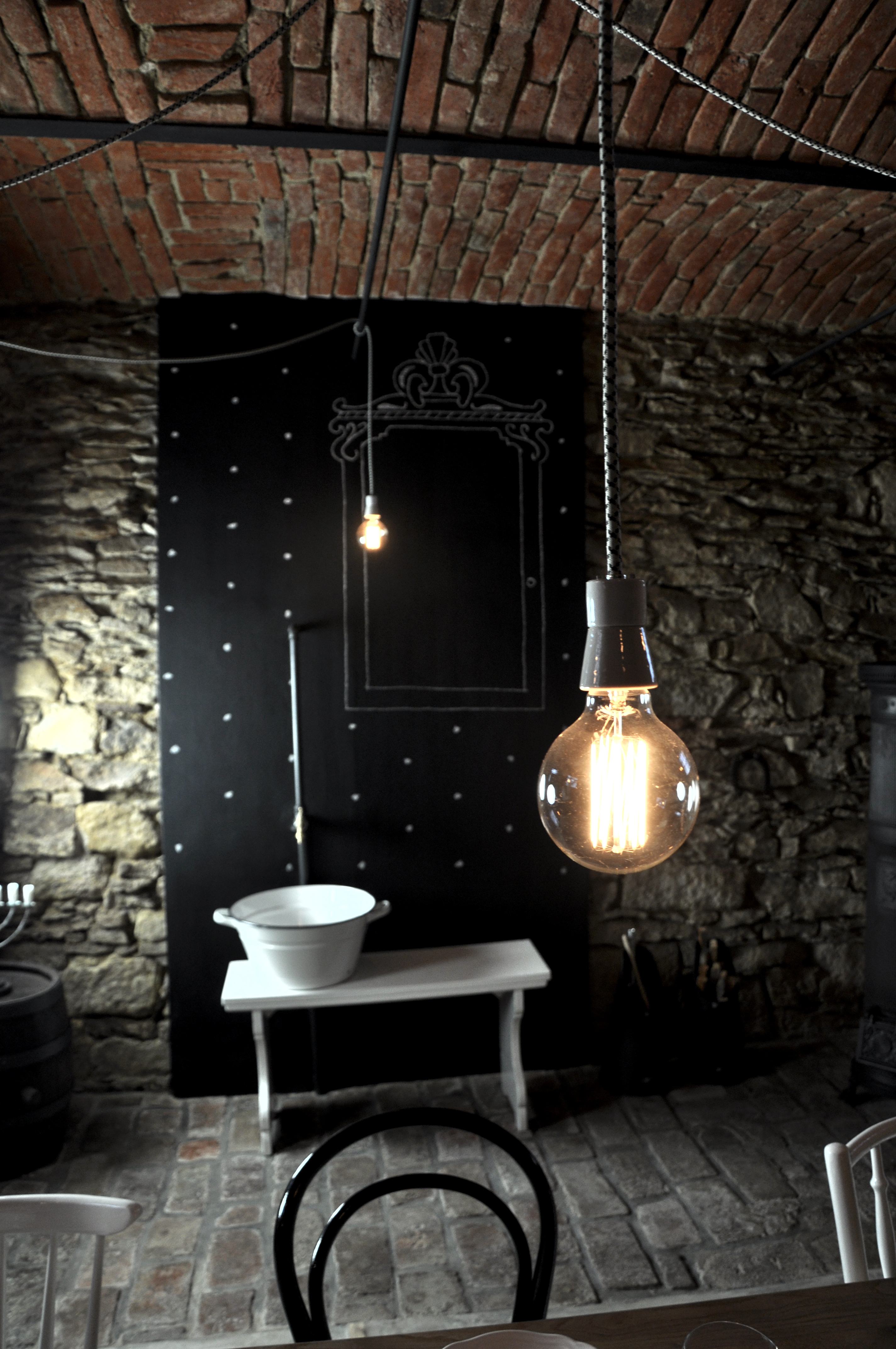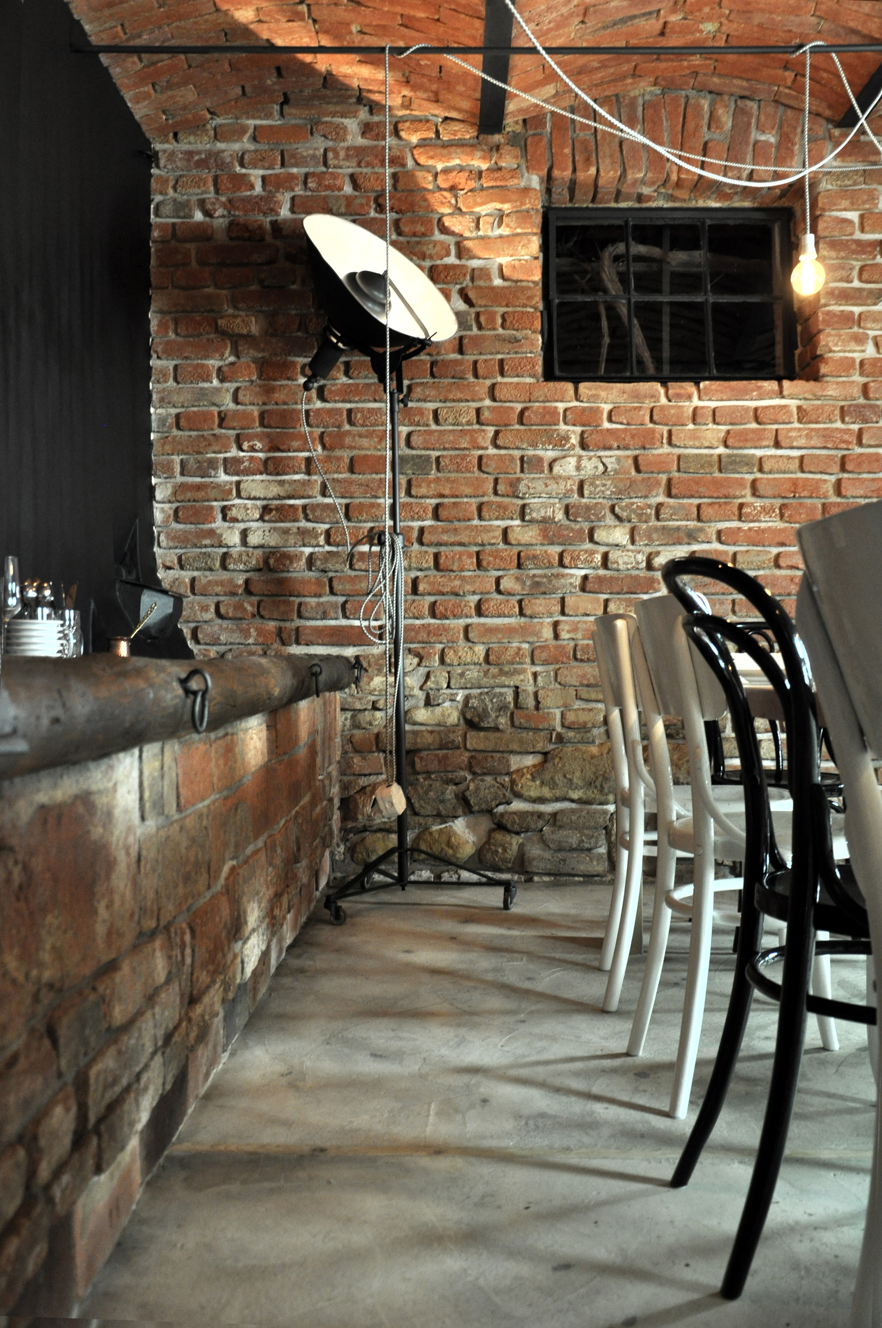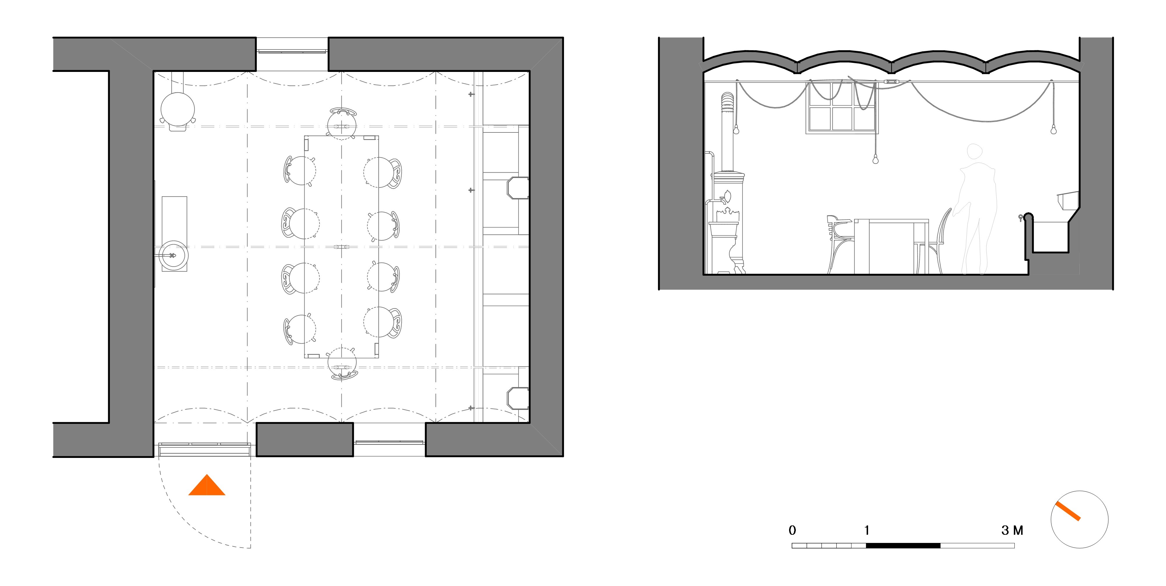 Dubový stôl, vyhotovený podľa návrhu architektov, je umiestnený v strede miestnosti. Ku stolu boli postupne vyberané staré stoličky z ohýbaného dreva. Zaujímavosťou stolu, ktorý meria na dĺžku viac ako tri metre, je jeho netradičná konštrukcia bez výstuže. Tuhosť zabezpečuje štvorica drevených nôh obdĺžnikového pôdorysu, ktoré sú pomocou závitových tyčí kotvené k vrchnej doske. Obdĺžnikové nohy stolu sú rôzne smerovo prestriedané tak, aby zaistili stabilitu. Osvetlenie priestoru zabezpečujú retro žiarovky voľne zavesené na nových oceľových tiahlach. Prívody k jednotlivým zdrojom osvetlenia sú riešené priznanými textilnými káblami s čiernobielym „žehličkovým“ vzorom. Atmosféru v interiéri dotvára zrekonštruovaná liatinová pec s viac ako storočnou históriou a starý fotografický reflektor, ktorý osvetľuje stropné klenby. Vzniká tak miesto kde si možno vychutnať víno vyrobené a dopestované na okolitom statku.