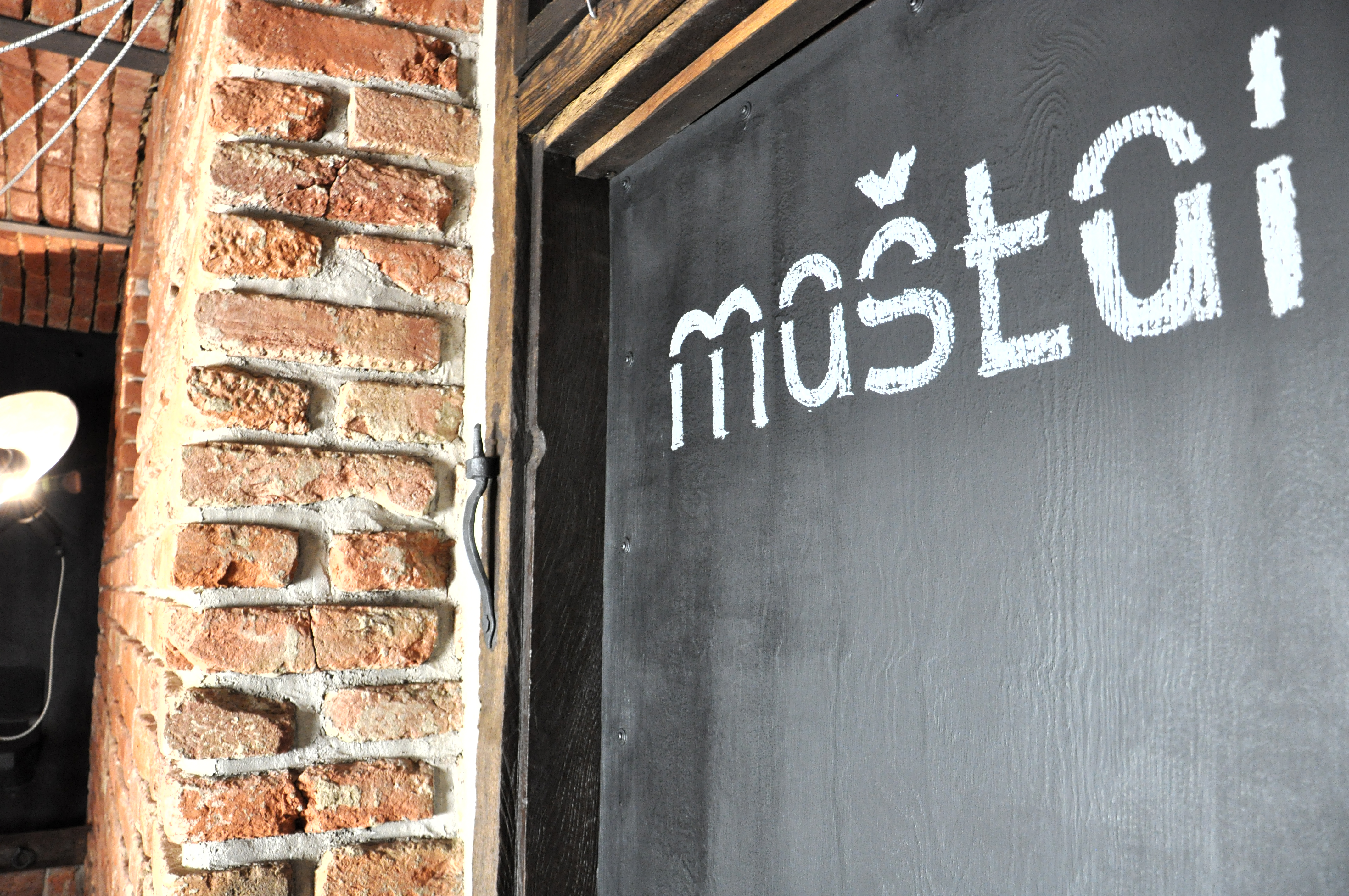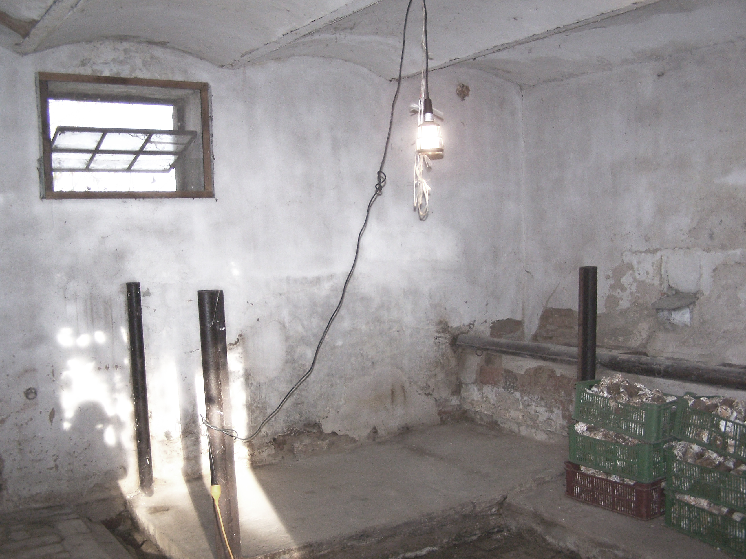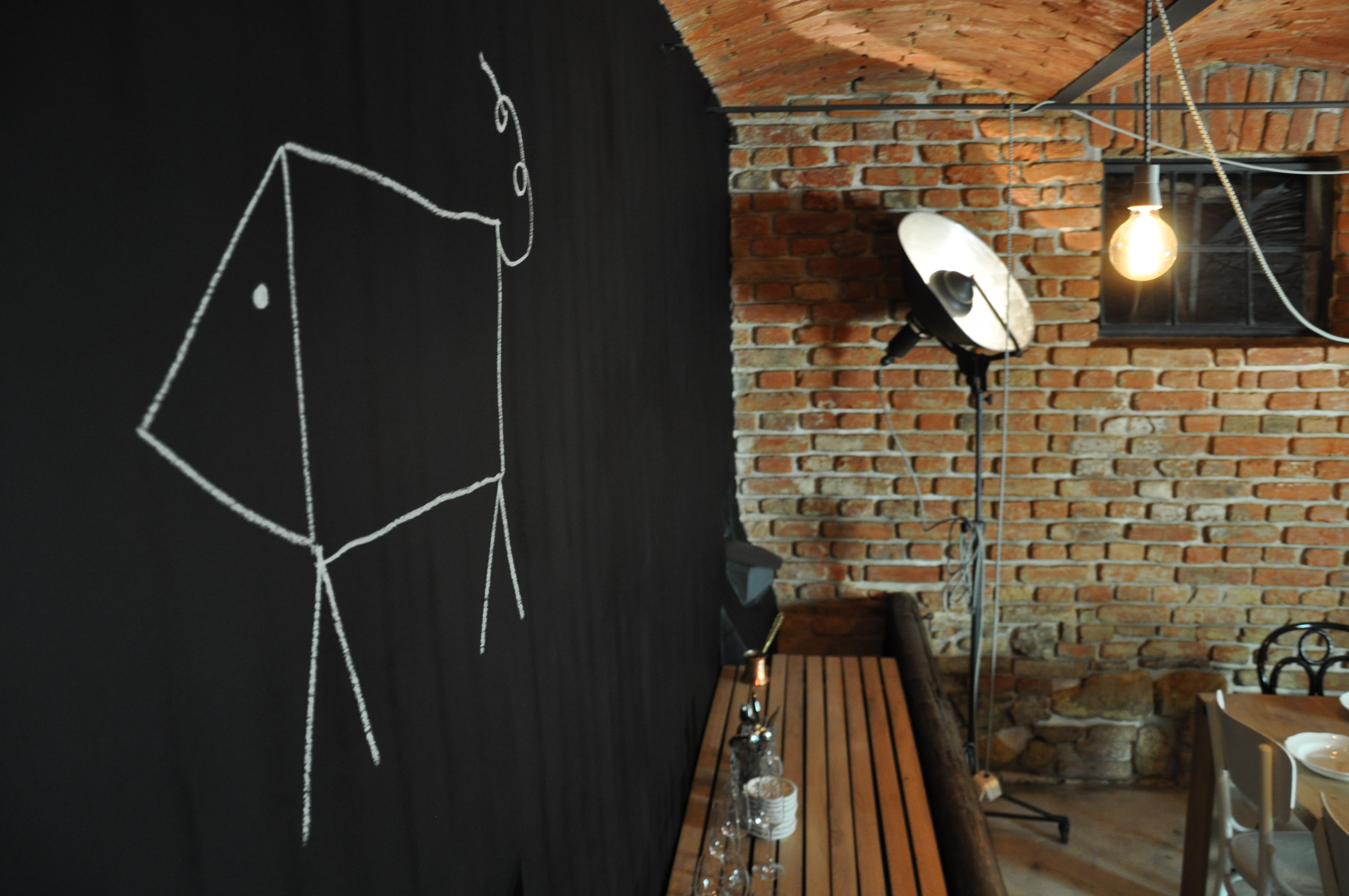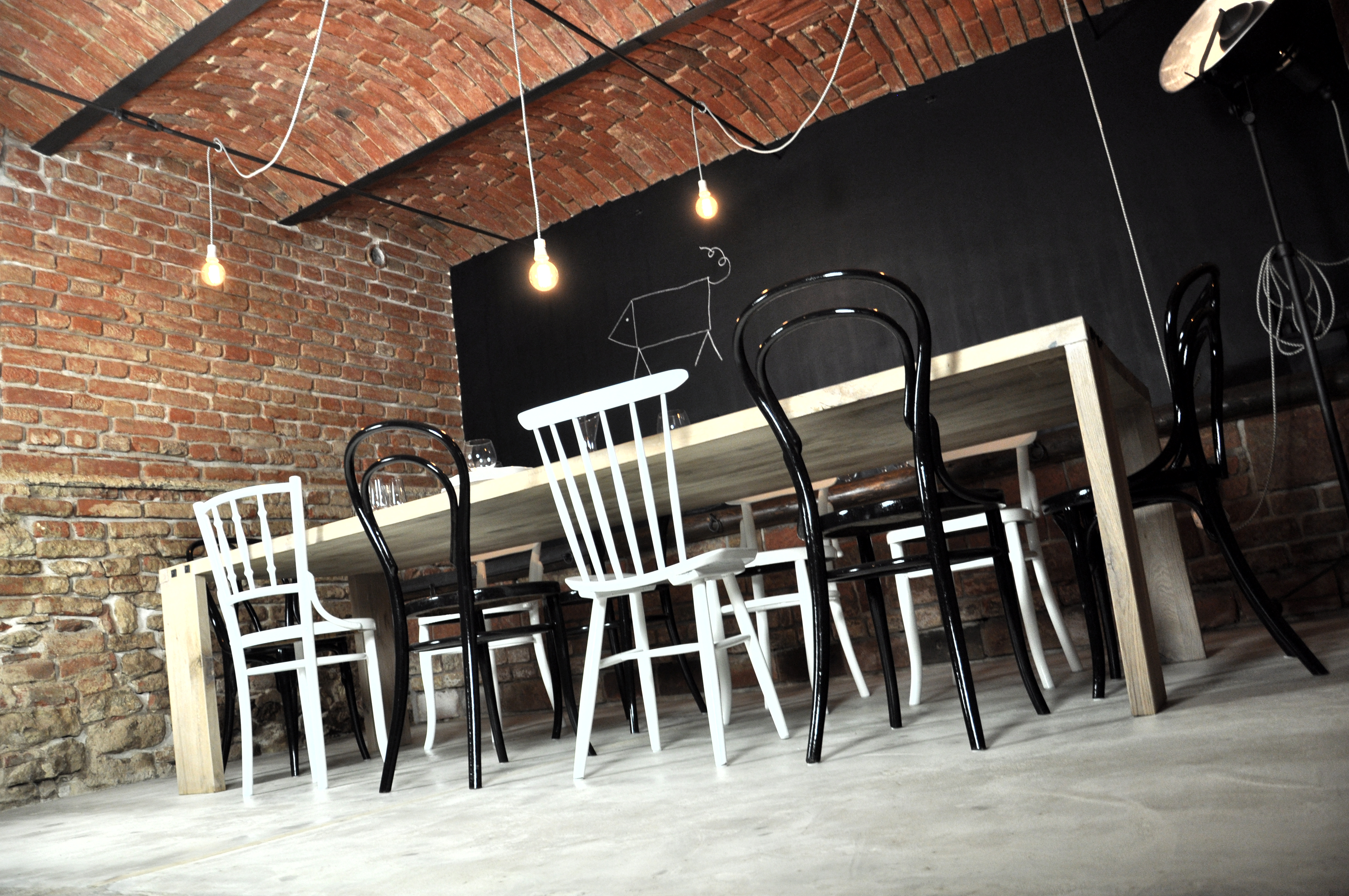 Dubový stôl, vyhotovený podľa návrhu architektov, je umiestnený v strede miestnosti. Ku stolu boli postupne vyberané staré stoličky z ohýbaného dreva. Zaujímavosťou stolu, ktorý meria na dĺžku viac ako tri metre, je jeho netradičná konštrukcia bez výstuže. Tuhosť zabezpečuje štvorica drevených nôh obdĺžnikového pôdorysu, ktoré sú pomocou závitových tyčí kotvené k vrchnej doske. Obdĺžnikové nohy stolu sú rôzne smerovo prestriedané tak, aby zaistili stabilitu. Osvetlenie priestoru zabezpečujú retro žiarovky voľne zavesené na nových oceľových tiahlach. Prívody k jednotlivým zdrojom osvetlenia sú riešené priznanými textilnými káblami s čiernobielym „žehličkovým“ vzorom. Atmosféru v interiéri dotvára zrekonštruovaná liatinová pec s viac ako storočnou históriou a starý fotografický reflektor, ktorý osvetľuje stropné klenby. Vzniká tak miesto kde si možno vychutnať víno vyrobené a dopestované na okolitom statku.