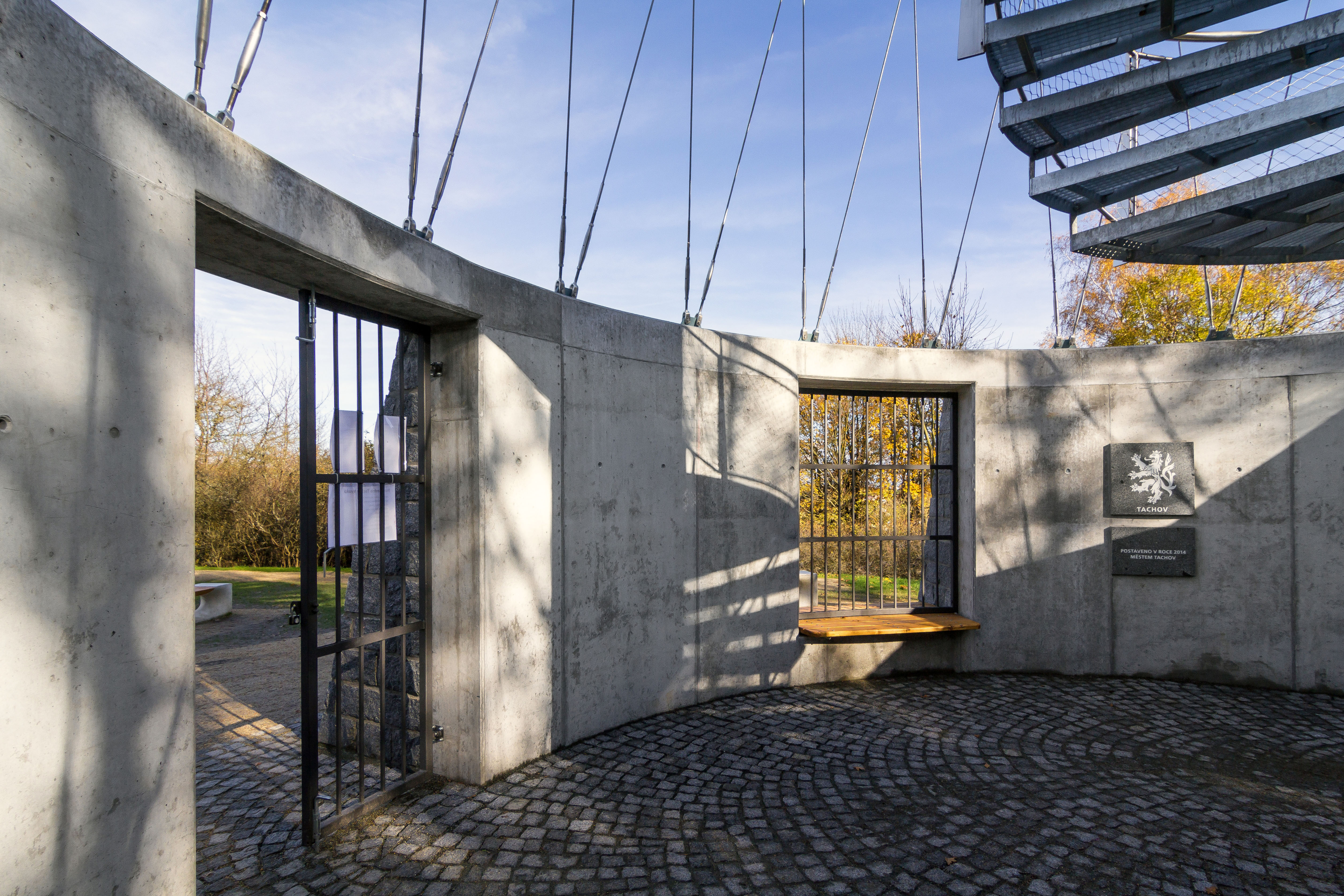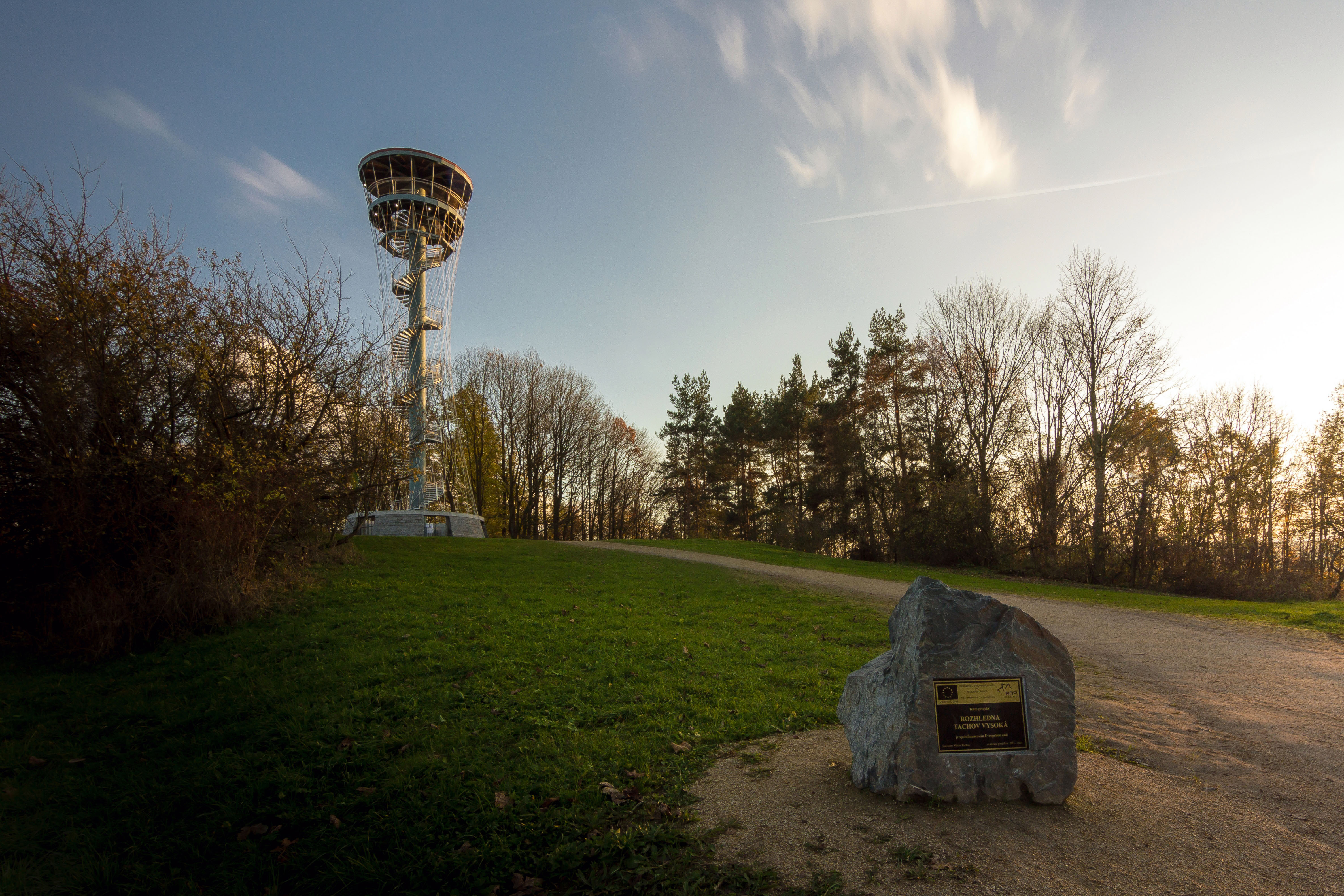 "Rozhledna Tachov Vysoká svým tvarem připomíná postavu krásné štíhlé ženy, lodní stěžeň opletený lany, figurku šachové dámy, husitský kalich nebo přesýpací hodiny, fantazii se meze nekladou. V každém případě je rozhledna elegantní, štíhlá a neobyčejně krásná. Svoji eleganci cudně halí pod průhlednou košilku lan, které ji objímají a vlní se okolo ní stejně jako sukénka okolo boků krásné ženy, nebo lana okolo lodního stěžně. Ani při pobytu na horní vyhlídkové plošině se rozhledna nechová jako obyčejná rozhledna, nekývá se jako běžné kyvadlo, ale její obvodová lana tříští výkyvy plošiny do kruhového otáčivého pohybu připomínající houpání paluby lodi, ladné pohyby sukně vlnící se na bocích ženy, či vlnivé pohyby tanečnice. To chvění nahoře na plošině, ten jemně houpavý rotační pohyb je naší rozhledně vlastní stejně jako každé štíhlé elegantní krásce, ženě nebo lodi. Stačí trochu fantazie a na horní plošině jsme na vyhlídce lodního stěžně plujícího k poznání nikoliv dalekých krajů, ale k objevům nových pohledů na okolní krajinu domova, tak důvěrně známou."