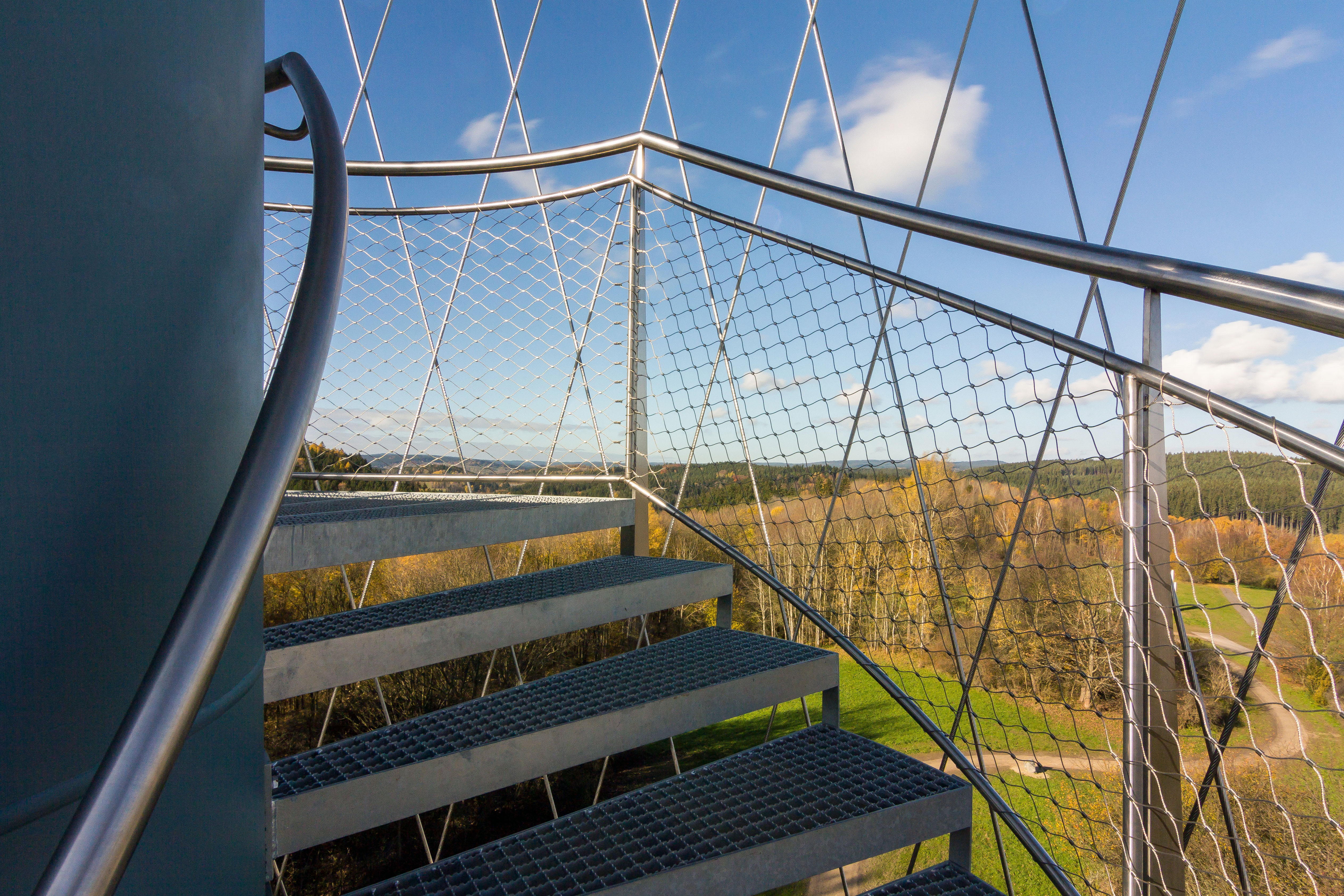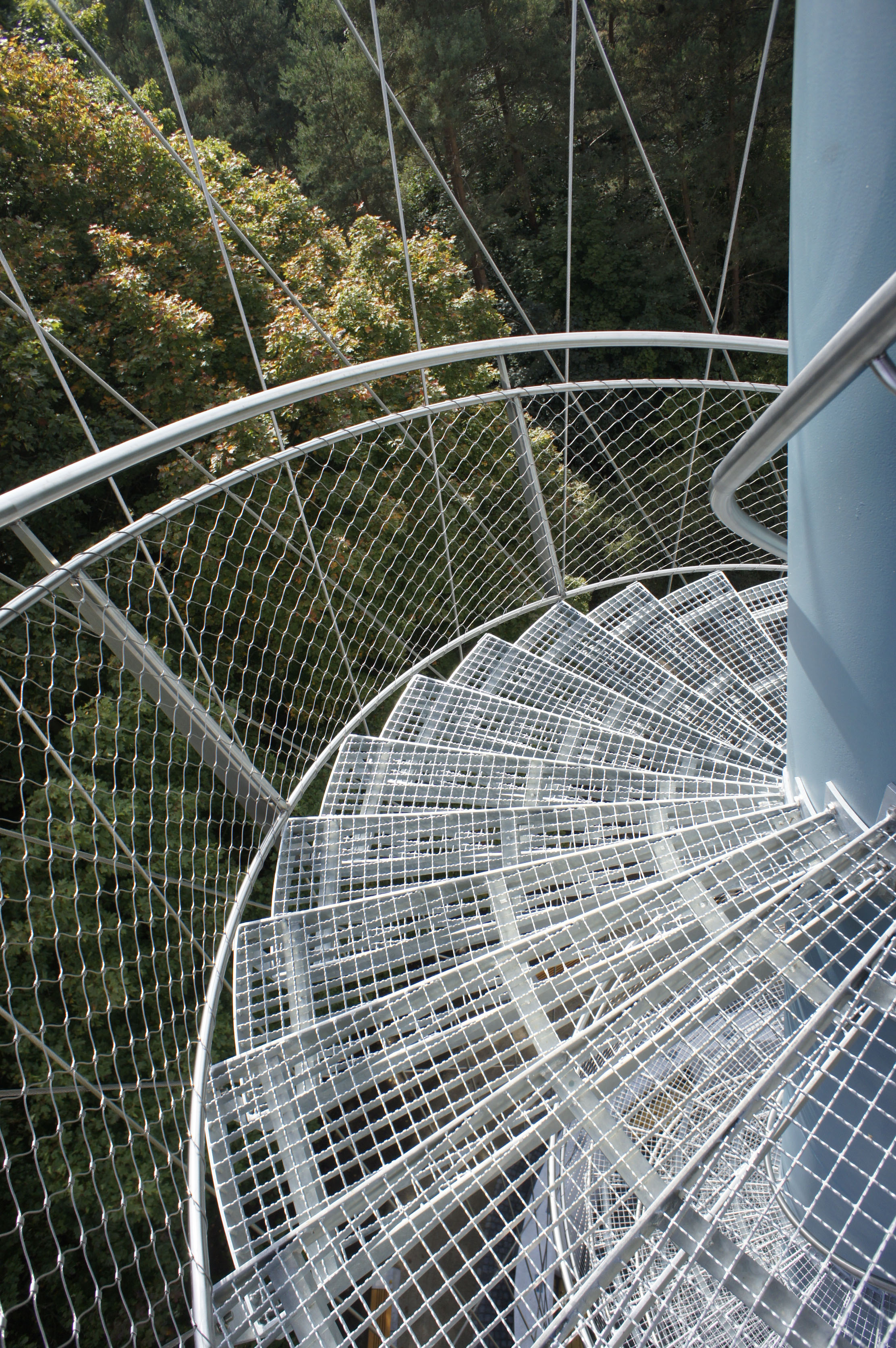 Zábradlie schodiska v priestorovom tvare špirály vinúce sa okolo nosného tubusu a schodiska tvoria zvislé nerezové stĺpiky s horným nerezovým madlom a dvoma vodorovnými nerezovými zábranami. Medzi obe je vypletená nerezová sieť. Zábradlie ochodze chodze tvoria 2 nerezové profily, medzi ktorými sú umiestnené informačné panely. Vonkajšie madlo je vo výške 1,2 m a vnútorne vo výške 1,1 m. Celá konštrukcia je ukotvená k nosníkom oceľovej konštrukcie.