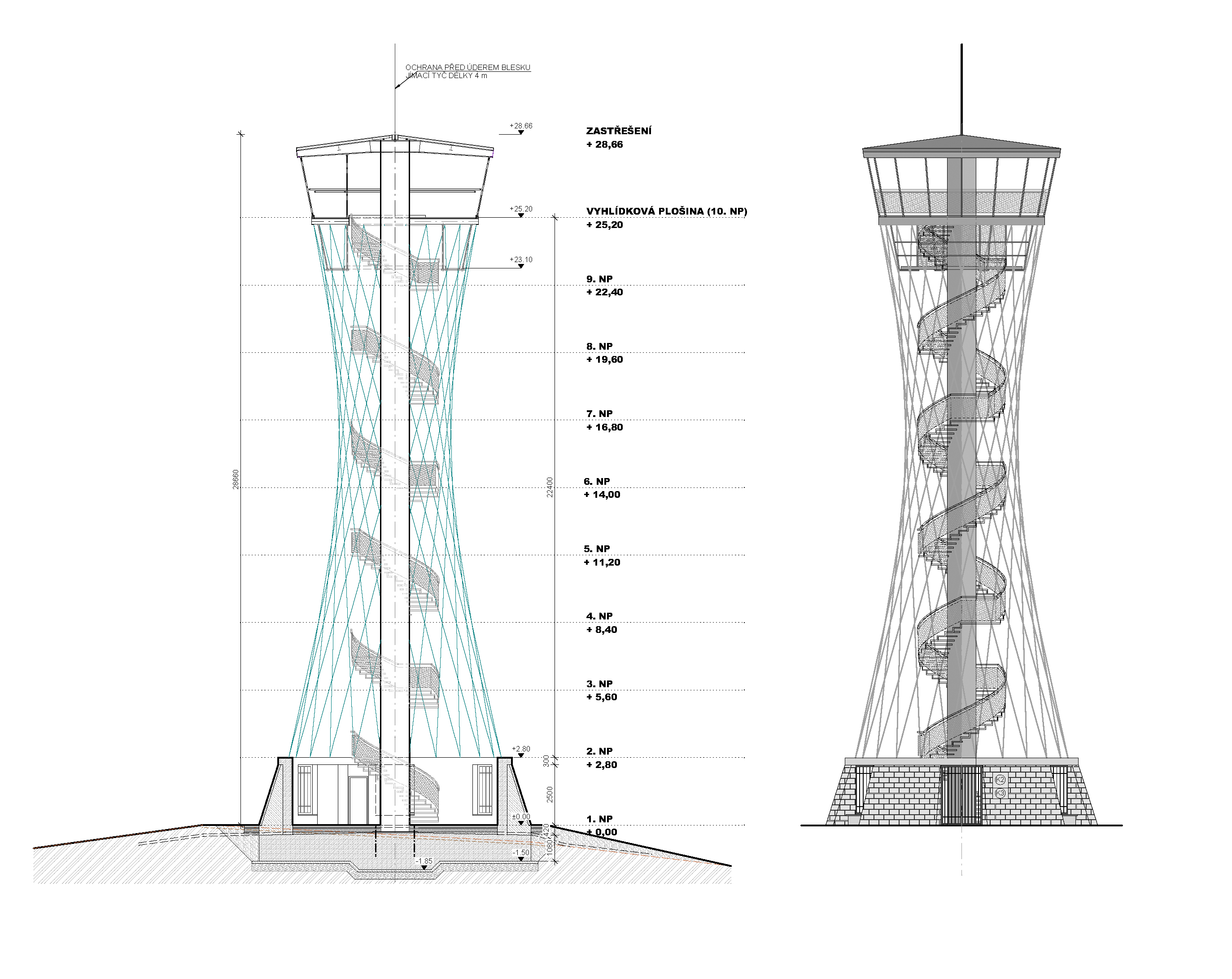 Rozhľadňu tvorí podzemná železobetónová základová doska s priemerom 11,3 m a výškou 1,0 až 1,5 m. Má stredný nosný oceľový stĺp s priemerom 1,2 m. Okolo stredného nosného tubusu sa vinie špirálové schodisko. Vo výške 25,2 m je na nosnom stĺpe upevnená vyhliadková plošina. Hlavným architektonickým prvkom rozhľadne je jej tvar, hyperbolický paraboloid, ktorý je geometricky tvorený vypínacími lanami a tvarovaním dolnej betónovo-kamennej podnože a zábradlím hornej vyhliadkovej plošiny. Hyperbolický paraboloid dáva rozhľadni jej vlastný dynamický organický tvar. Jednoduchý technický vzhľad rozhľadne je podporený tvarovaním nosných stĺpov zábradlia a nosníkov pororoštových schodov, ktoré v meniacich sa profiloch priznávajú prebiehajúce momenty a sily.