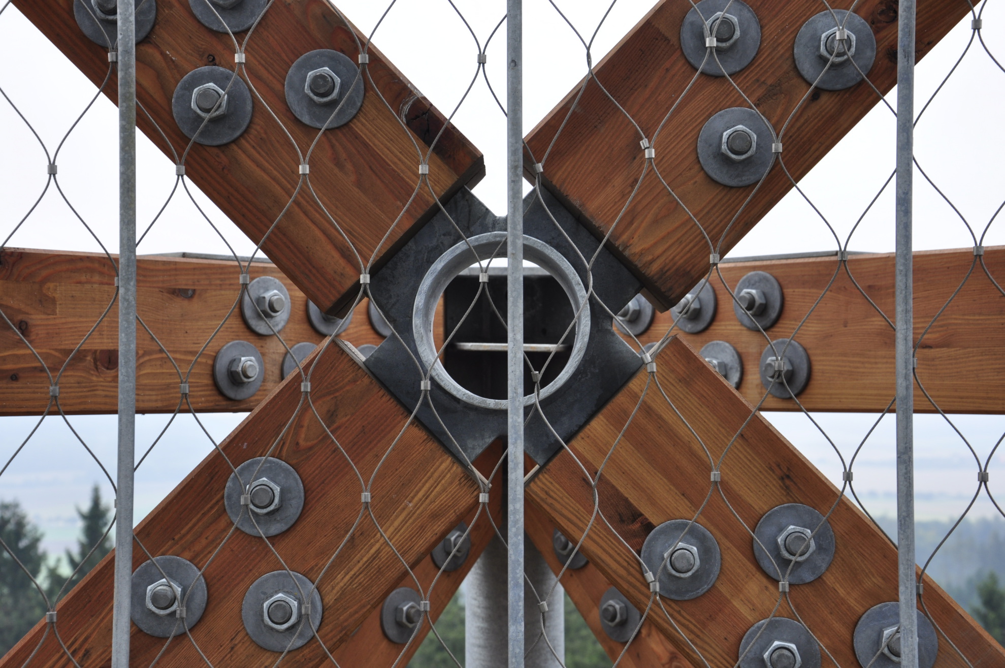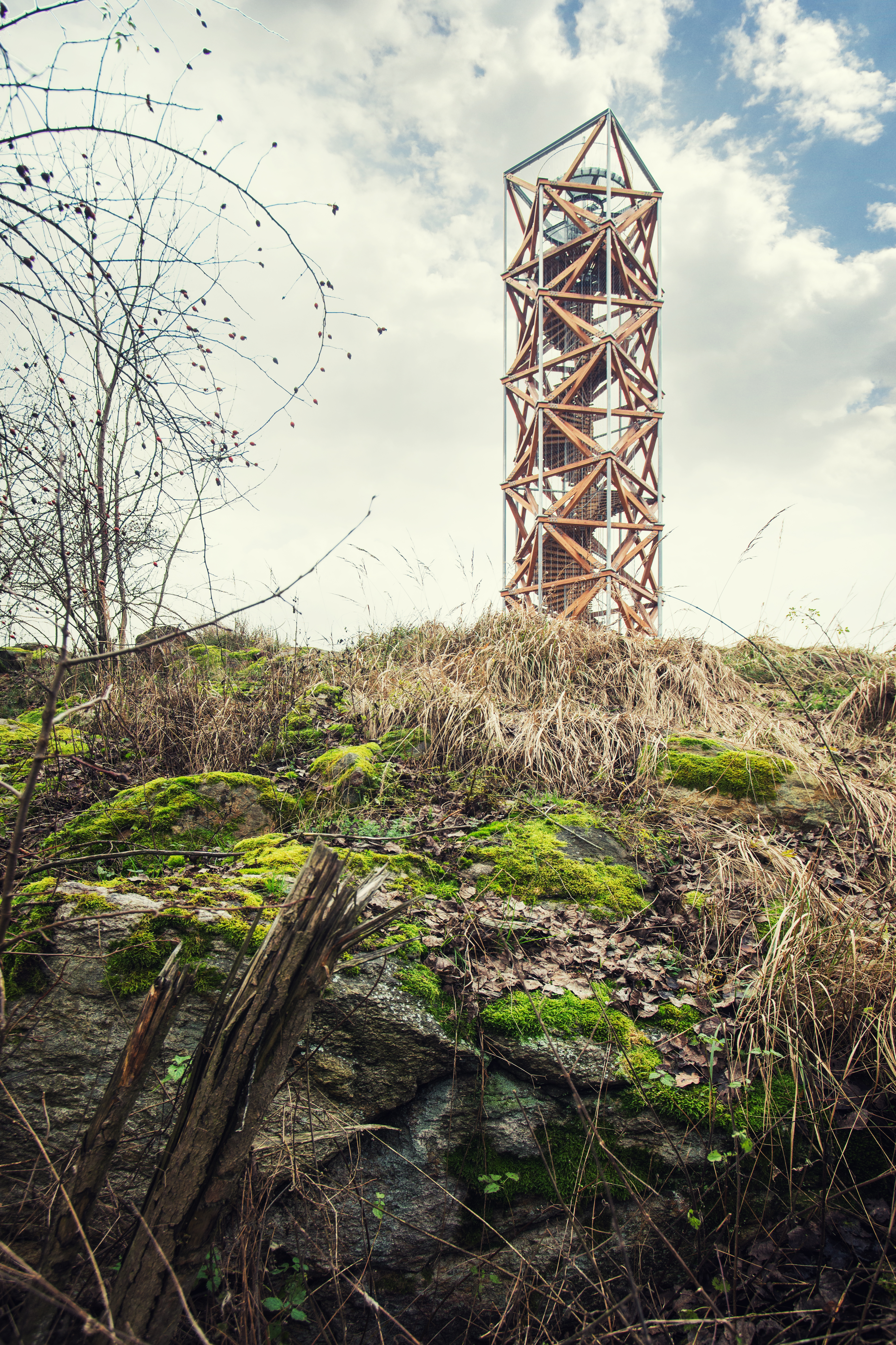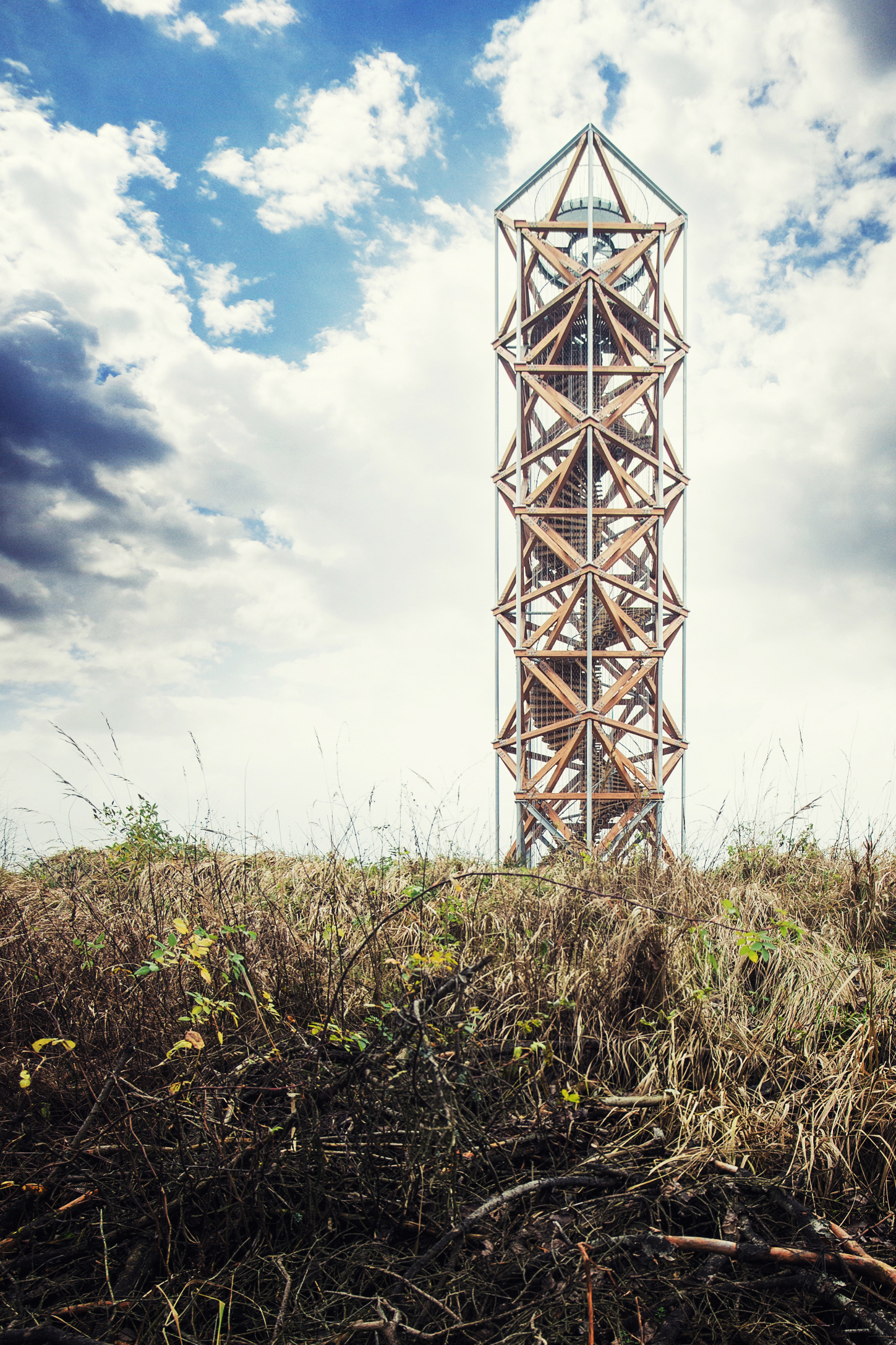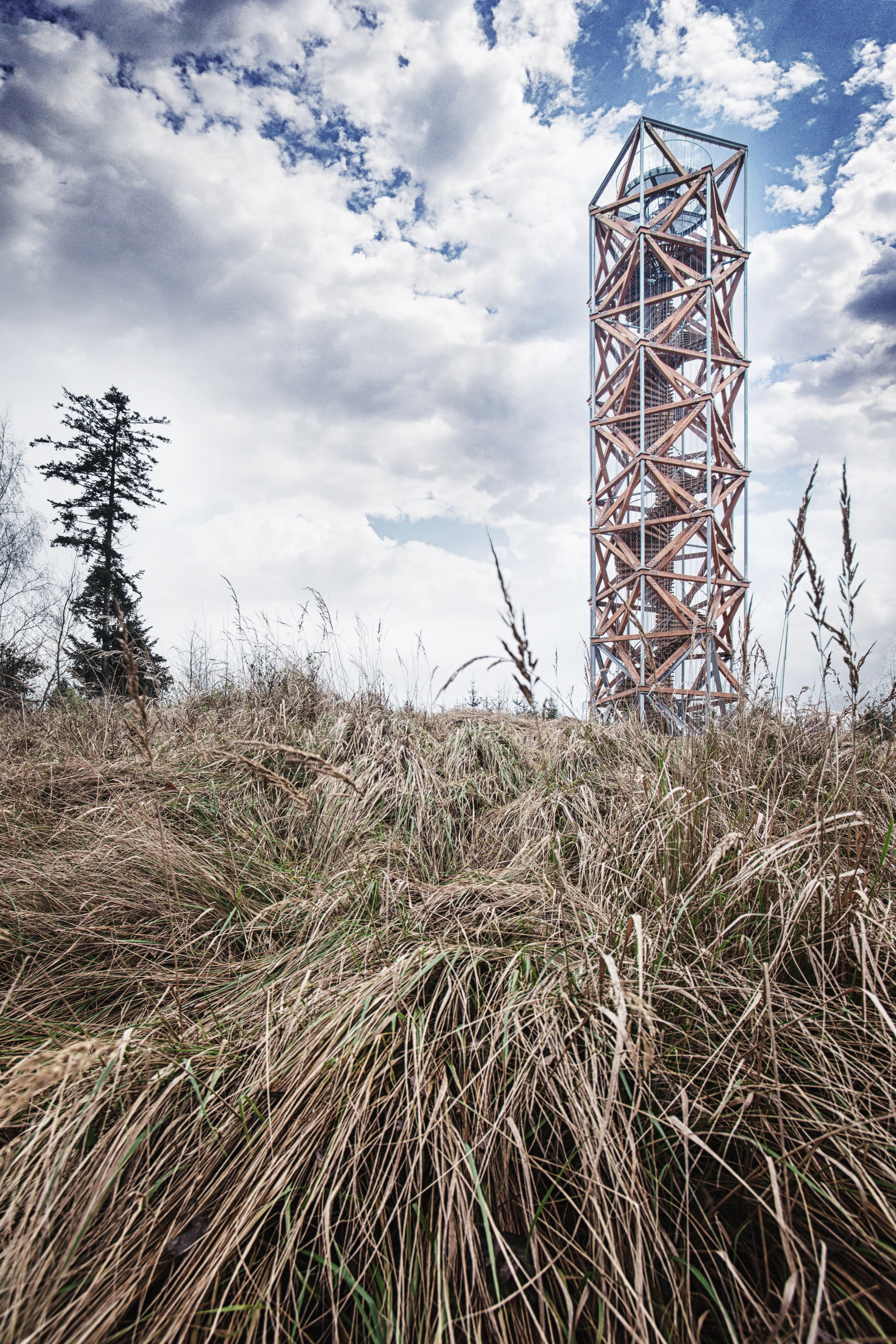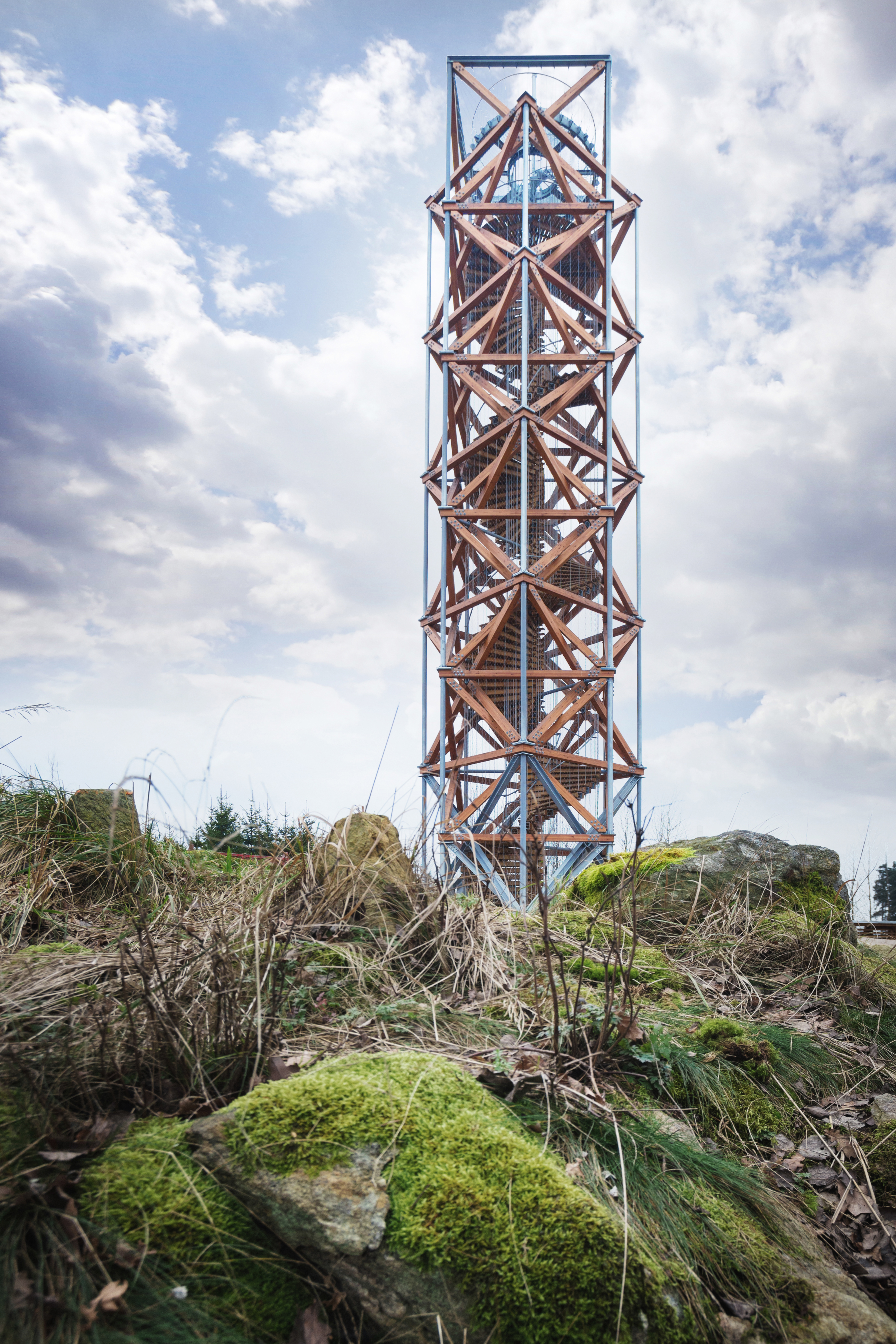 Základný motív dvoch pootočených štvorcov je využitý aj v trojrozmernej podobe stavby - základnú konštrukciu a zároveň aj podobu rozhľadne tvoria vzájomne otočené a posunuté kubické objemy. Jednotlivé kubické objemy sú tvorené štvorcovými pôdorysnými rámami a zvislými diagonálami z masívnych drevených prvkov, ktoré sú doplnené subtílnymi oceľovými stĺpikmi.