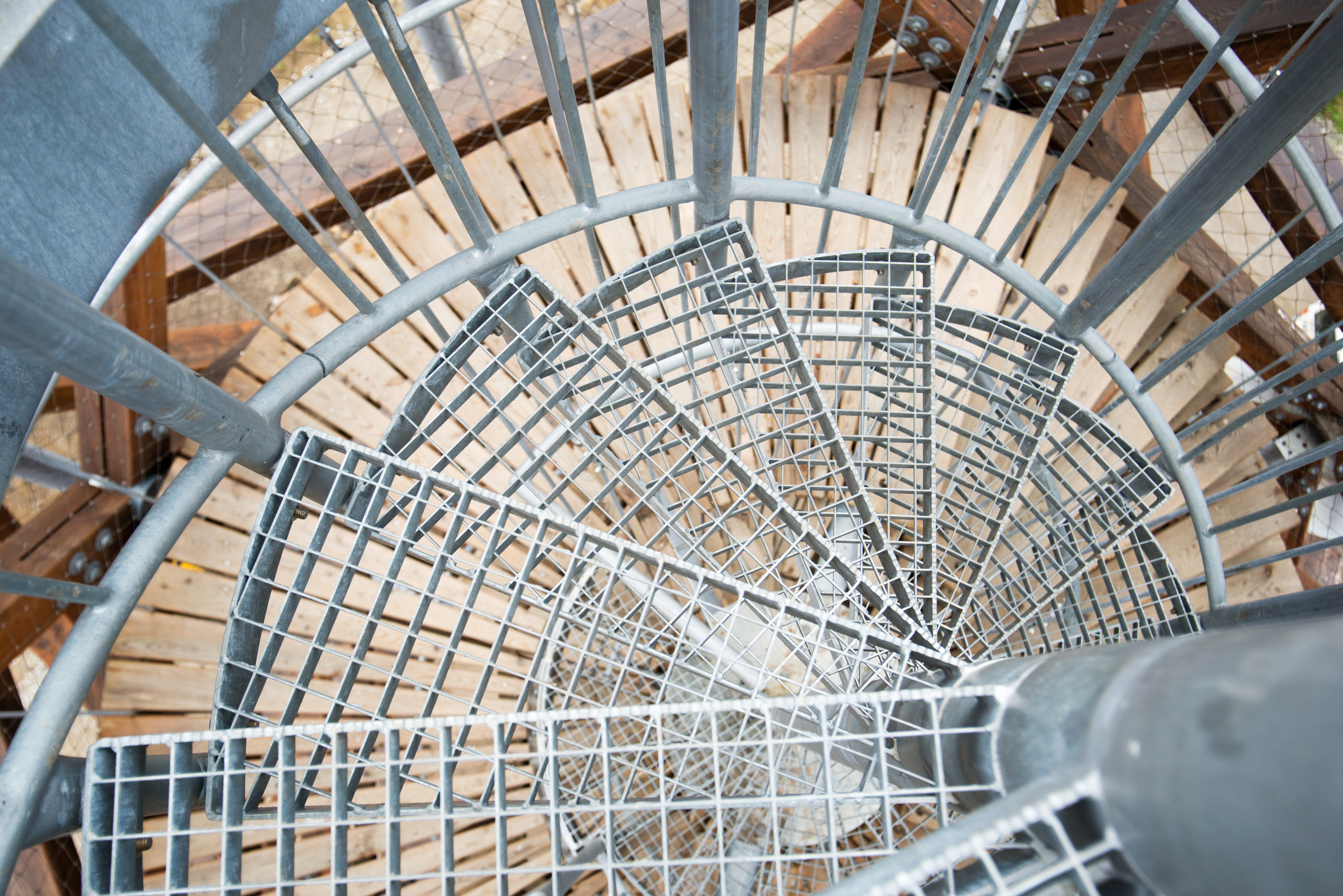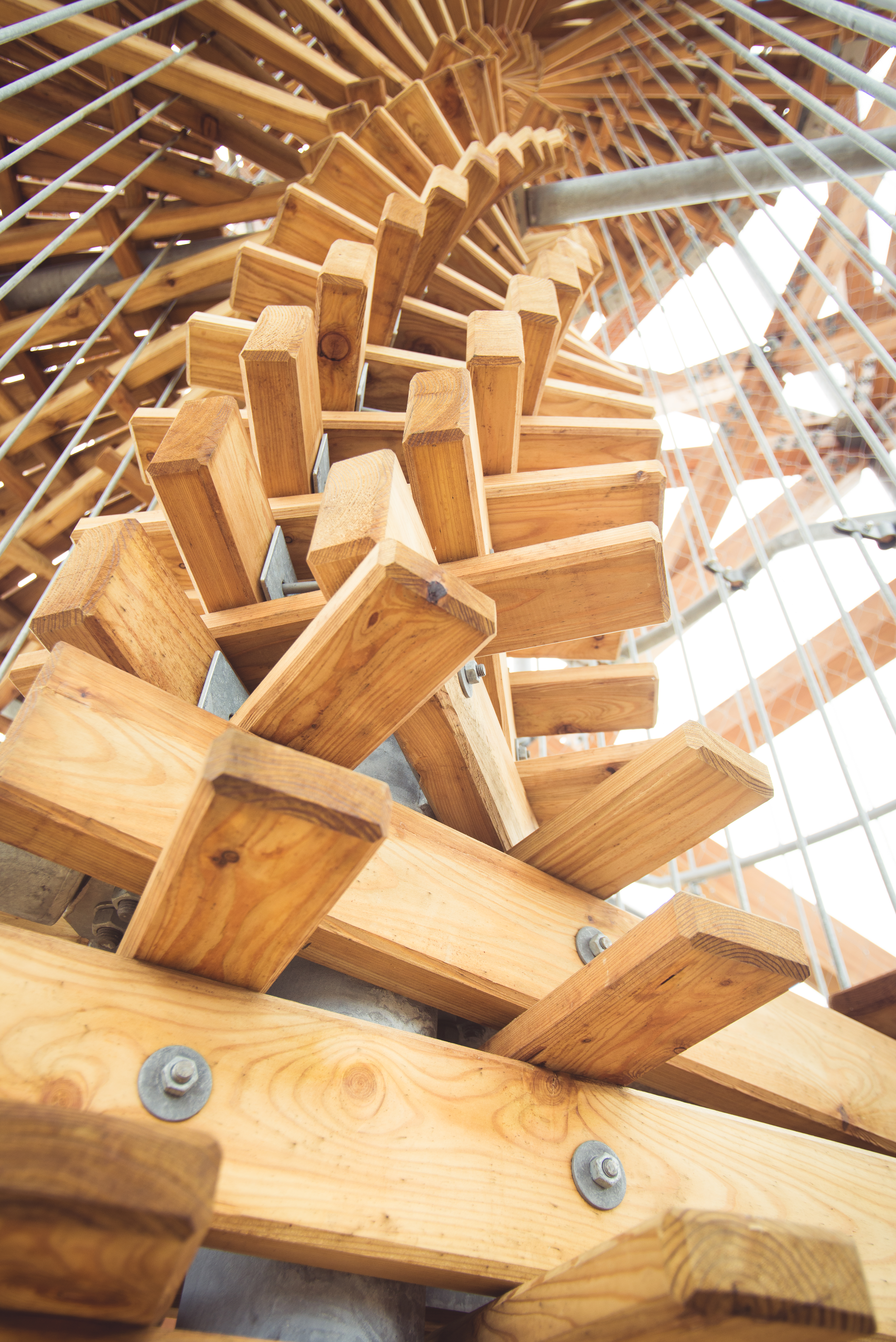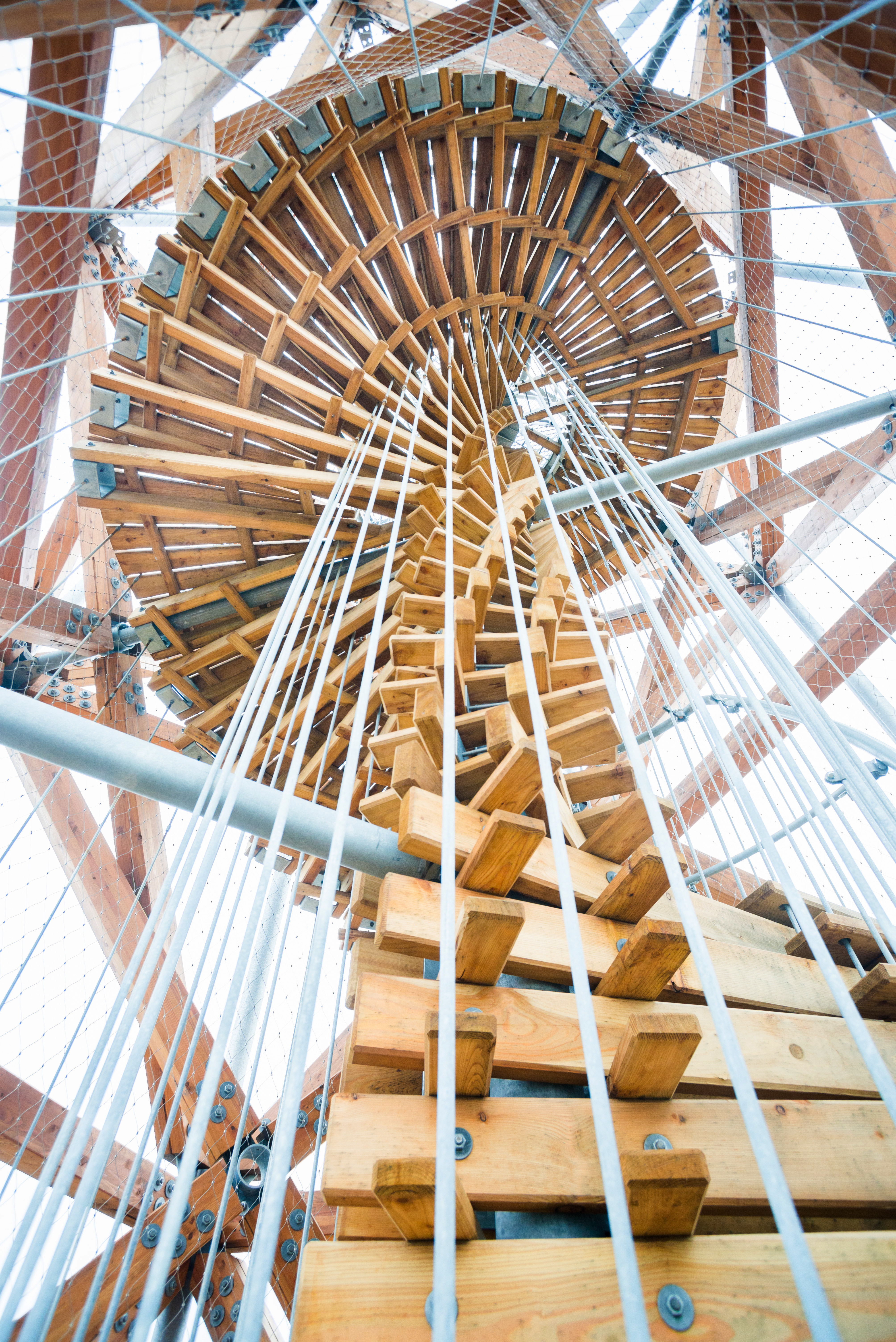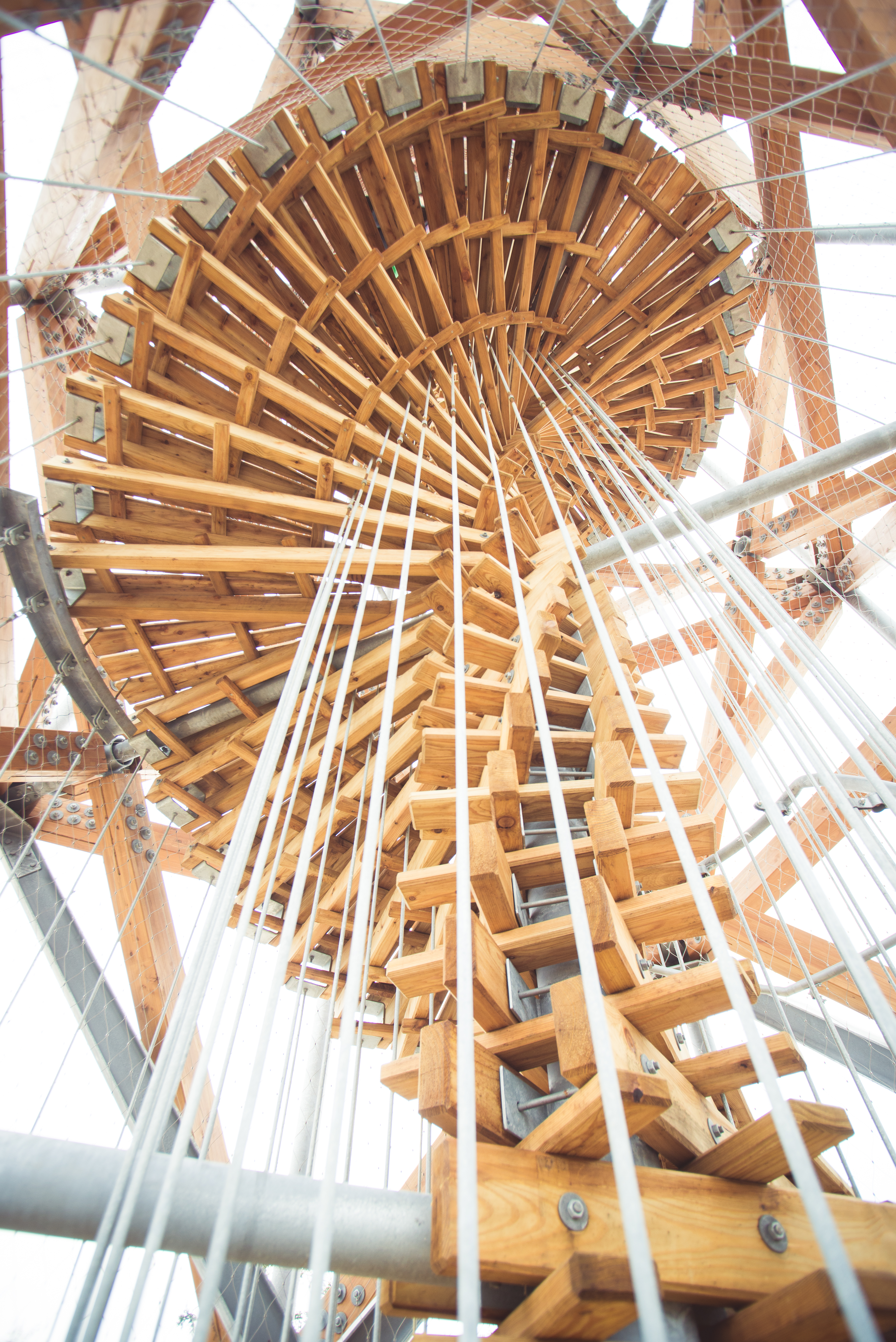 Na hlavnej konštrukcii sú zavesené vnútorné časti - hlavné schodisko, prestupová podesta aj vyhliadka. Hlavné schodisko tvorí jadro stavby. Vnútorné vreteno je oceľové, jednotlivé stupne tvoria drevené klieštiny (podstupnice) kotvené do stredového vretena a zavesené na vonkajšom obvode. Stupne sú drevené, vzájomná previazanosť prvkov definuje vnútornú špirálu stavby. Hlavné schodisko je ukončené medzipodestou pod vrcholom veže. Bezpečnostné zábradlie hlavného schodiska a medzipodesty je tvorené zvislými závesmi hlavnej konštrukcie, ktoré sú doplnené nerezovou pletenou sieťou.
