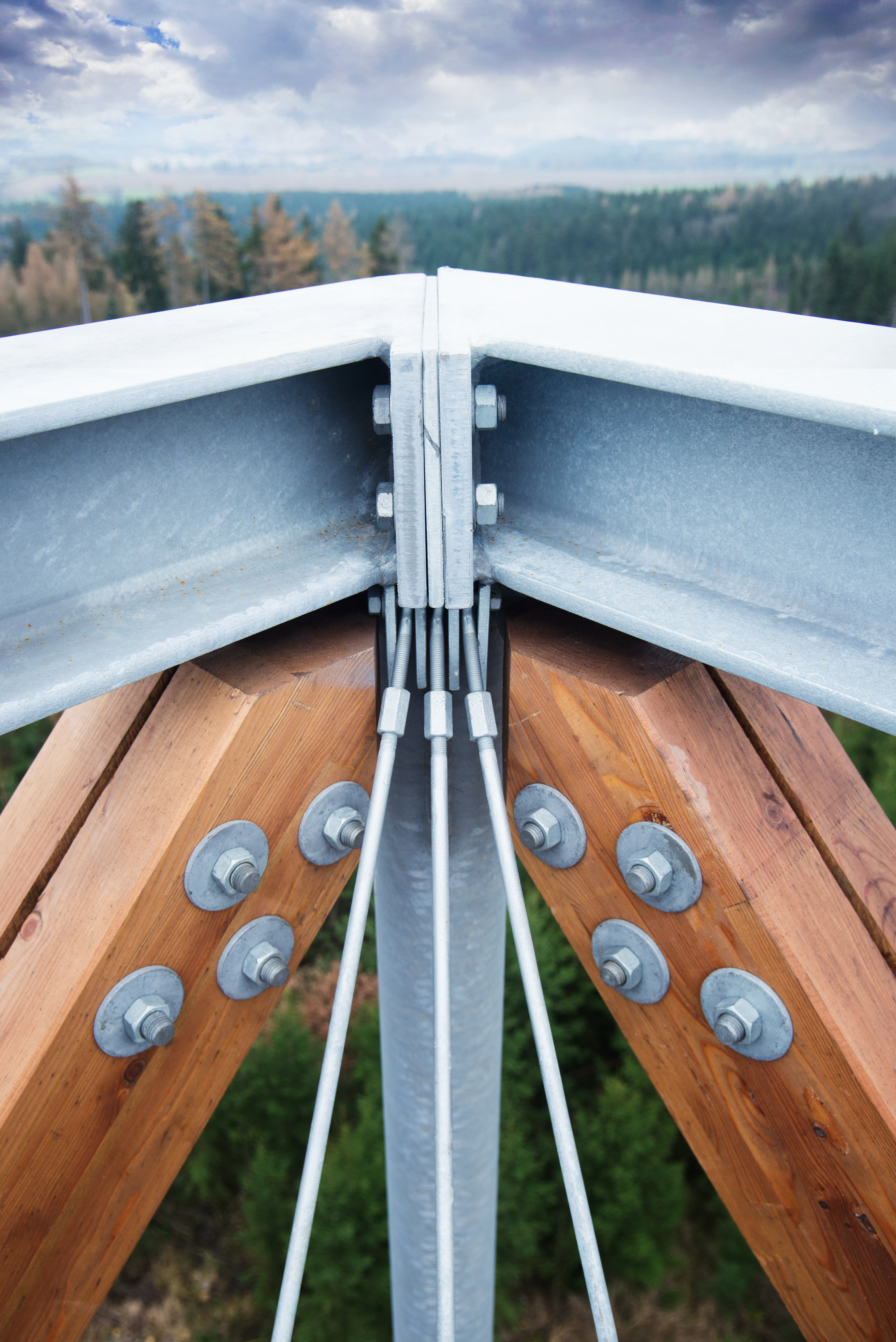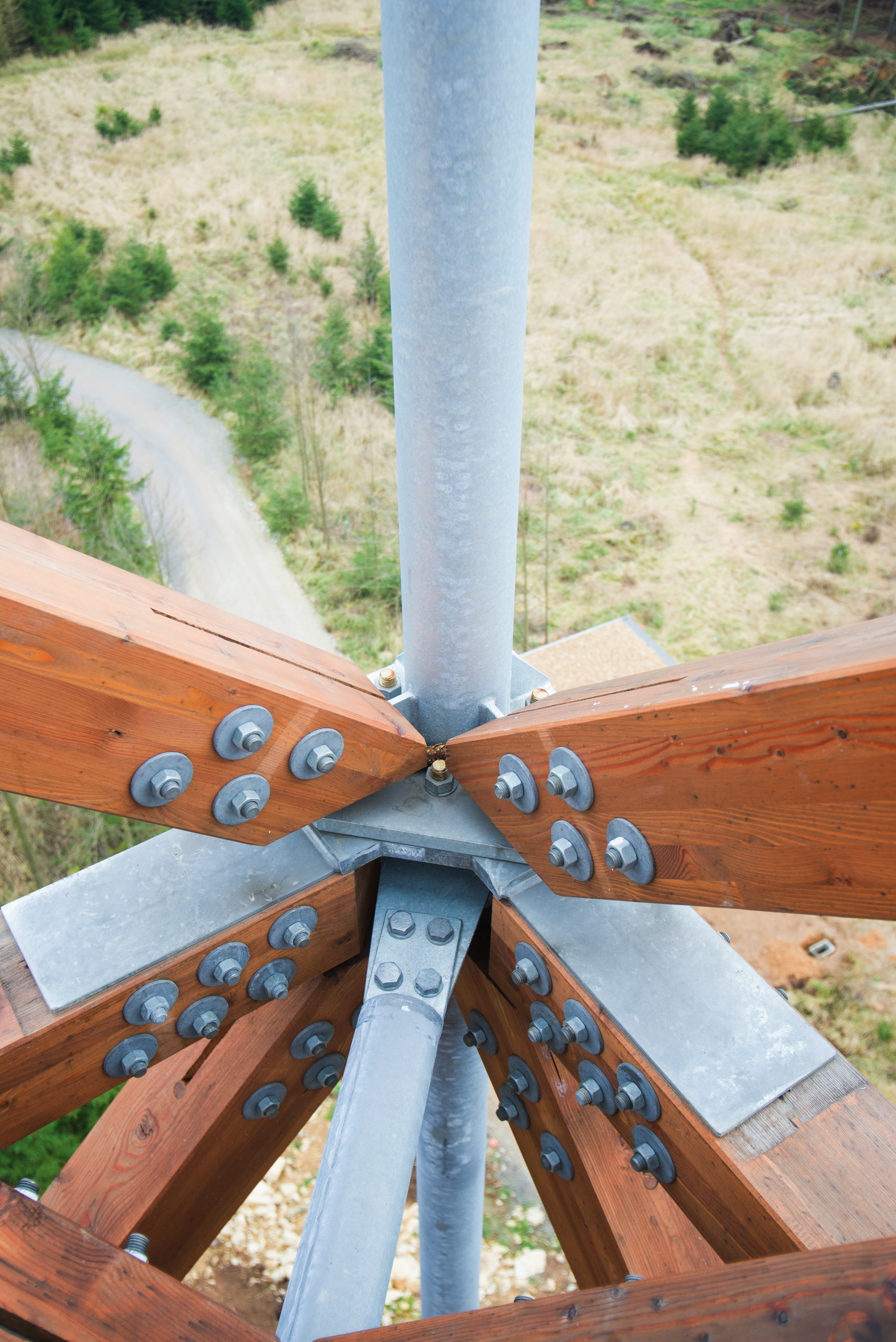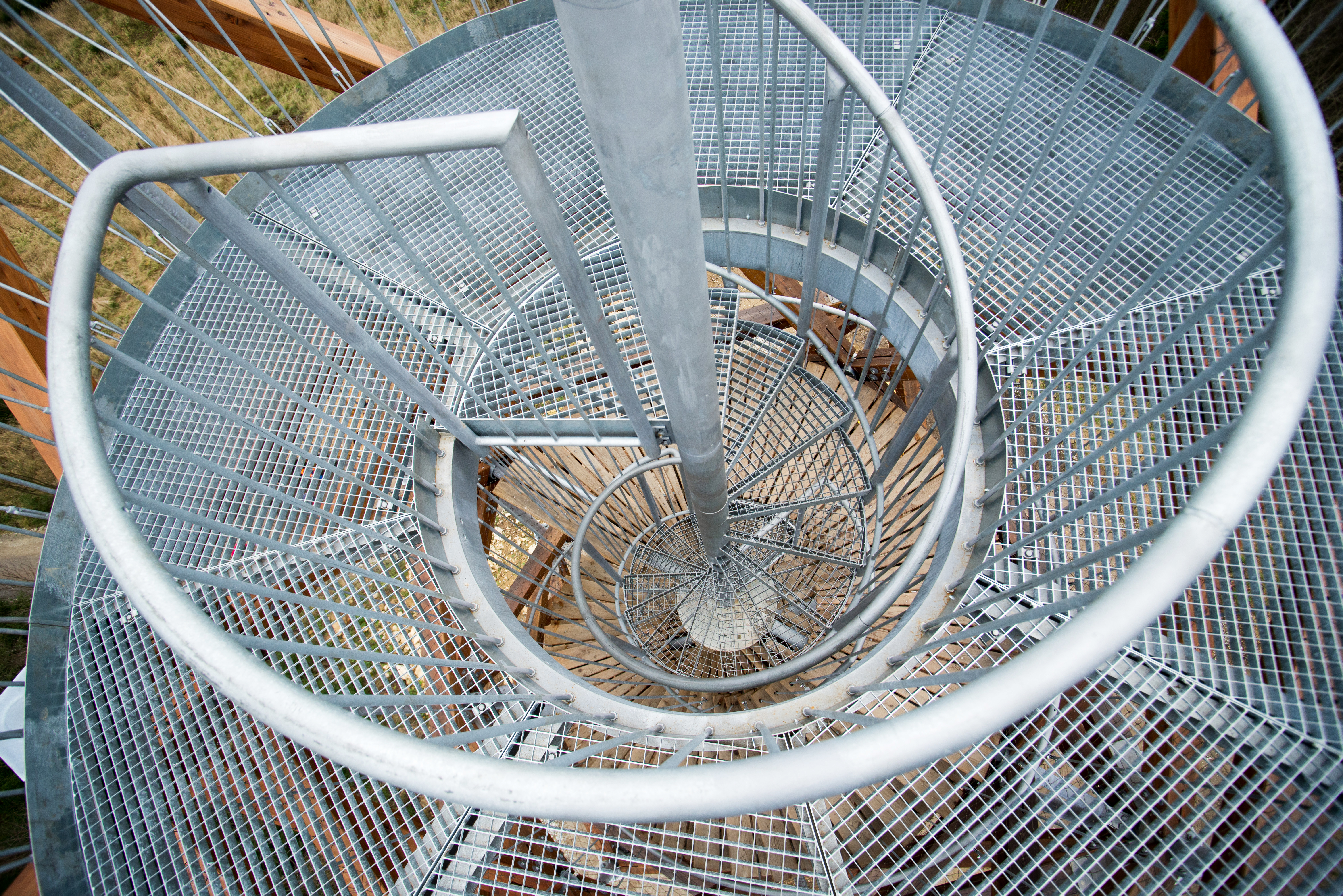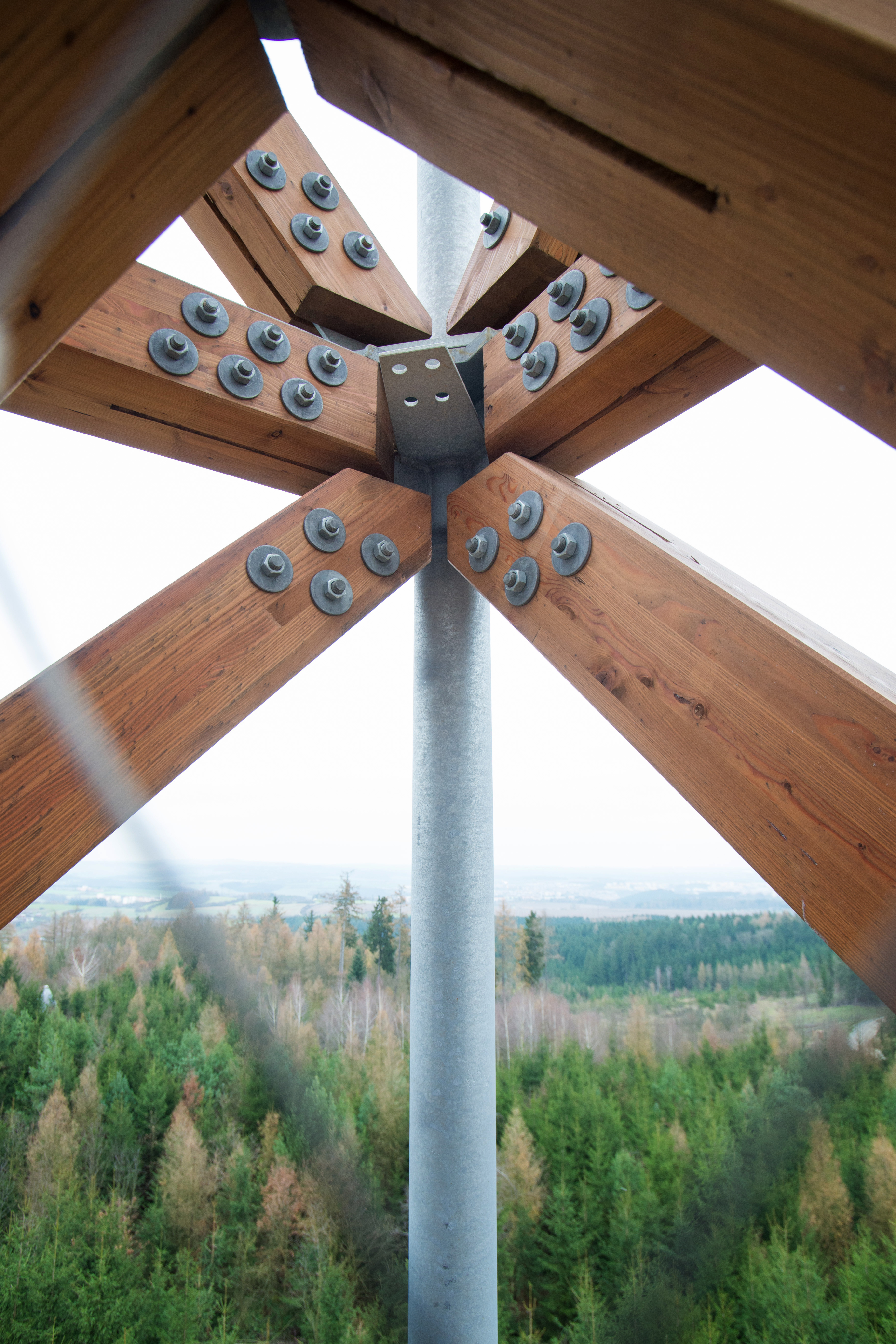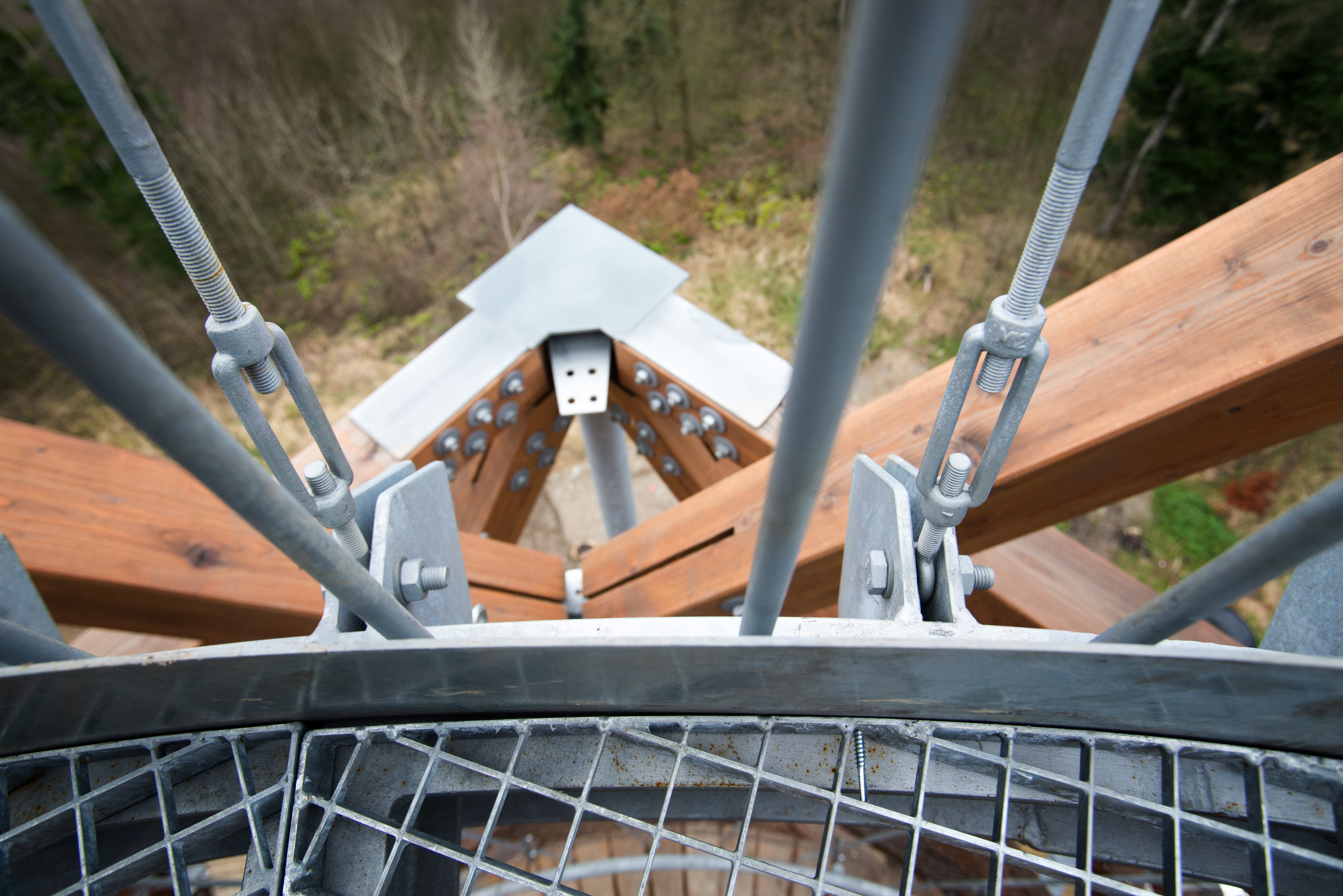 Pre prístup na najvyššiu vyhliadku je ďalej z medzipodesty navrhnuté úsporné vretenové stredové schodisko, ktoré minimálnym rozmerom poskytuje dostatok priestoru pre obvodovú vyhliadku vo vrchole stavby. Najvyššia vyhliadka je navrhnutá ako oceľový kruhový prstenec, zavesený (spoločne s hlavným schodiskom) z najvyššieho oceľového rámu hlavnej konštrukcie.