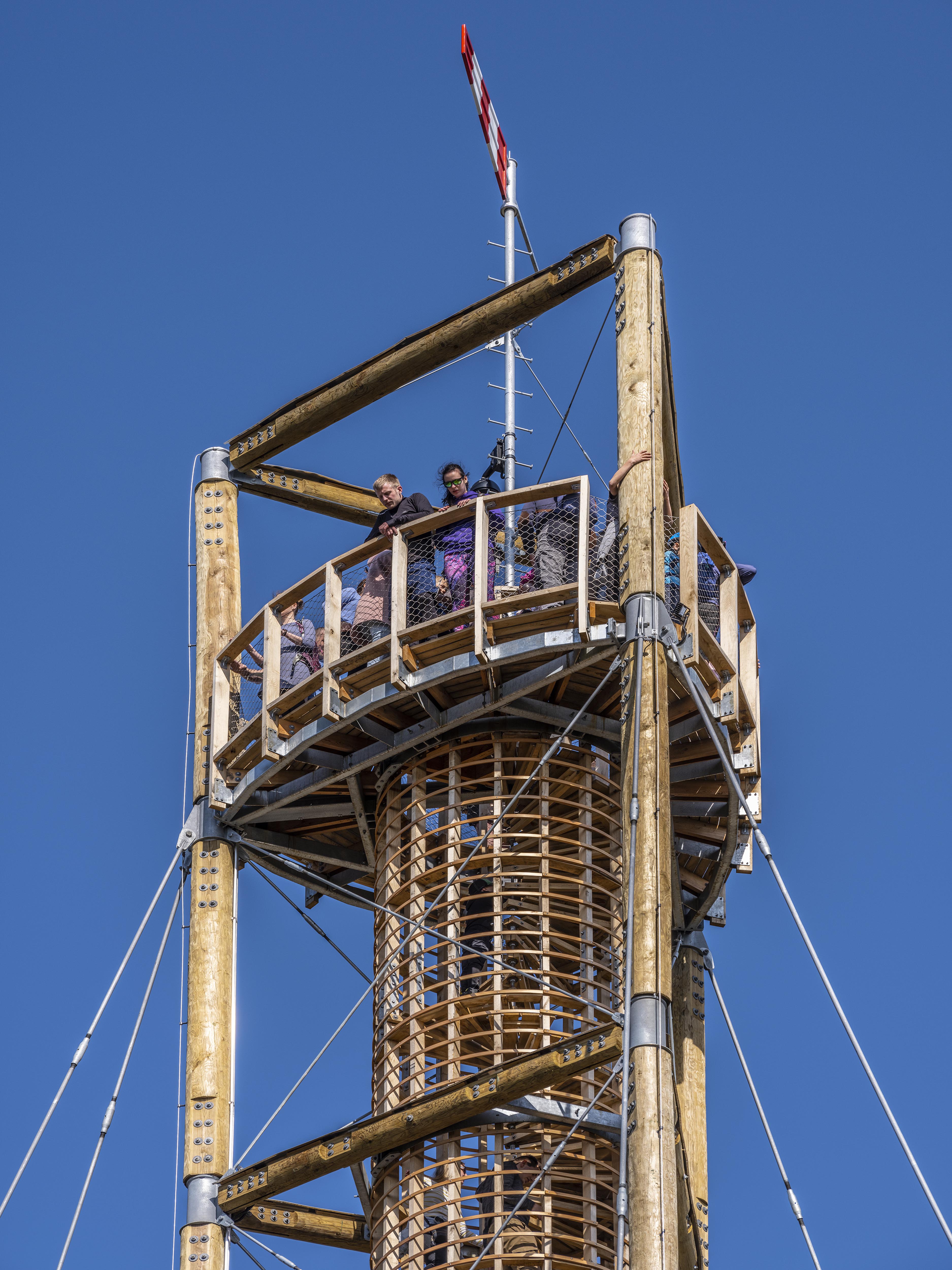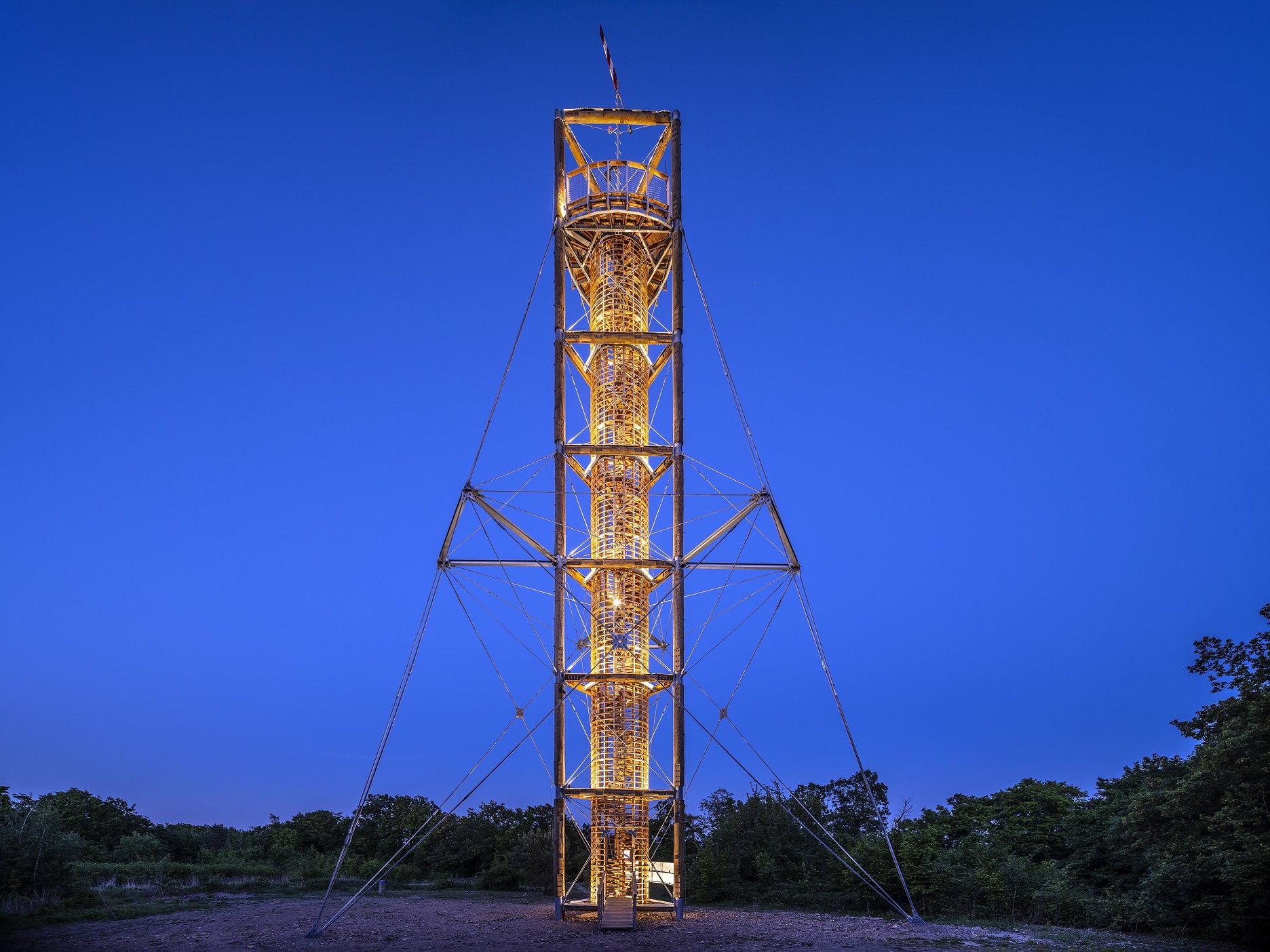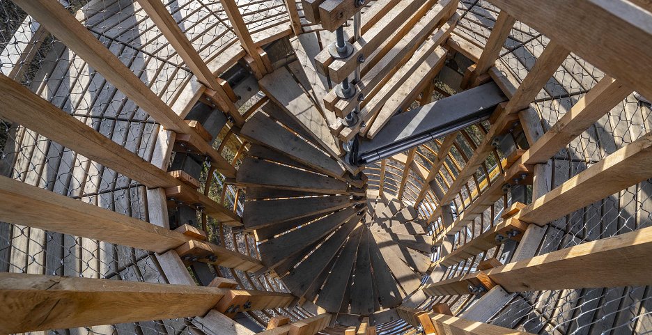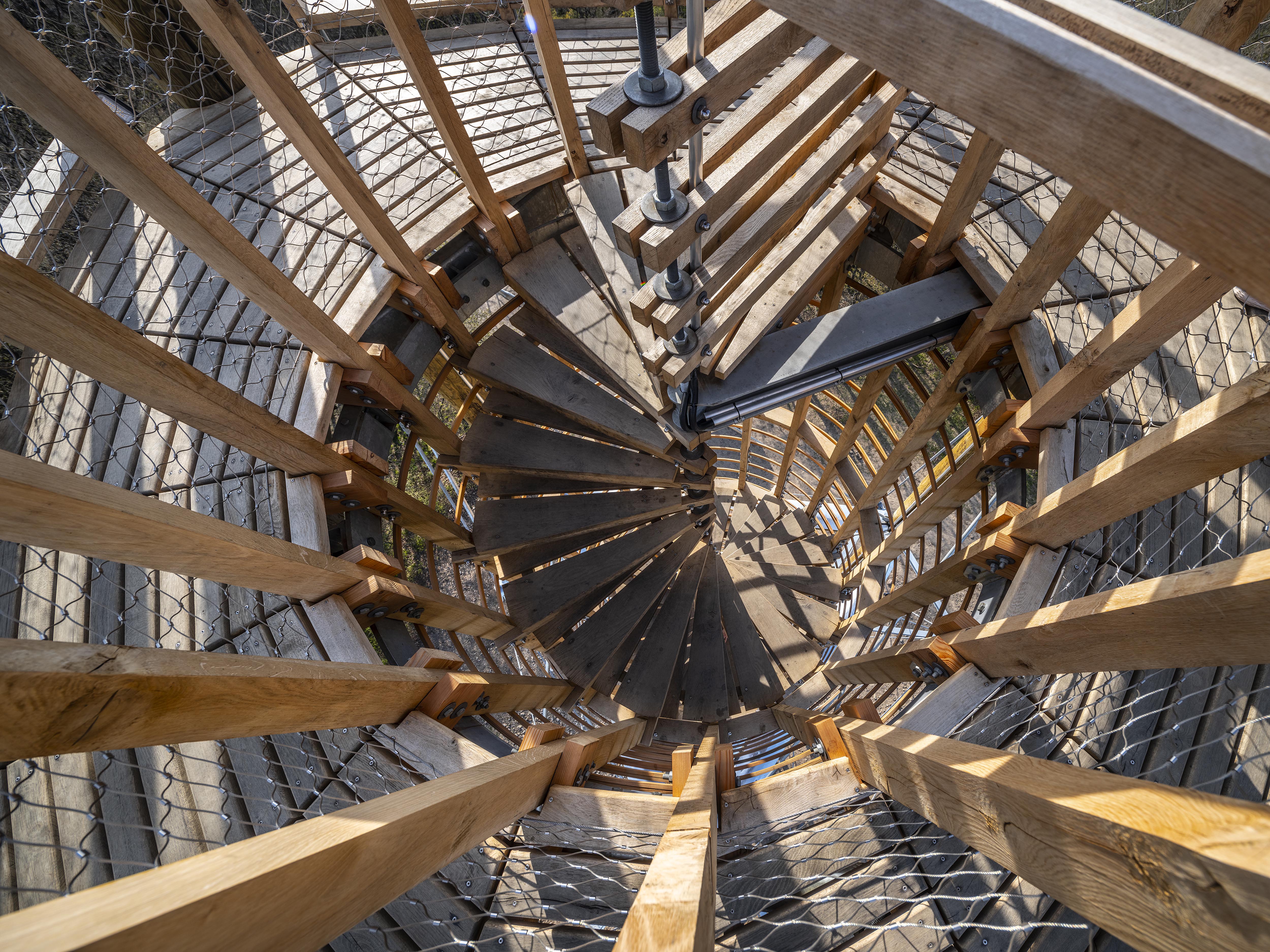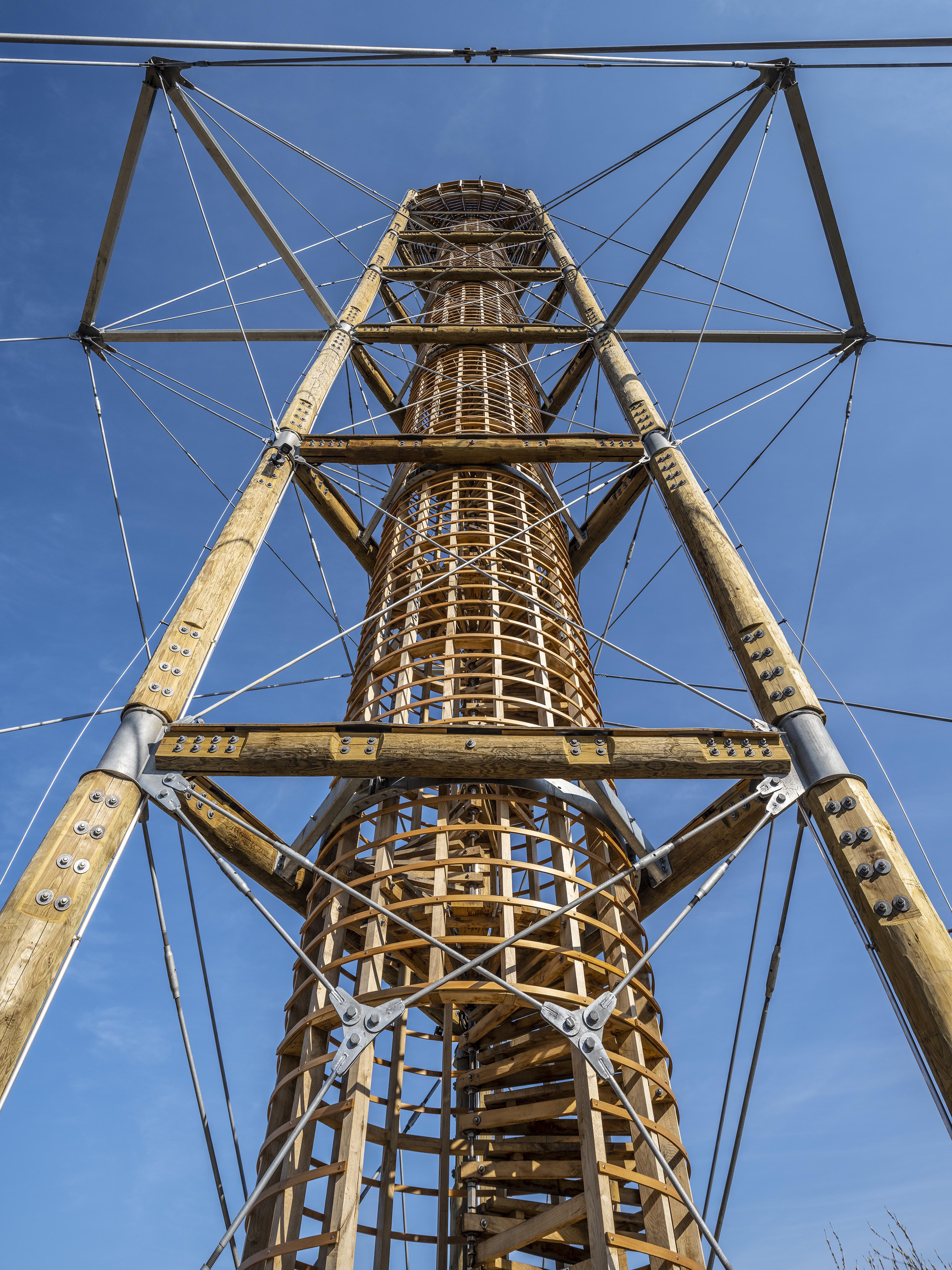Tomuto místu sluší racionální, jednoduchá konstrukce, kde není nic navíc. Trojboká nosná konstrukce rozhledny je tvořena tlakově impregnovanou modřínovou kulatinou spojovanou ocelovými styčníky. Sloupy jsou rozestaveny do trojúhelníku o velikosti strany 4 m a jsou navzájem propojeny kulatinou a ocelovými táhly tak, aby celá struktůra fungovala jako příhradový 28 metrů vysoký nosník. Ten je doplněn „sálingy“ s ocelovými táhly, systém věž stabilizuje proti silám větru.