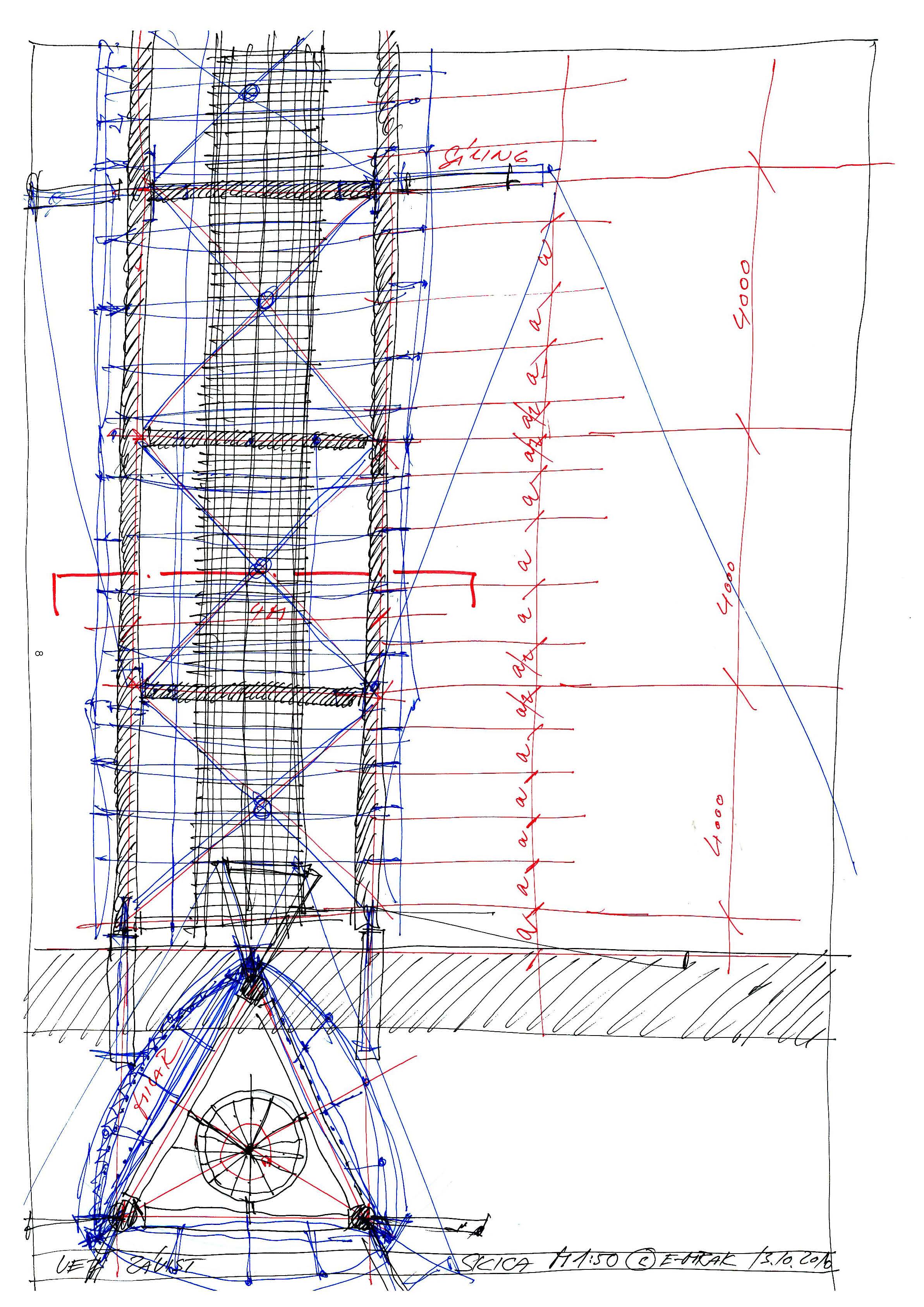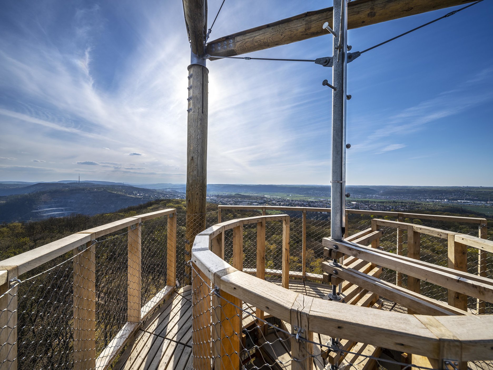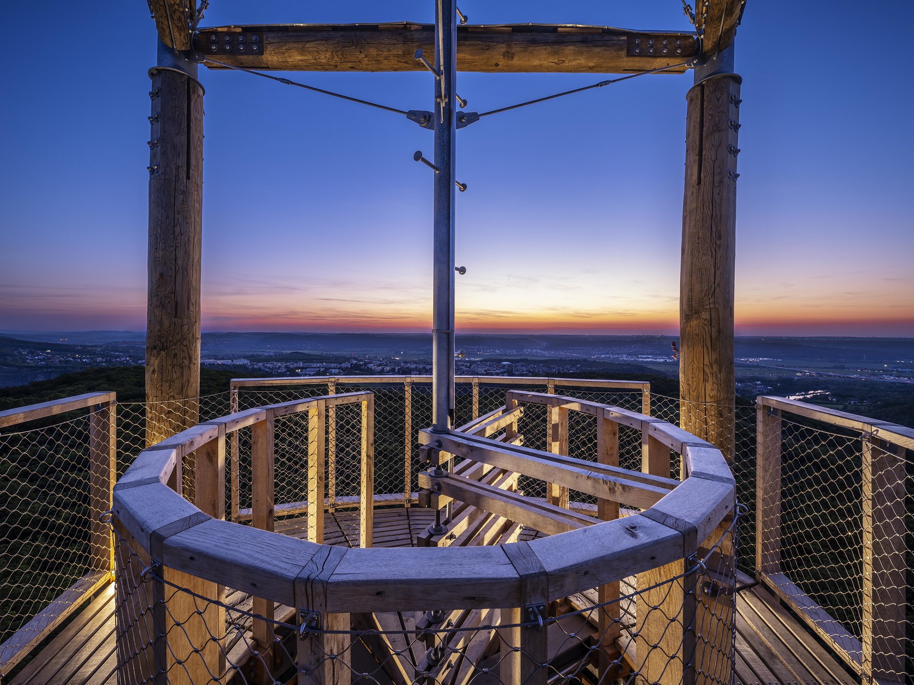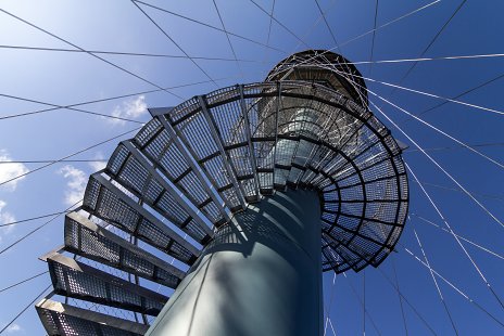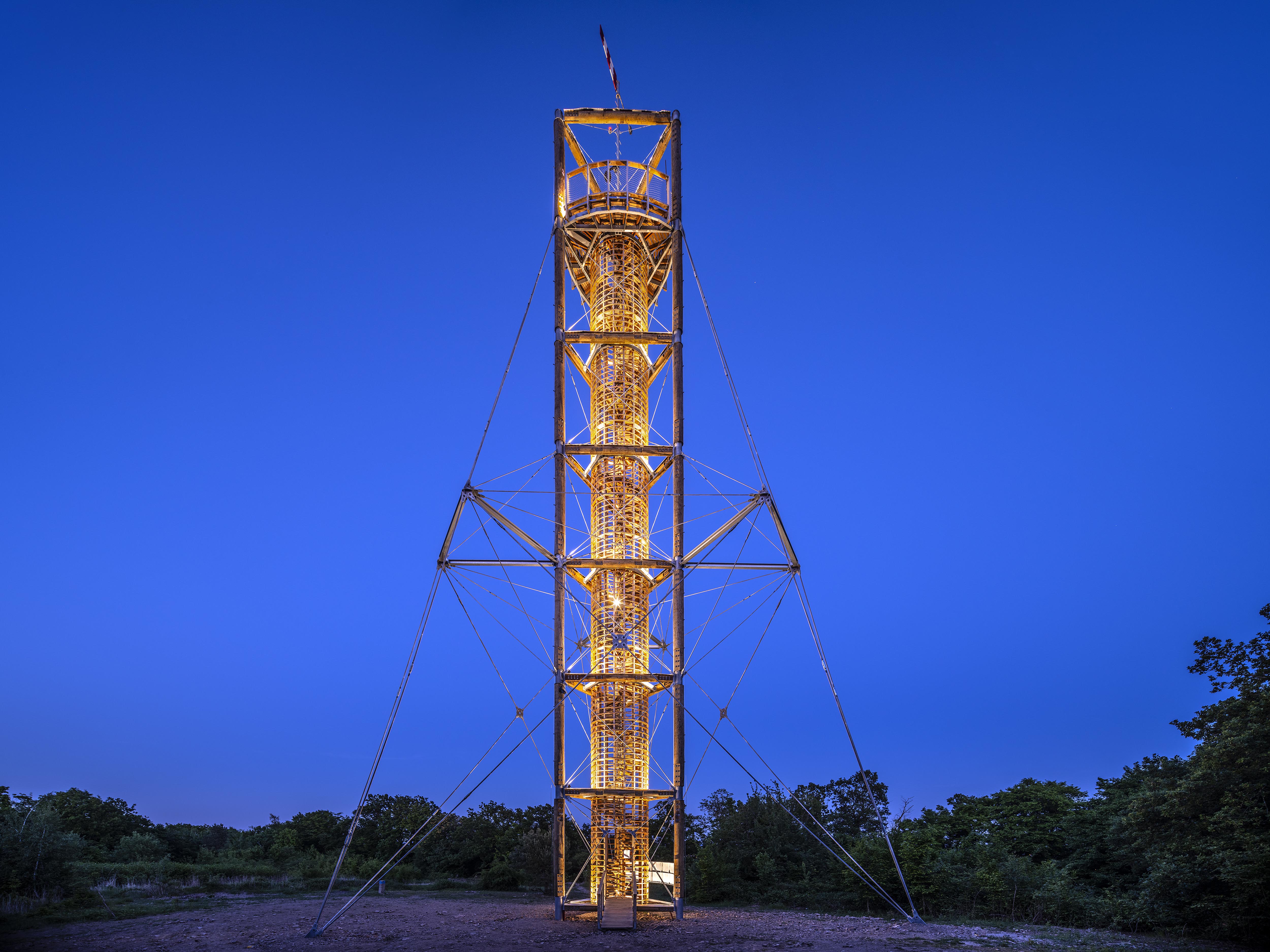 Tomuto místu sluší racionální, jednoduchá konstrukce, kde není nic navíc. Trojboká nosná konstrukce rozhledny je tvořena tlakově impregnovanou modřínovou kulatinou spojovanou ocelovými styčníky. Sloupy jsou rozestaveny do trojúhelníku o velikosti strany 4 m a jsou navzájem propojeny kulatinou a ocelovými táhly tak, aby celá struktůra fungovala jako příhradový 28 metrů vysoký nosník. Ten je doplněn „sálingy“ s ocelovými táhly, systém věž stabilizuje proti silám větru.