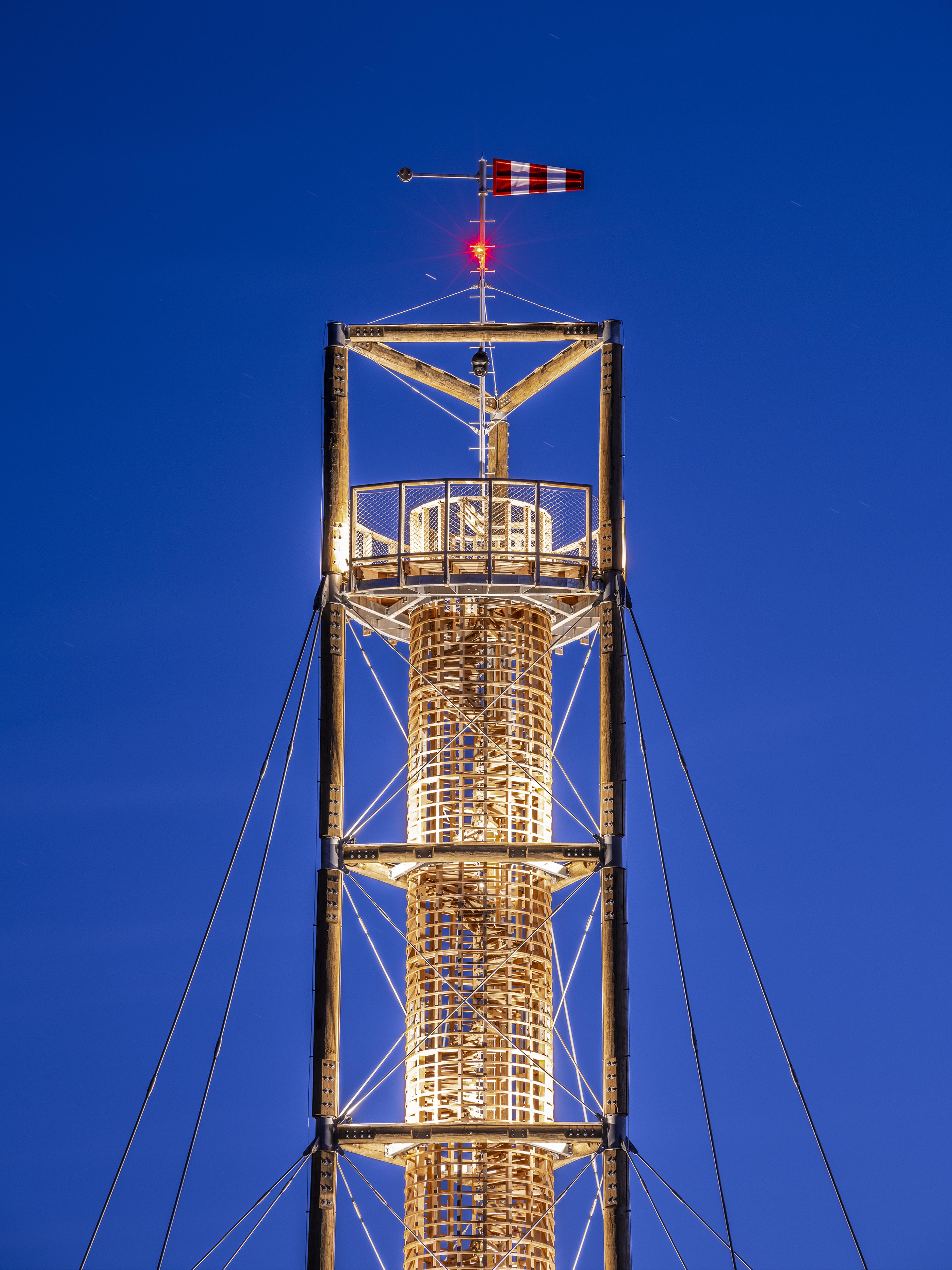 Ve středu věže je zavěšené točité dubové schodiště a nad dřevěnou konstrukci ční stožár opatřený korouhví a signálním světlem.