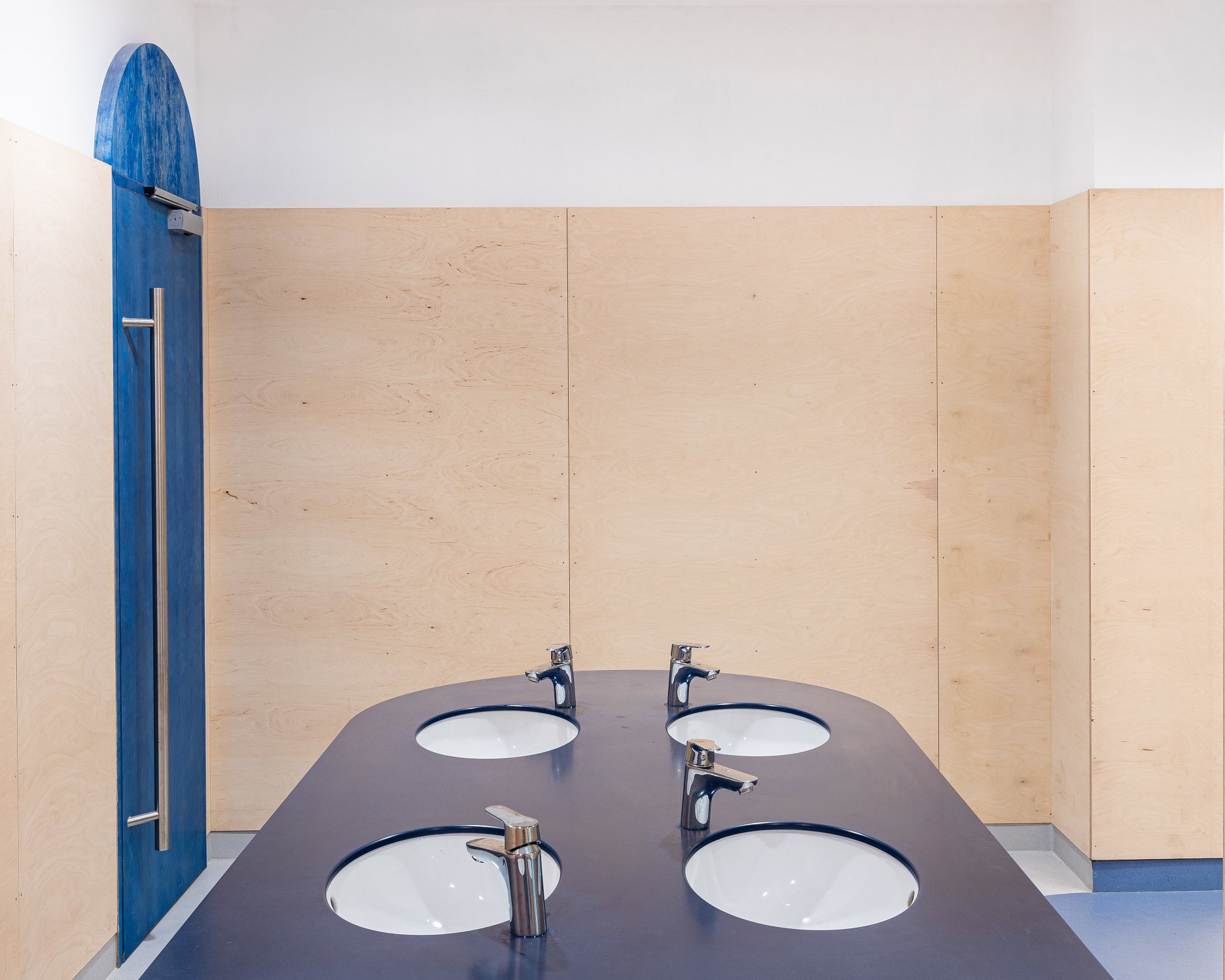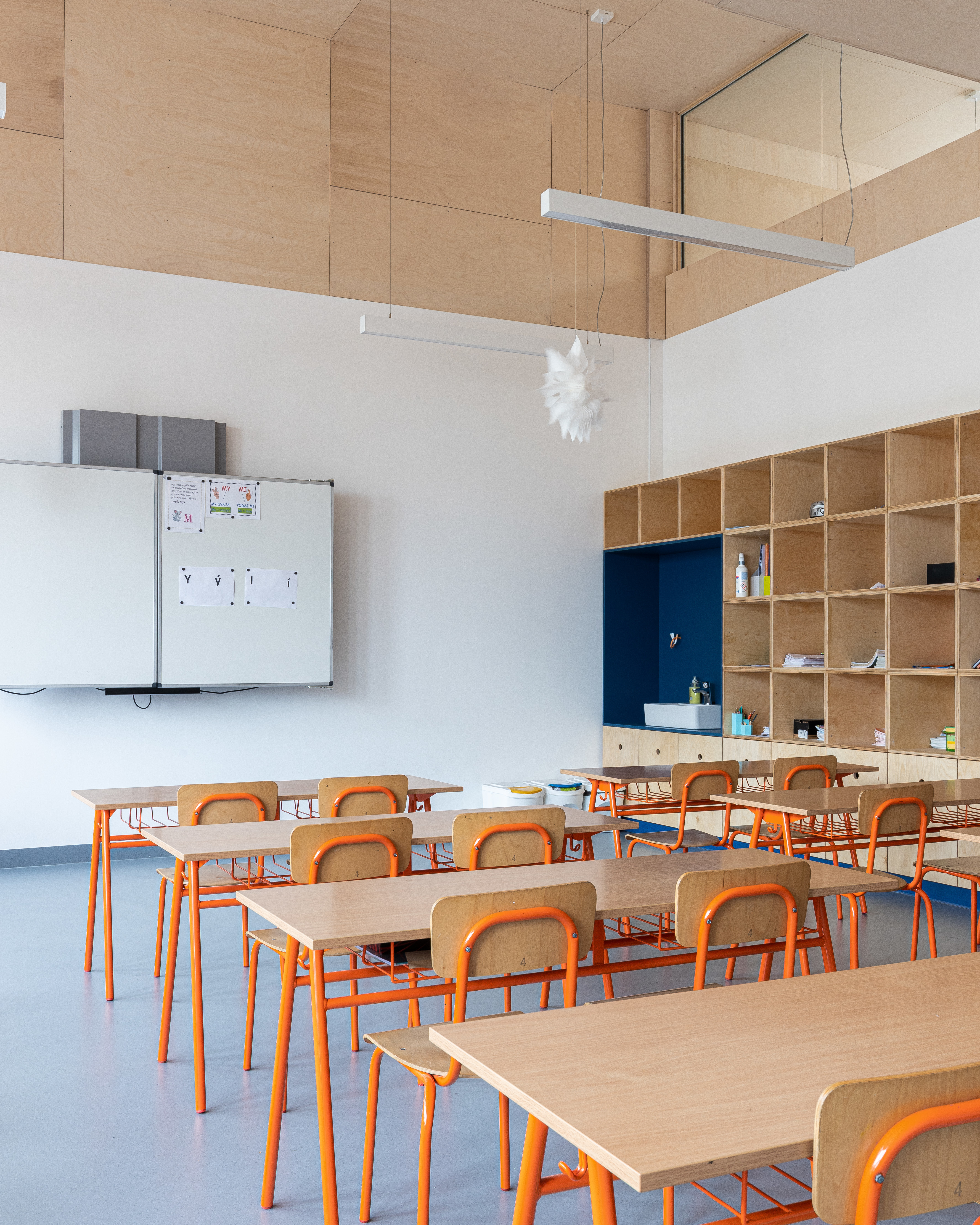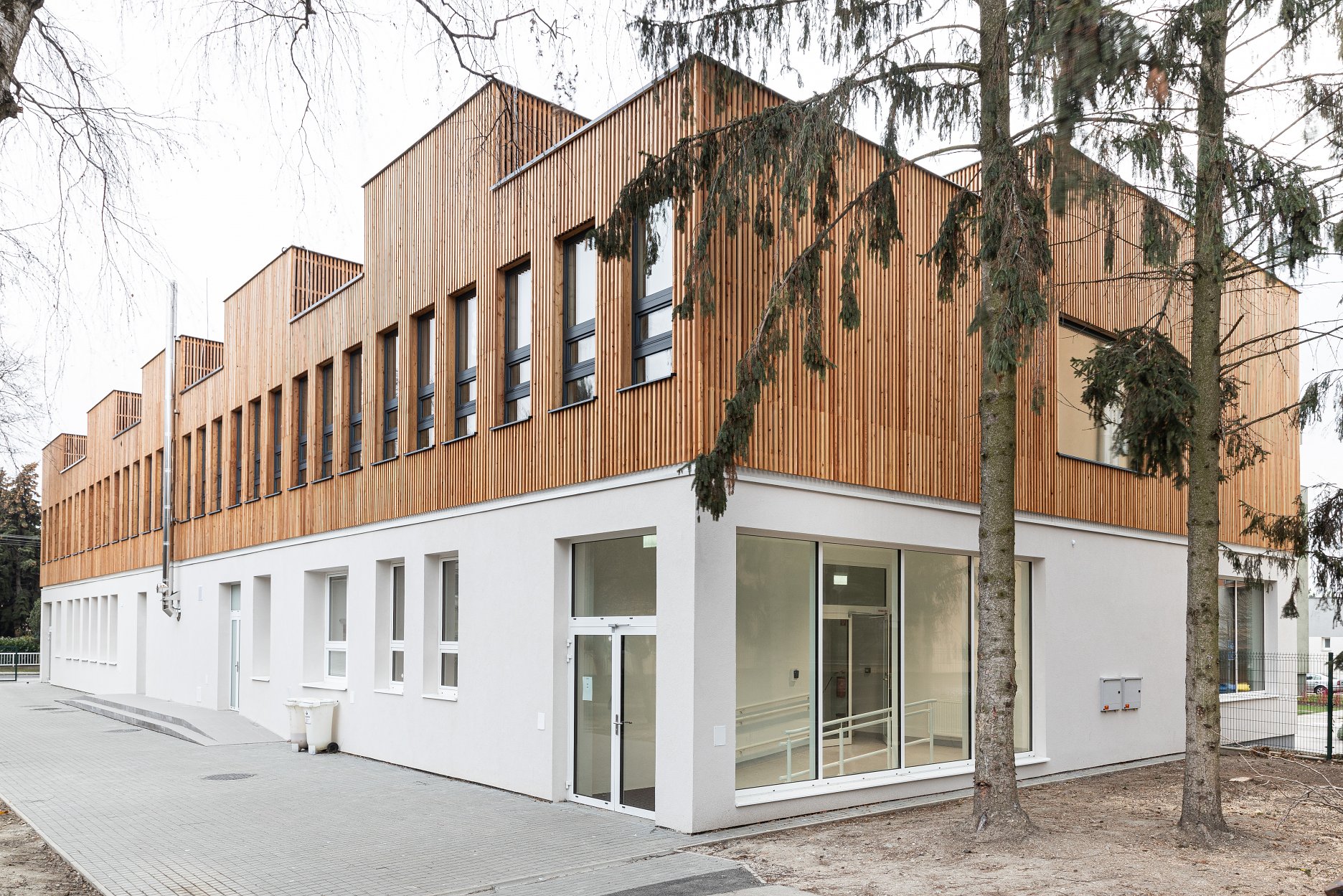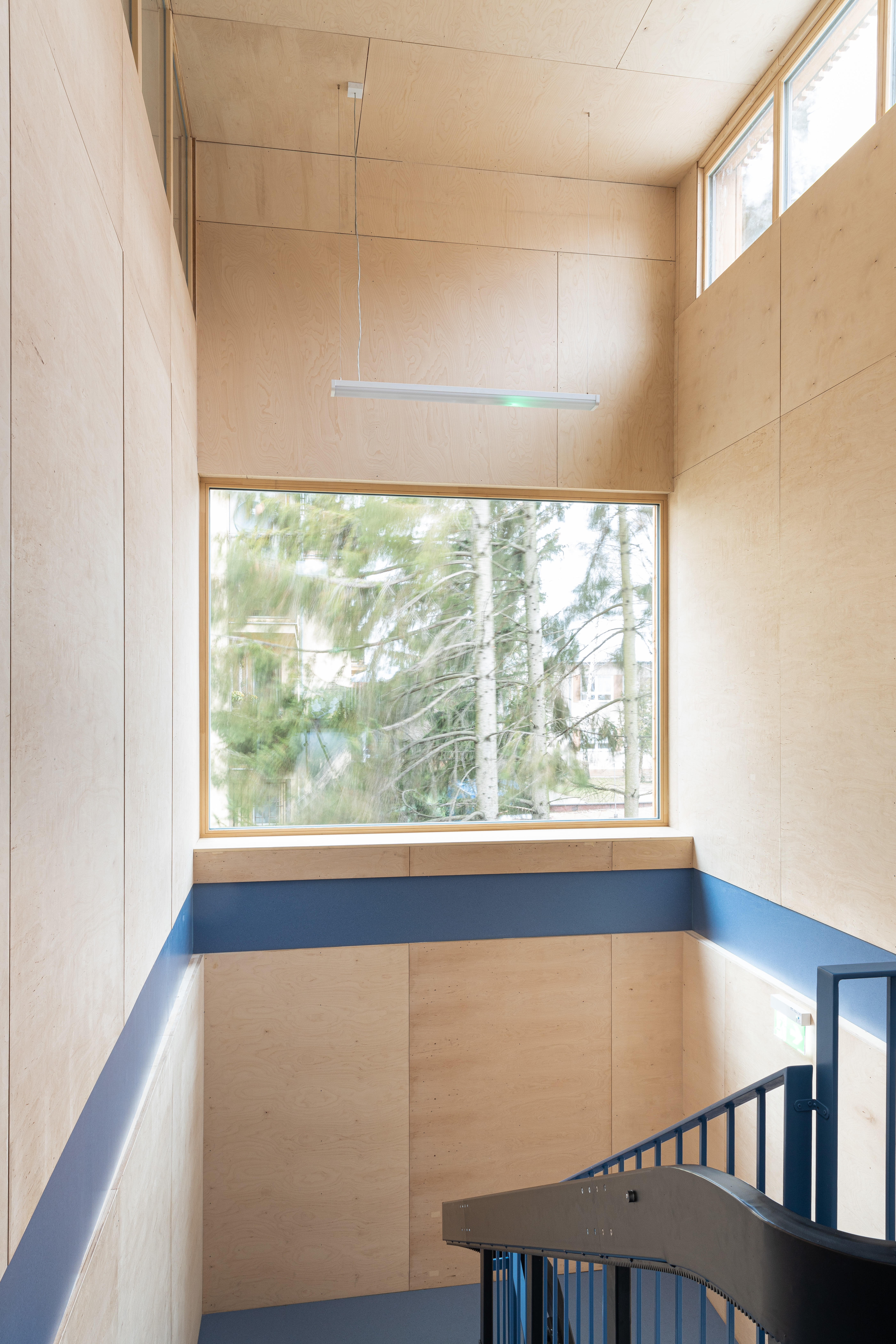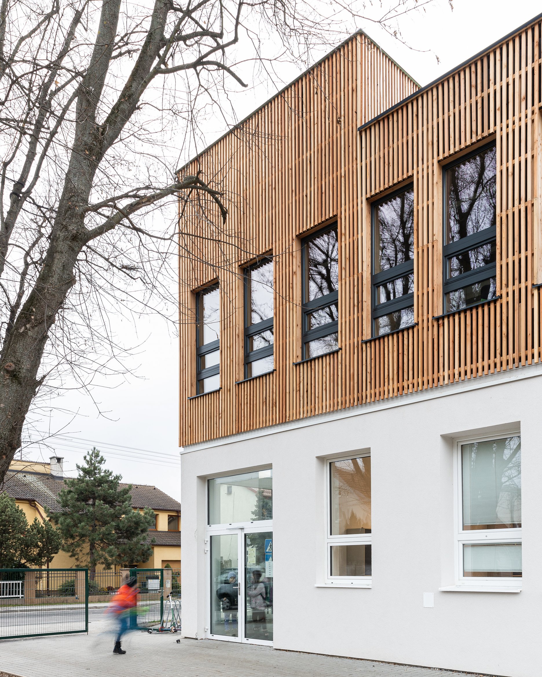 Okrem “prekopania” dispozíce pôvodného objektu na úrovni prízemia realizovali architekti ľahkú drevenú nadstavbu s charakteristickou pílovou siluetou. Prevýšené svetlíky ideálne presvetľujú priestory ôsmich nových učební a vedú prirodzené svetlo aj do centrálnej chodby v hĺbke dispozície. Architekti pracujú v interiéri aj v exteriéri najmä s drevom a prírodnými materiálmi, s ohľadom na nízke emisie VOC a dosiahnutie nízkoenergetického štandardu.
