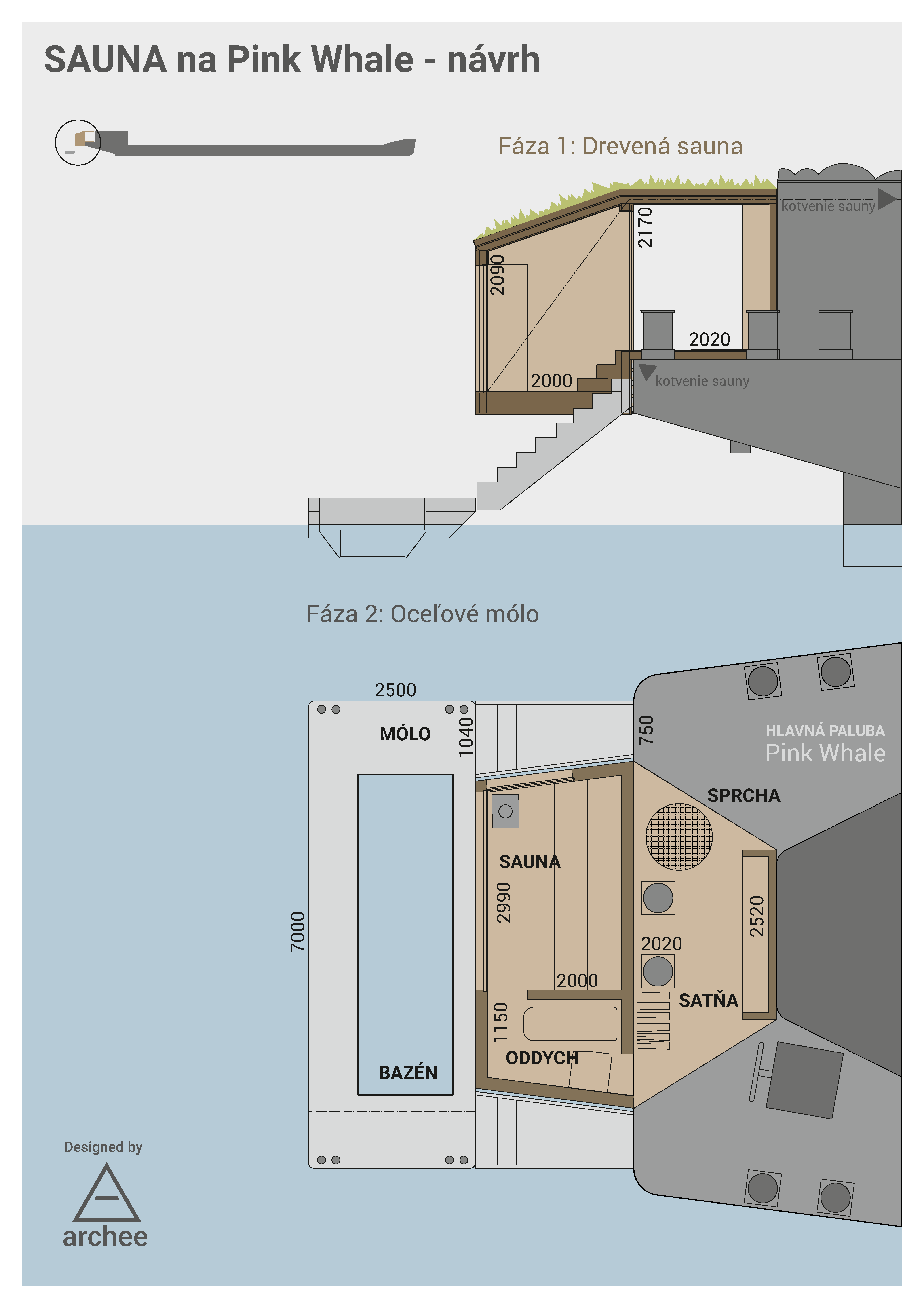 Kormová (zadná) paluba Pink Whale sa ukázala ako vhodné miesto na osadenie sauny. Nachádza sa trochu bokom od hlavného diania na palube, čo bolo pre saunérov žiaduce. Korma však bola príliš malá a sauna by sa na ňu len ťažko zmestila. Hmotovo sme chceli nadviazať na existujúcu kabínu kormidelníka a lodný dizajn si pýtal symetrické riešenie. Neostalo nám preto iné, ako saunu vysunúť nad vodnú hladinu.