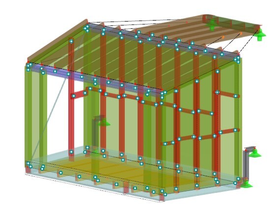 Podlahový rám je tvorený z obvodových a priečnych nosníkov z lepeného lamelového dreva. Nosnú konštrukciu stien tvorí stĺpikový systém s prierezmi 60/140 vystuženými OSB doskou. V bočných stenách sú navyše zabudované oceľové tiahla, ktoré spolu s OSB doskou zabezpečujú potrebnú tuhosť konštrukcie. Ťahové reakcie z vrchného kotvenie prenáša do stien a podlahy strešná konštrukcia z vrstveného dreva LVL. Strešné nosníky sú vystužené plošne OSB doskou.
