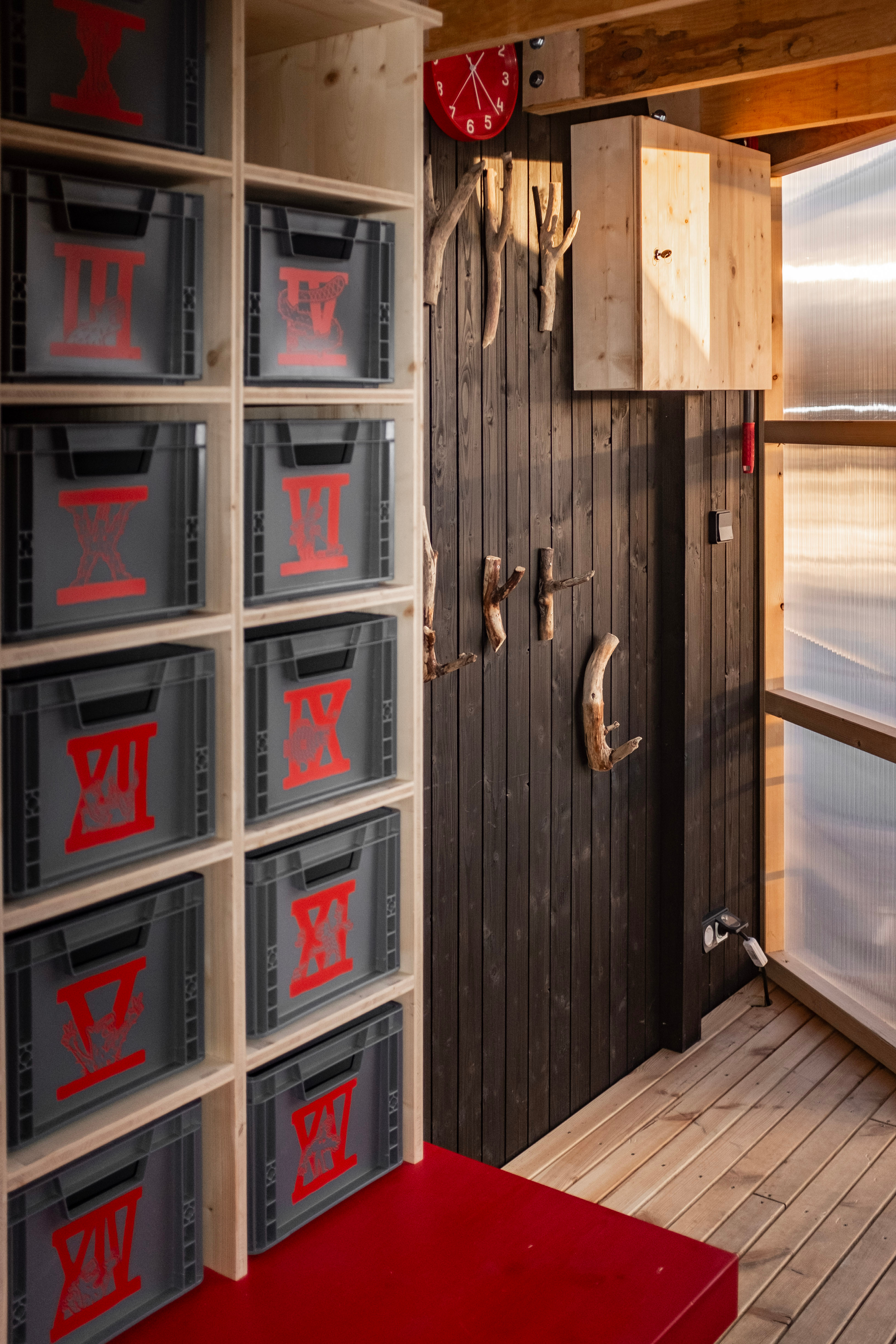V kontraste s tmavým obkladom sú svetlé lavice zo severskej borovice, ktorým sa bobor vyhýba – a preto sú určené pre návštevníkov. Borovica môže pri zohriatí uvoľniť živicu, no práve tá dodáva saune príjemnú vôňu.