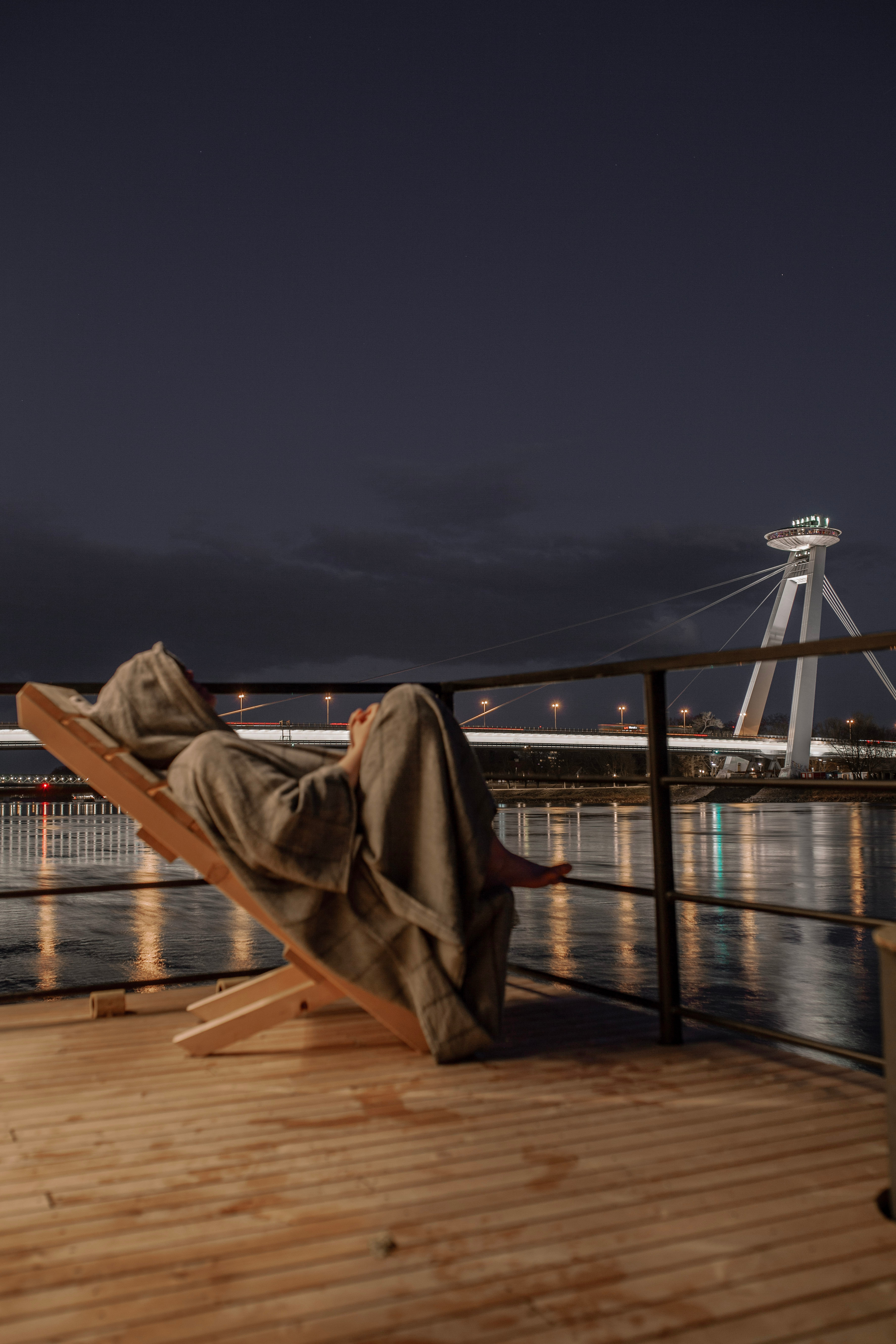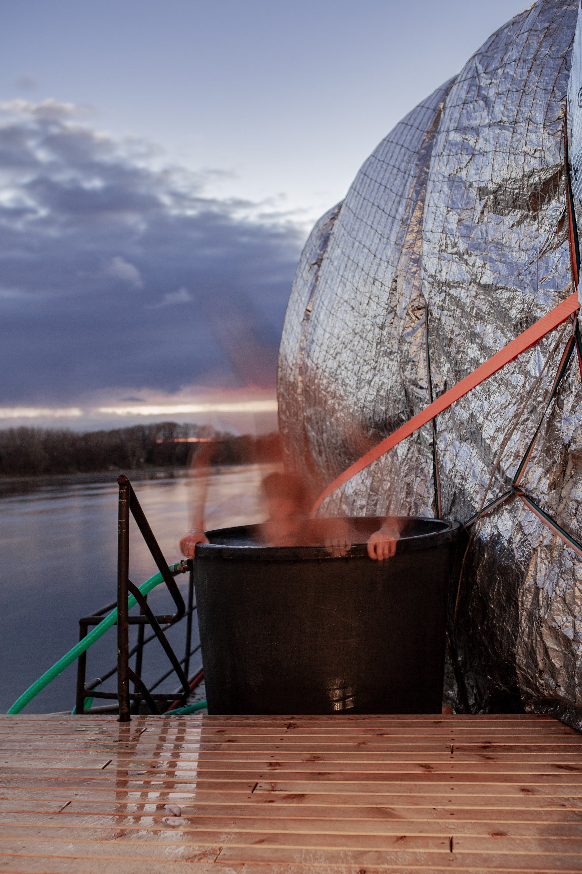 Dve priame, dostatočne komfortné lavice – na sedenie aj ležanie. Zo spodnej lavice je výhľad na Dunaj a mesto, ktoré obmýva, z vrchnej sa viac sústredíte na vnútro sauny. Pod sebou vnímate vodu v kvapalnom skupenstve, no zároveň cítite jej silu, keď sa mení na paru a obmýva rozpálené kamene v peci.