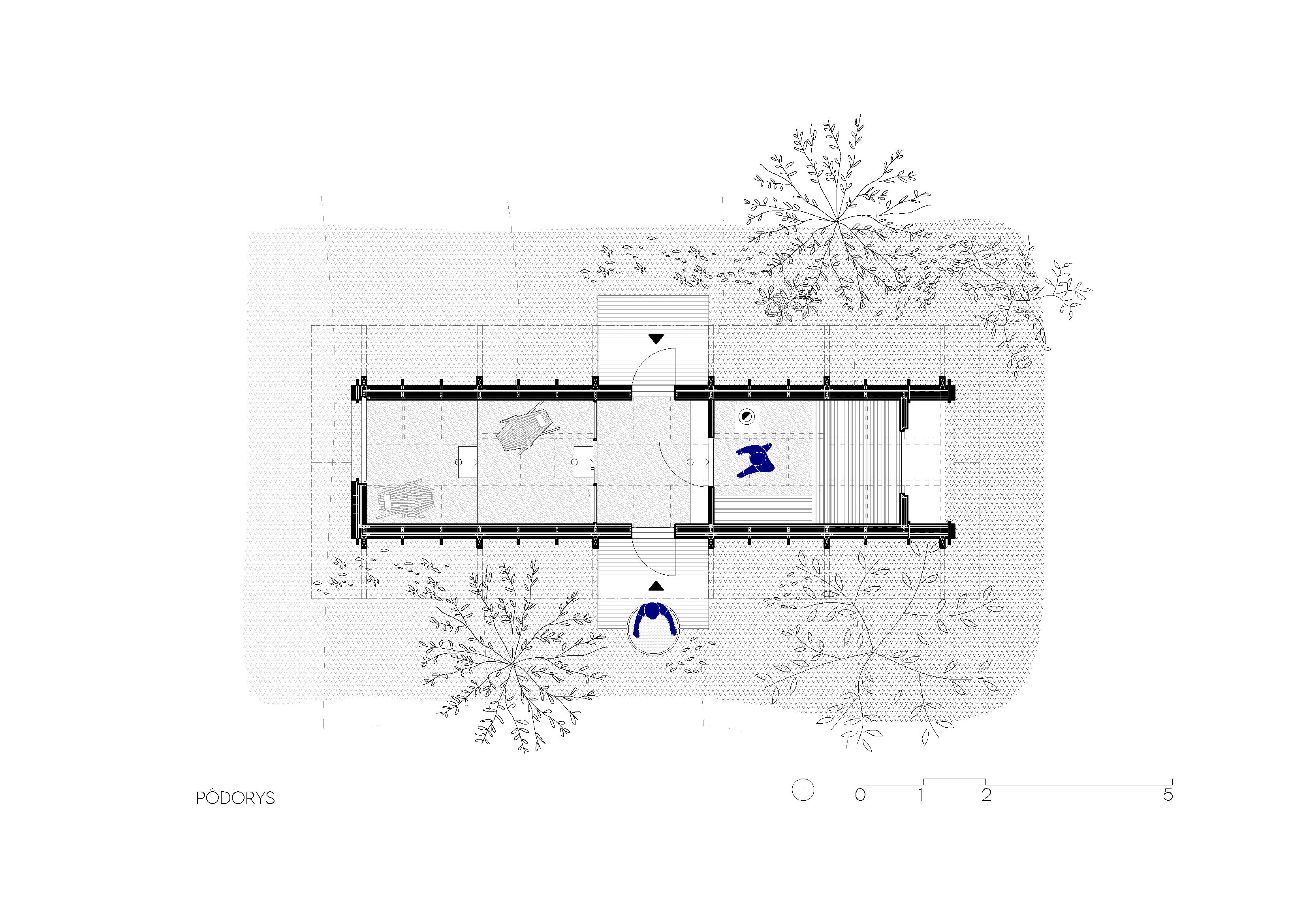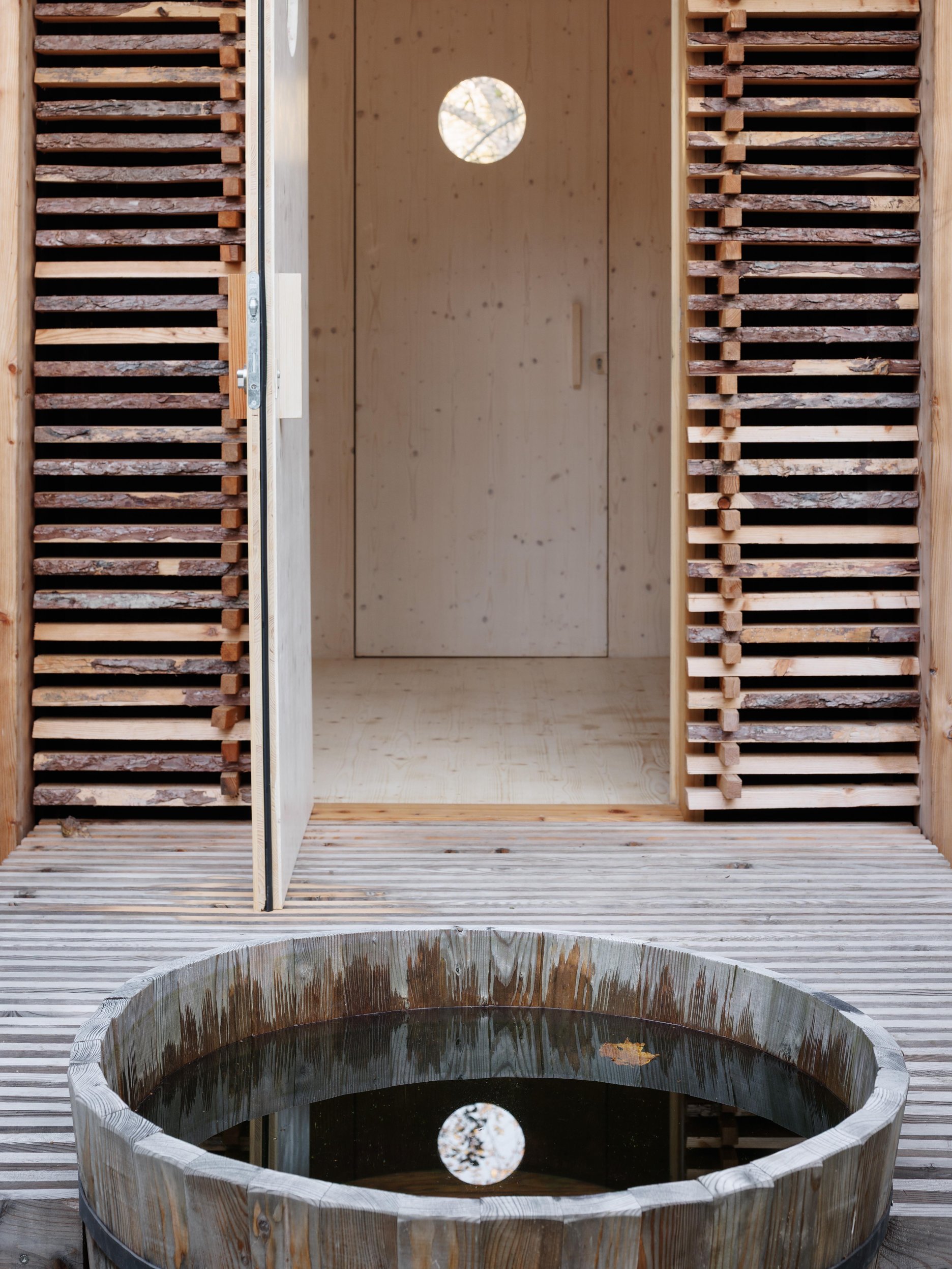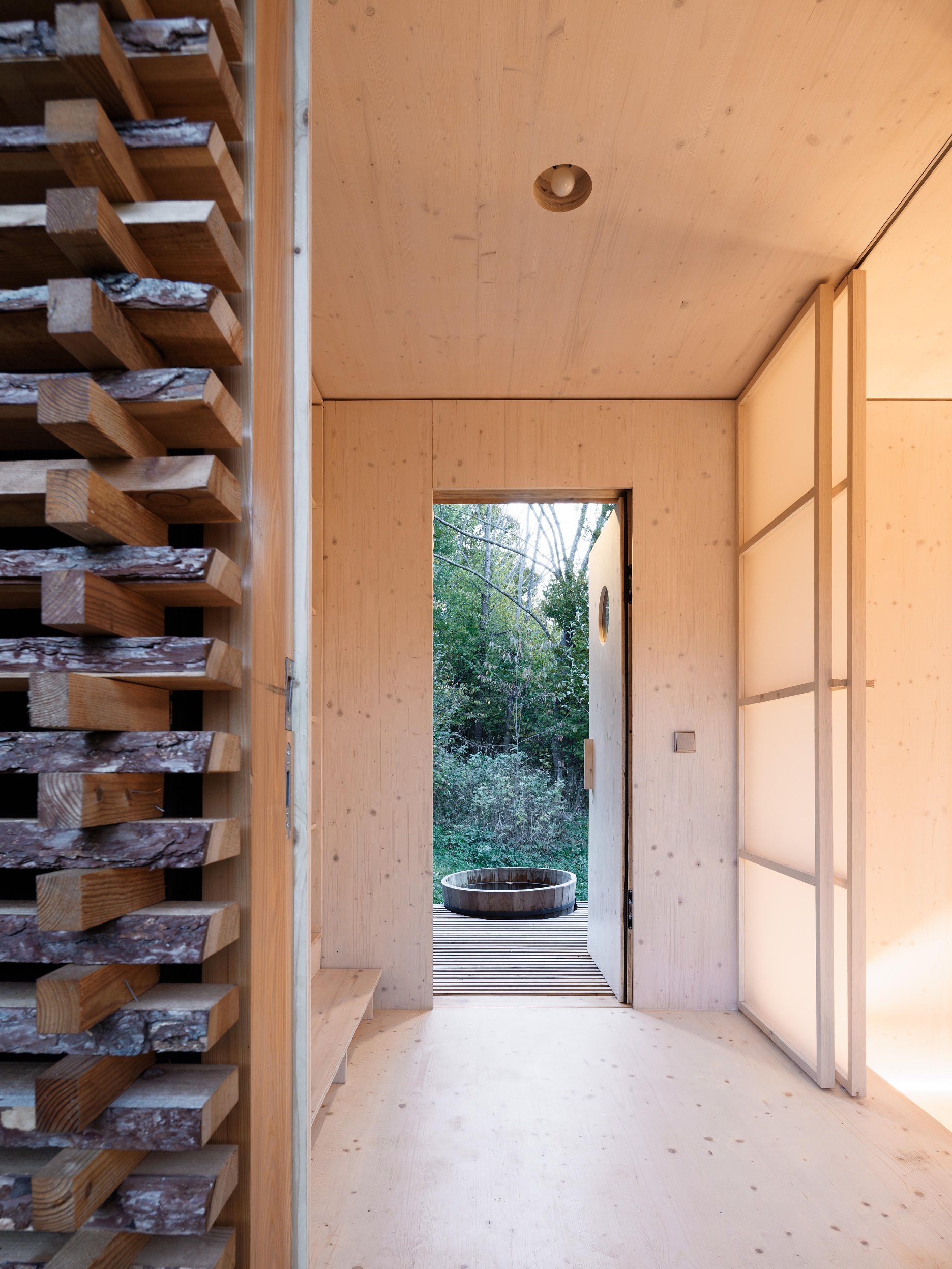 Dispozične je objekt riešený ako trojpriestor. Do sauny sa vstupuje z drevenej platformy situovanej v strednej časti. Zádverie predstavuje komunikačný uzol naviazaný na ostatné prevádzky a slúži na prezliekanie. V nižšej časti, ktorá je najviac primknutá k terénu, sa nachádza potiareň navrhnutá ako kompaktný, tepelne stabilný priestor. Vo vyššej časti je umiestnená odpočiváreň, je objemovo veľkorysejšia, s rozmerným presklením, ktoré sprostredkúva priamy vizuálny kontakt s okolitou prírodou. Na opačnej strane vstupu je situovaná exteriérová terasa s kúpacou kaďou, priamo prístupná zo zádveria. Táto časť si zachováva charakter intímneho miesta s nerušeným výhľadom do lesa.