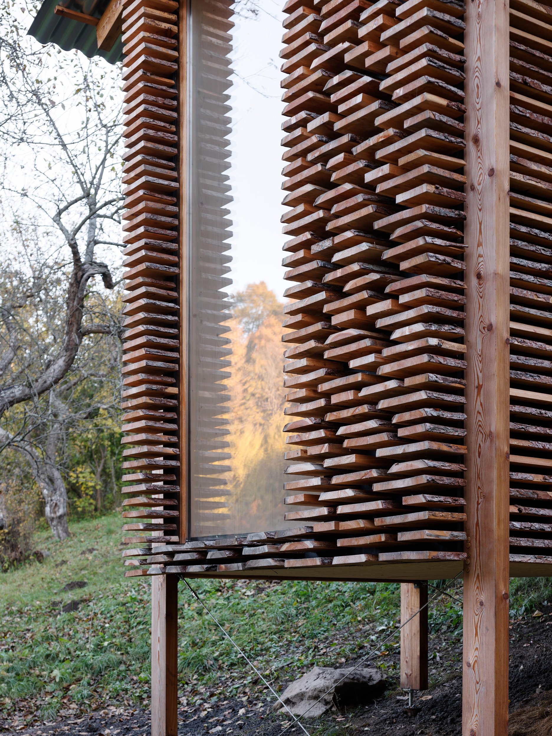 Fasáda objektu bola inšpirovaná tradičným spôsobom sušenia dreva, ide o voľnú parafrázu pripomínajúcu proces saunovania. Funkčná forma štosovaného reziva je často vídaná v dedinskom prostredí ako „sklad dreva“. Strecha je rovnako inšpirovaná týmto spôsobom sušenia, kedy sa stretávame s jednoduchým prekrytím ľahkým plechom s možnosťou prevetrávania.