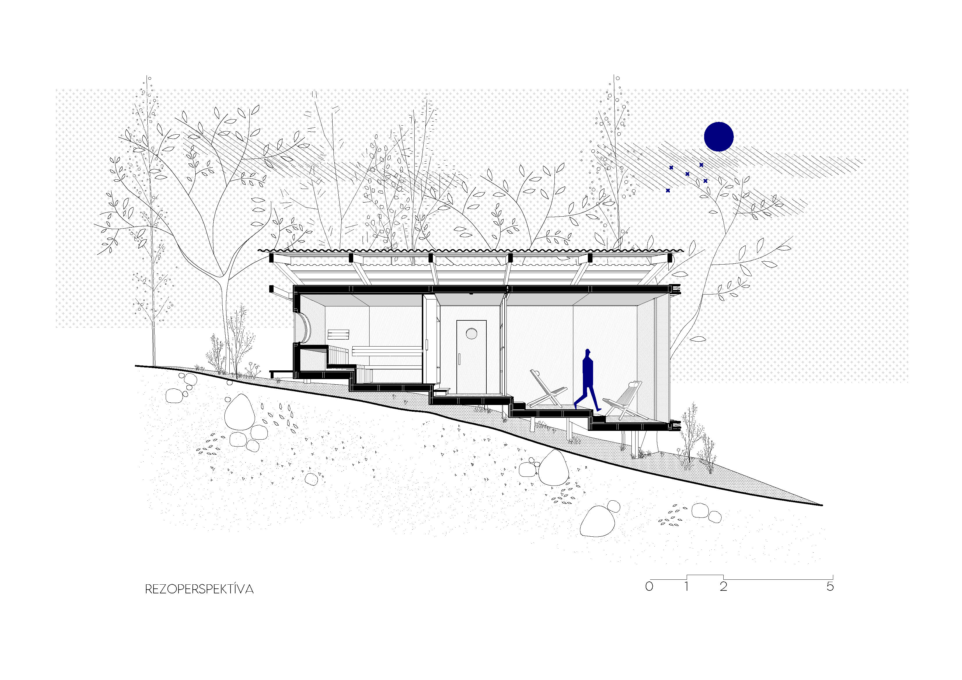 Návrh vychádza z miestnej morfológie a genia loci. Architektonické riešenie reaguje na svahovitý terén a je koncipované ako lineárny objem osadený kolmo na vrstevnice. Kontakt sauny s terénom je minimálny, čo necháva krajinu pod objektom voľne plynúť. Hmota sa v smere svahu stupňovito zväčšuje a otvára, čím graduje od nízkej technickej časti až po prevýšenú odpočiváreň. Tento princíp zároveň reflektuje vnútorné funkčné členenie. Osadenie objektu je zámerne riešené bez invazívnych zásahov do podložia a výrazných terénnych úprav. Celá stavba je preto vynesená nad terén na subtílnej drevenej rámovej konštrukcii, ktorá je kotvená do zeme prostredníctvom betónových pätiek.