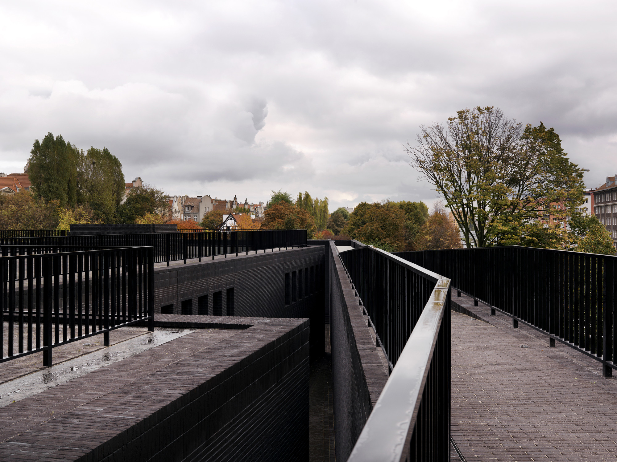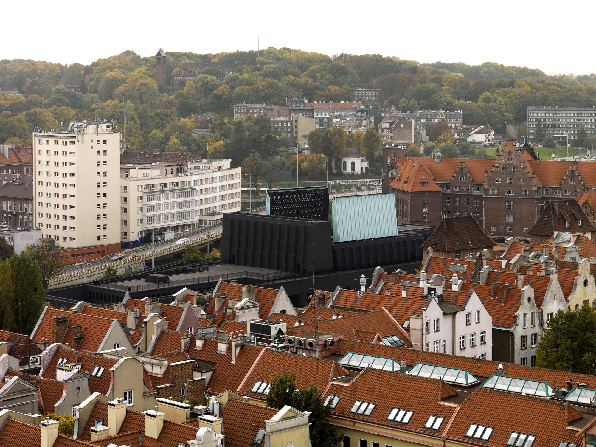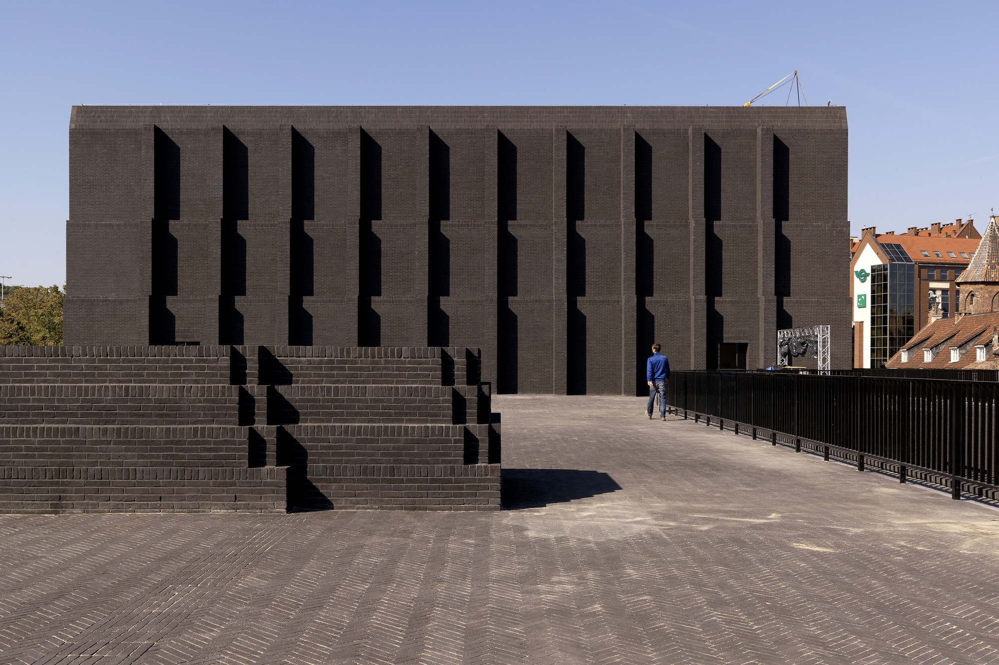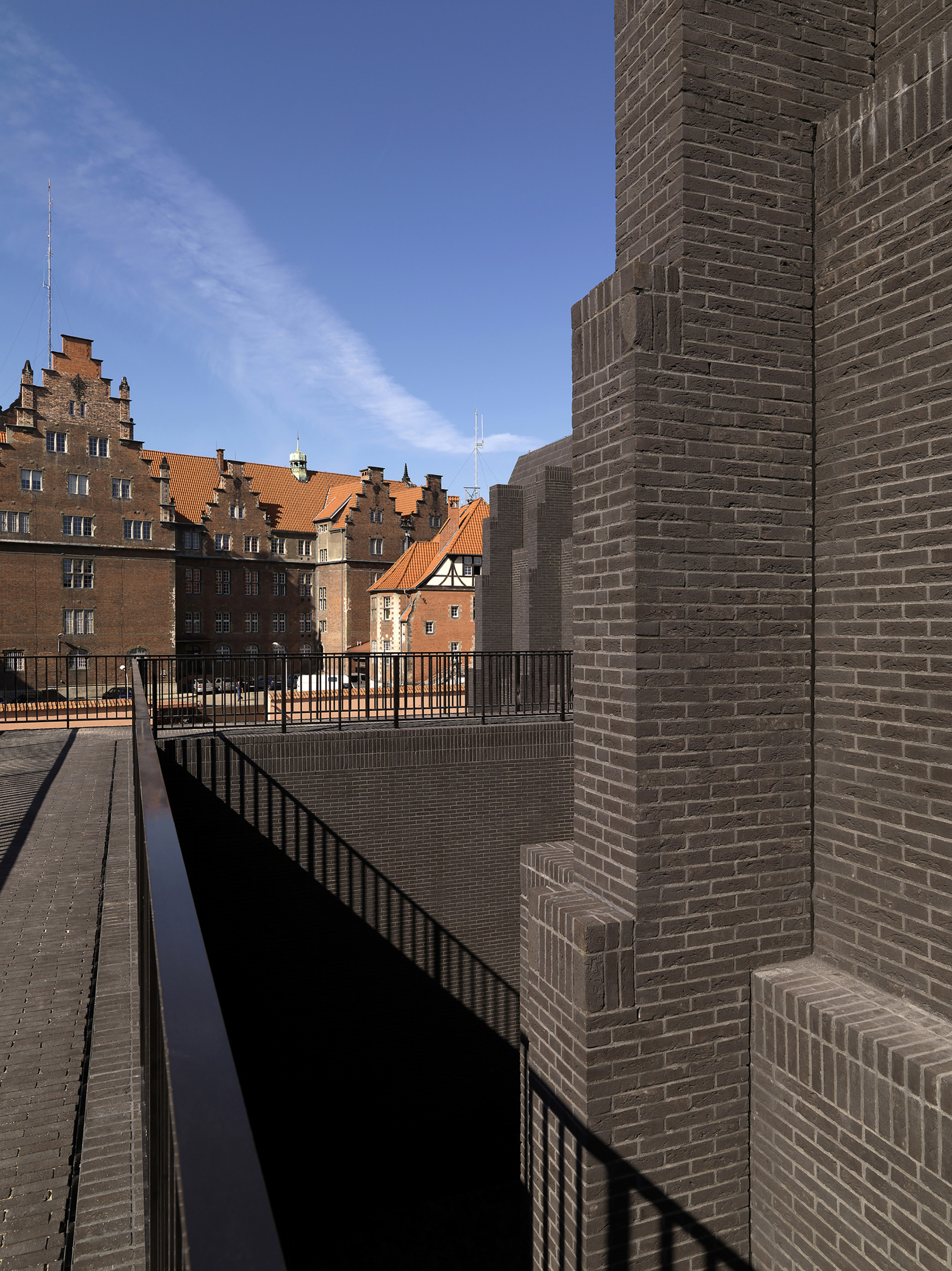 Výber materiálu pre strešné krídla (zelená predpatinovaná meď) bol ovplyvnený neďalekou katedrálou Panny Márie. Budova z tmavých tehál v historickom centre mesta, z ktorej vyrastajú veže so svojimi ihlicovými strechami. Vysoké, štíhle, s patinou. S jednoliatym povrchom strechy kontrastuje vnútorná strana krídel - strop. Kosoštvorcový motív, ktorý geometricky vychádza z podpornej konštrukcie prispôsobuje mierku interiéru.