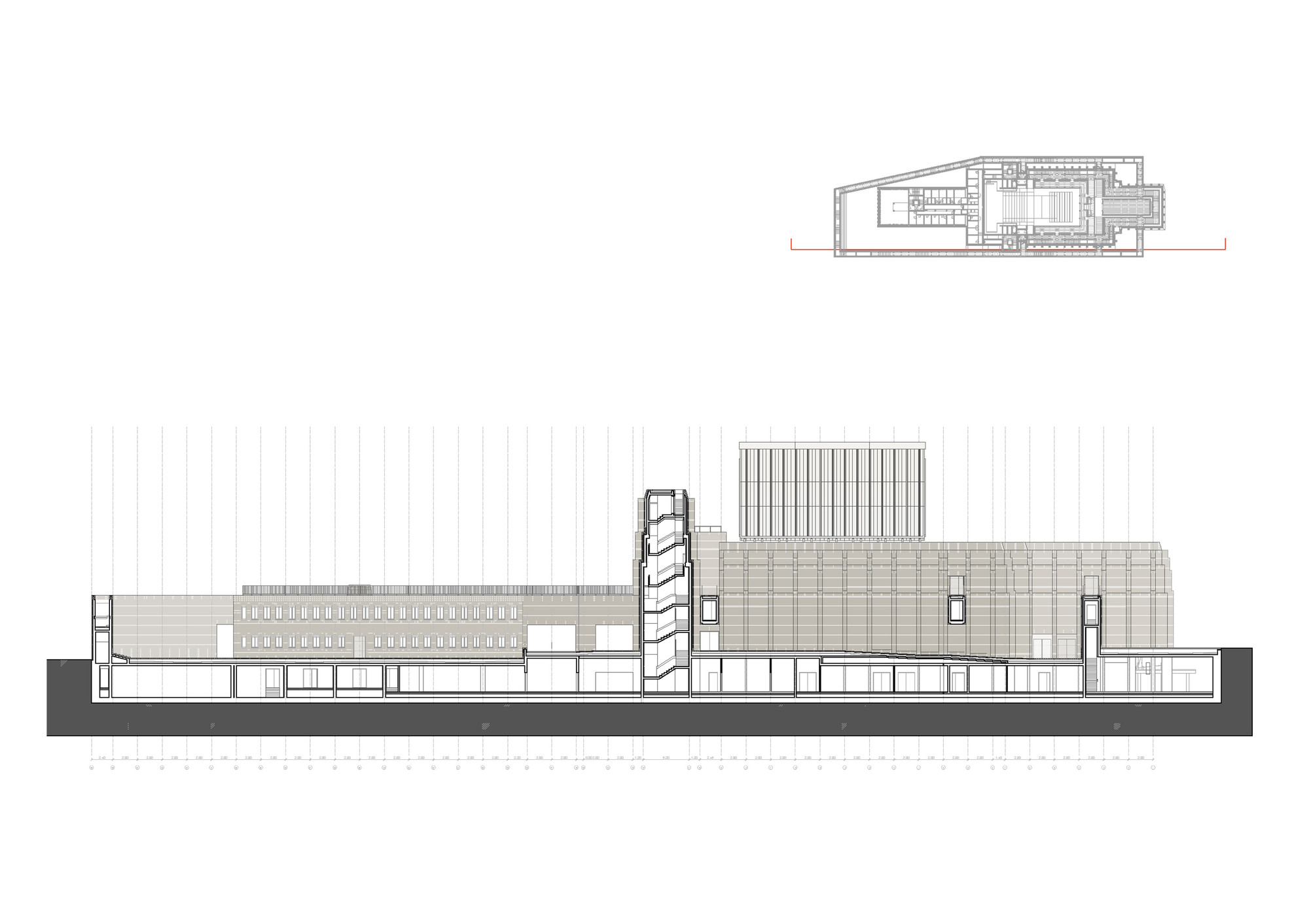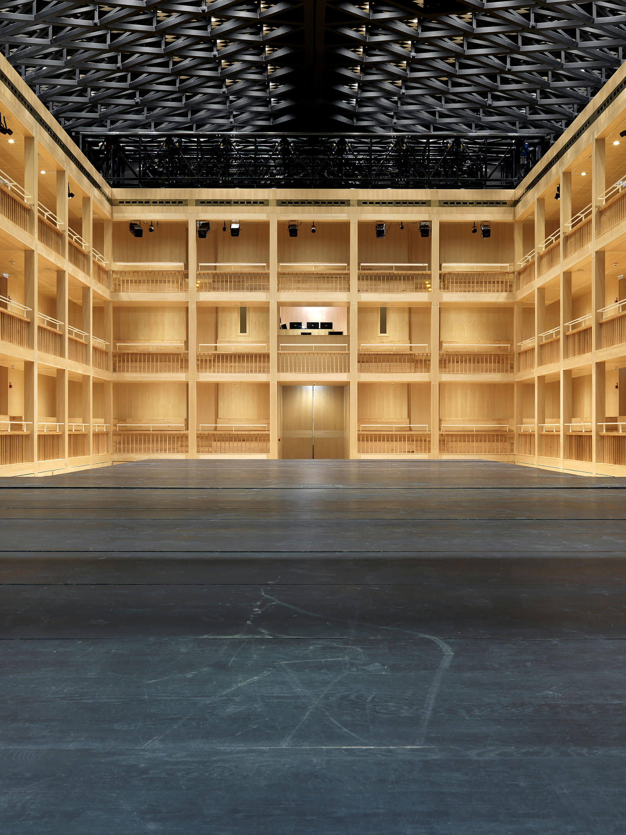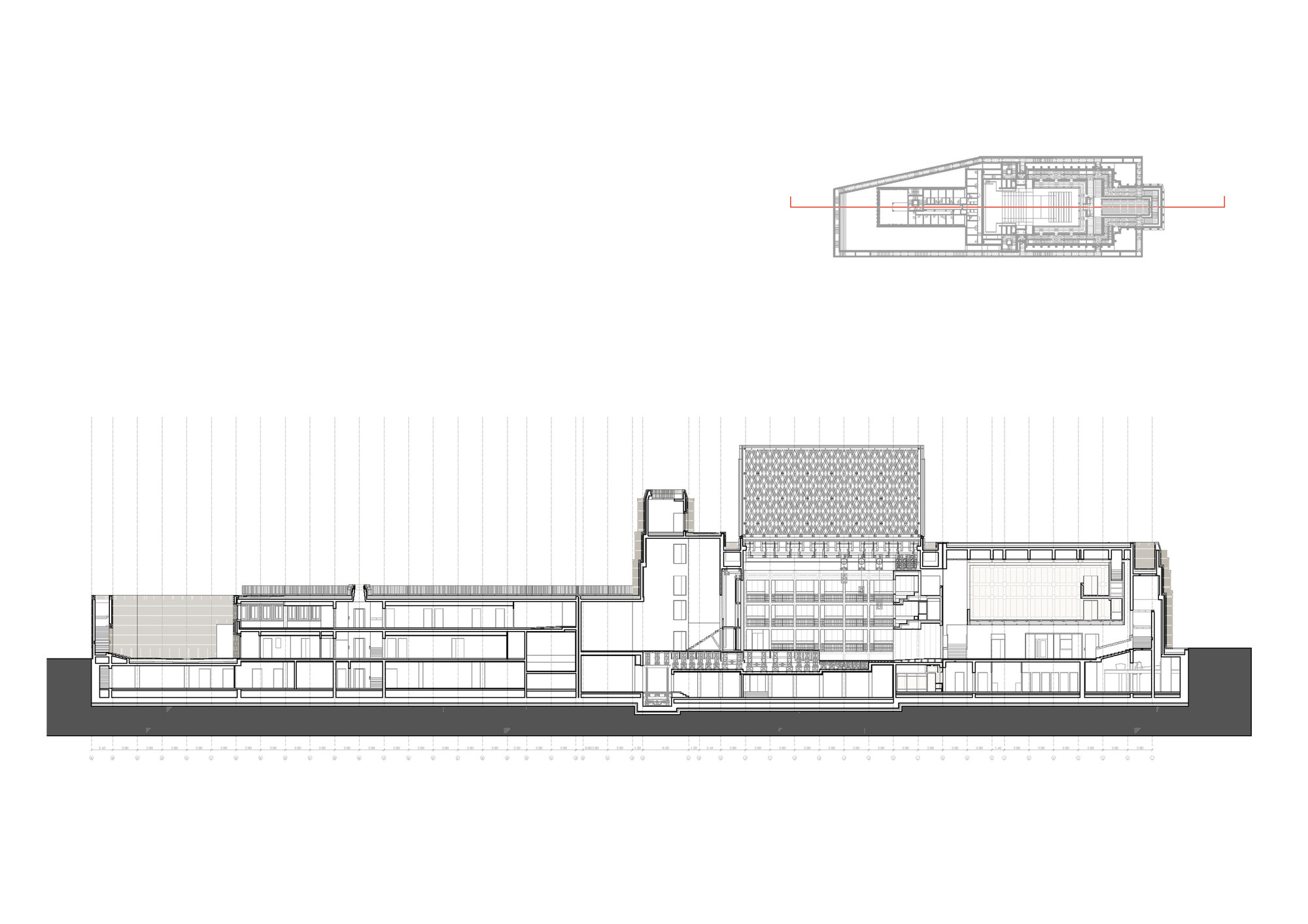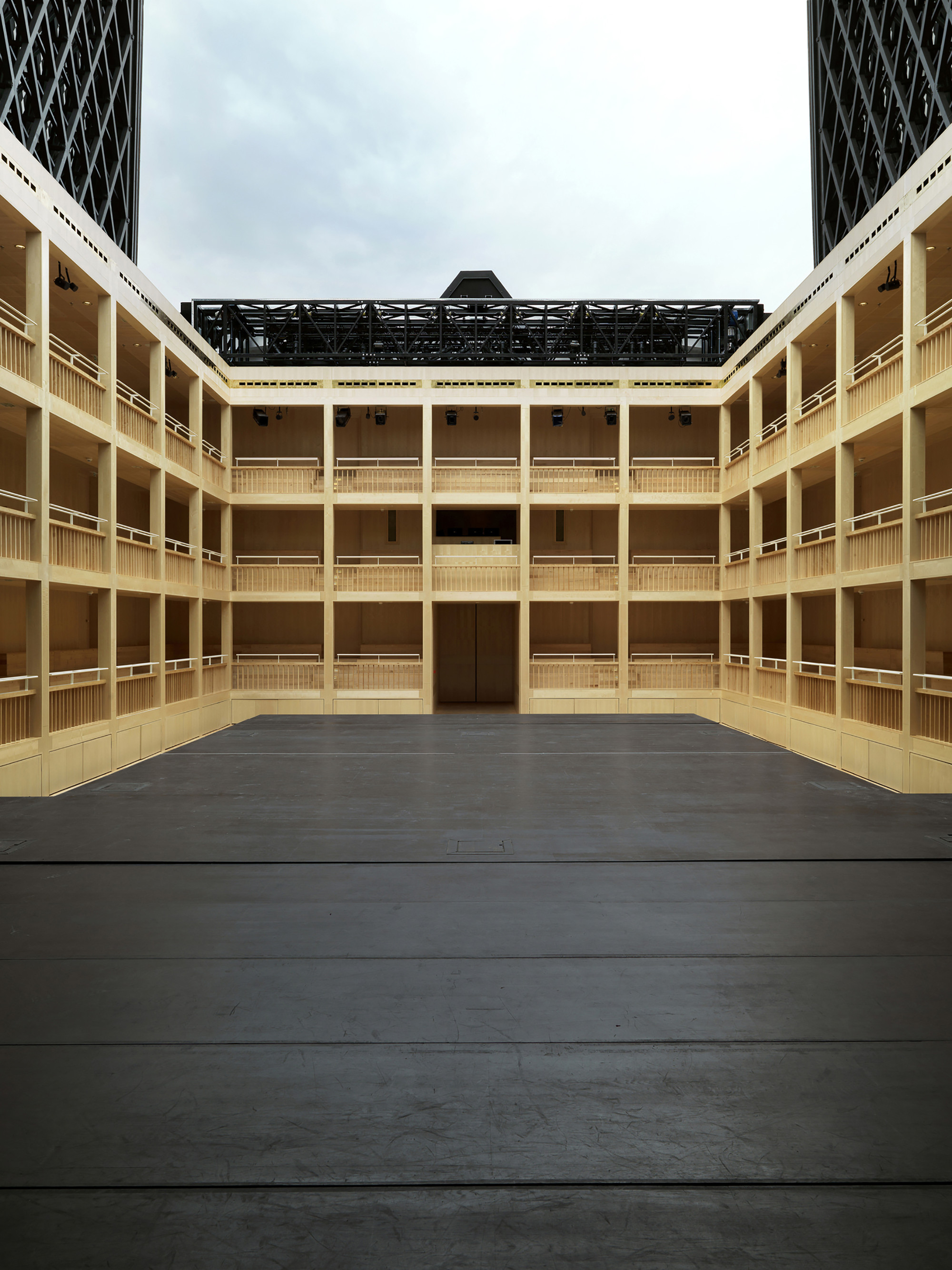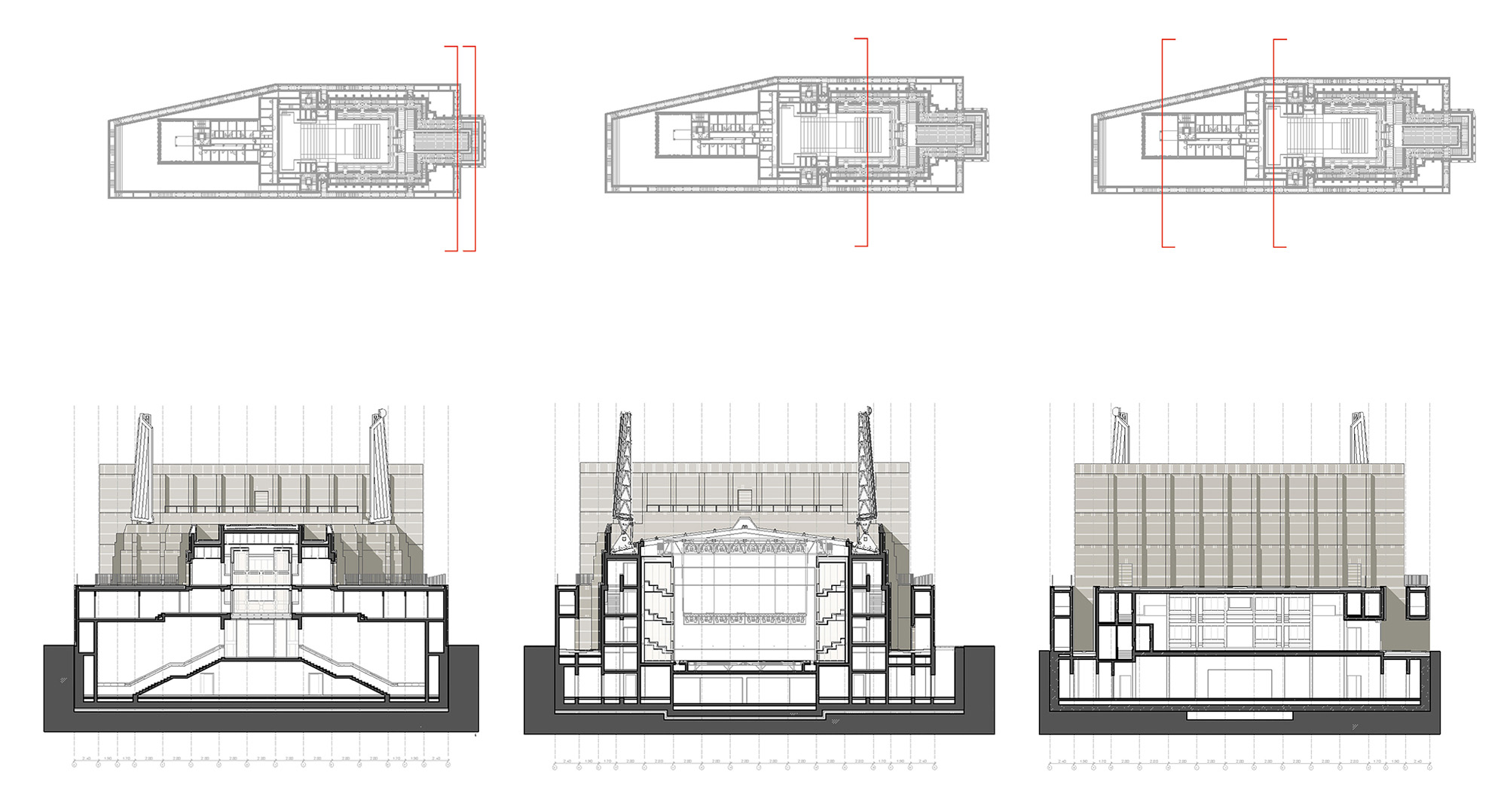 Otvárateľná strecha vychádza z typologických a symbolických potrieb. Hrana otvorenej strechy siaha do výšky 24 metrov, čo završuje vertikálny rast úrovní (6, 12, 18, 24 m). Delenie otváravých krídel strechy prebieha pozdĺž hlavnej kompozičnej osi budovy orientovanej v smere východ - západ. Scénická veža oddeľuje divadelnú časť od administratívnej. Jej centrálna poloha odsúva pešie komunikácie k vonkajším okrajom.