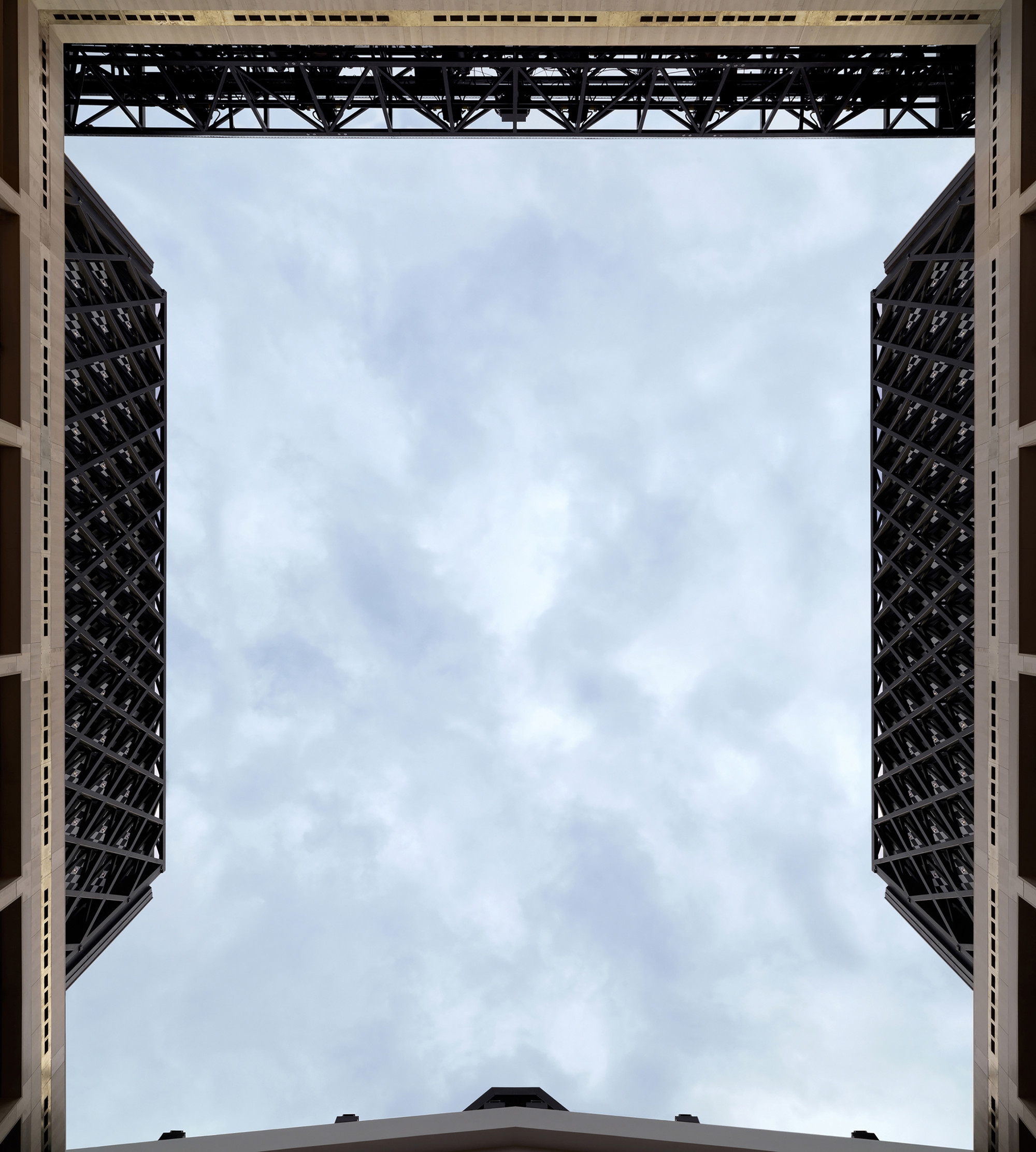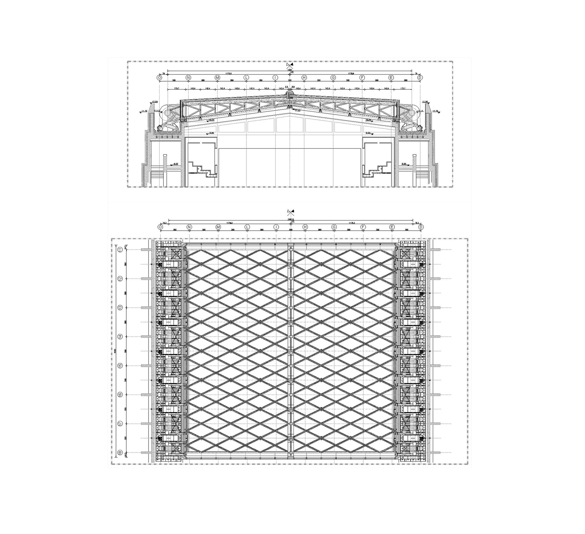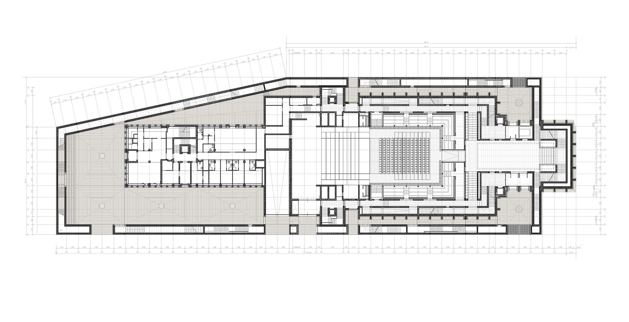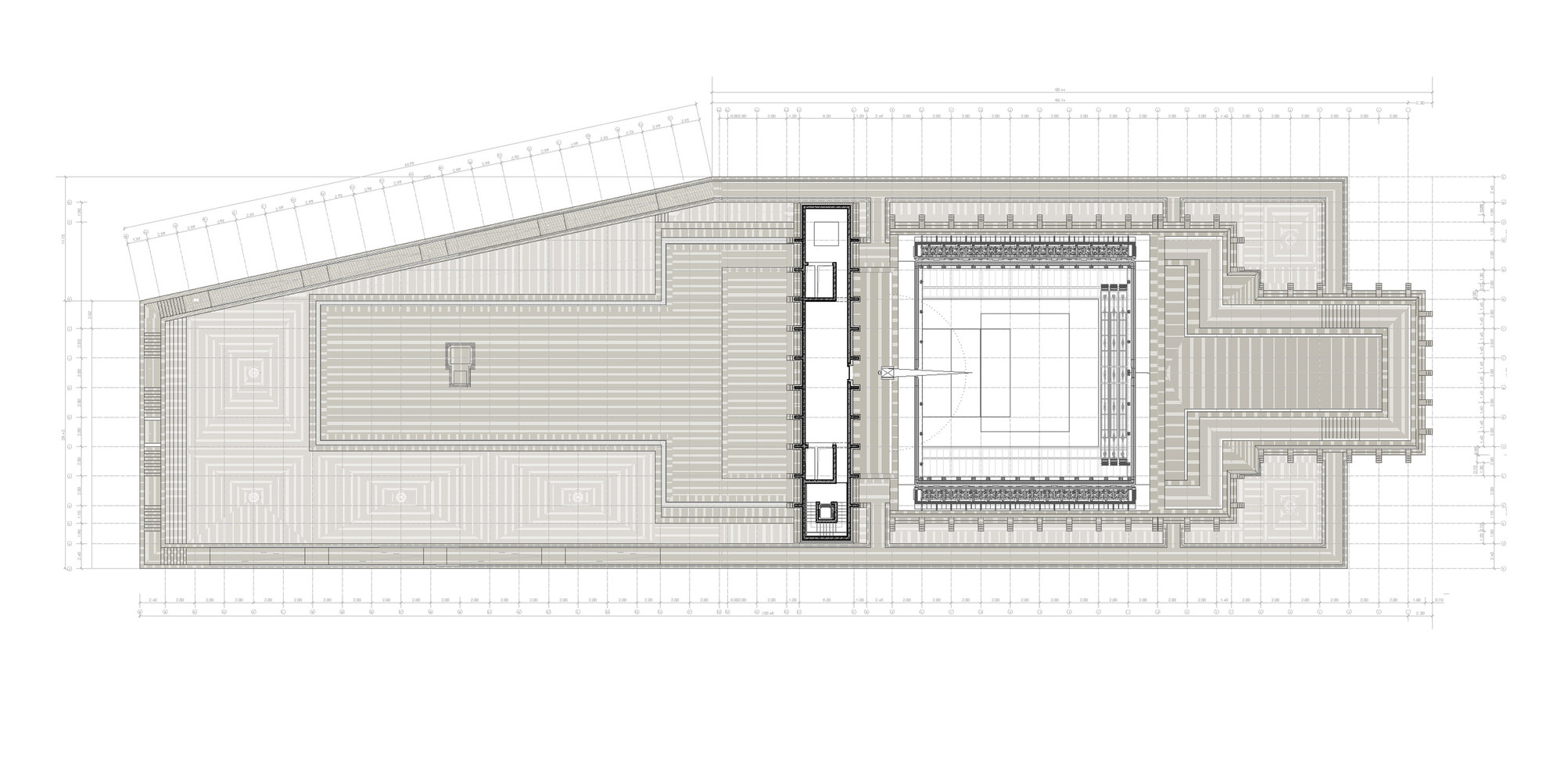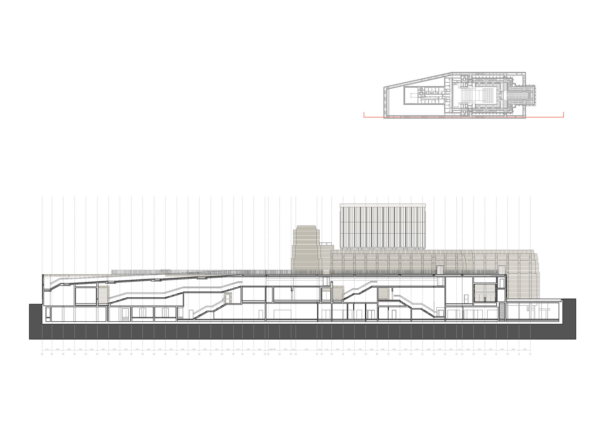 Otvárateľná strecha vychádza z typologických a symbolických potrieb. Hrana otvorenej strechy siaha do výšky 24 metrov, čo završuje vertikálny rast úrovní (6, 12, 18, 24 m). Delenie otváravých krídel strechy prebieha pozdĺž hlavnej kompozičnej osi budovy orientovanej v smere východ - západ. Scénická veža oddeľuje divadelnú časť od administratívnej. Jej centrálna poloha odsúva pešie komunikácie k vonkajším okrajom.