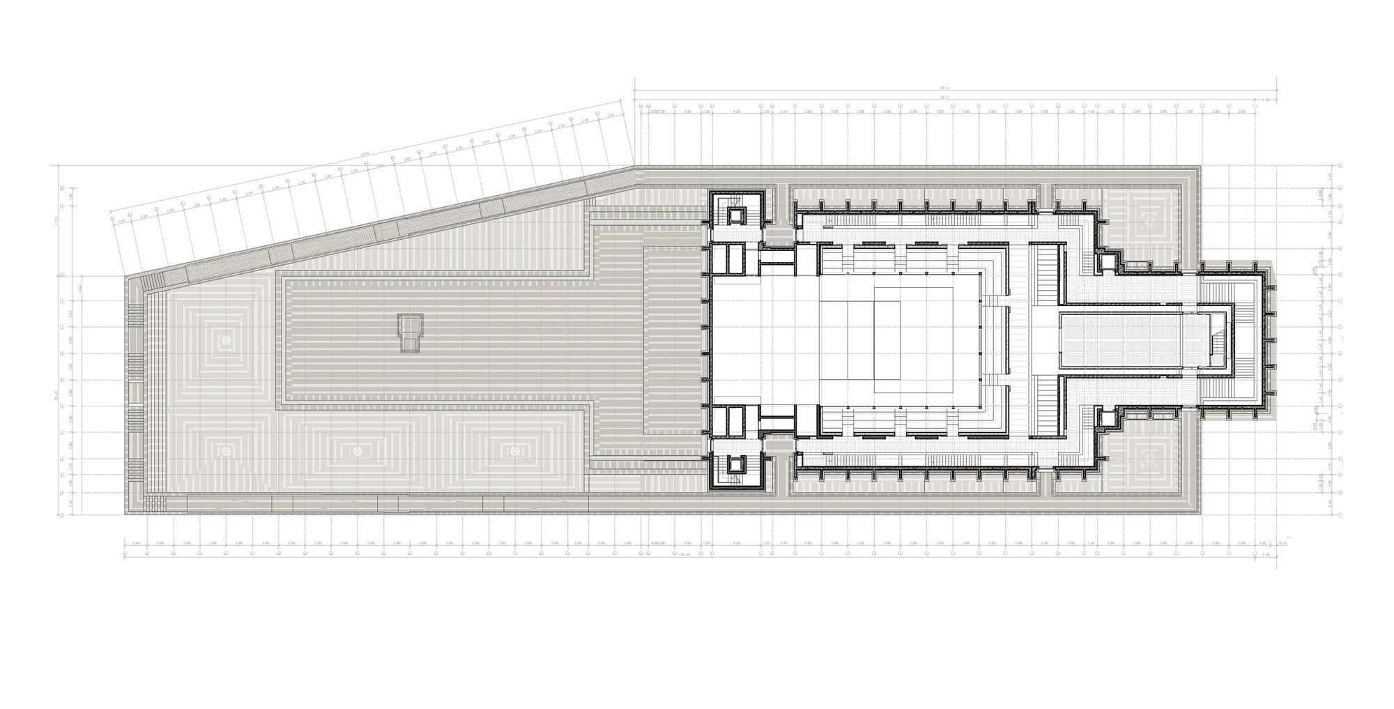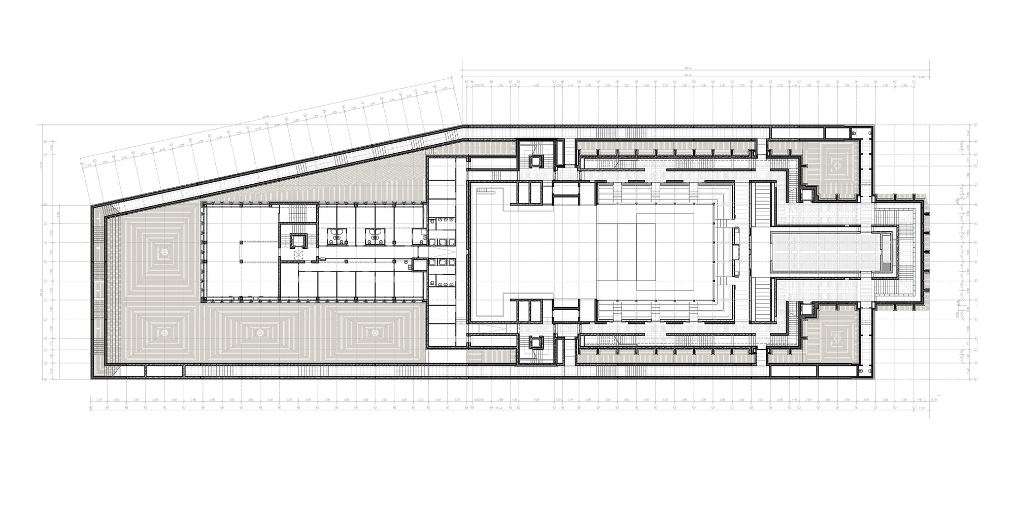 Na obvode sa nachádzajú všetky horizontálne a vertikálne komunikácie pre peších. Táto figurálne autonómna časť je odsadená od vonkajších okrajov práve kvôli vyjadreniu priestorovej hierarchie medzi rôznymi formálnymi systémami.
