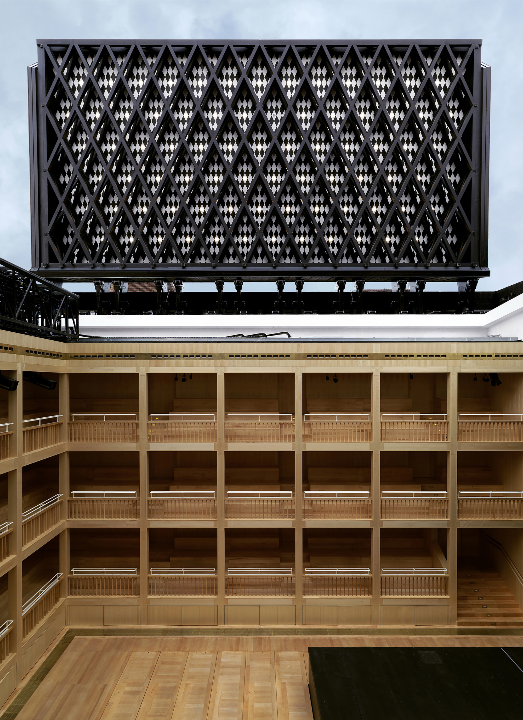 Z vonku je silueta divadla charakterizovaná tromi hlavnými prvkami: masívnou hmotou, murovanými rebrami a otvárateľnou strechou. Hlavnú hmotu tvoria dve veľmi odlišné časti. Prvá patrí alžbetínskemu divadlu a je vysoká 12 metrov. Druhou časťou je 18 metrov vysoká scénická veža. Nachádza sa tu všetka potrebná technológia a slúži tiež ako vyhliadkový bod.