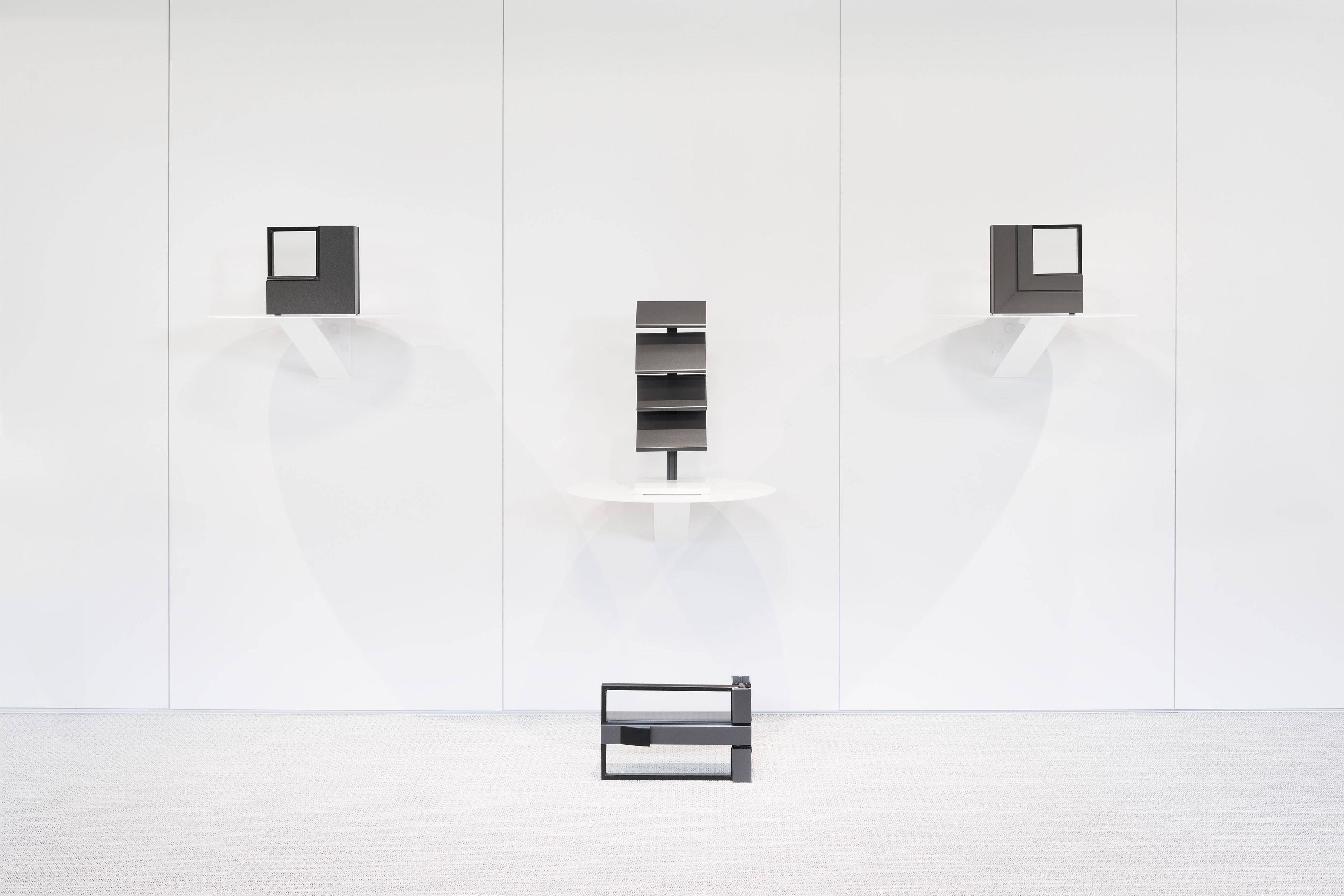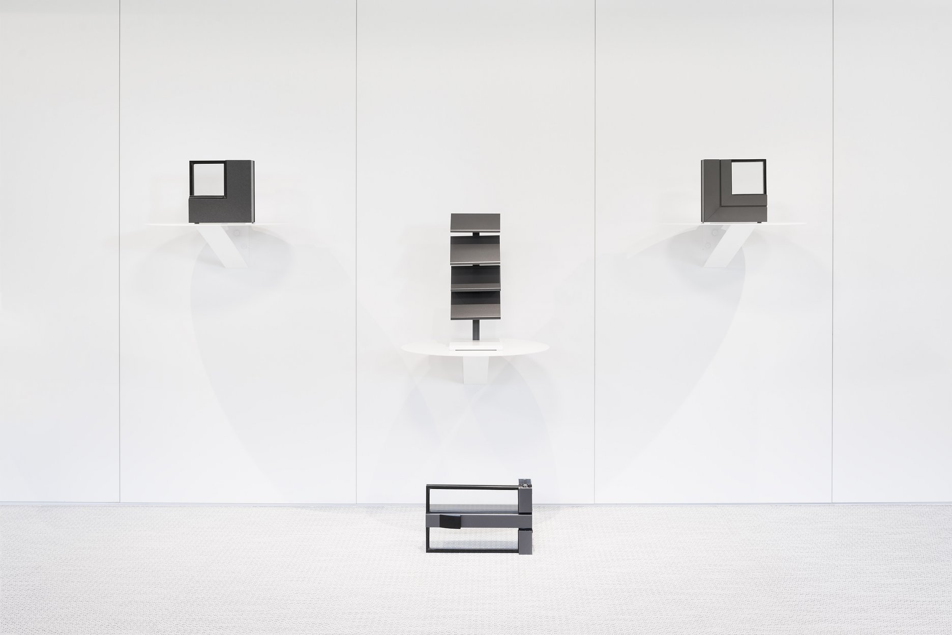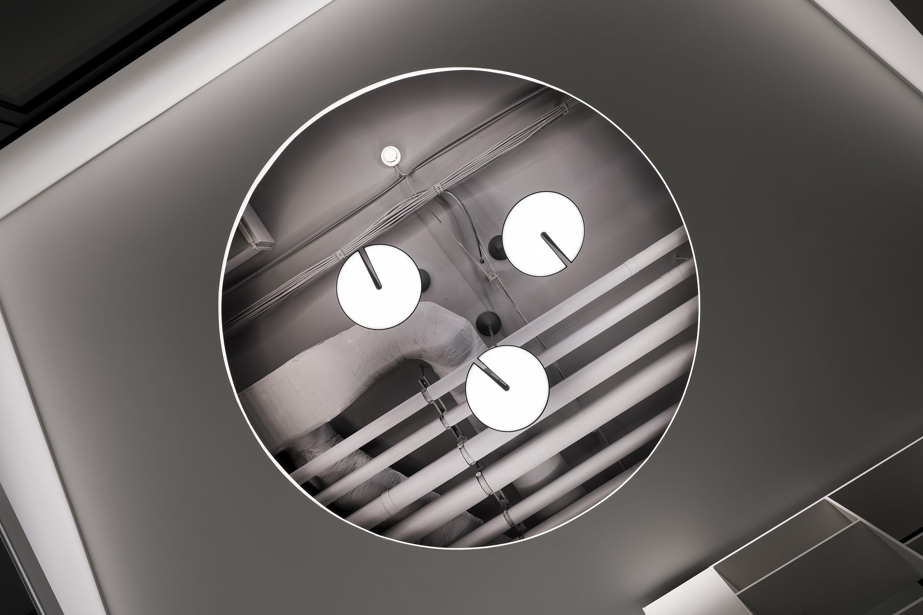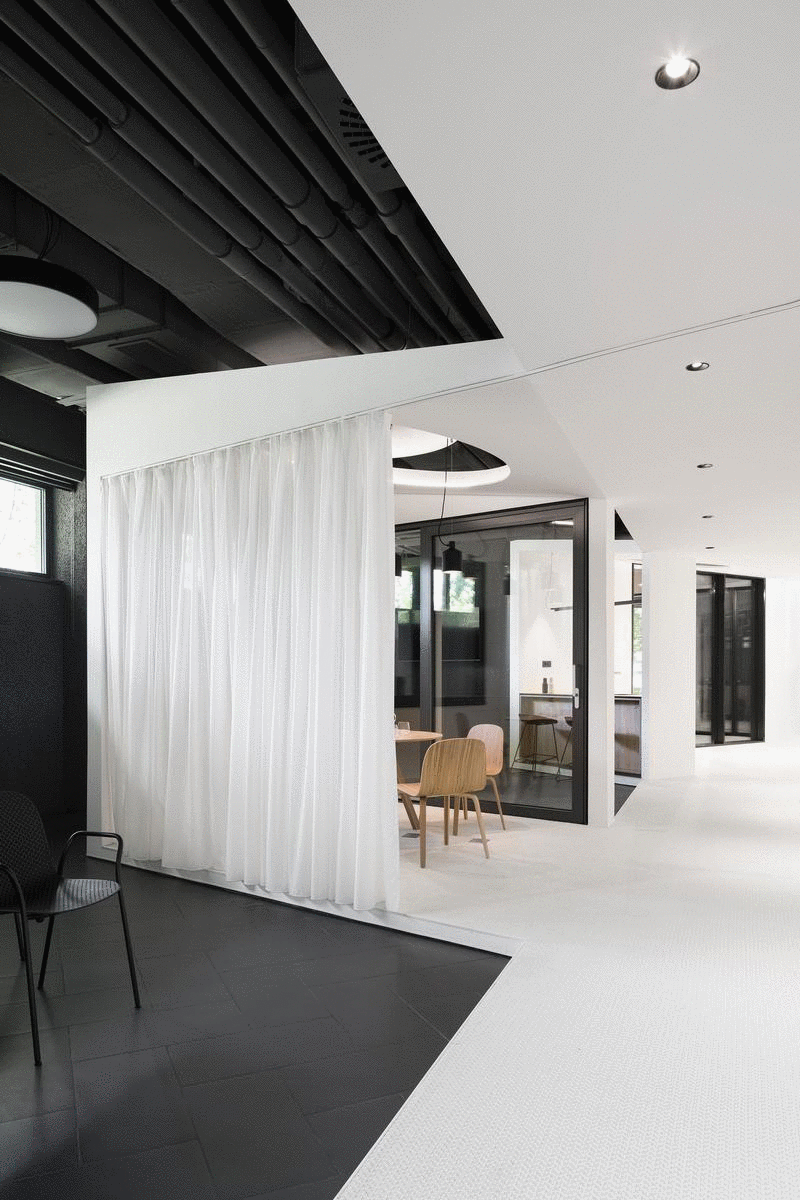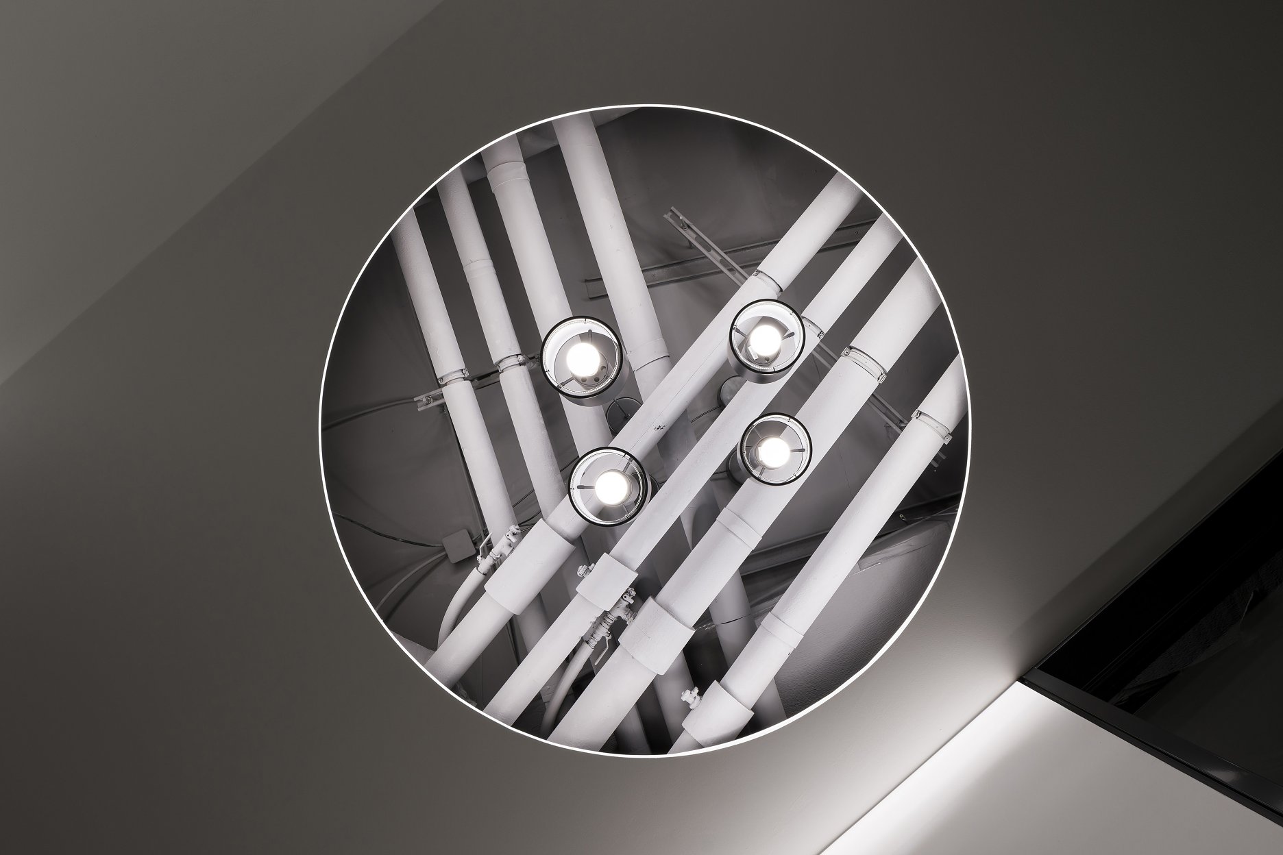 Do stien vloženého bieleho objektu sme zároveň integrovali a odprezentovali esenciálny prvok showroomu - samotné funkčné modely okien Schüco v rôznych veľkostiach a prevedeniach. Návštevník showroomu si môže okná vyskúšať, môže cez ne prechádzať a vnímať ich osadené v reálnom prostredí. Okná však nie sú len vystavené kusy - práve naopak, stali sa funkčnou a estetickou súčasťou ohraničujúcou priestory intímneho posedenia s klientom, malú ostrovnú kuchynku a prednáškové „nádvorie“.
