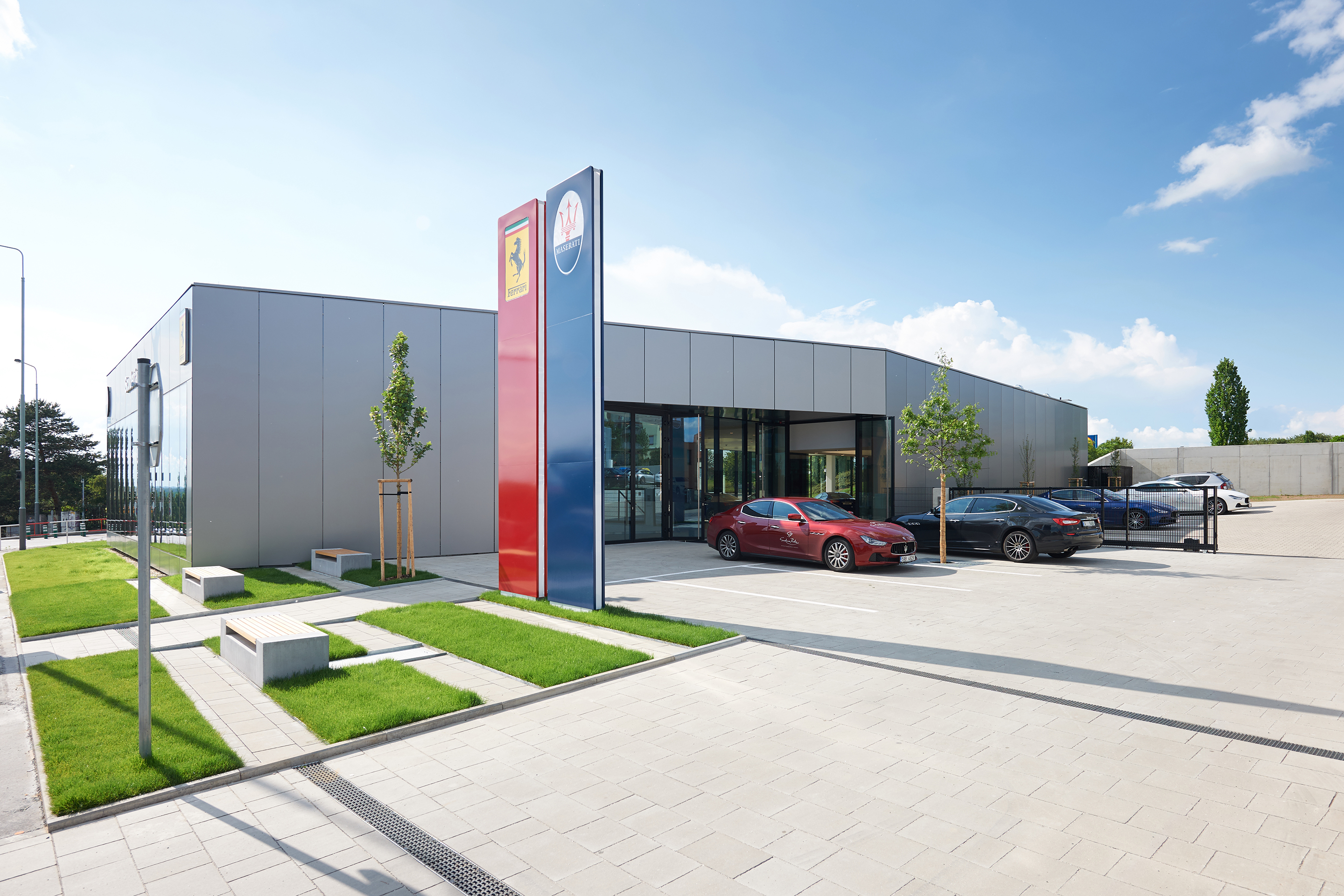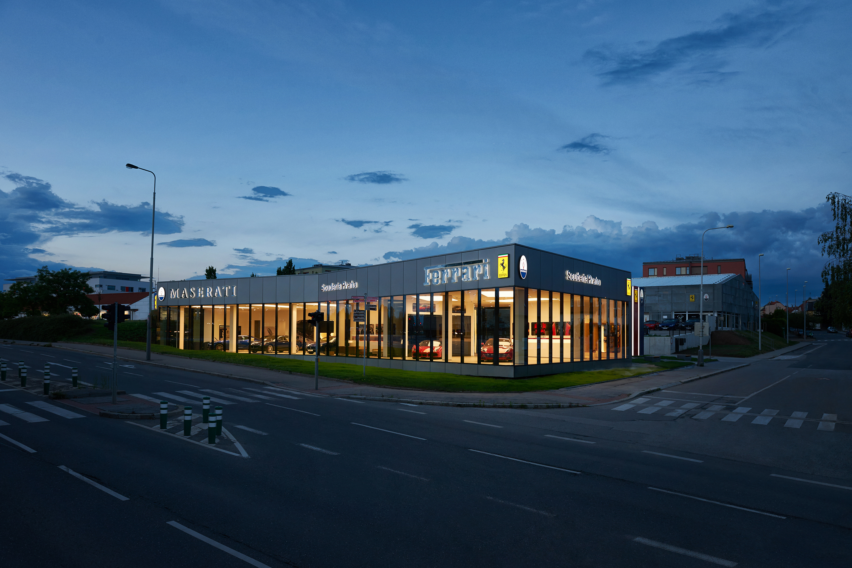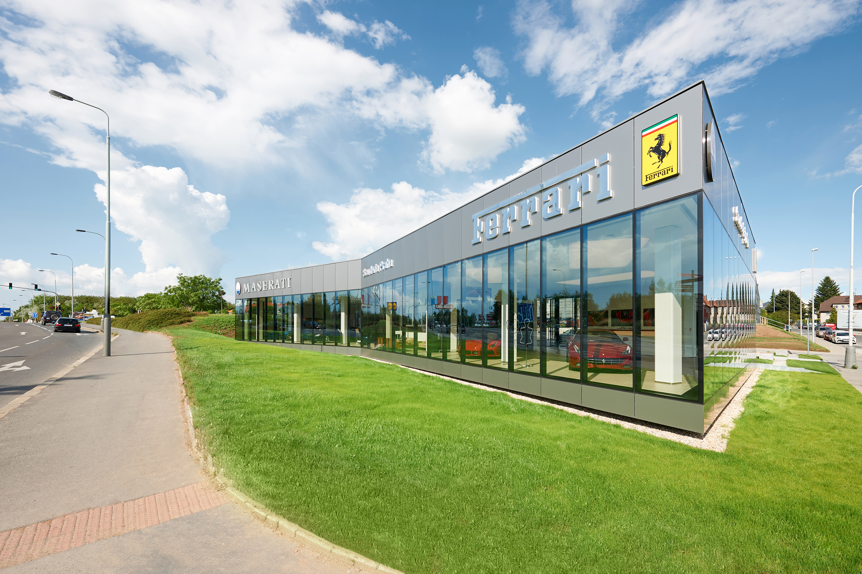 "Lehké vykonzolování jihozápadního rohu objektu dodává budově na lehkosti. Ostré a čisté tvary showroomu jsou inspirovány tvaroslovím automobilů Ferrari osmdesátých let. Vstup do objektu evokuje boční chladící sání legendárního Ferrari Testarossa. Urbanistické tvarování a zalomení objektu do tvaru V potom reaguje na zalomení ulice Slánská. Tímto lehkým natočením je zároveň dosaženo lepší vizibility obou částí bibrandového showroomu," ozrejmujú kocept autori. Nová budova vznikala v napojení na jestvujúci servis. Architekti sú tiež autormi riešenia exteriérov a prevádzky v areáli.