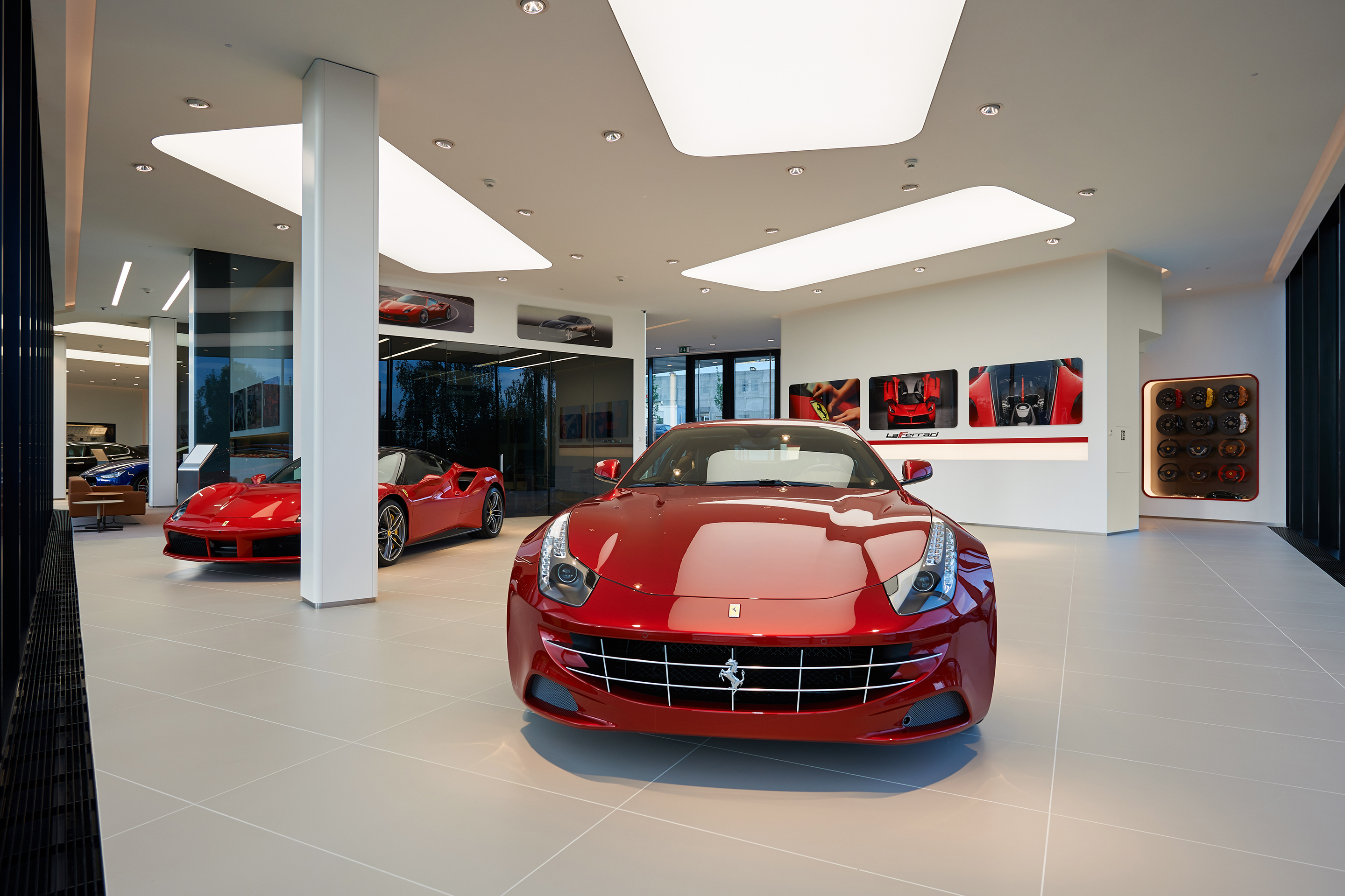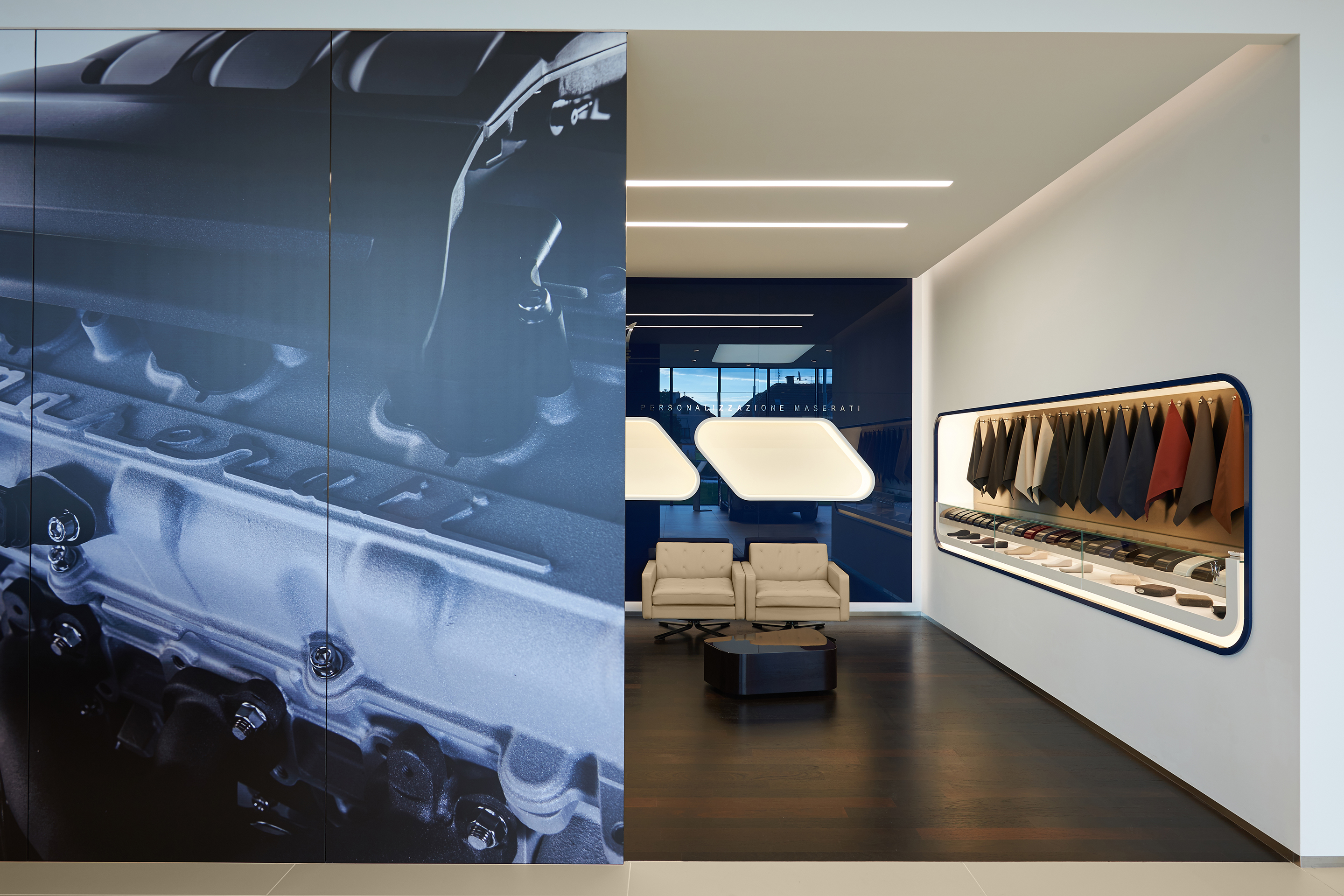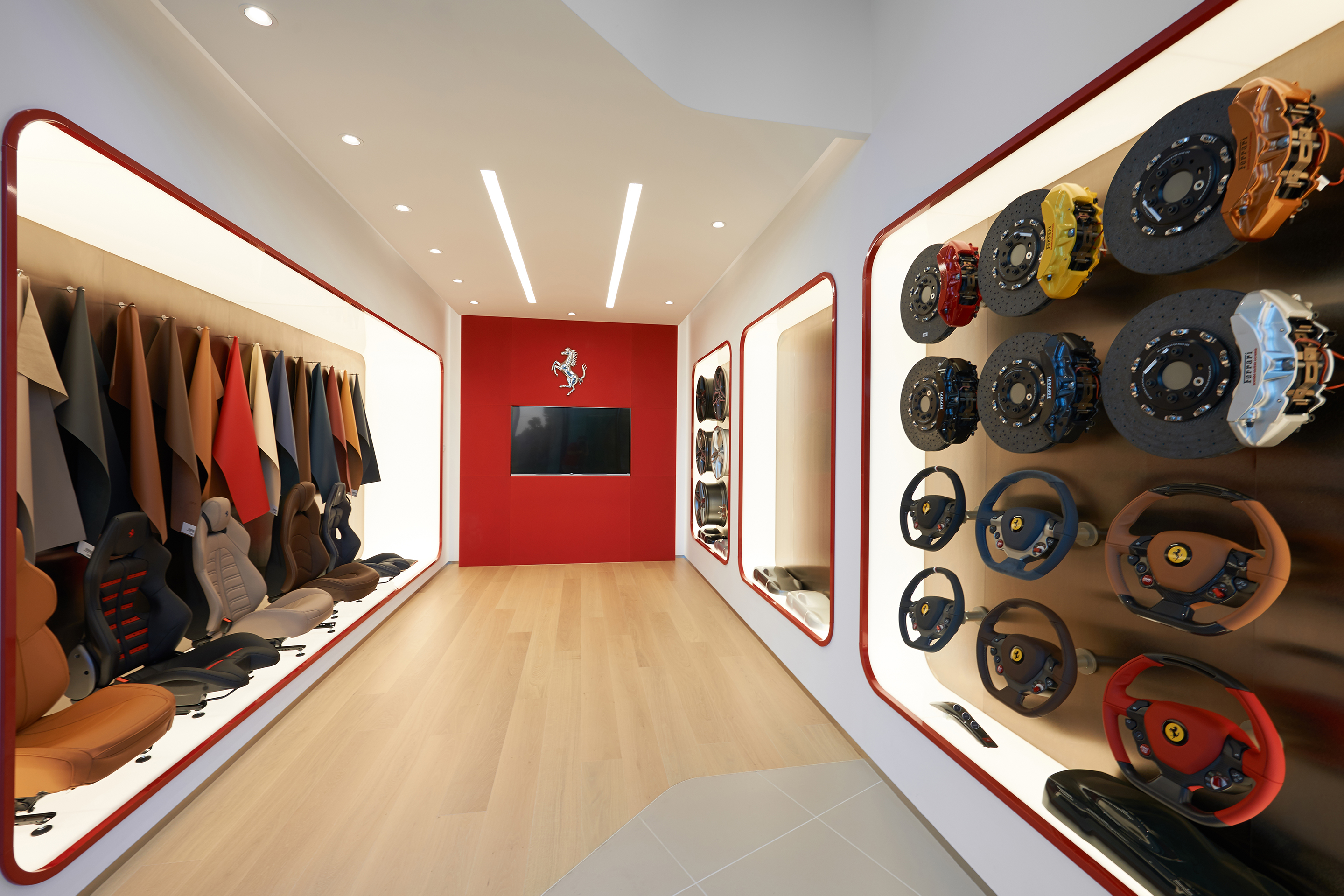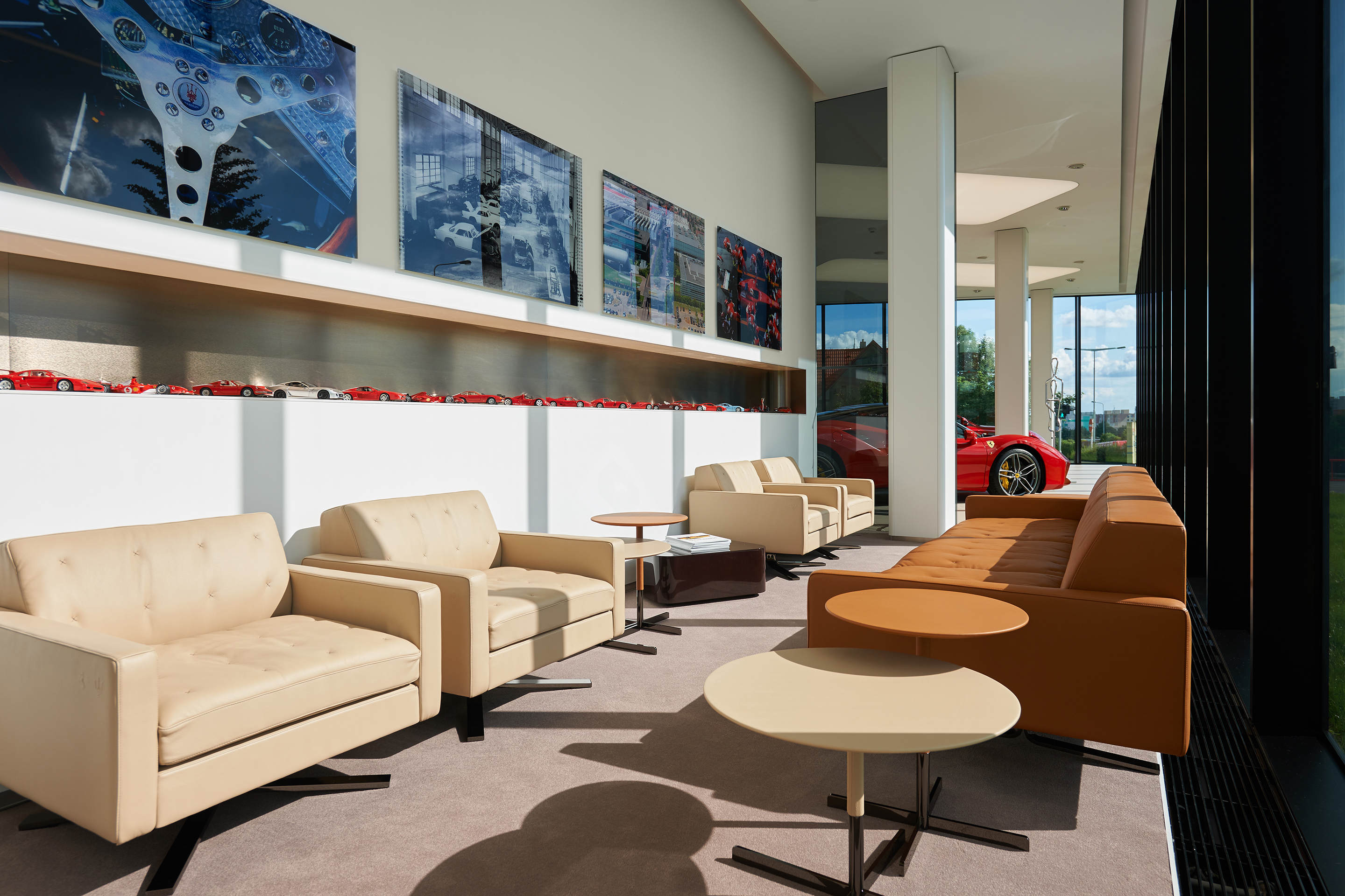 Interiér odráža renomé značiek Ferrari a Maserati. Jedná sa čisté a línie s precíznym detailom. Automobily sú v interiéri vystavené ako v galérii. Zhora sú autá nasvietená cez barrisolové blany. Prvky vystavované v konfiguračných miestnostiach sú umiestňované do svetelných nik, ktoré sú potiahnuté kožou.