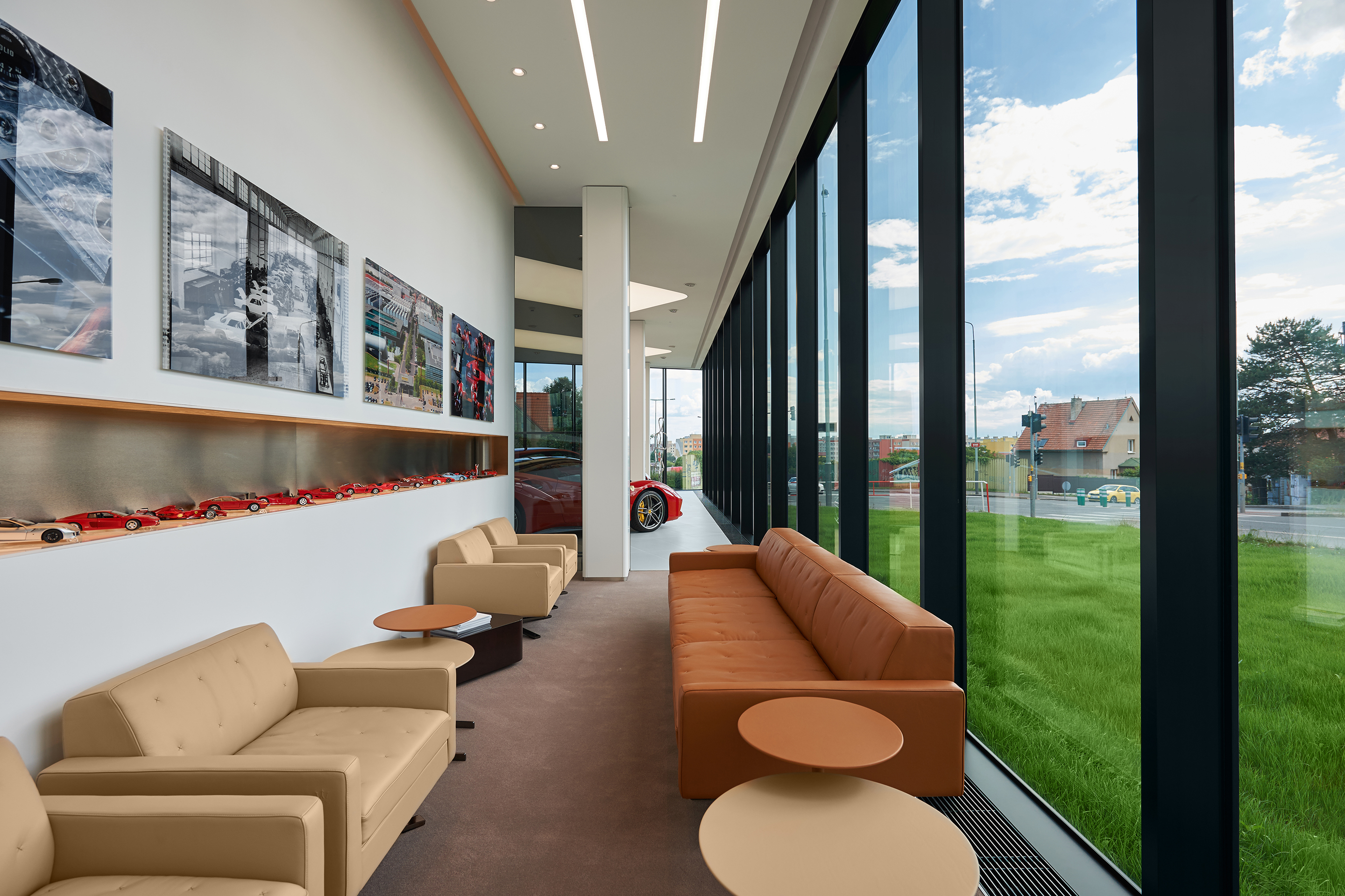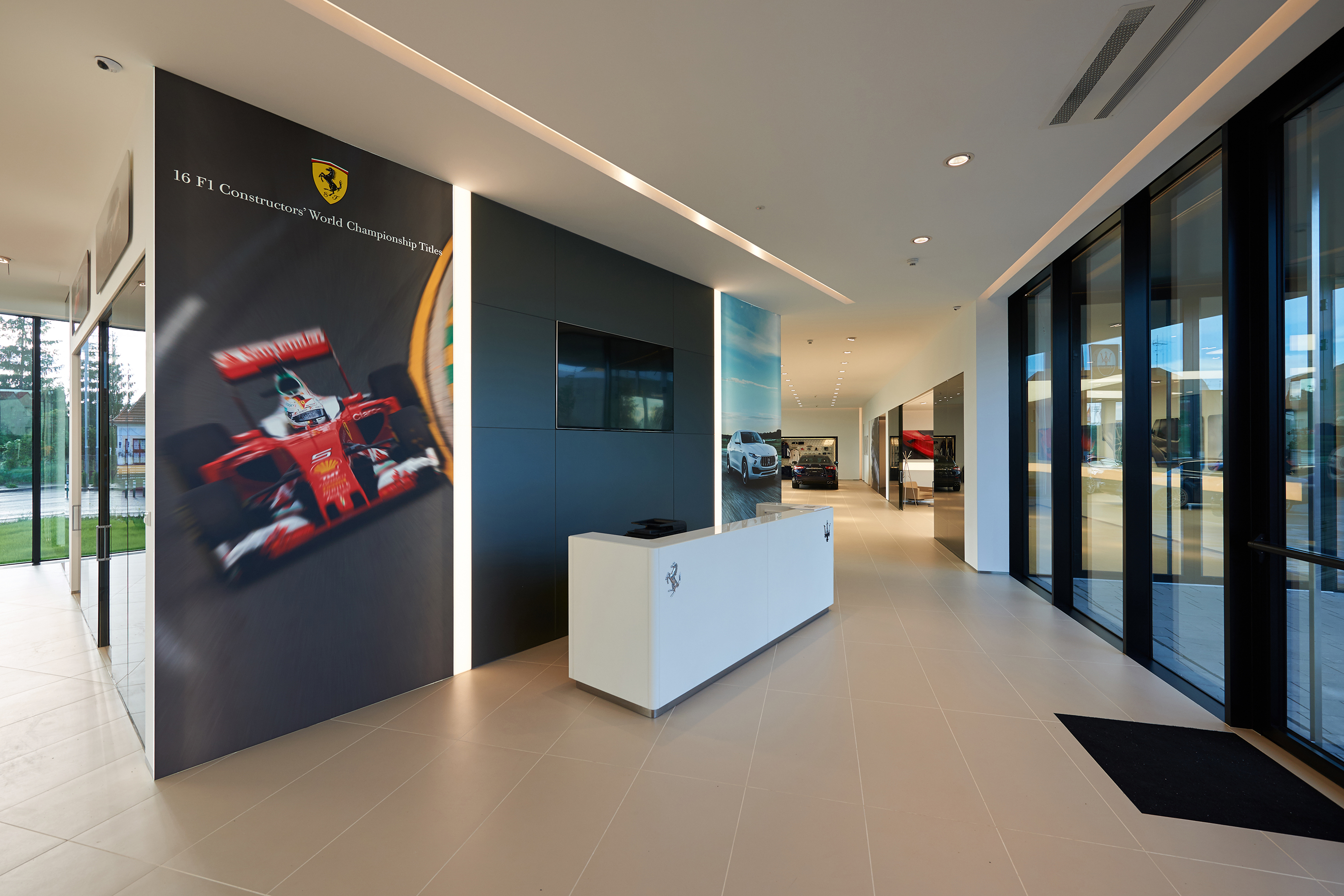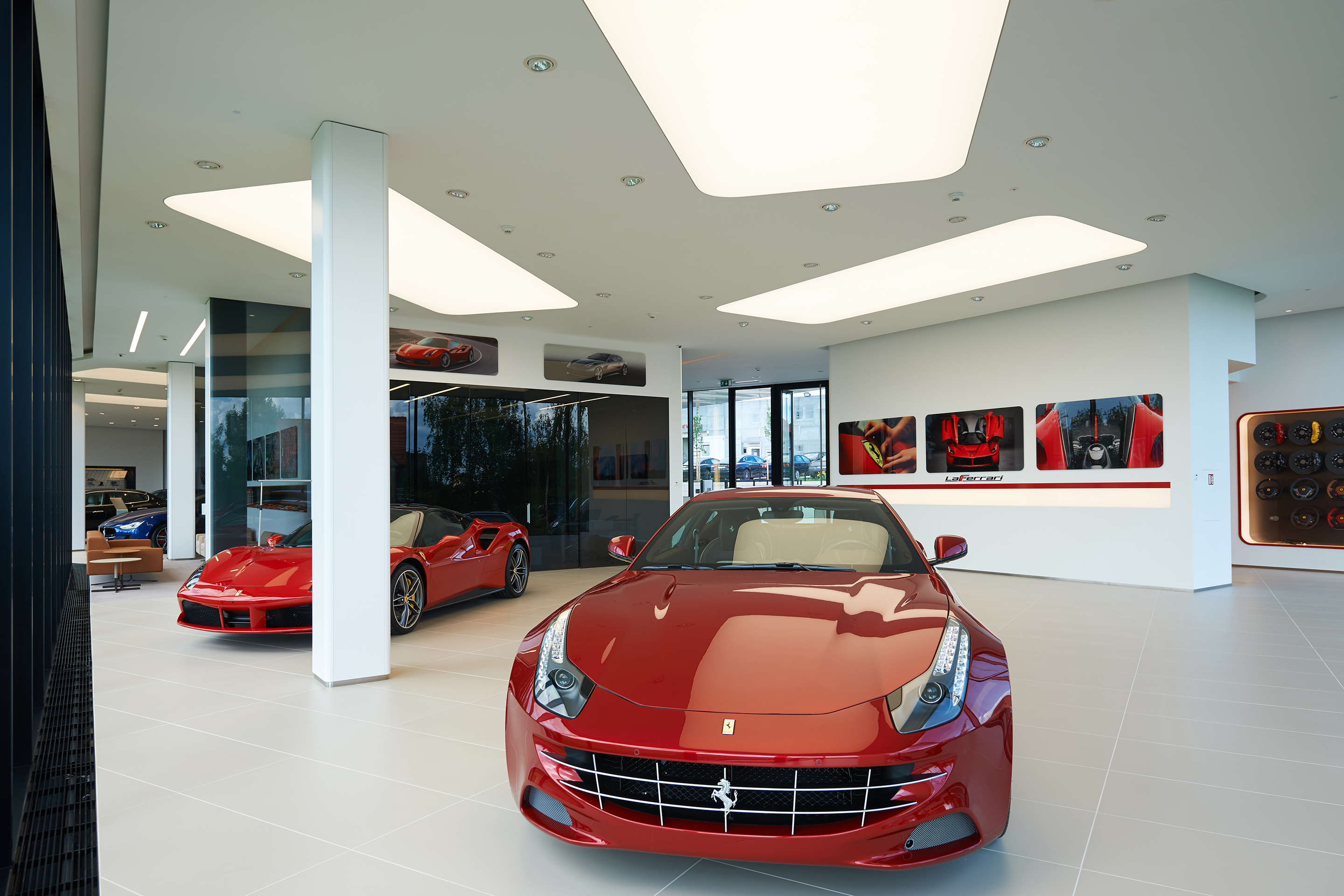 Interiér odráža renomé značiek Ferrari a Maserati. Jedná sa čisté a línie s precíznym detailom. Automobily sú v interiéri vystavené ako v galérii. Zhora sú autá nasvietená cez barrisolové blany. Prvky vystavované v konfiguračných miestnostiach sú umiestňované do svetelných nik, ktoré sú potiahnuté kožou.