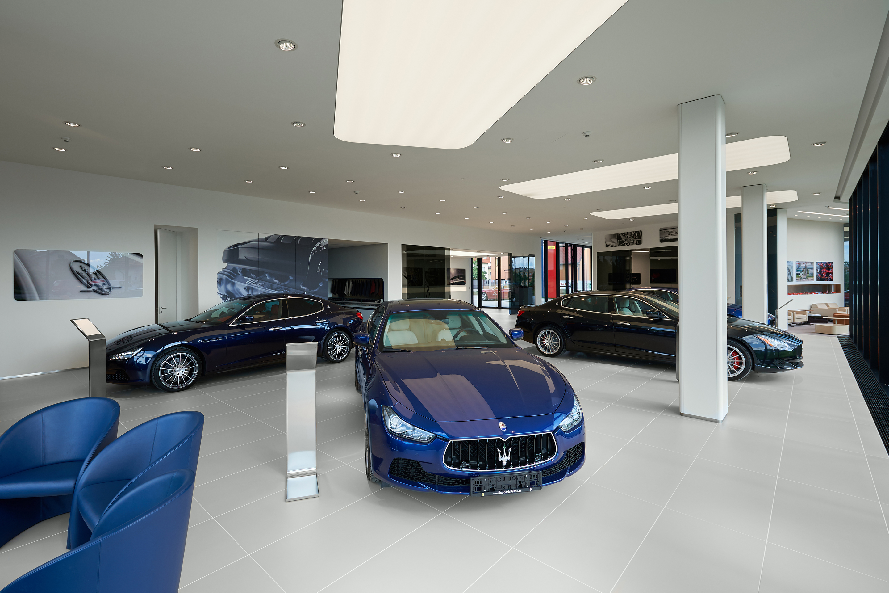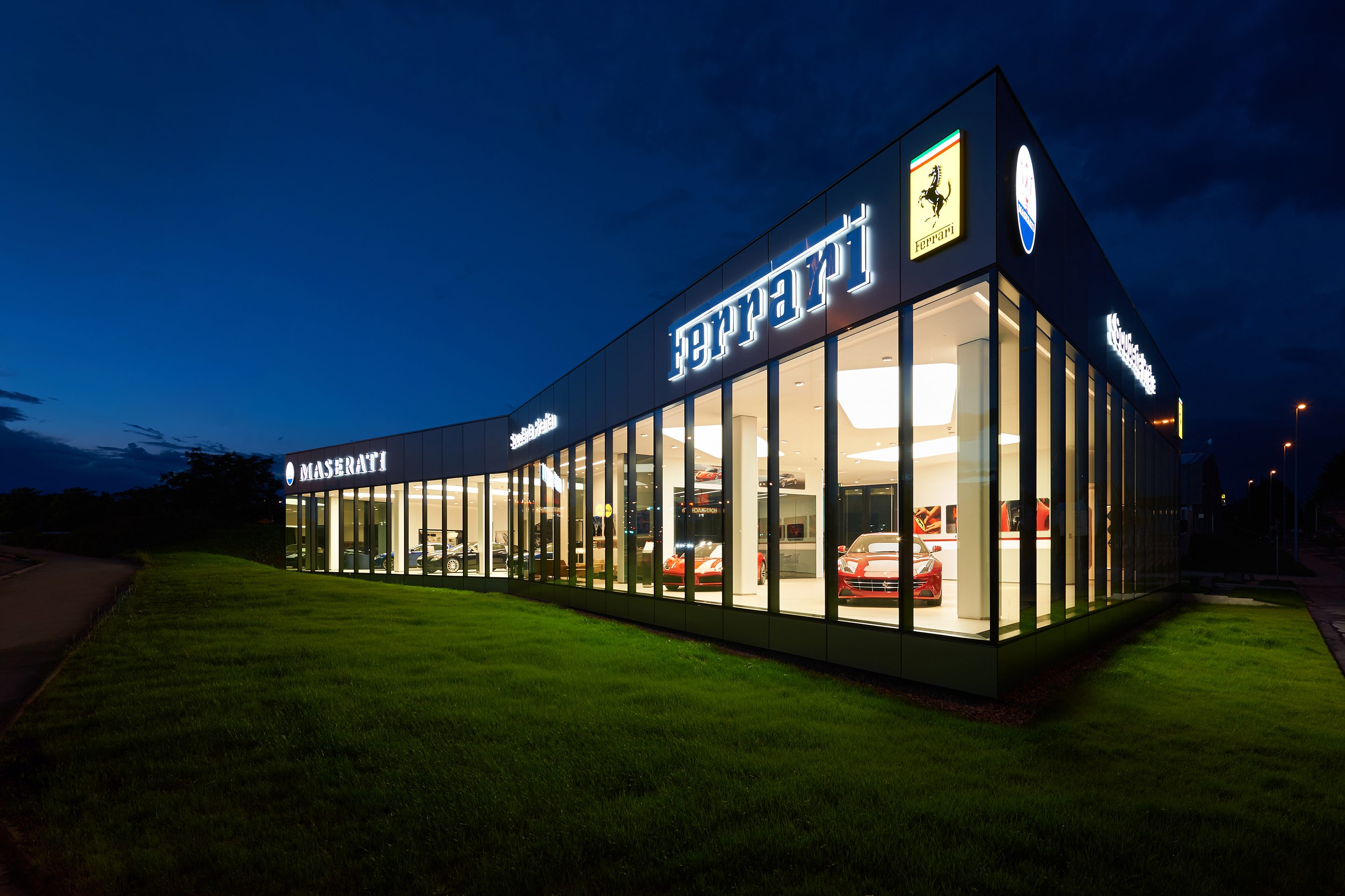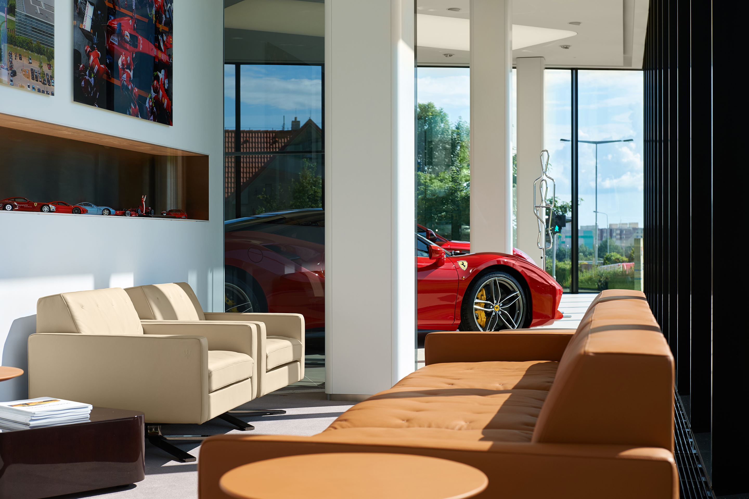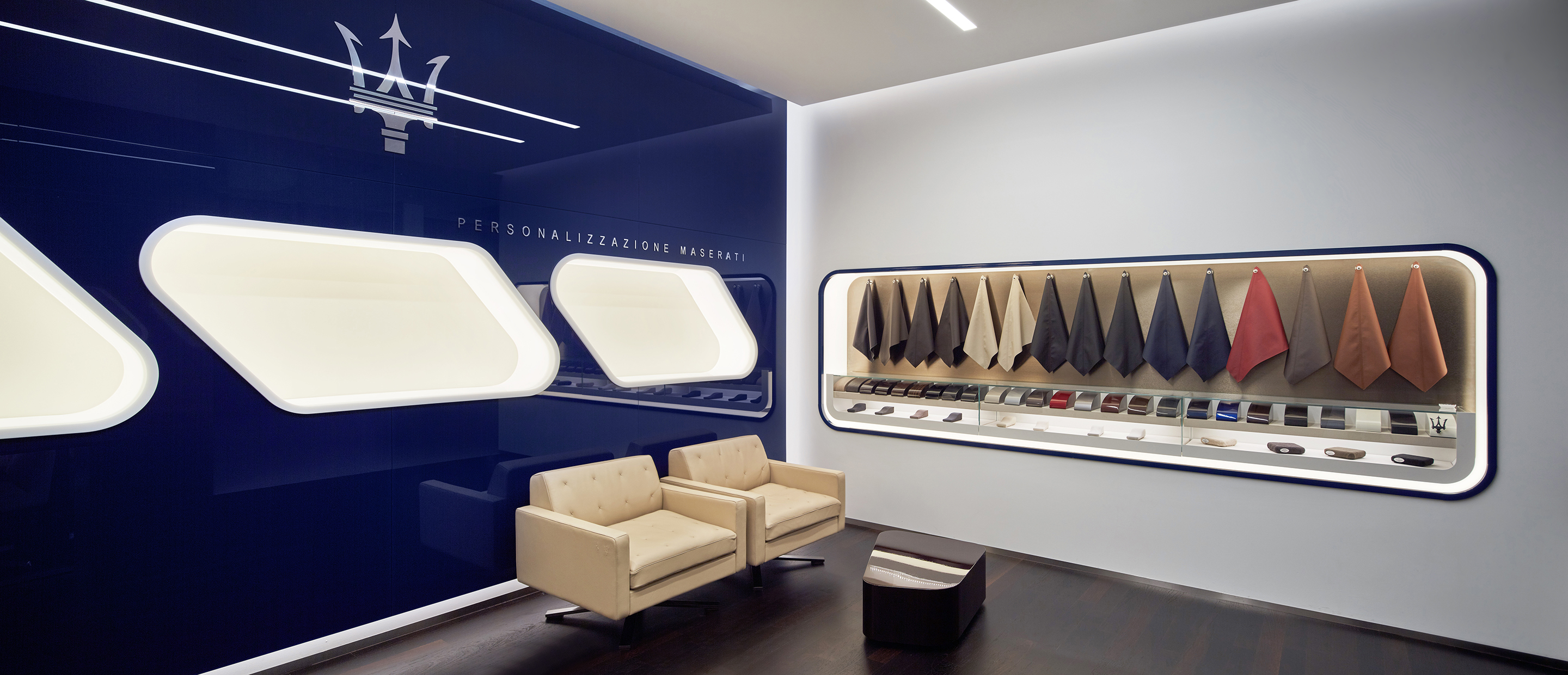 Interiér odráža renomé značiek Ferrari a Maserati. Jedná sa čisté a línie s precíznym detailom. Automobily sú v interiéri vystavené ako v galérii. Zhora sú autá nasvietená cez barrisolové blany. Prvky vystavované v konfiguračných miestnostiach sú umiestňované do svetelných nik, ktoré sú potiahnuté kožou.