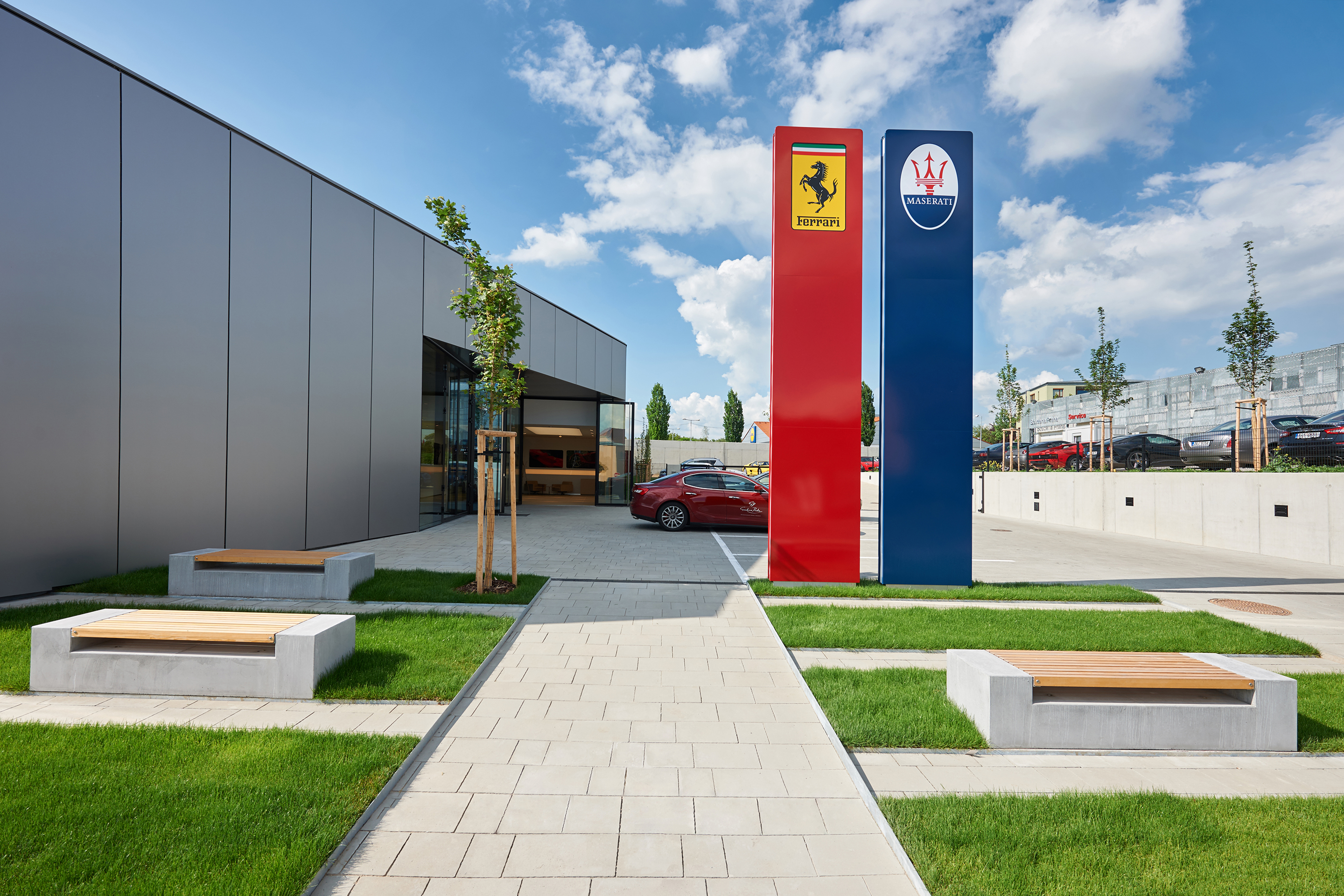 Architekti riešili okrem samotného showroomu aj prevádzku celého areálu. Medzi novým showroomom a servisom vznikol uzavretý dvor. Nájazd do areálu je o 3 metre nižšie, než vjazd do servisu. Architekti prekonali tento výškový rozdiel pomocou rôzne tvarovaných šikmých plôch-rámp, na ktorých sa dá zároveň parkovať. Tieto rampy sú ohraničené opornými múrmi z pohľadového betónu, v ktorých je zároveň zabudované osvetlenie. Vjazd do areálu je vydláždený reprezentatívnou veľkoformátovou dlažbou. Vďaka 4 metre vysokým bezprahovým vstupným dverám exteriér plynule prechádza do interiéru.