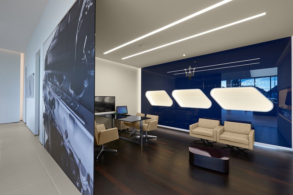 Z hľadiska corporate identity Ferrari a Maserati boli predpísané druhy povrchov, materiálov a riešení jednotlivých detailov interiéru. Ale aj tu, ako napríklad u veľkoformátovej dlažby bolo na výber z troch predpísaných typov. Korporátne požiadavky tiež napríklad určujú koľko má byť v jednotlivých miestnostiach použitých obrazov, polepov či podobných doplnkov.