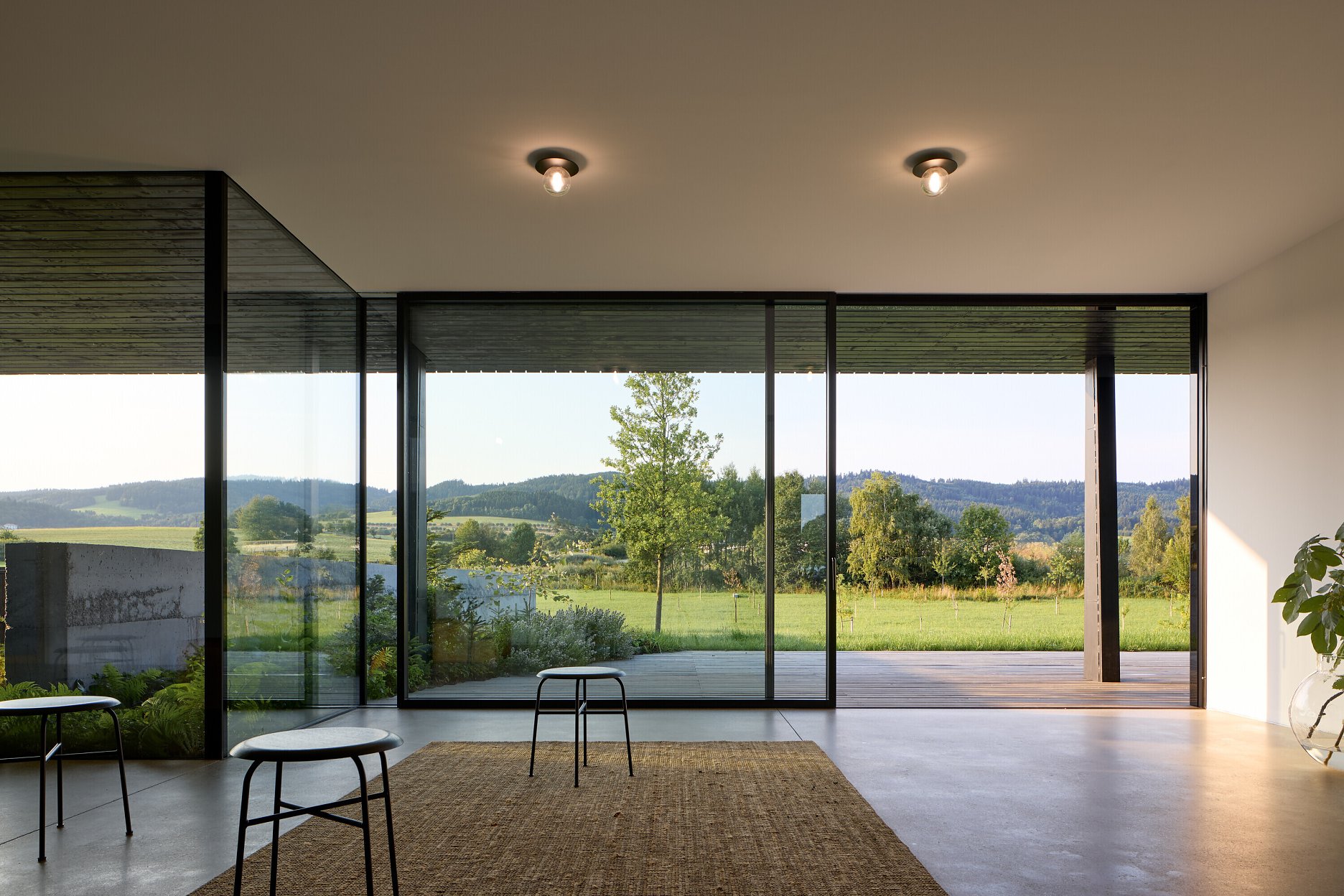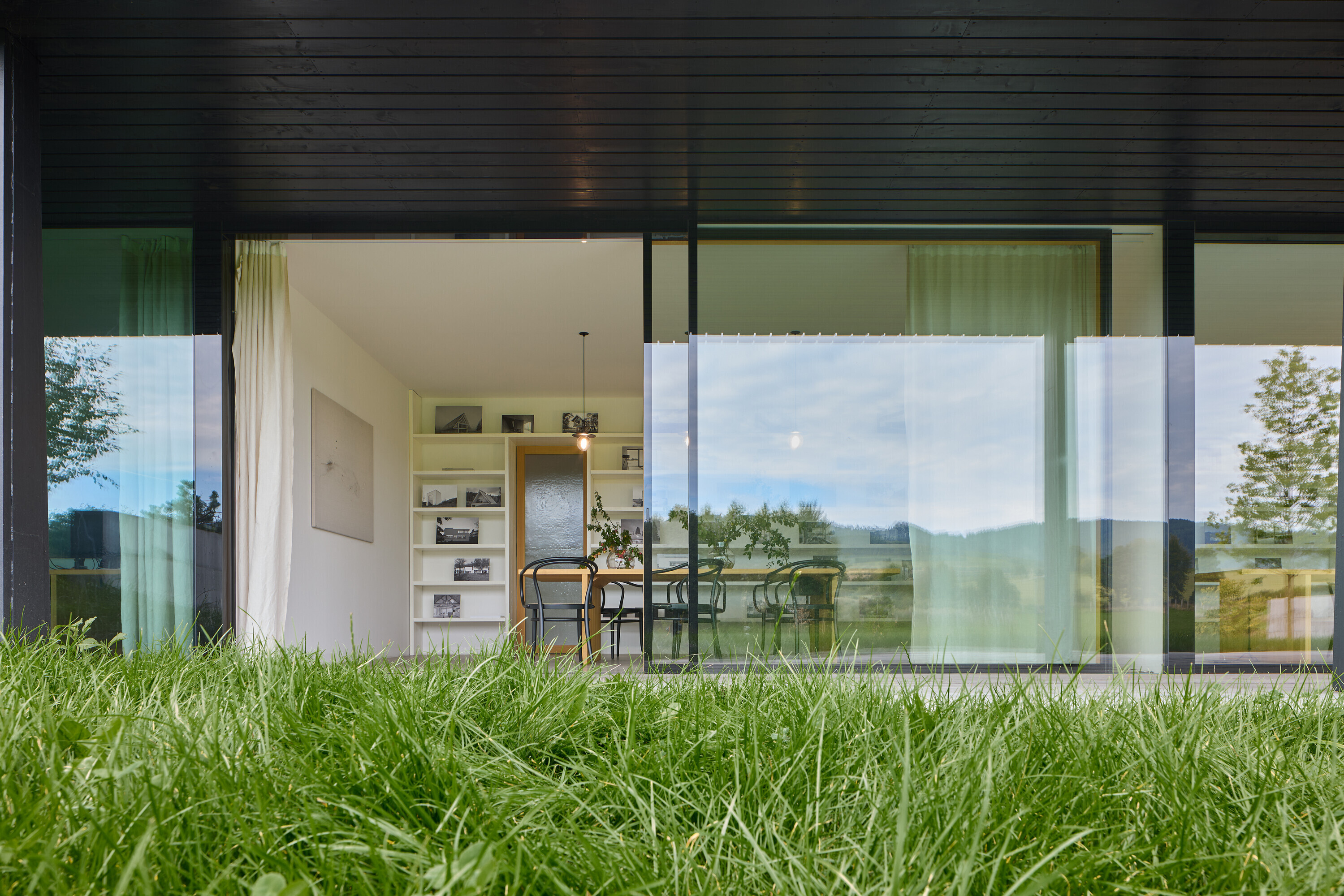 Stoly, police, kuchyňa boli vyrobené vo vlastnej dielni, presne na mieru projektu. Dizajn nábytku nepúta pozornosť, dekorácie takmer chýbajú. Priestor napĺňajú najmä všadeprítomné výhľady do krajiny. Dôležité sú štruktúry, svetlo, proporcie, prechody medzi otvoreným a uzavretým.