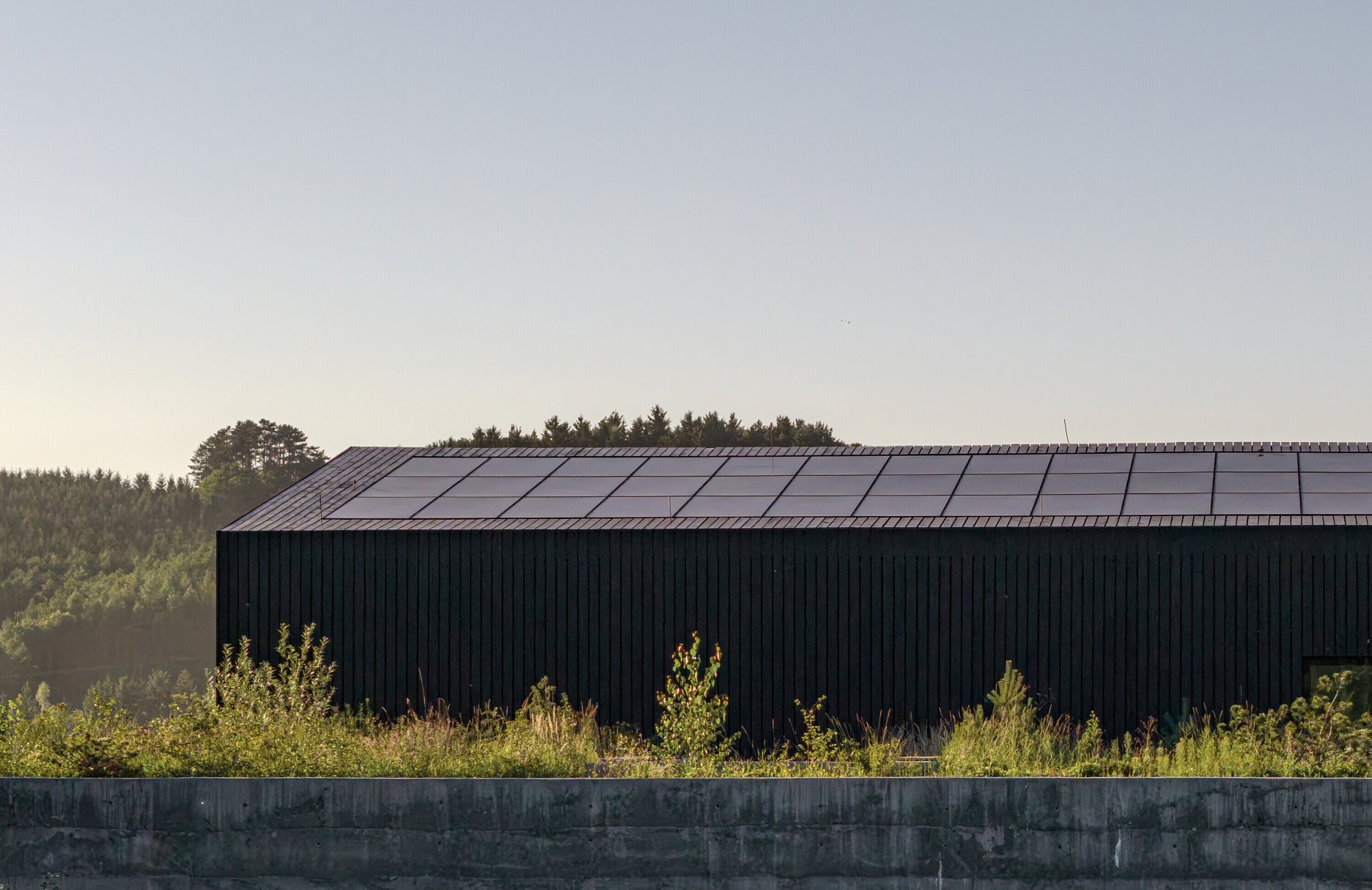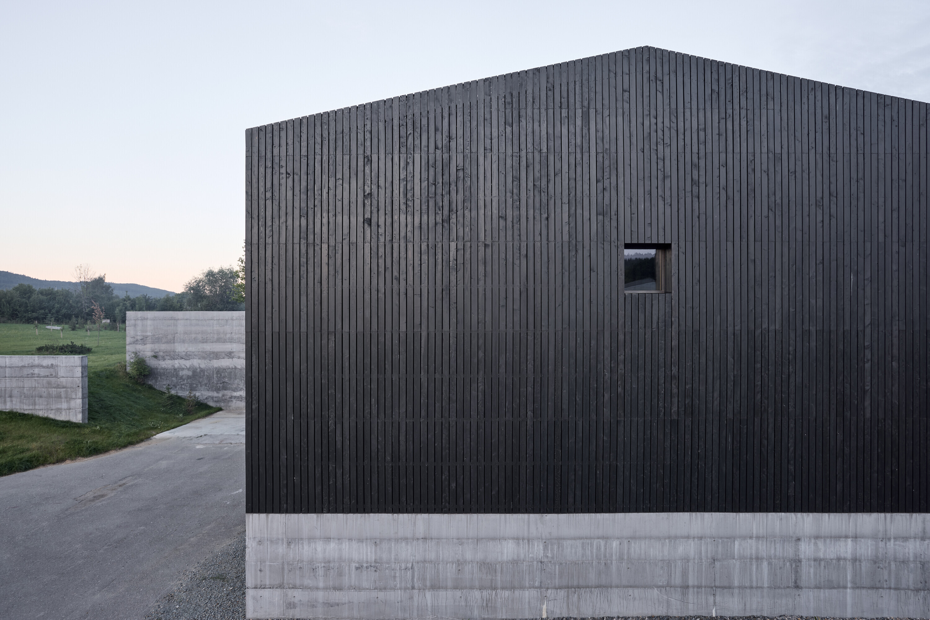 Architektonická kompozícia stavia na prieniku dvoch objemov - pôvodnej haly s tradičným tvaroslovím so sedlovou strechou a novým betónovým blokom, ktorý sa otvára smerom do krajiny. Tá “privádza” lúku k domu a vychádza sa na ňu priamo z kancelárií na poschodí. Pôvodne bol dom cestou aj plotom oddelený od lúky. Stenami uzavretý do seba.