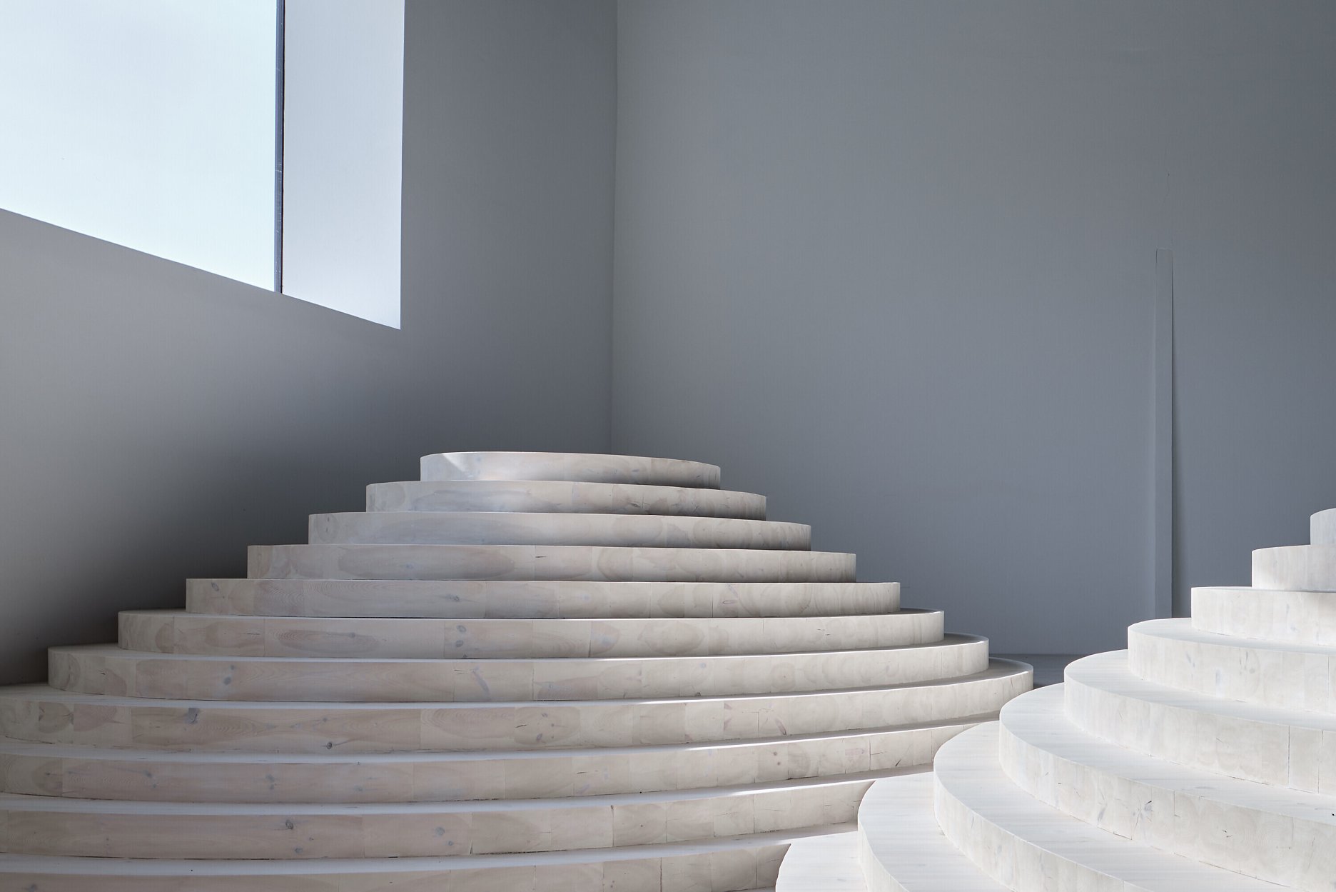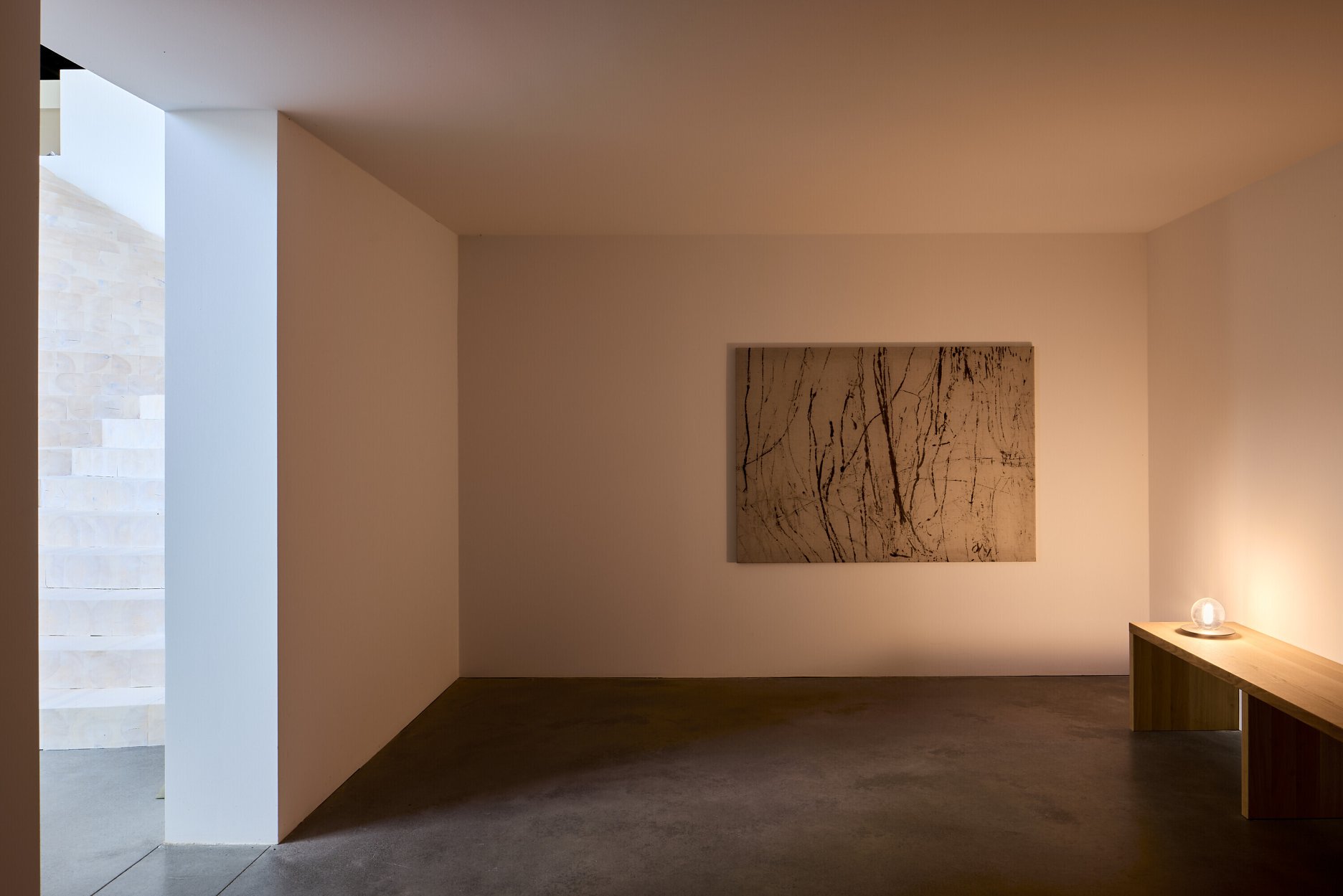 Za nízkym a tmavým zádverím vstupu sa otvára priestor s rozmermi 12 × 15 a výškou 12 metrov. Doň sa premieta najväčšie okno. Objekt na pomedzí sochy a schodiska tu navrhol Maxim Velčovský.