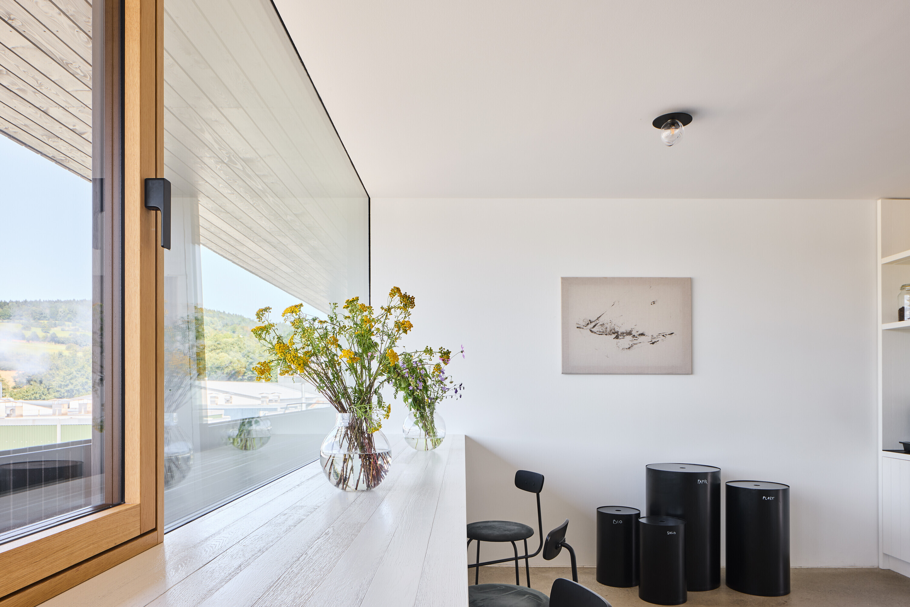 Do interiéru vstupujú tri umelecko-dizajnérske intervencie, ktoré ďalej rozvíjajú vzťah prírody a domu. Vznikli z debát o celkovej atmosfére a jej rozvinutí.