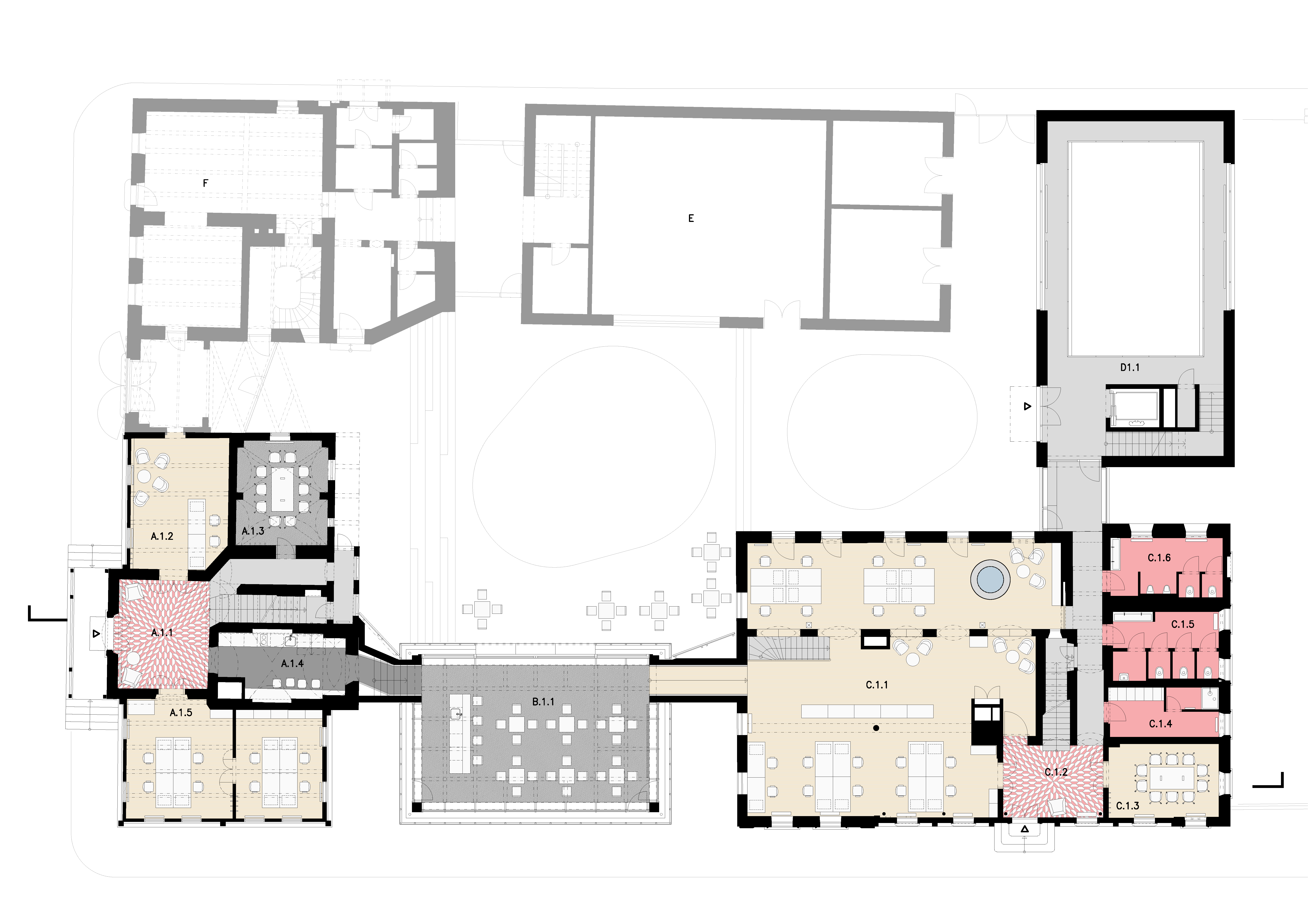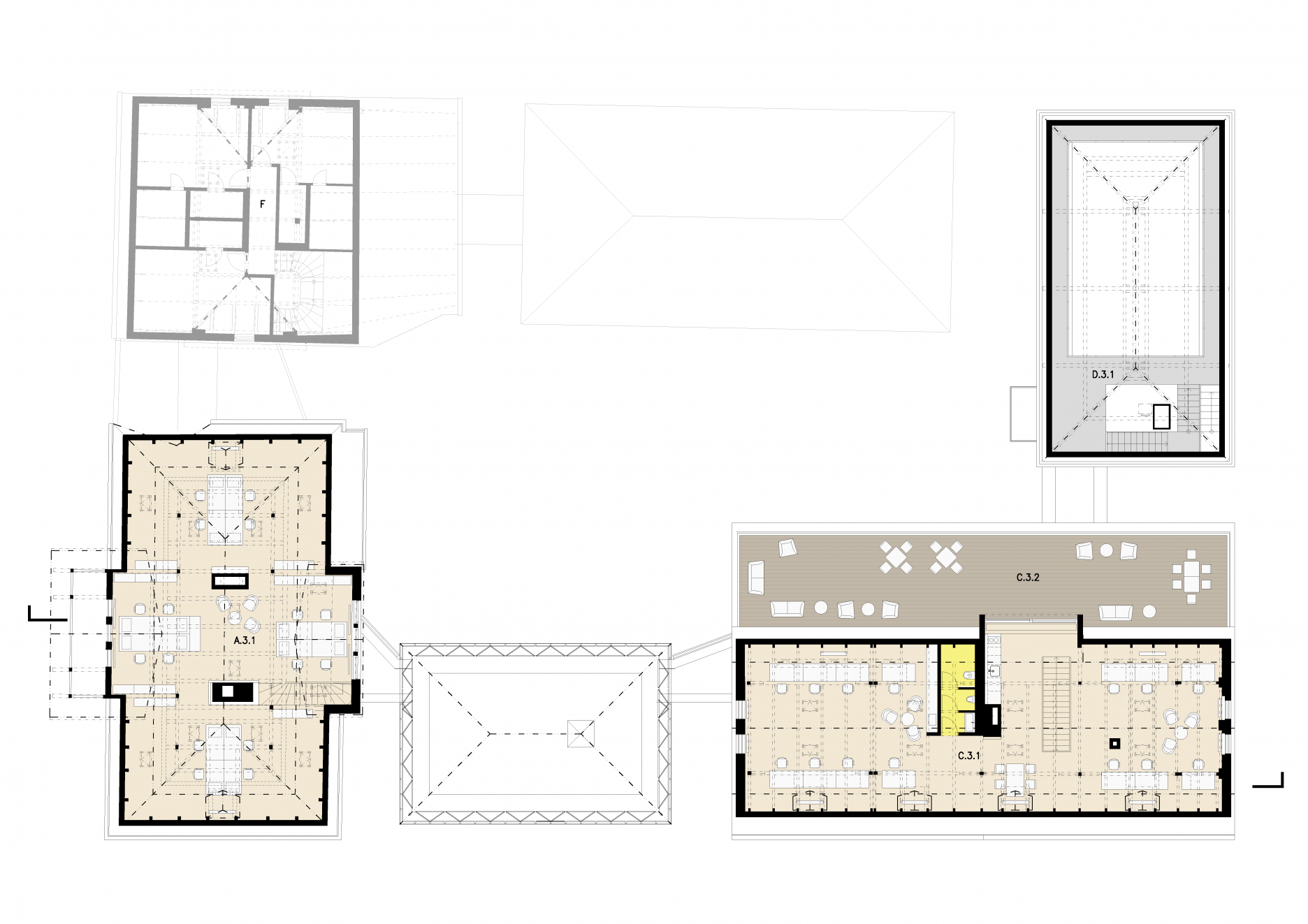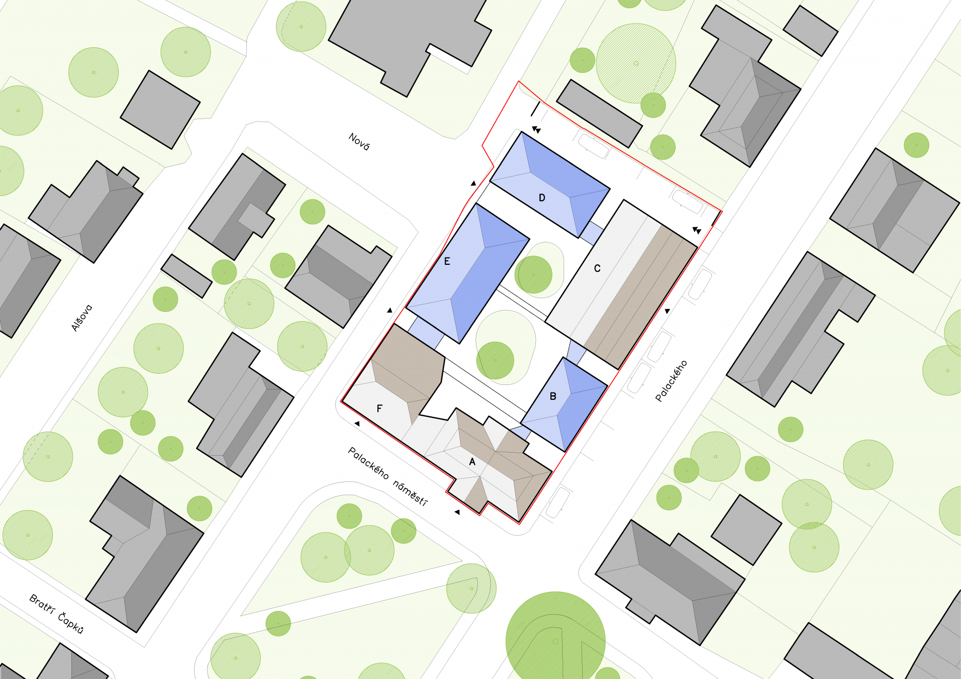 Štvoricu objektov prepája cesta pozdĺž dvora, ktorá je rozšírená zákutiami spoločných priestorov. Na spomínané stavby nadväzuje ďalší dom, smerujúci do námestia, v ktorom plánuje investor otvoriť kaviareň pre verejnosť a niekoľko kancelárií. Celý blok s vnútornou záhradou by mal uzavrieť šiesty objekt, na mieste starších garáží. Jeho presné určenie ukáže čas.