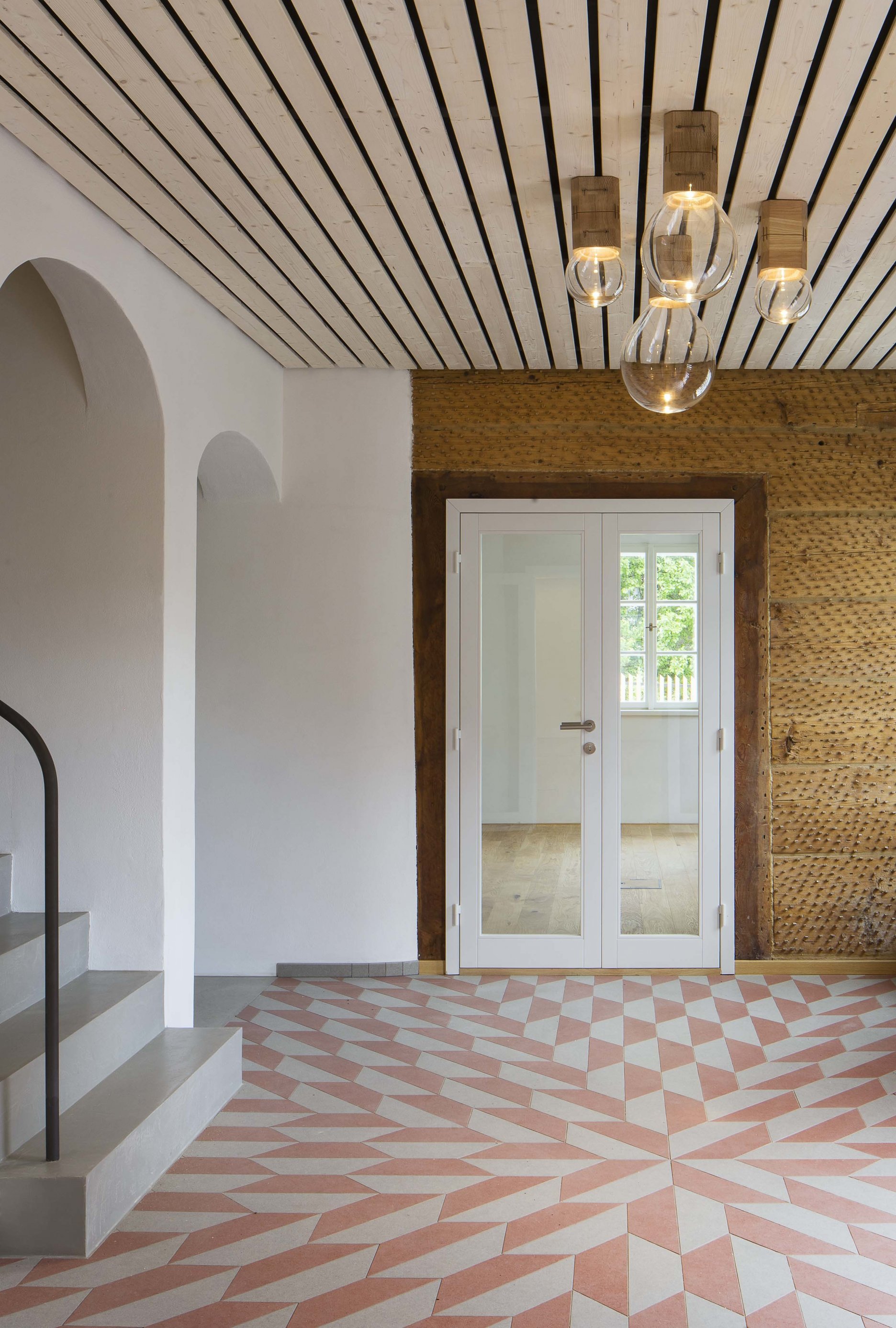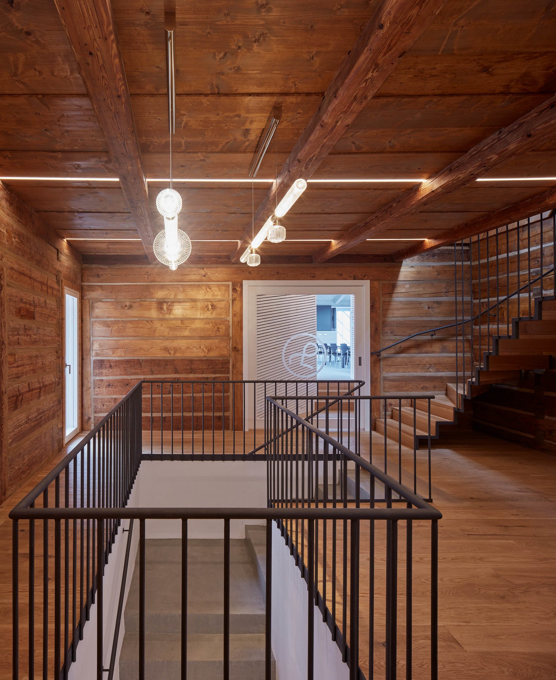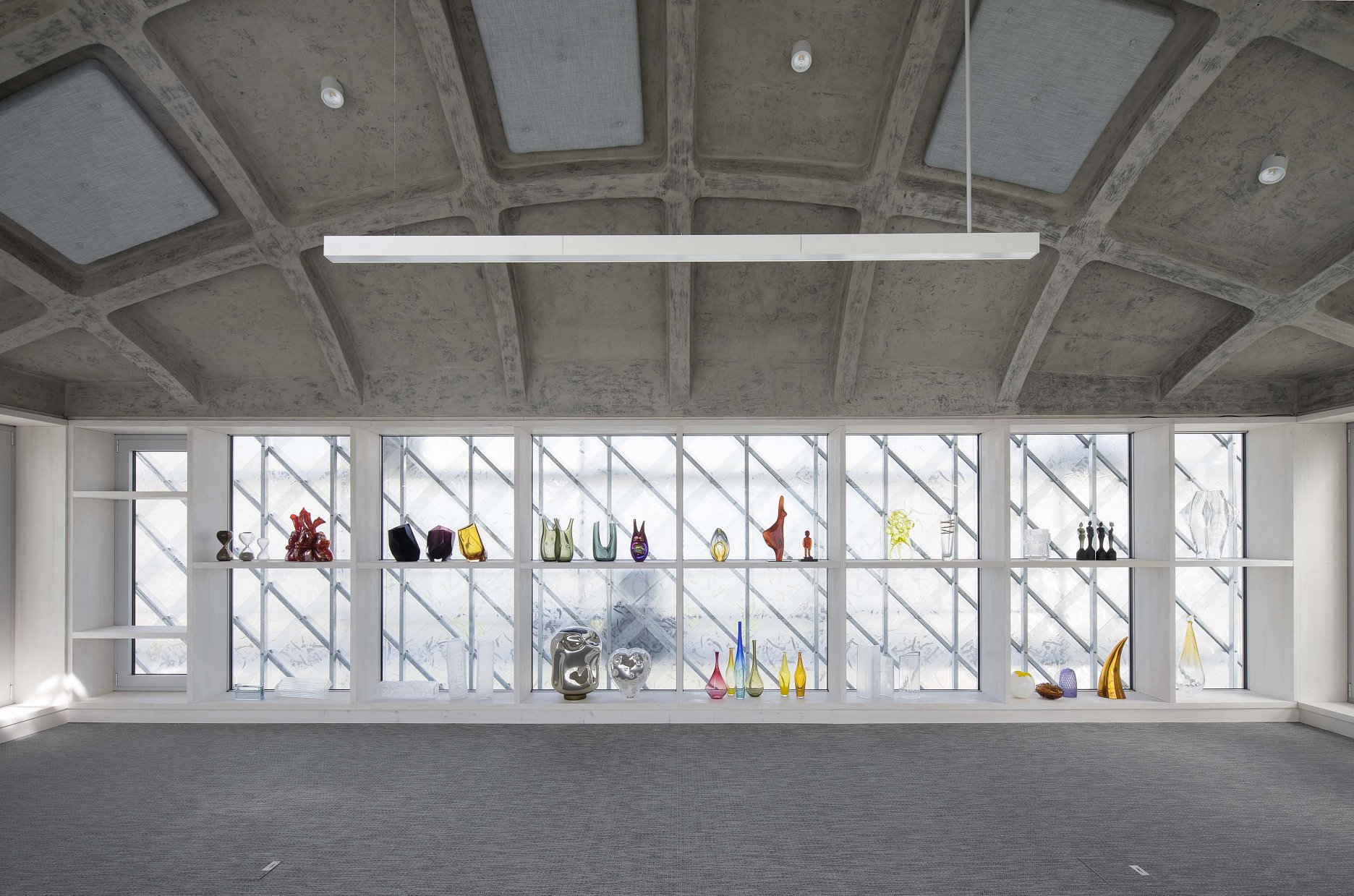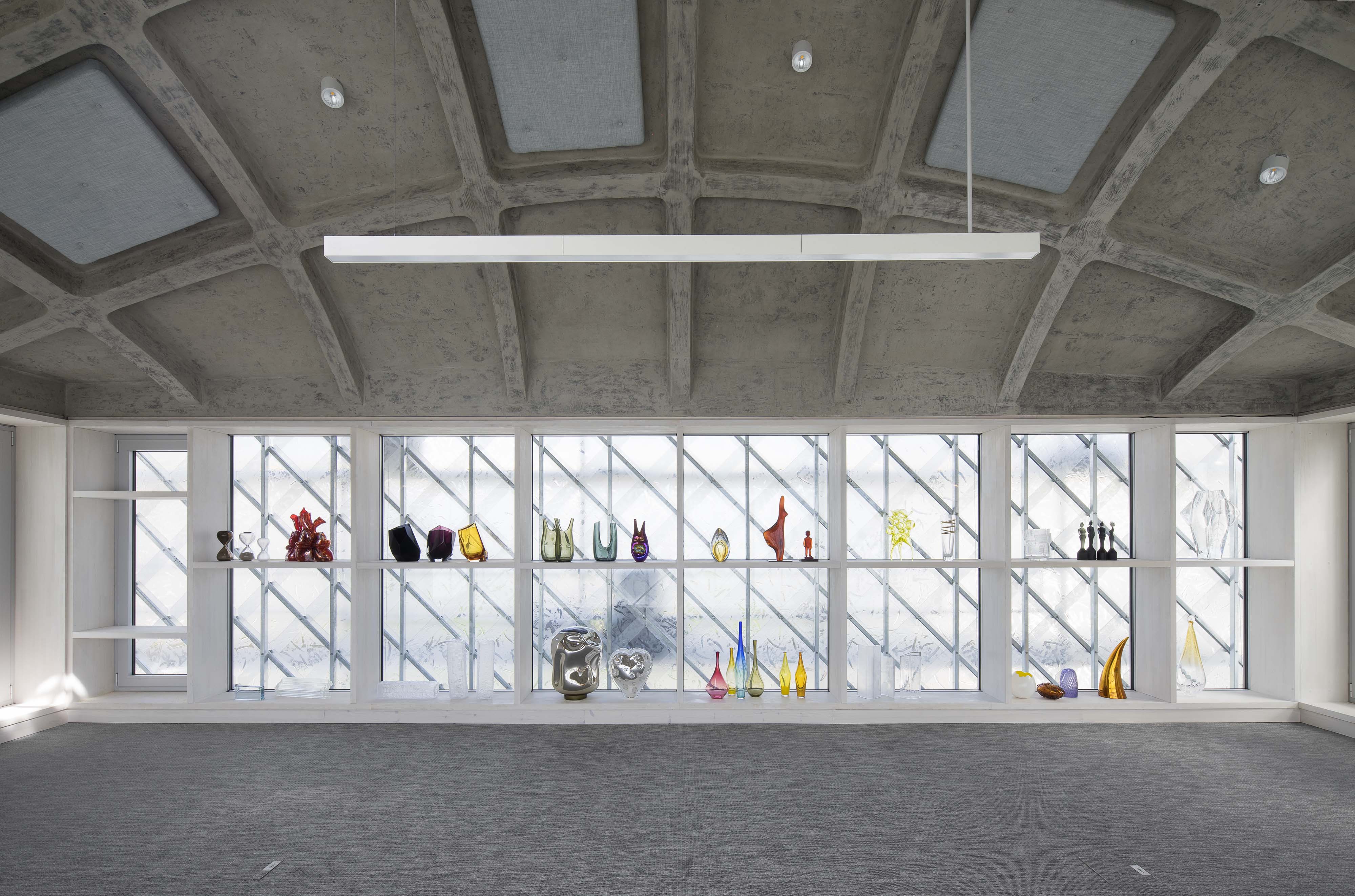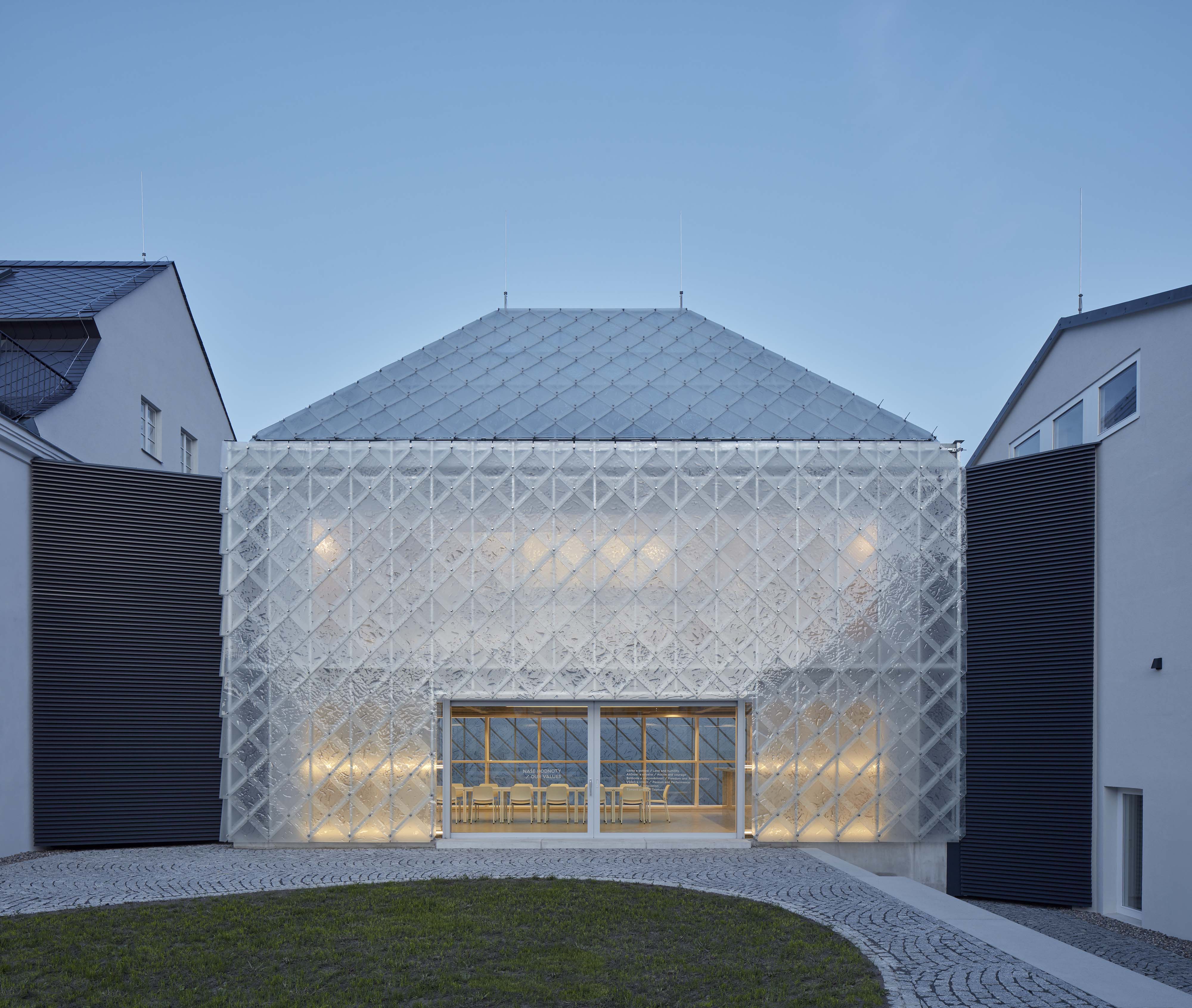 Nový "sklenený dom" nahradil murovaný krčok, ktorý predtým spájal historické stavby. Dom je ústredím sídla firmy, kaviarňou aj rokovacím priestorom. Police slúžia ako knižnica a sklad vzoriek sklenených prvkov. Sklenené elementy v policiach sú prežiarené denným svetlom, po zotmení sú osvetlené a viditeľné z ulice. Plášť i strechu pokrývajú sklenené šablóny z kaleného skla. Elementy, vyrobené "in-house" špeciálne pre túto stavbu, odkazujú na vzor kladenia bridlicových dosiek, používaných na štítoch a strechách v regióne. Textúra sklenenej šablóny vychádza z lomu plátov bridlice.