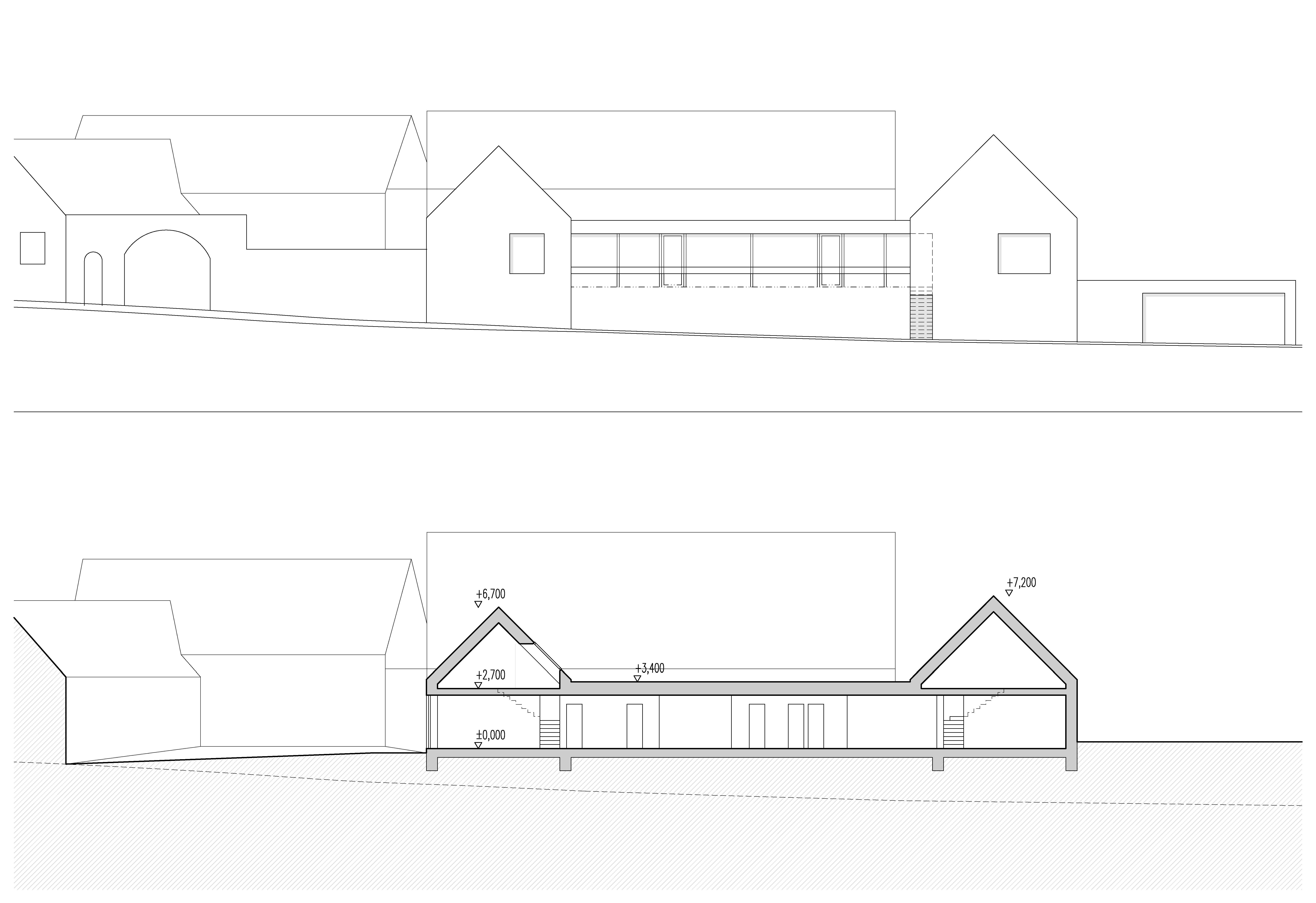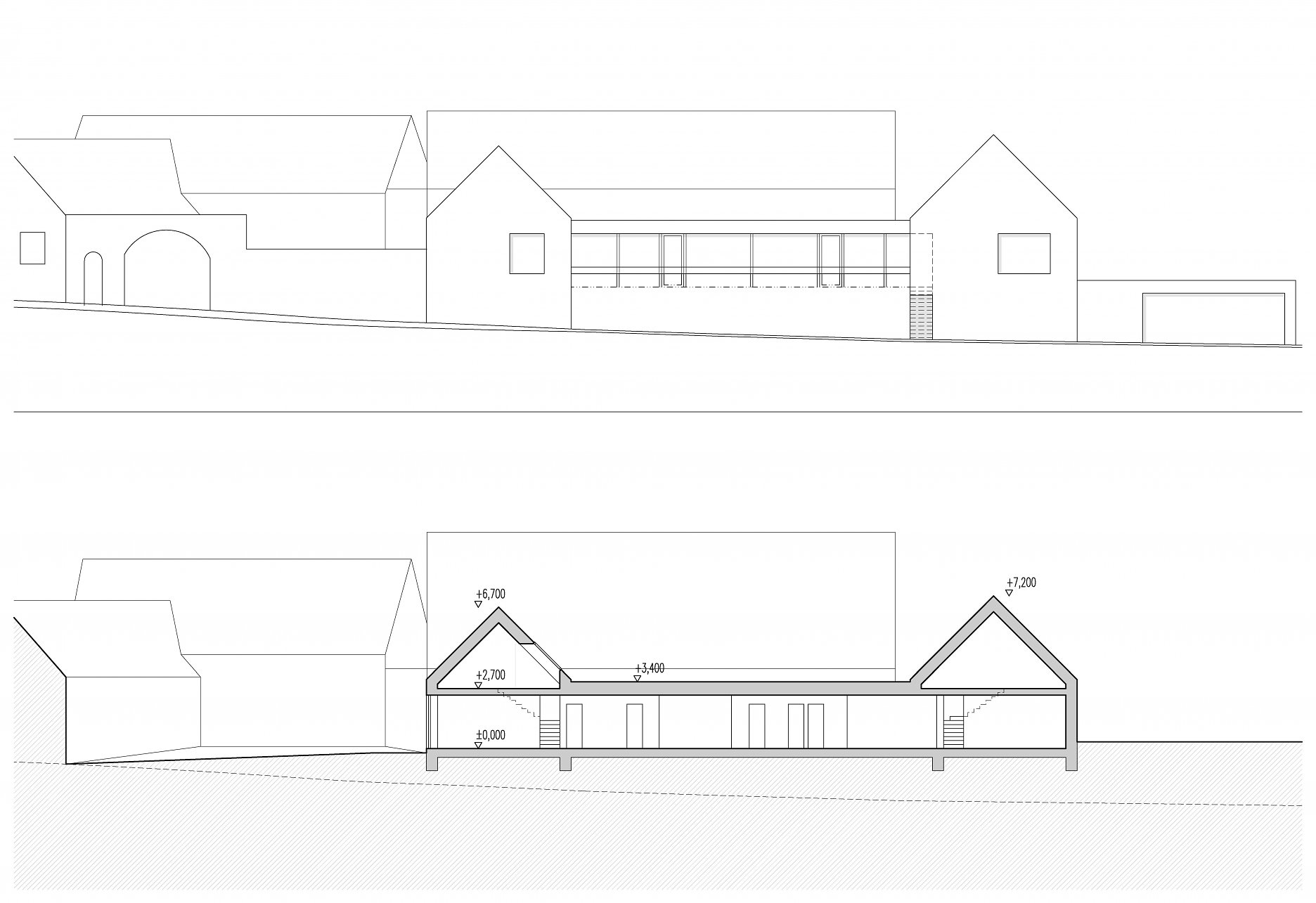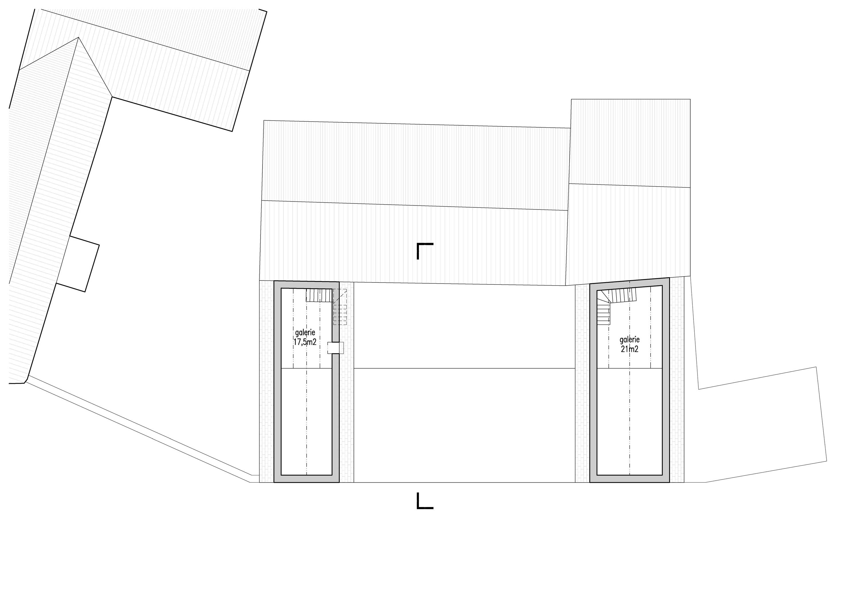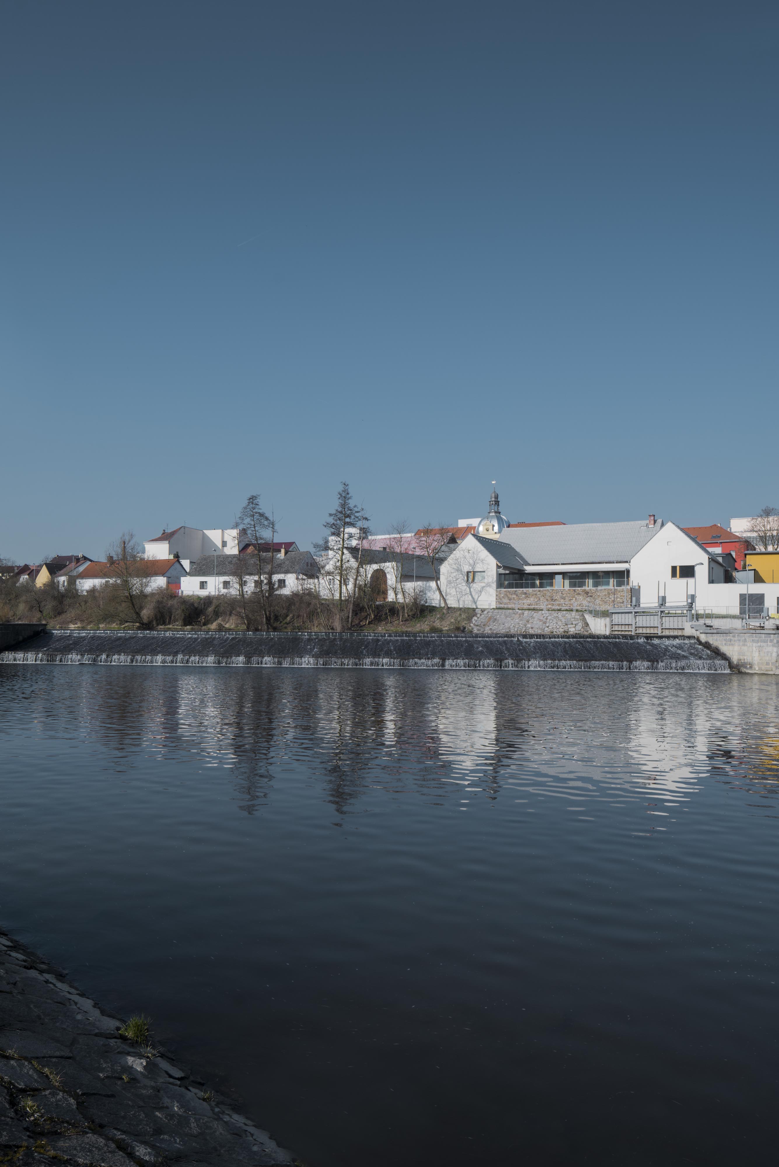 Nová kompozícia firemných objektov nestrháva na seba pozornosť, skôr jemne dopĺňa drobnú štruktúru okolitej zástavby. Forma novostavieb čiastočne vychádza zo stopy historickej zástavby bývalého statku s prejazdným dvorom. Nová je dvojica jednoduchých domov, otvorených širokým priehľadom k rieke. Pôvodná chalupa a stodola boli zrekonštruované a sú dôležitou súčasťou firemného sídla.