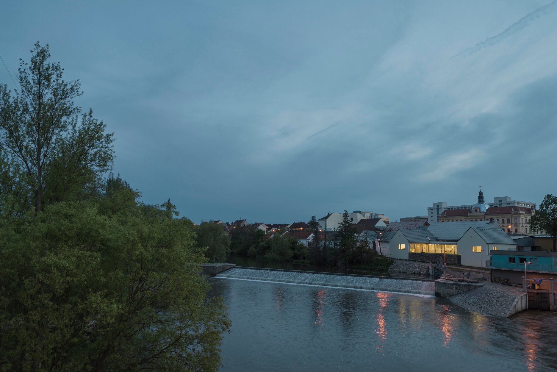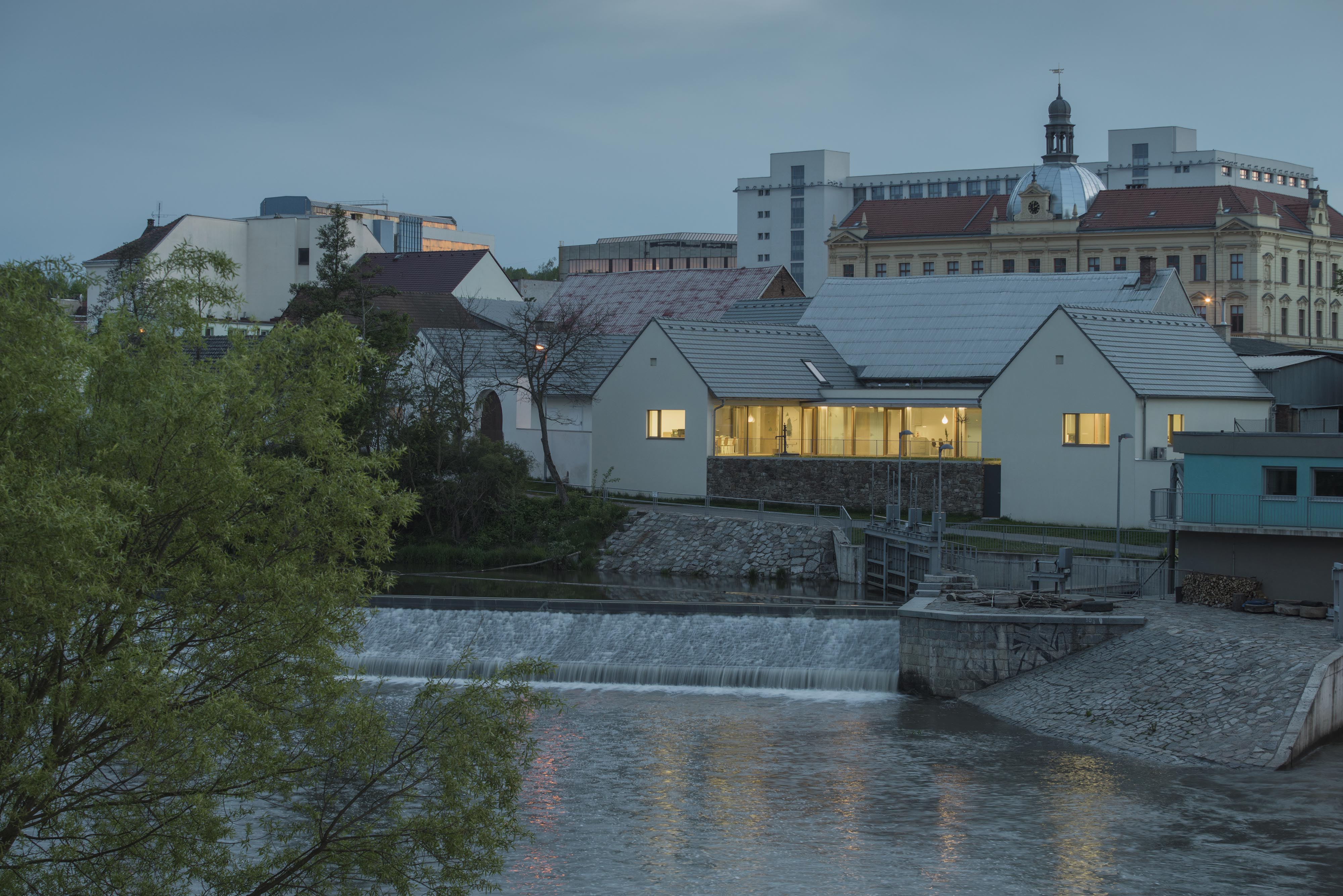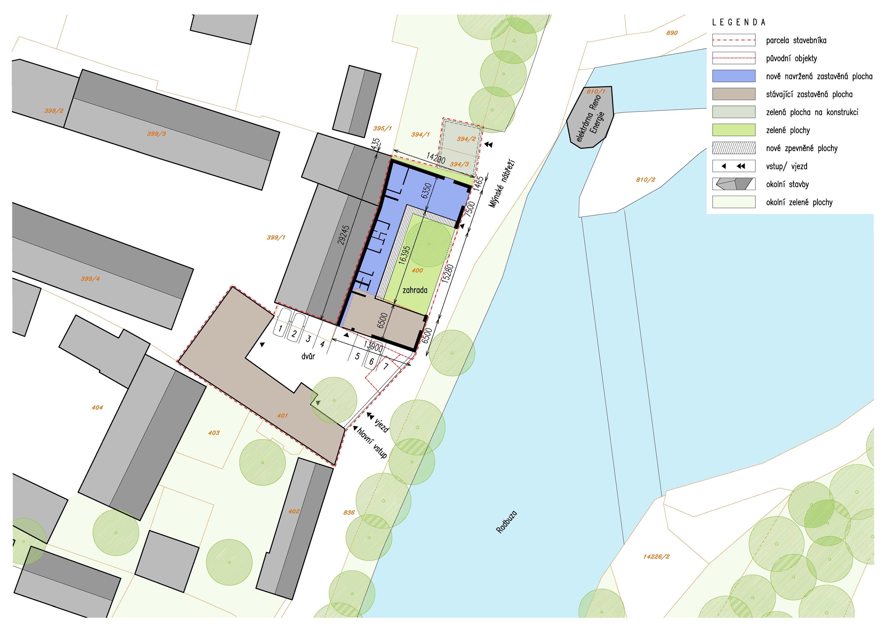 Pôvodne na pozemku stálo niekoľko hospodárskych stavieb a jedna chalupa - rodinný dom. “Nábřeží řeky je v tomto místě zastavěno původní chalupnickou zástavbou, místy až líbeznou. Každá další ulice od řeky se zvětšuje, až na kopci stojí výrobní haly Škodových závodů. Investor je vlastníkem a provozovatelem sítě vodních elektráren a v tomto místě má vedle jezu malou vodní elektrárnu,” približujú architekti východiská projektu.