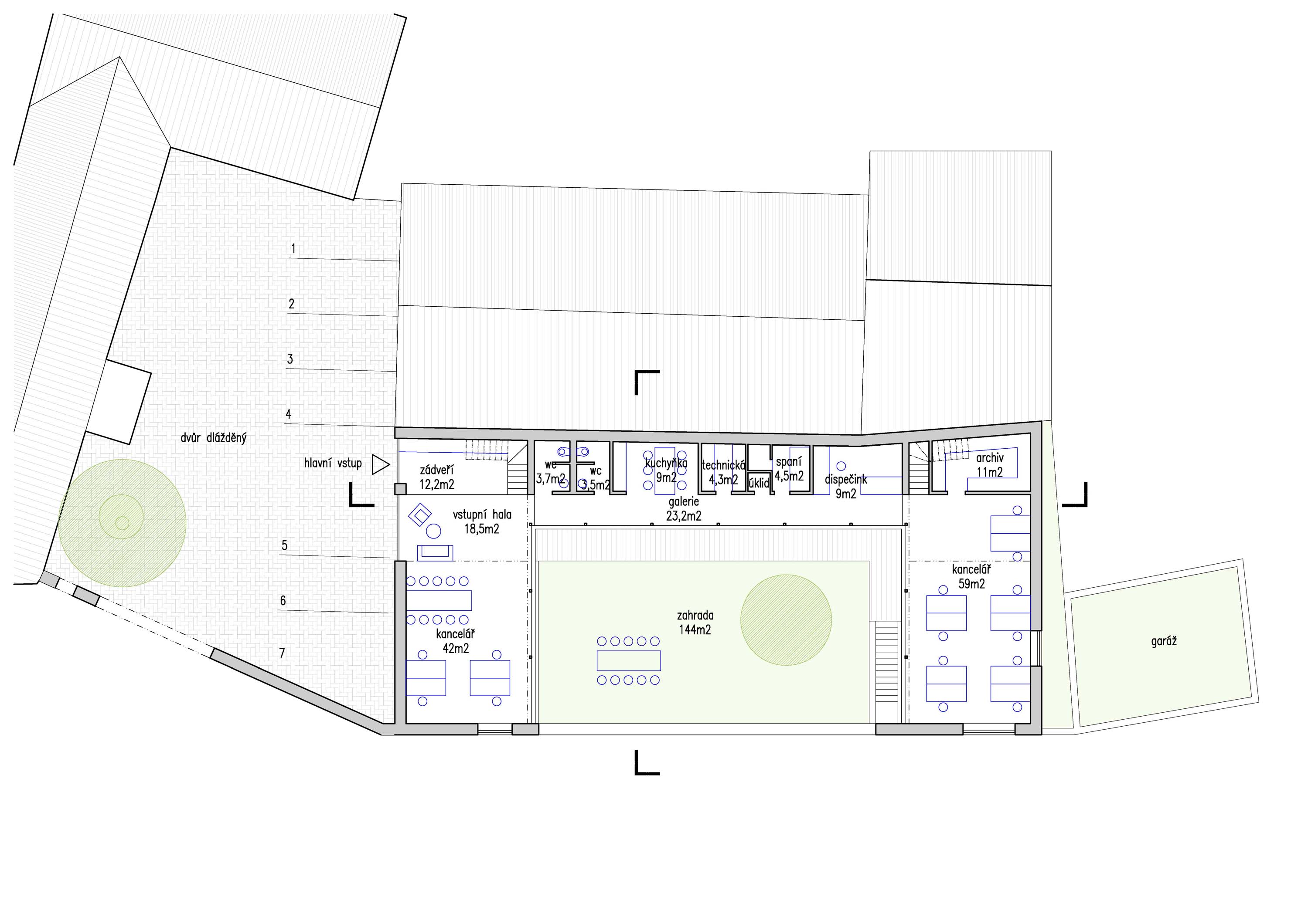 Do vnútorného, zeleného dvora sú sústredené presklené plochy kancelárskych priestorov. Tento priestor je vyvýšený nad ulicu o dva metre. Úpravy exteriéru zahŕňali rekonštrukciu pôvodnej studne s pumpou a výsadbu novej marhule.